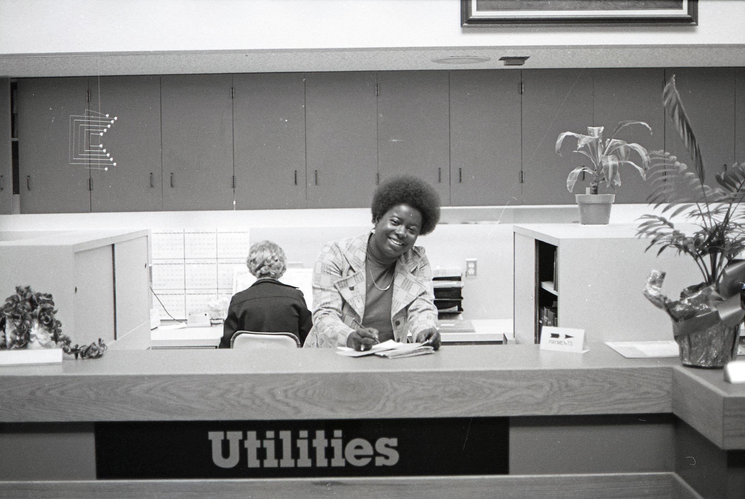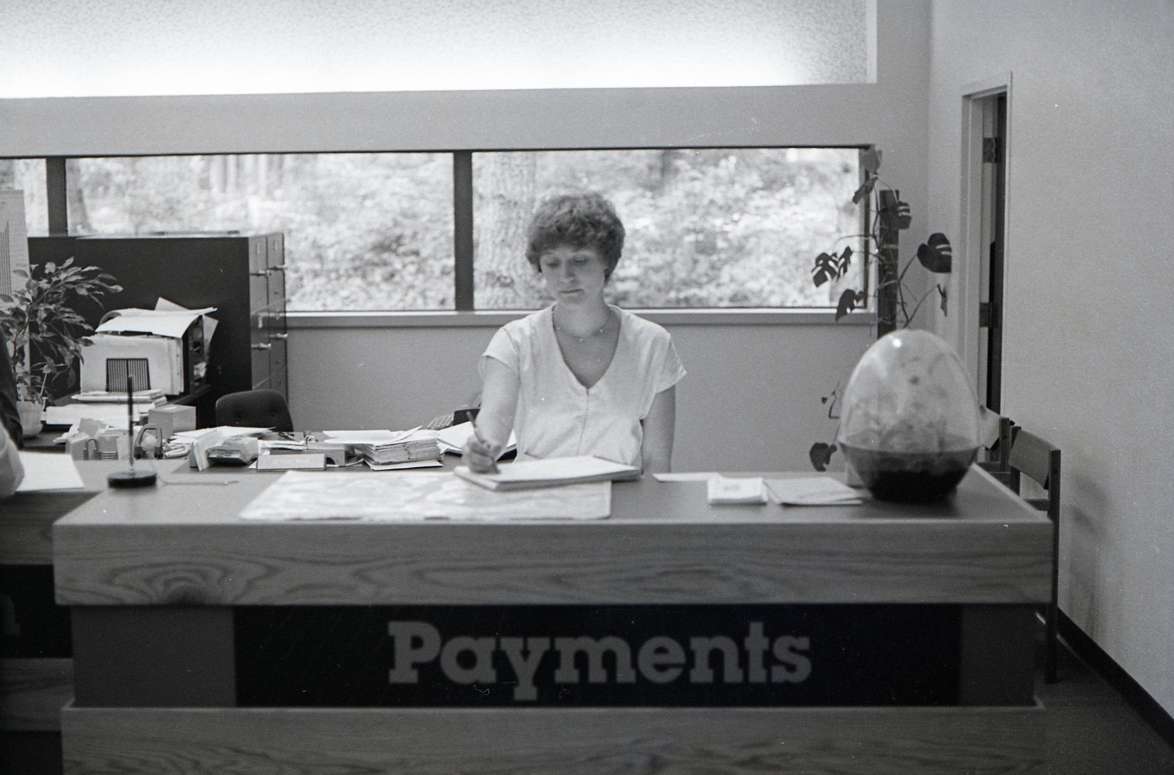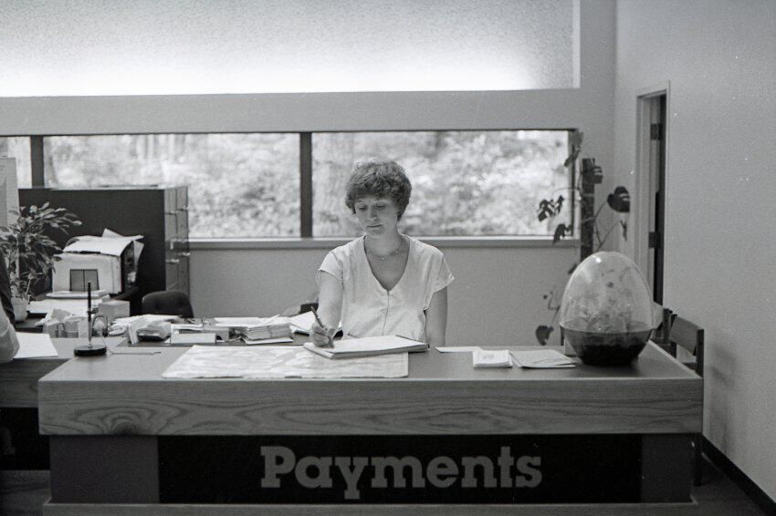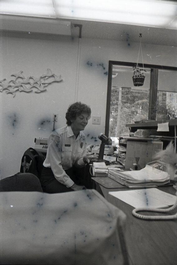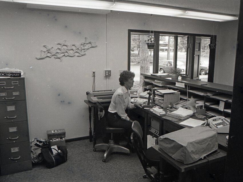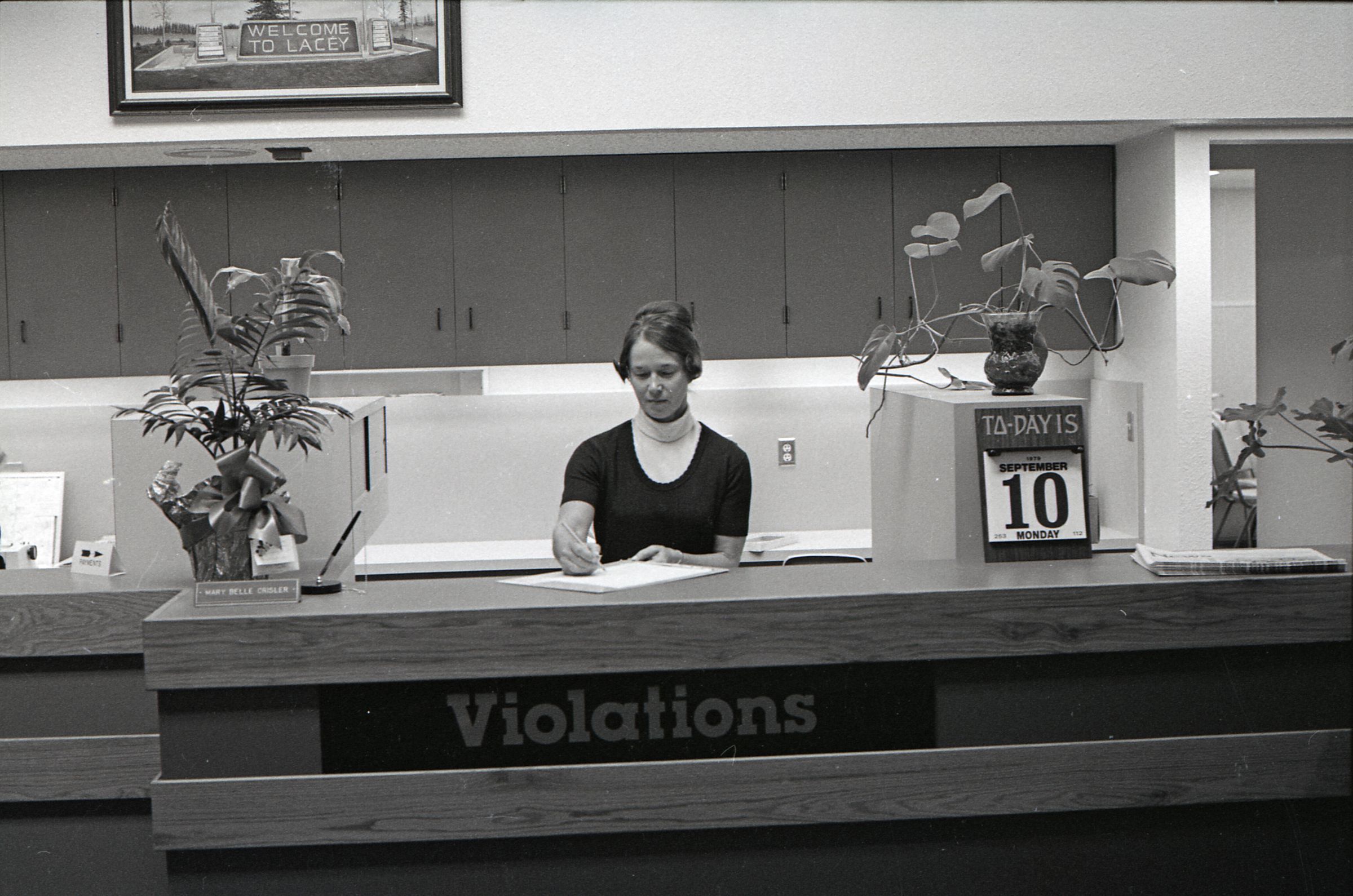 The images in group "b" show the Lacey City Hall building, both inside and out, people working at desks, and two signs. Image 12b shows an exterior shot of the Lacey City Hall built in 1979. Images 13b and 14b show service desks inside the city hall. Image 15b shows a man standing over a large piece of unknown office equipment, looking at a notebook. Image 16b shows the same man using what appears to be a teleype machine. Image 19b shows a man seated behind a desk and speaking on a telephone. Image 20b shows a woman in a police uniform seated behind a desk. Image 21b shows a different angle on the woman seated at the desk. Image 22b shows two men in police uniforms seated at a single desk. Image 23b is effectively identical to the previous image. These people in police uniforms were photographed inside the Lacey Police Department, then located in a temporary module that was moved to the City Hall site from the old City Hall site (pictured in 32a-34a. Images 24b and 25b show a sign which reads at the top "NEW CITY HALL FOR THE CITY OF LACEY." Images 26b and 27b show a large sign which reads "LACEY CITY CENTER."