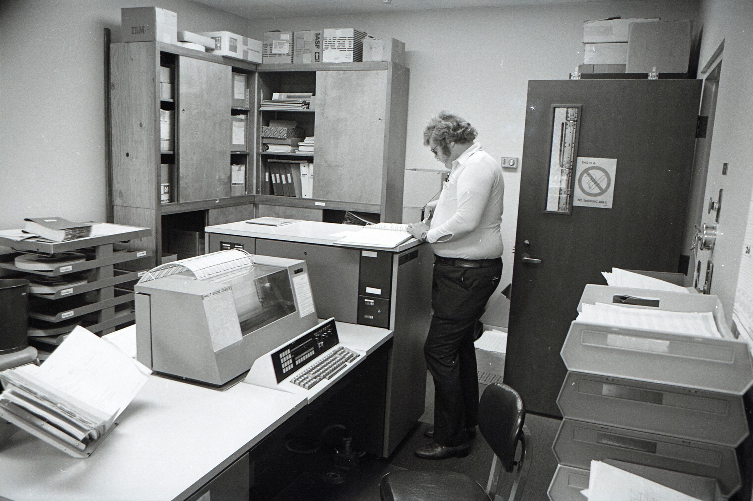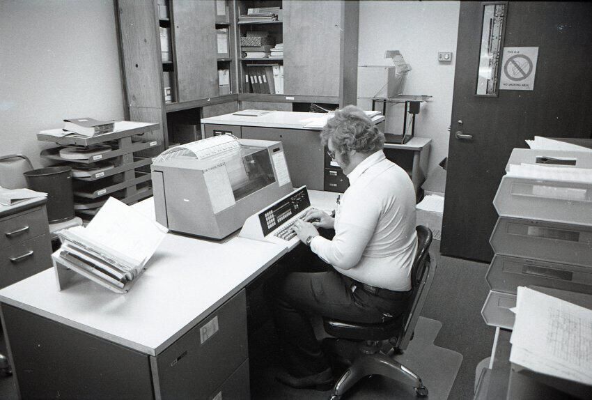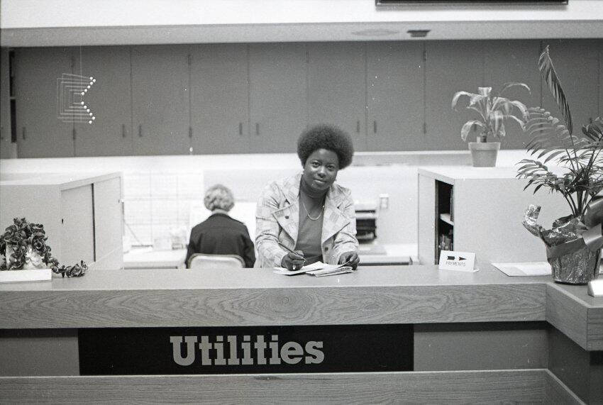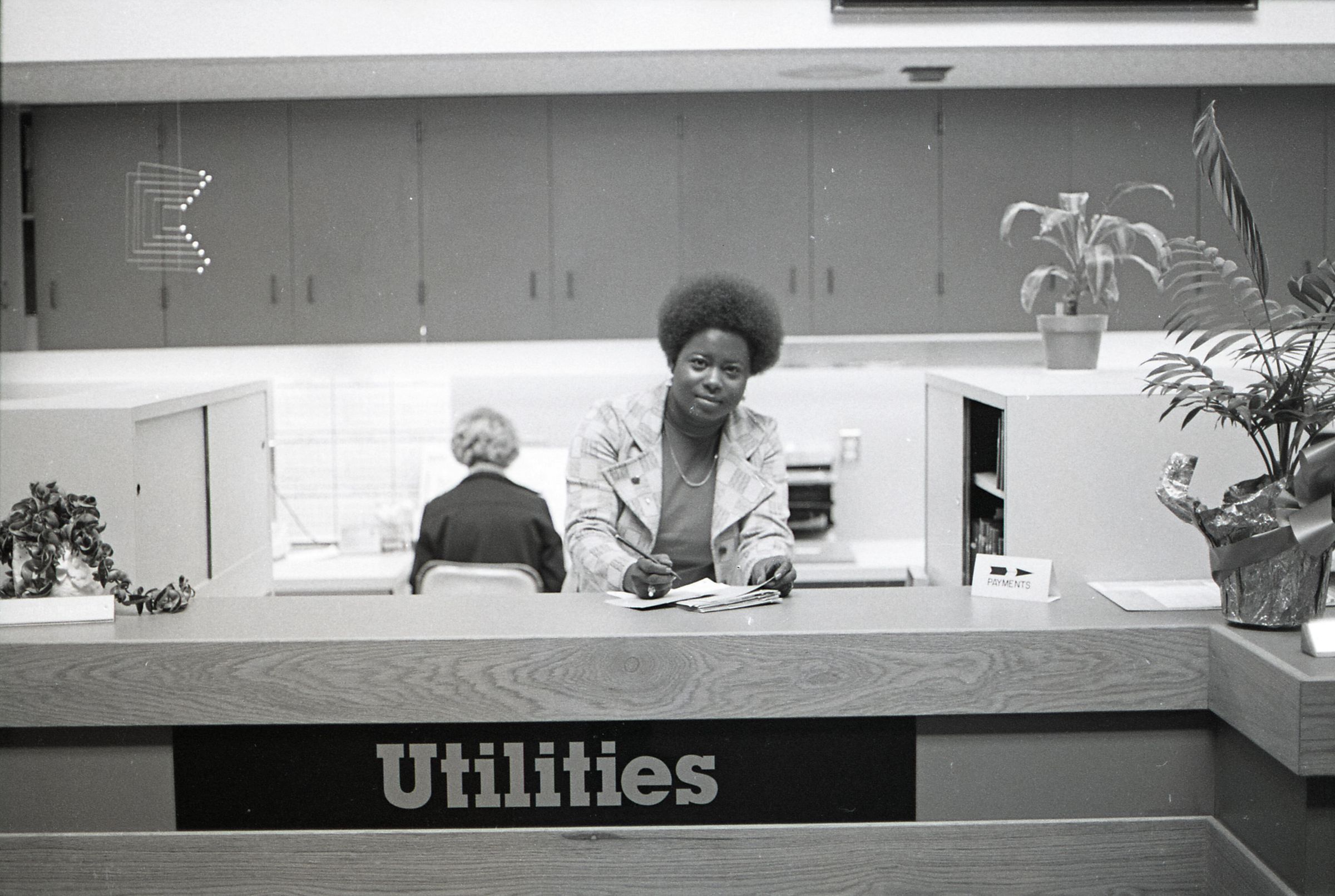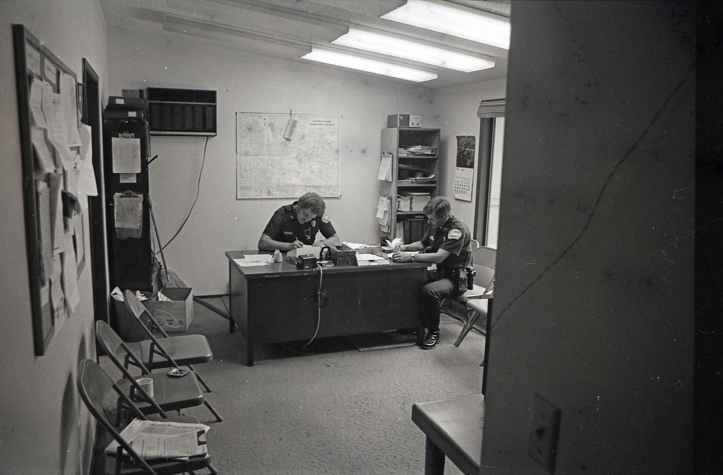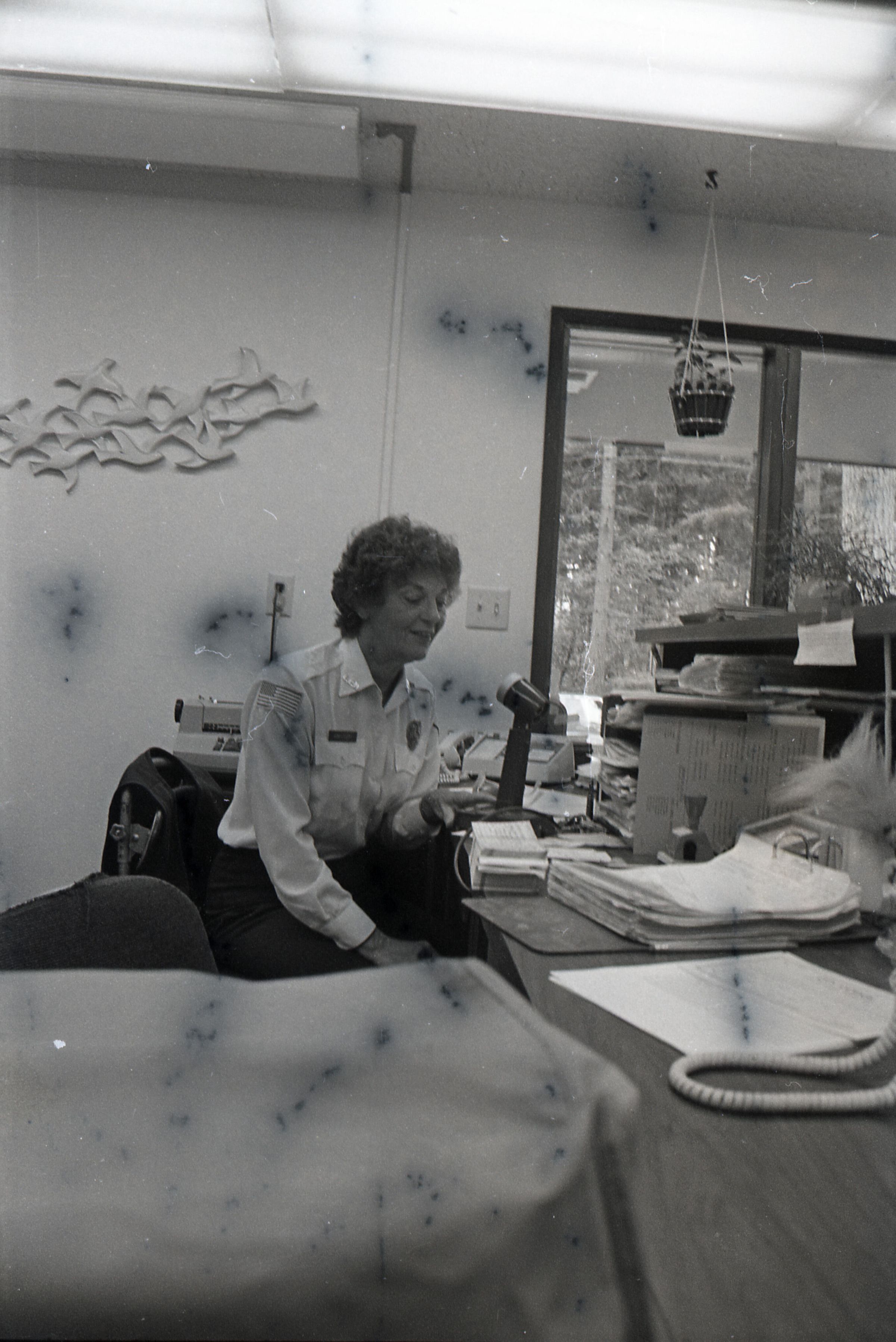 The images in group "b" show the Lacey City Hall building, both inside and out, people working at desks, and two signs. Image 12b shows an exterior shot of the Lacey City Hall built in 1979. Images 13b and 14b show service desks inside the city hall. Image 15b shows a man standing over a large piece of unknown office equipment, looking at a notebook. Image 16b shows the same man using what appears to be a teleype machine. Image 19b shows a man seated behind a desk and speaking on a telephone. Image 20b shows a woman in a police uniform seated behind a desk. Image 21b shows a different angle on the woman seated at the desk. Image 22b shows two men in police uniforms seated at a single desk. Image 23b is effectively identical to the previous image. These people in police uniforms were photographed inside the Lacey Police Department, then located in a temporary module that was moved to the City Hall site from the old City Hall site (pictured in 32a-34a. Images 24b and 25b show a sign which reads at the top "NEW CITY HALL FOR THE CITY OF LACEY." Images 26b and 27b show a large sign which reads "LACEY CITY CENTER."