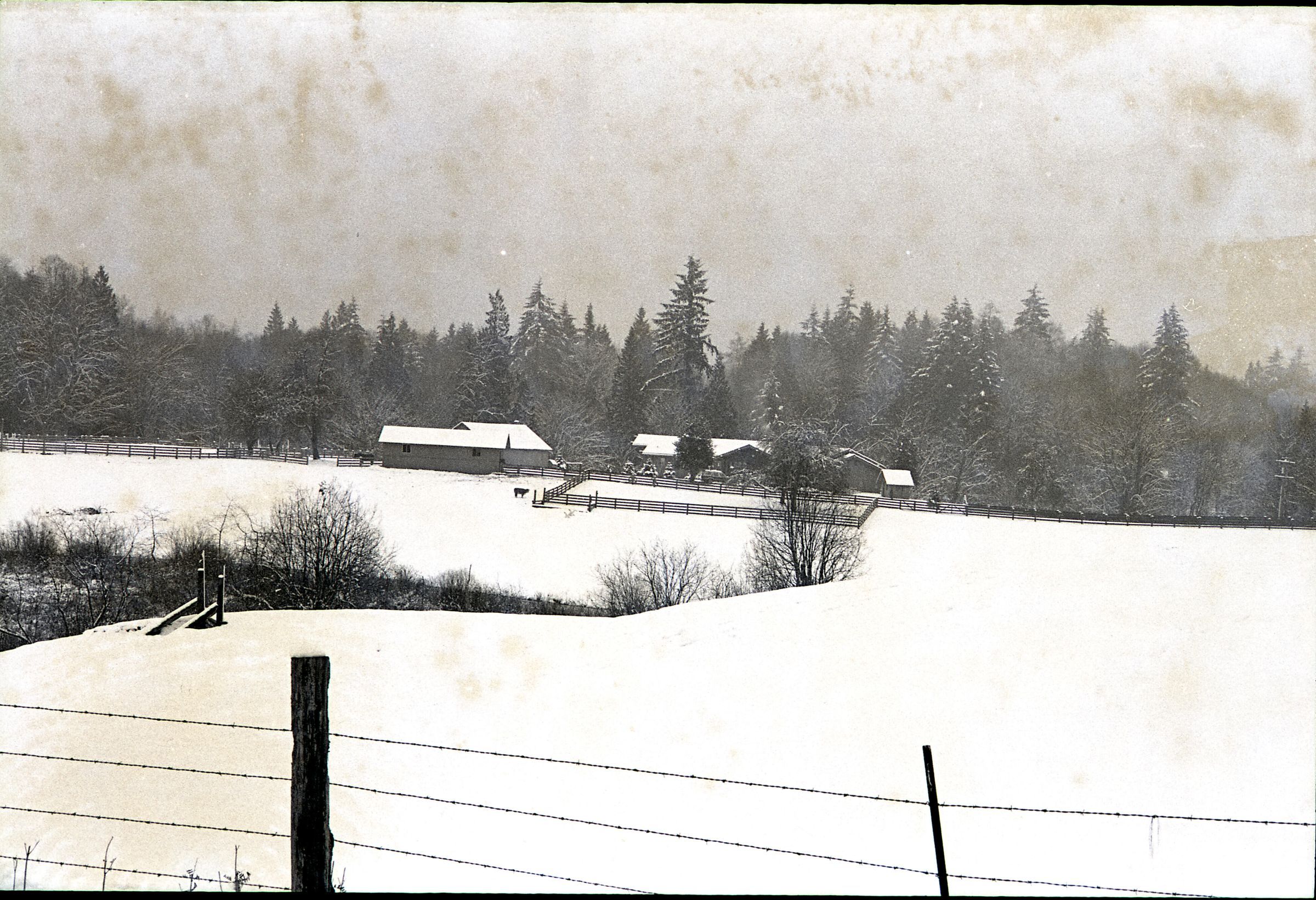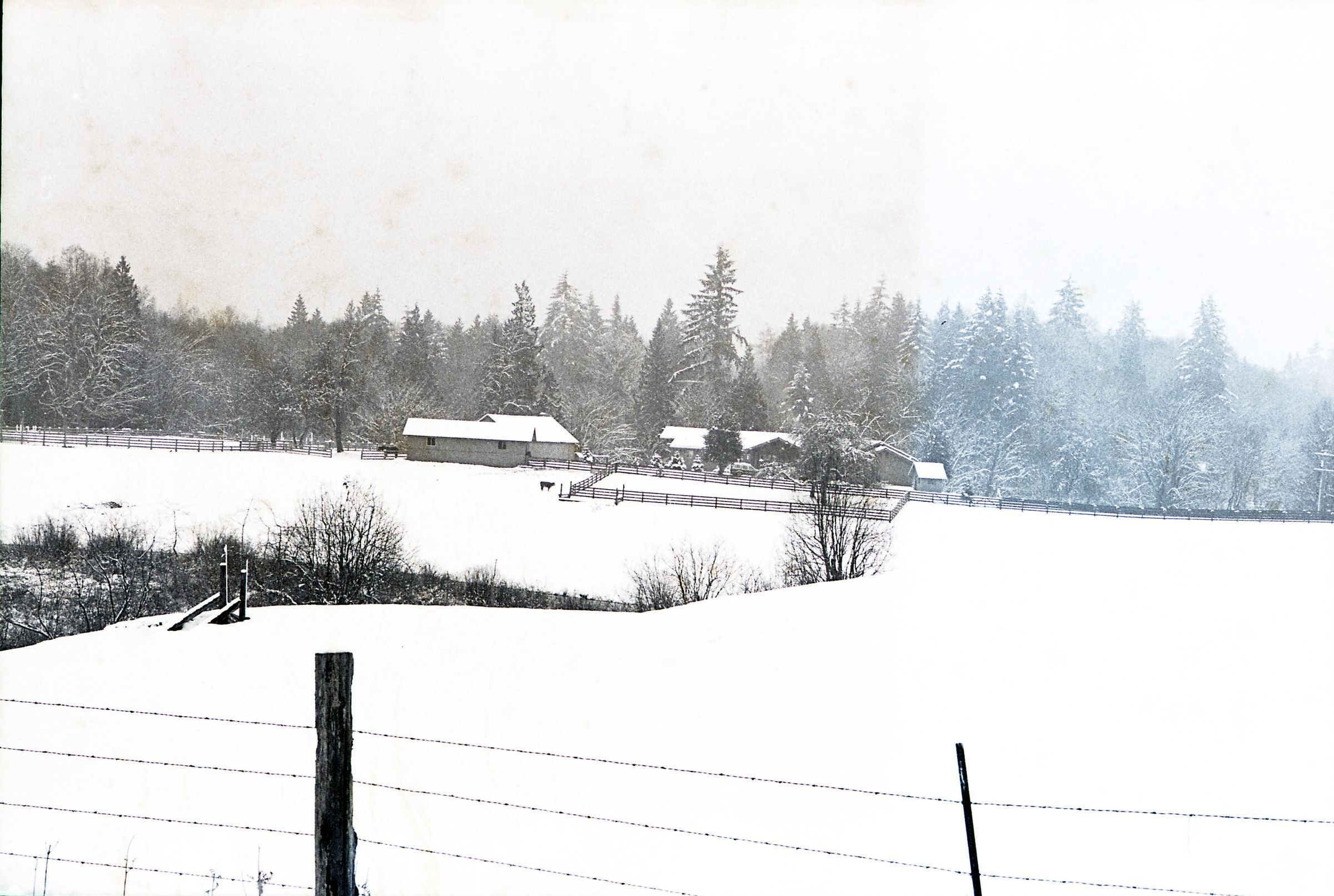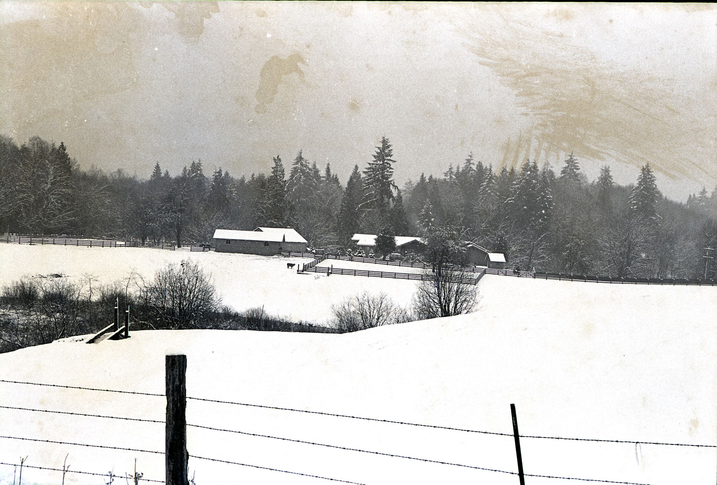 Images 4-9 are of a farm field covered in snow. In the distance are some animal paddocks and buildings.