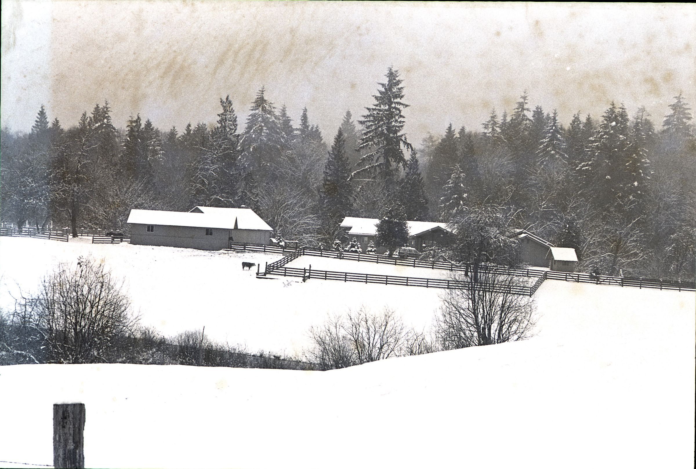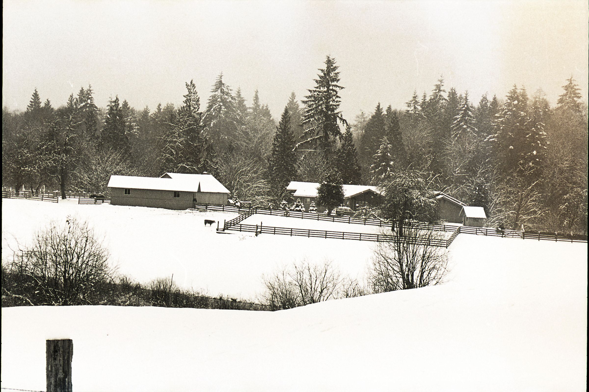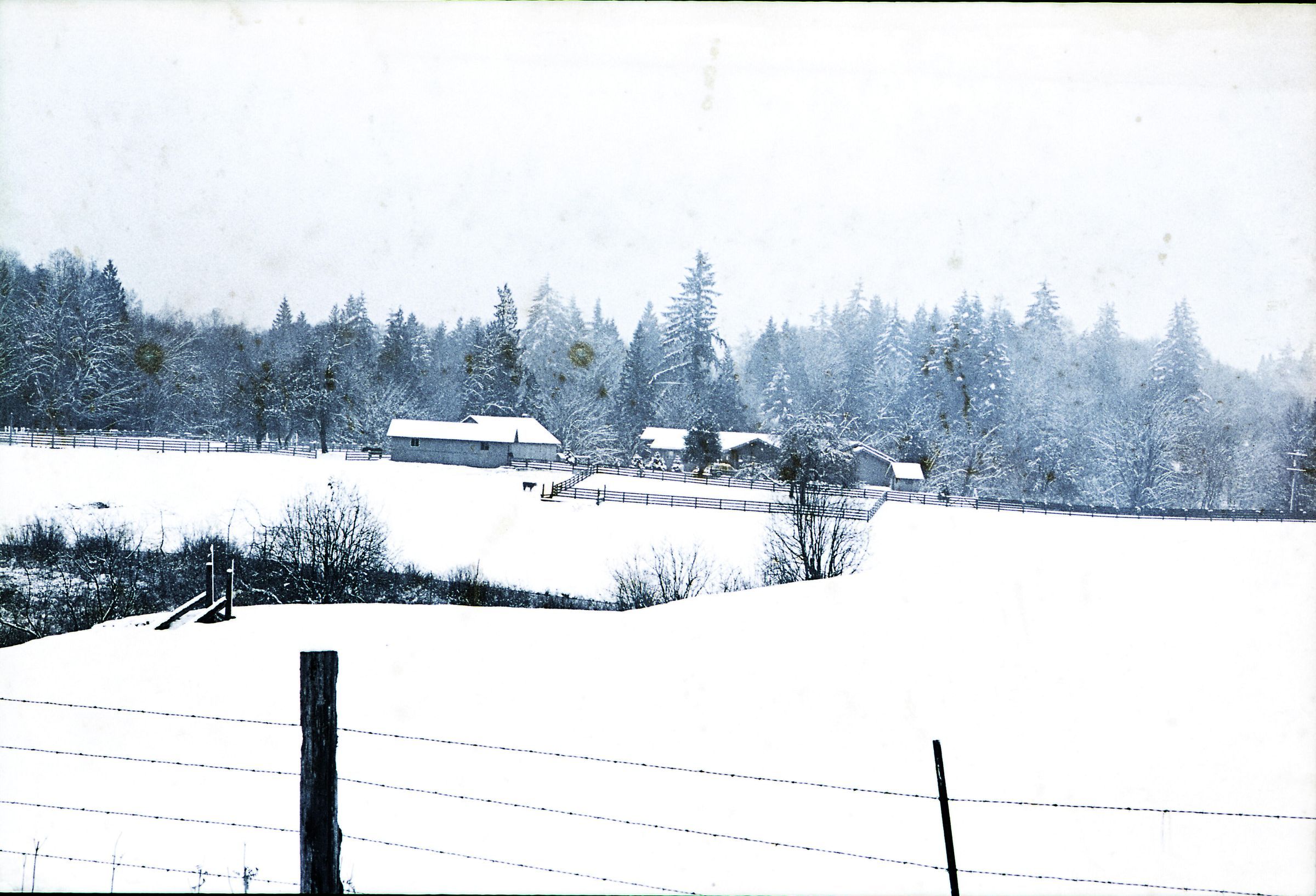 Images 4-9 are of a farm field covered in snow. In the distance are some animal paddocks and buildings.