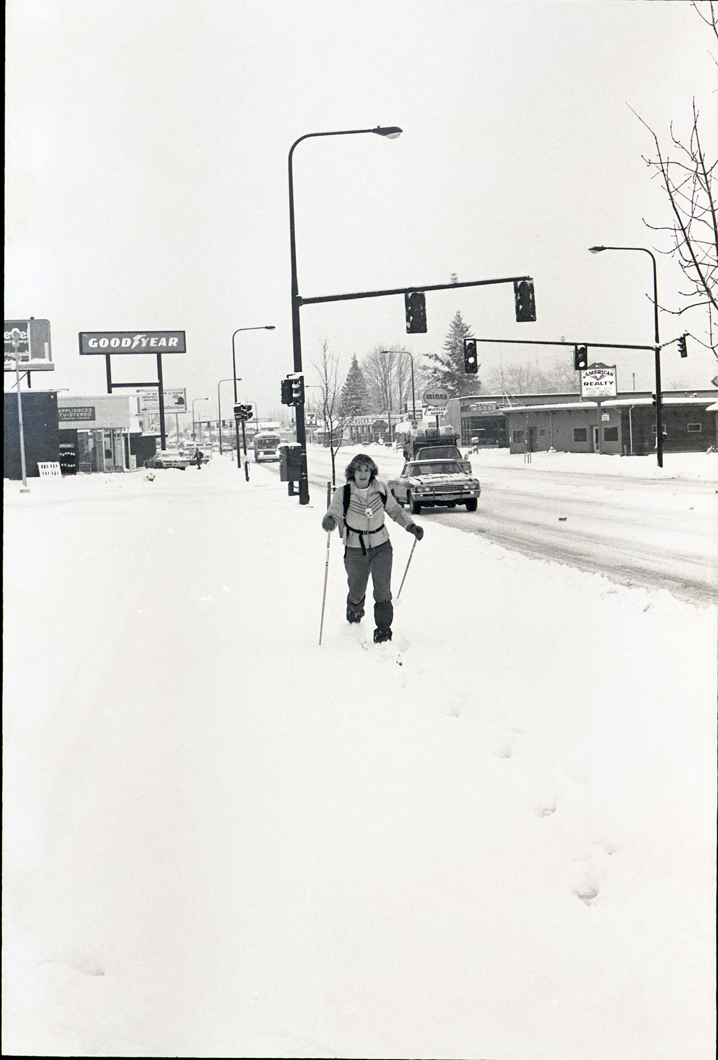 Images 2-3 are of a person on skies and using ski poles to move along the snow covered sidewalk. Probably Sleater-Kinney.