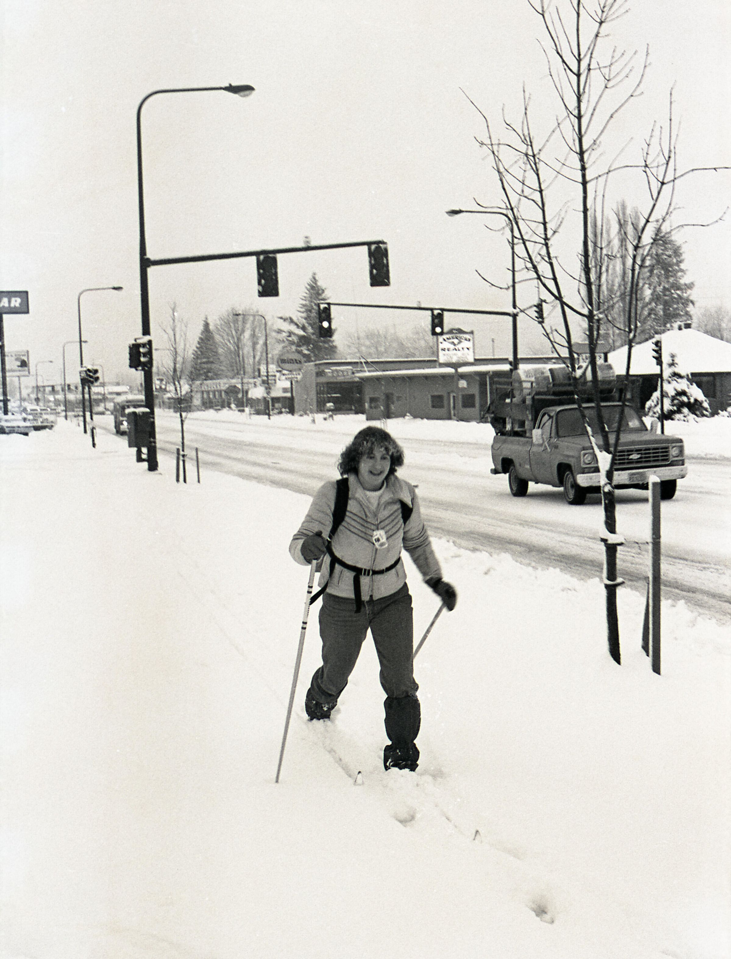 "Skiing in Town," unknown date. These two black and white film negative strips were created for the Lacey Leader newspaper. They depict a person skiing down a street and some snowy landscapes.