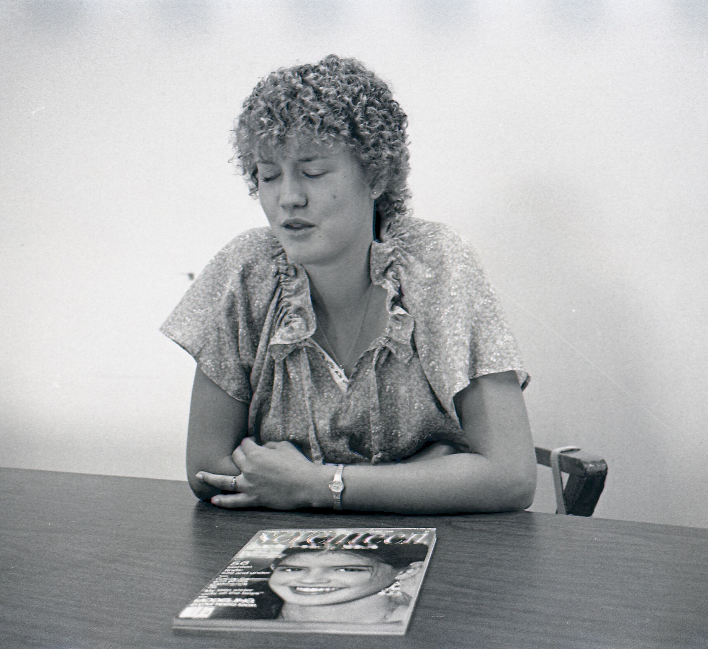 Mindy Ellenbos, 06-18-1979. These four black and white film negative strips were created for the Lacey Leader newspaper. They depict a woman sitting at a table. On the table in front of her is the June 1979 issue of Seventeen magazine. Each image is only a slightly different angle some are closer portrait shots, others are farther away to show the table and magazine.Made/Created