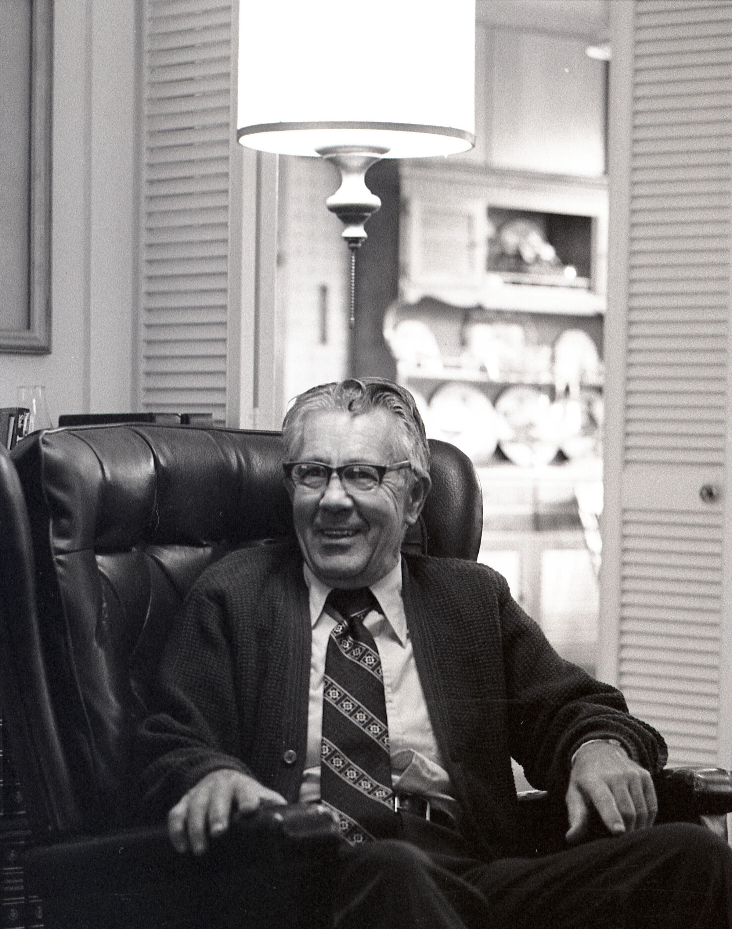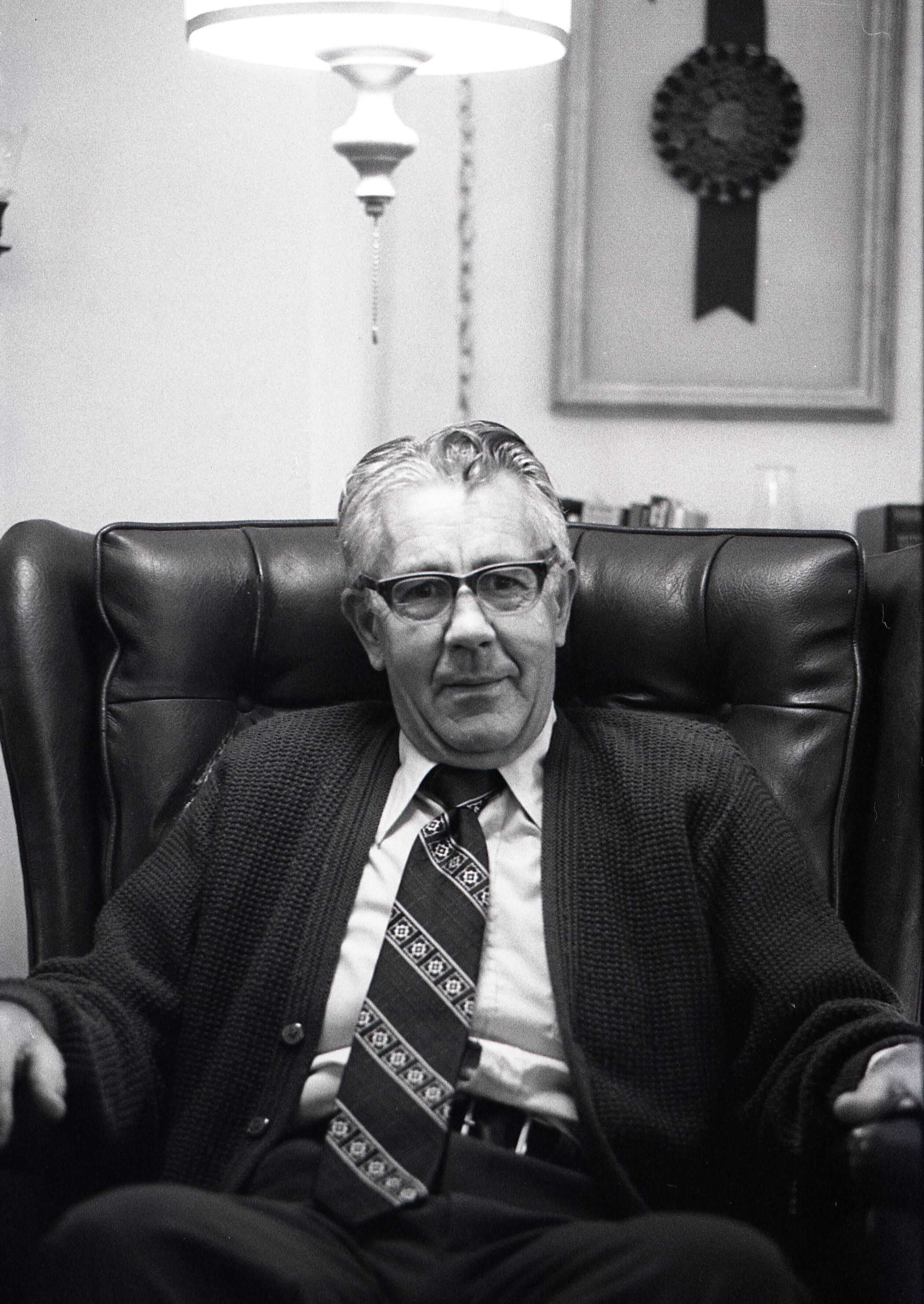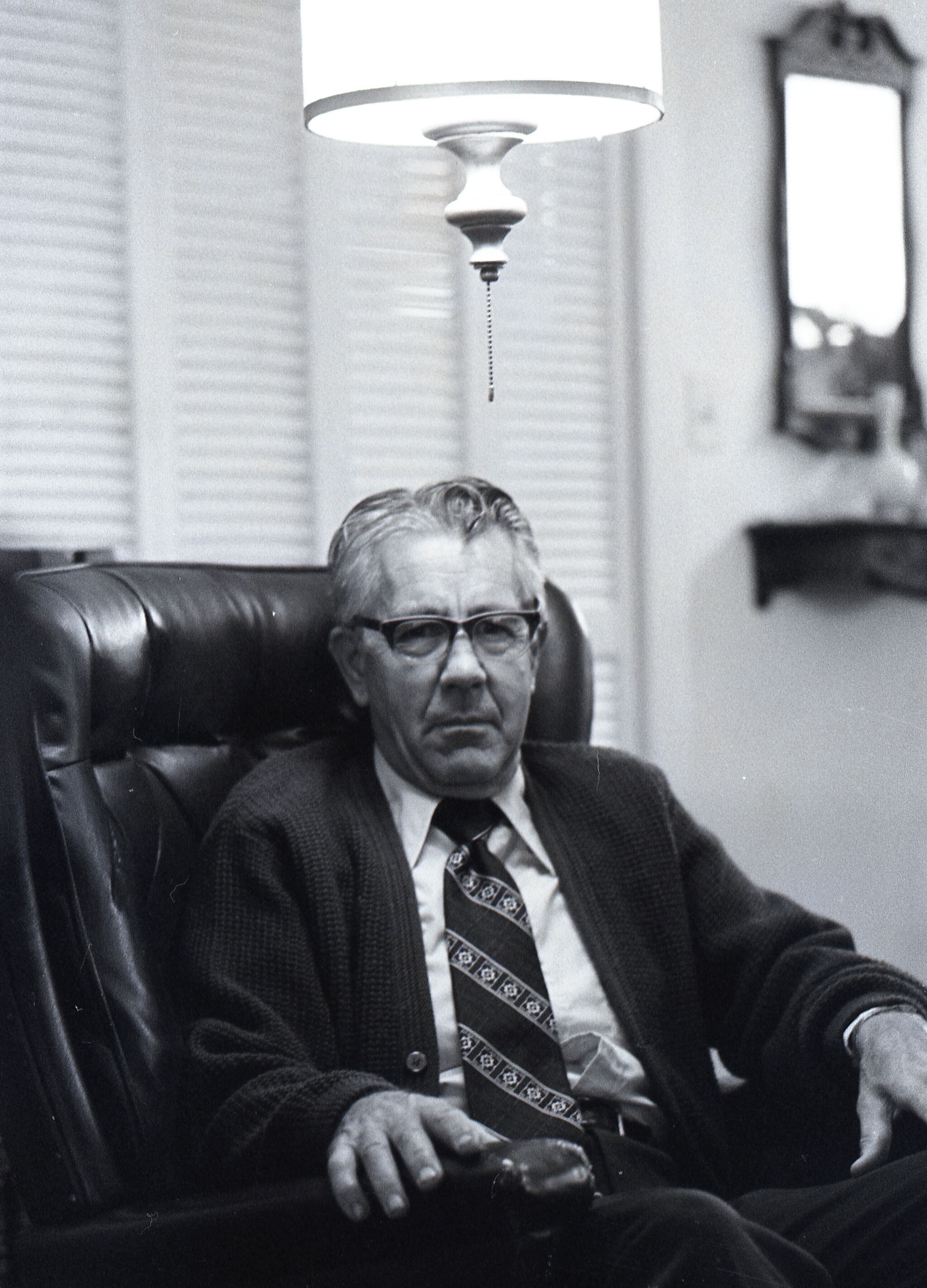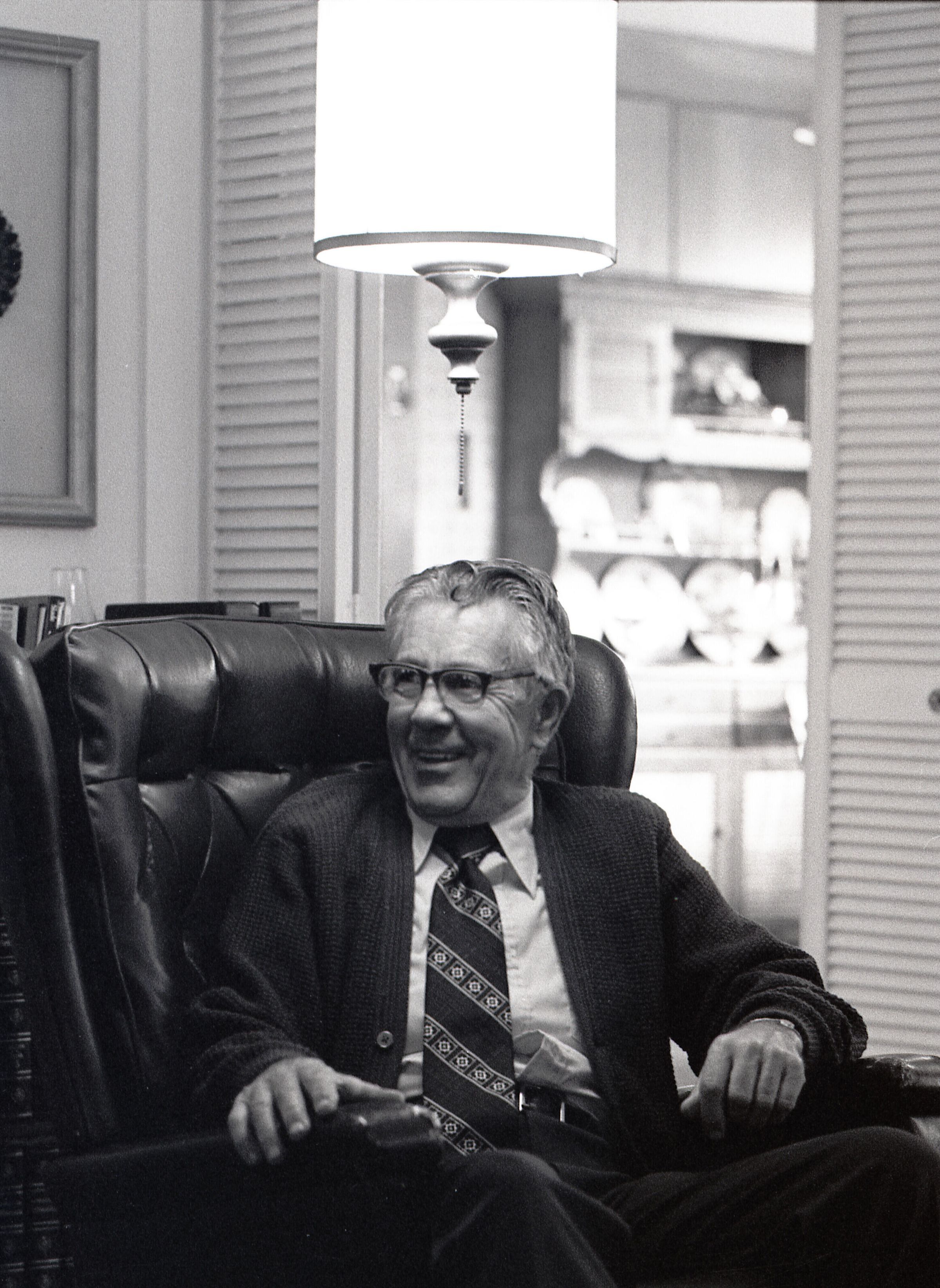 Tom Huntamer, 09-12-1979. These two black and white film negative strips were created for the Lacey Leader newspaper. Mr. Huntamer is wearing glasses and a tie, sitting in a large recliner chair. The images are taken from several different angles.Made/Created