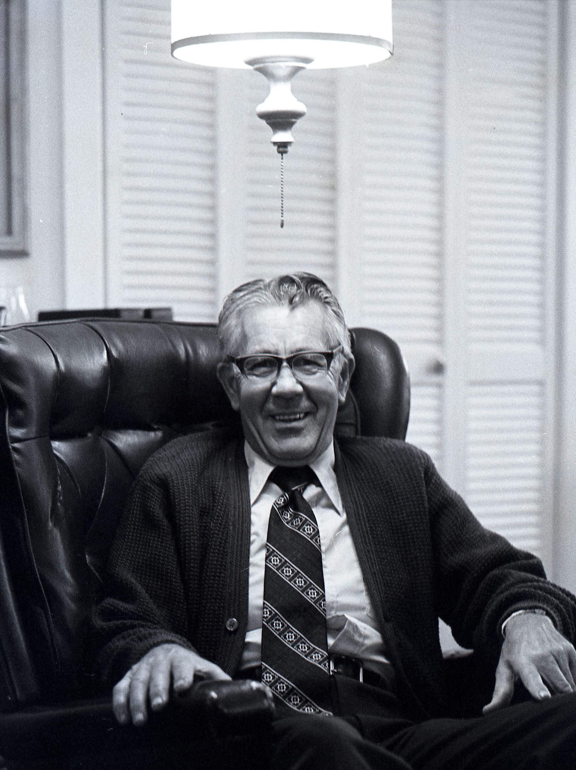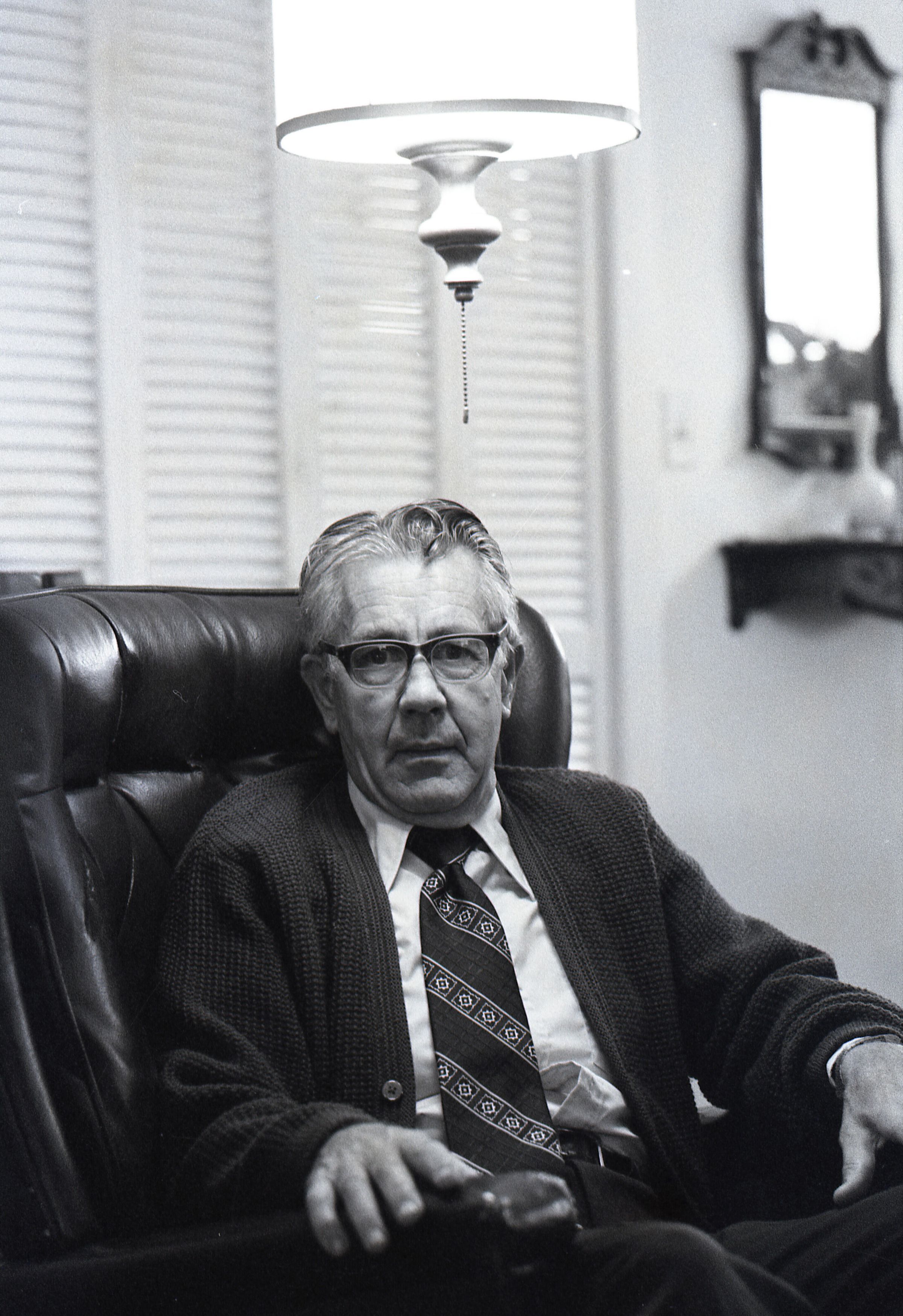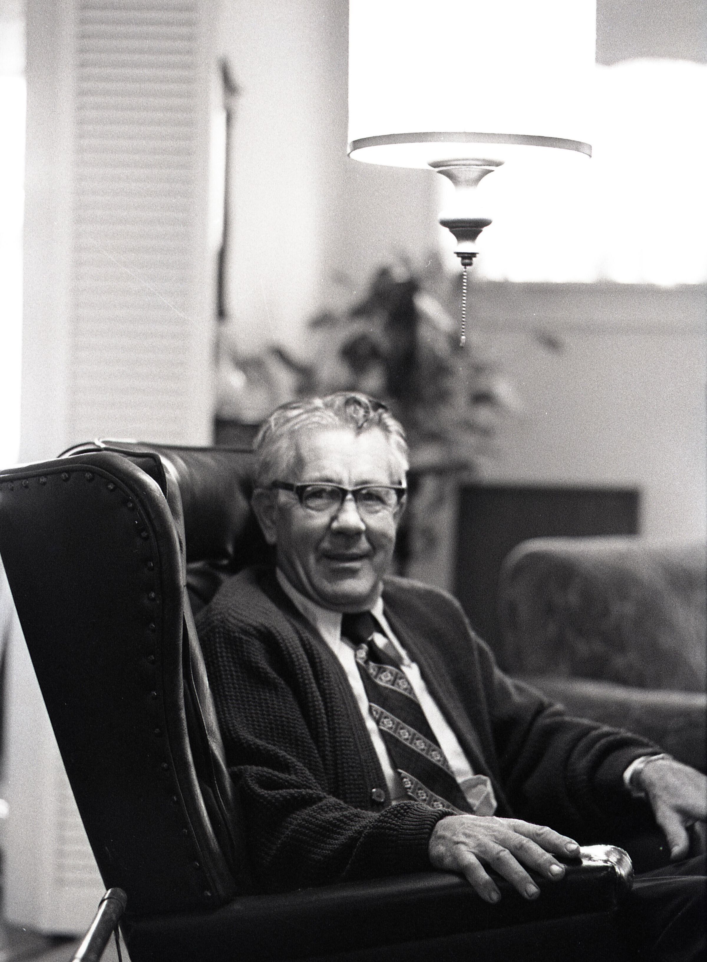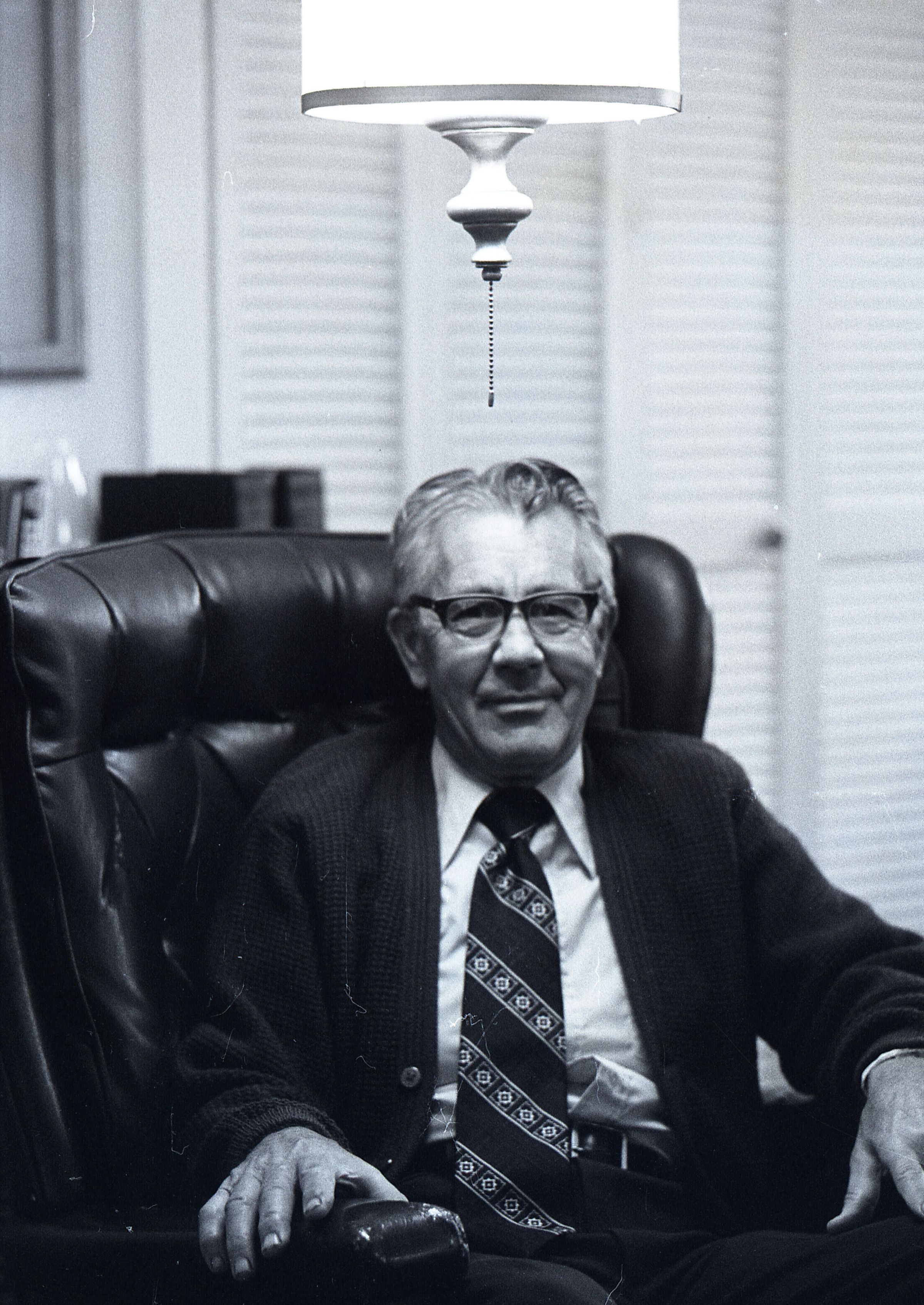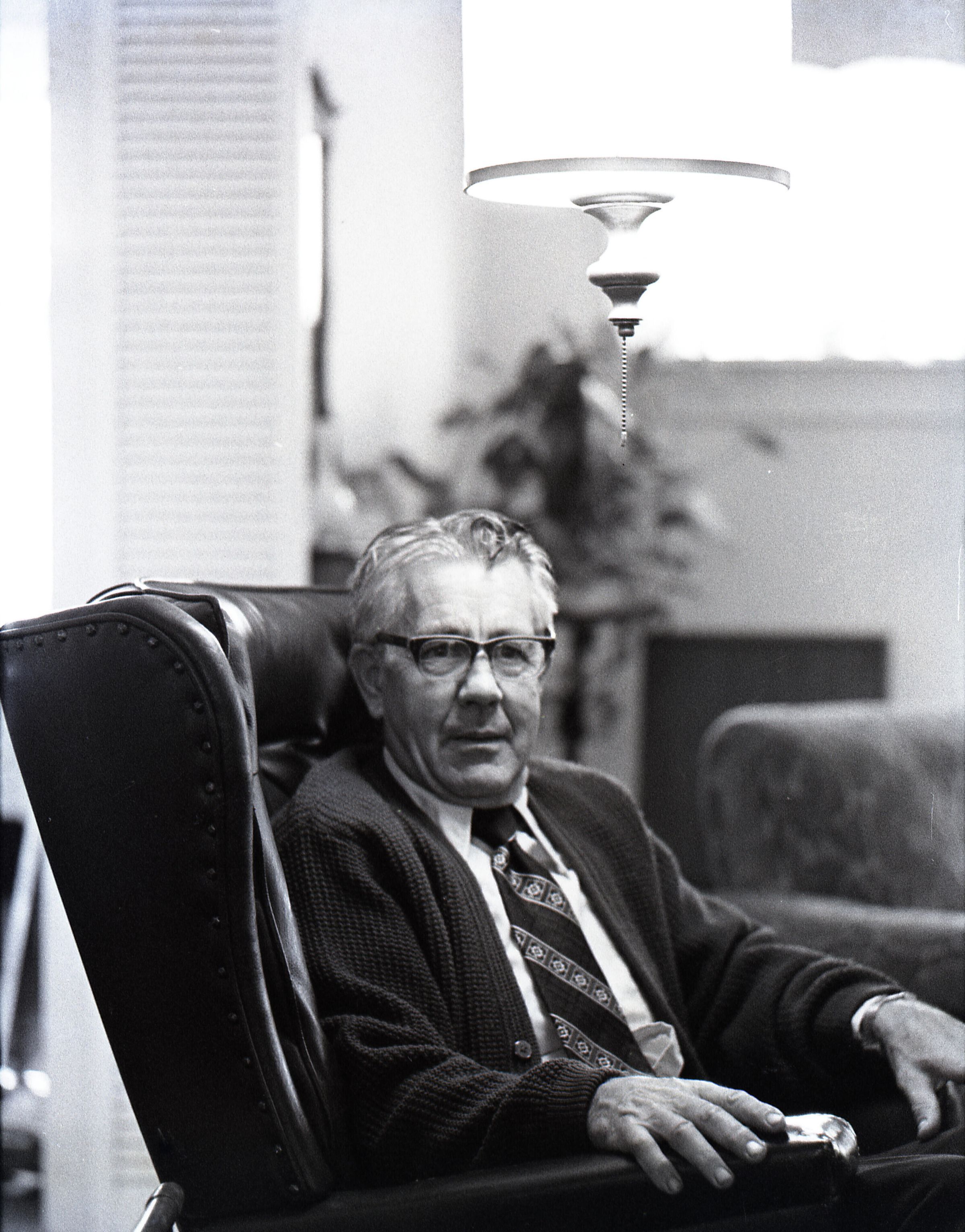 Tom Huntamer, 09-12-1979. These two black and white film negative strips were created for the Lacey Leader newspaper. Mr. Huntamer is wearing glasses and a tie, sitting in a large recliner chair. The images are taken from several different angles.Made/Created