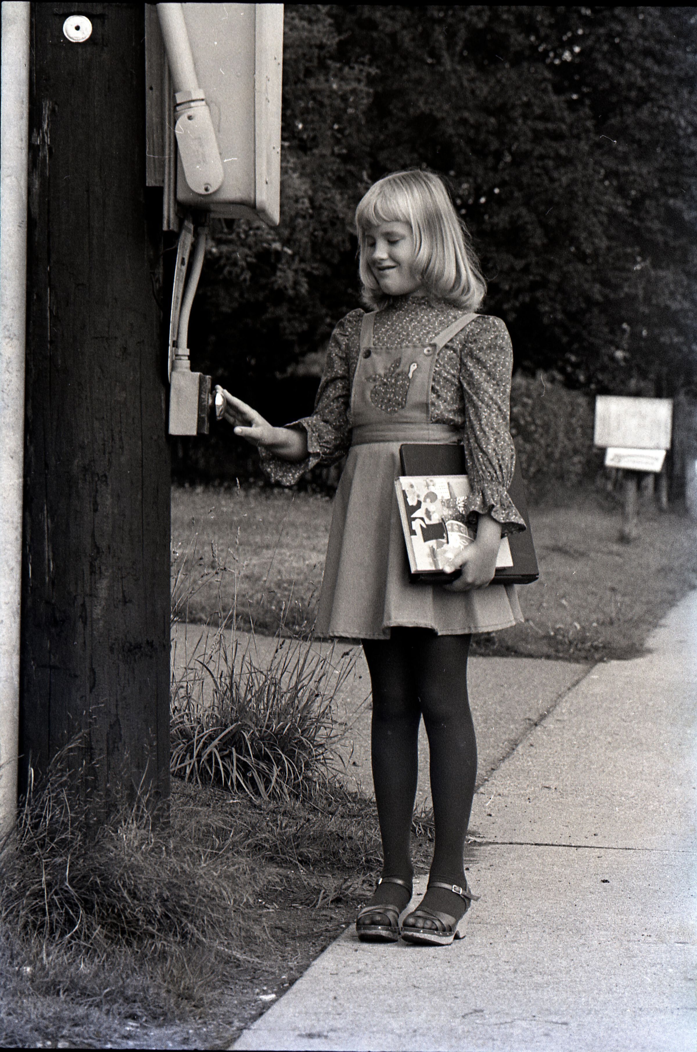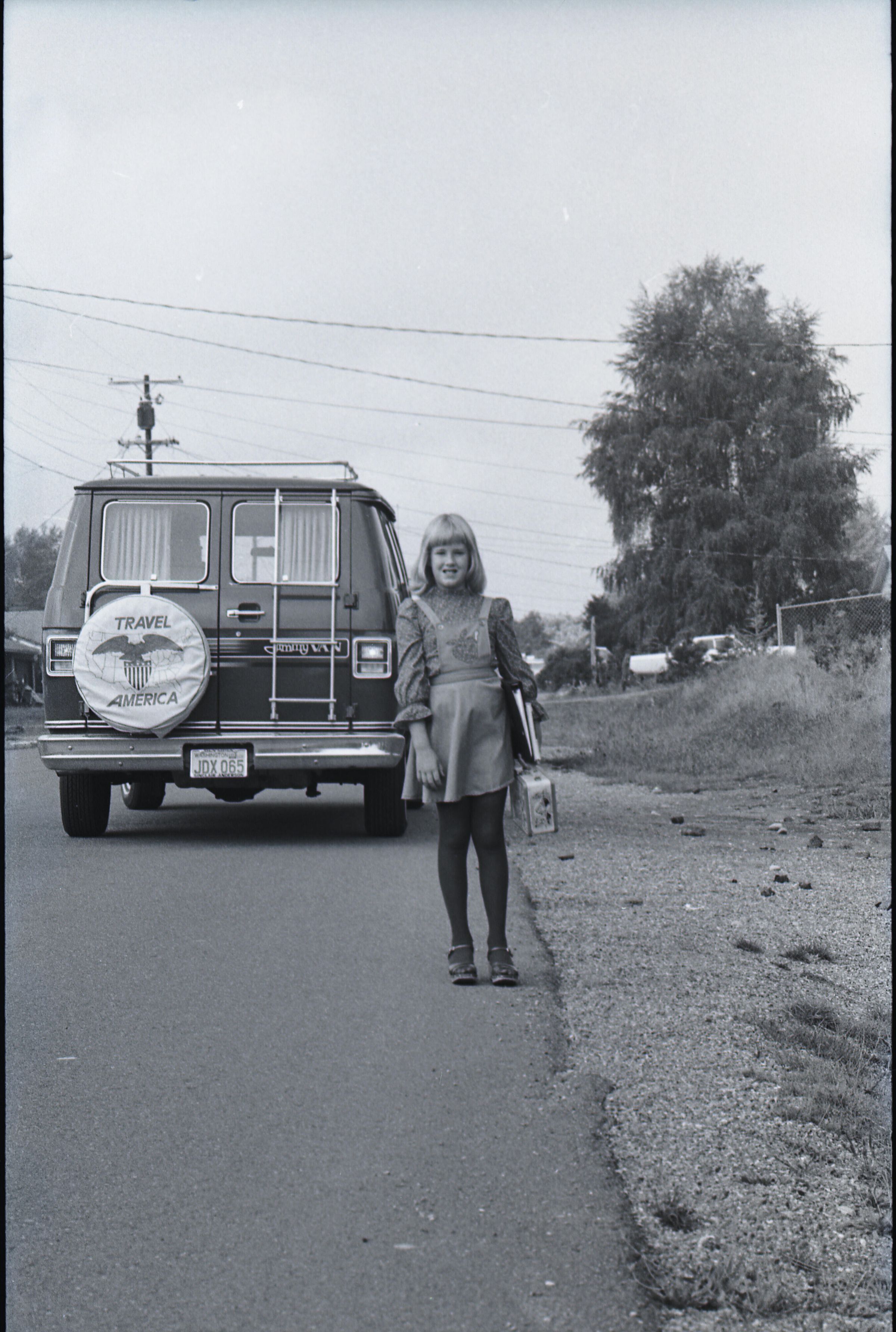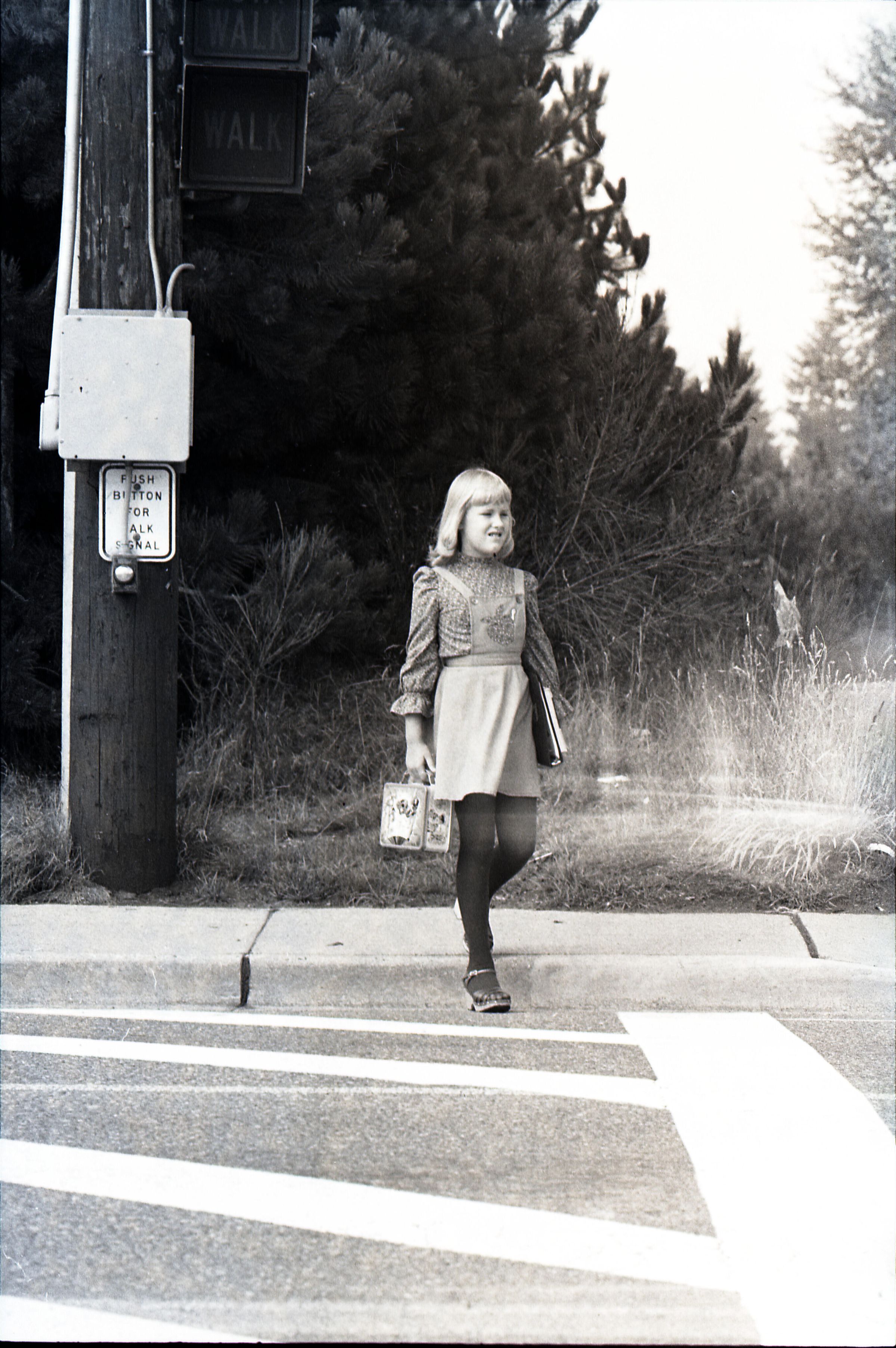 Liese Lindholm, 1804 Mull Drive, Safety Photos, 1979. These two black and white film negative strips were created for the Lacey Leader newspaper. These images show a girl (Liese Lindholm) standing at a crosswalk and walking along the side of a road.Made/Created