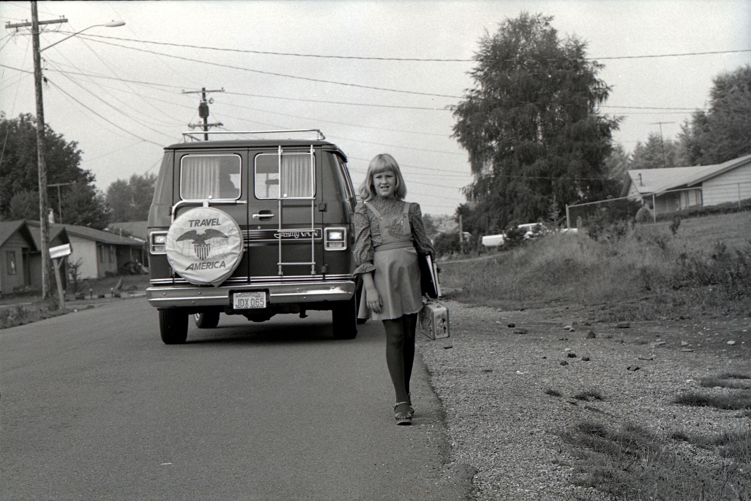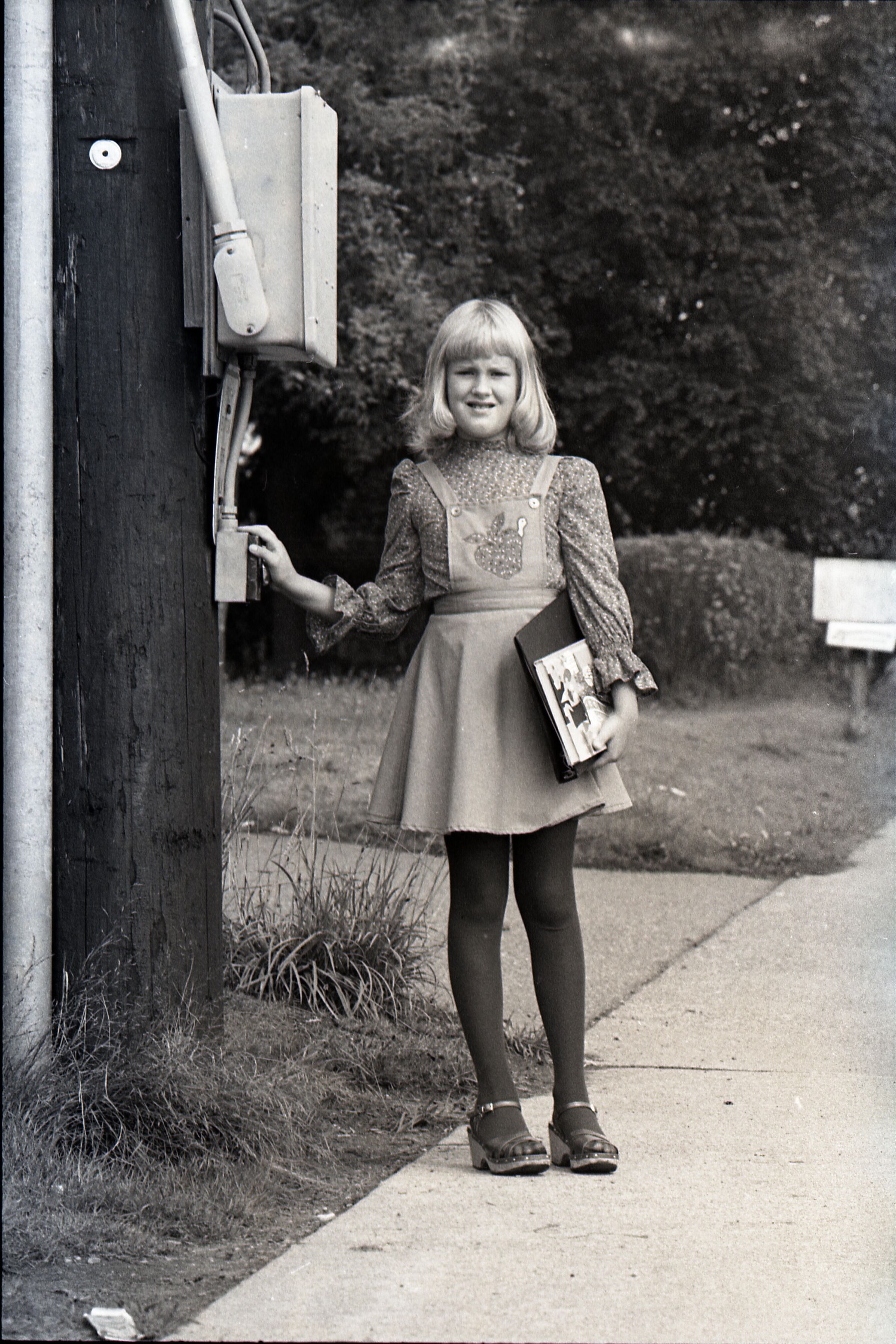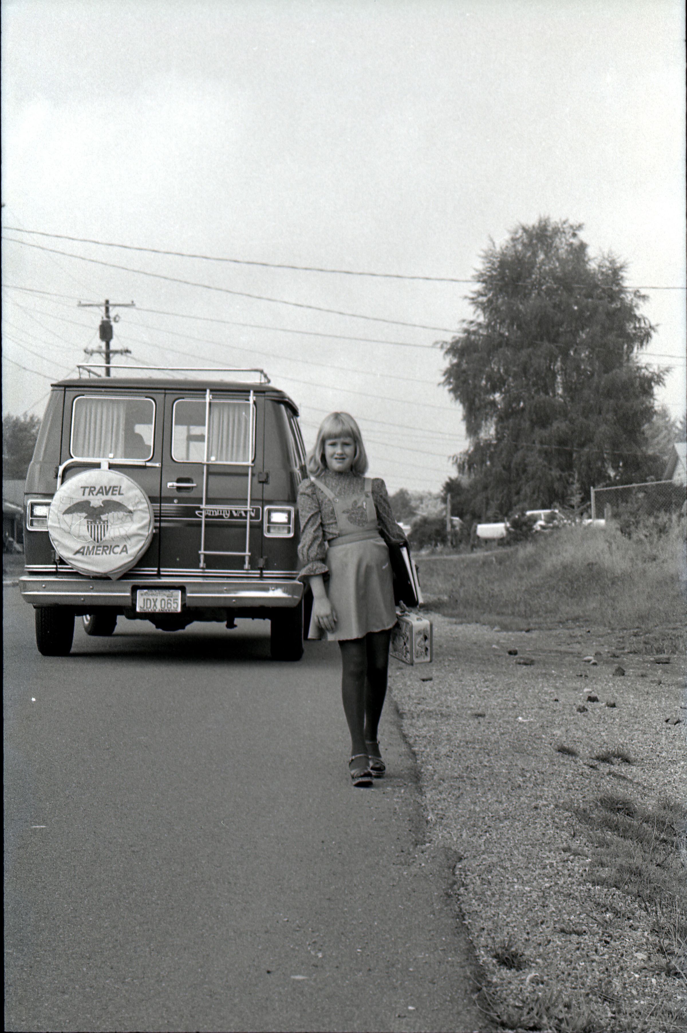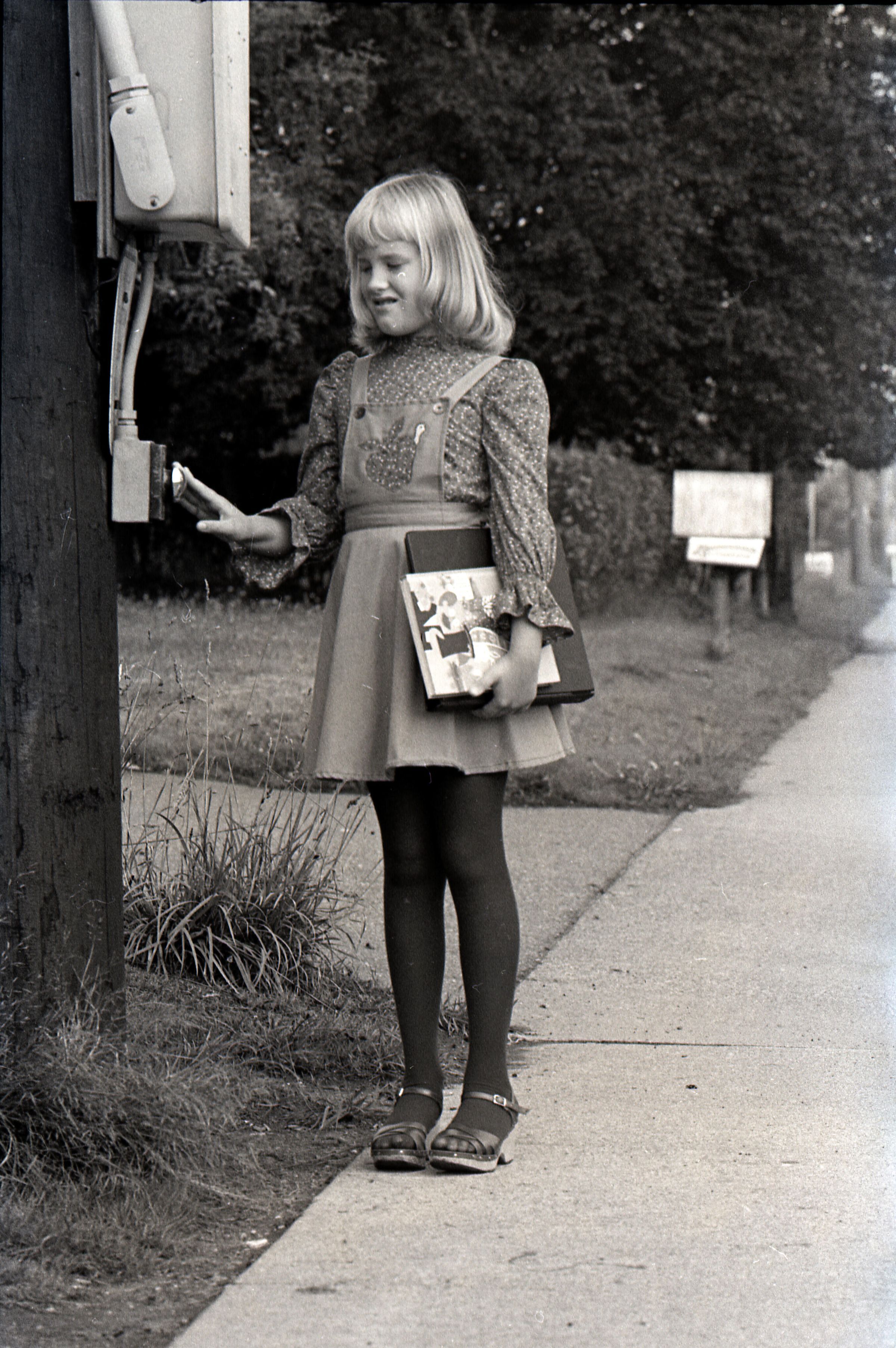 Liese Lindholm, 1804 Mull Drive, Safety Photos, 1979. These two black and white film negative strips were created for the Lacey Leader newspaper. These images show a girl (Liese Lindholm) standing at a crosswalk and walking along the side of a road.Made/Created