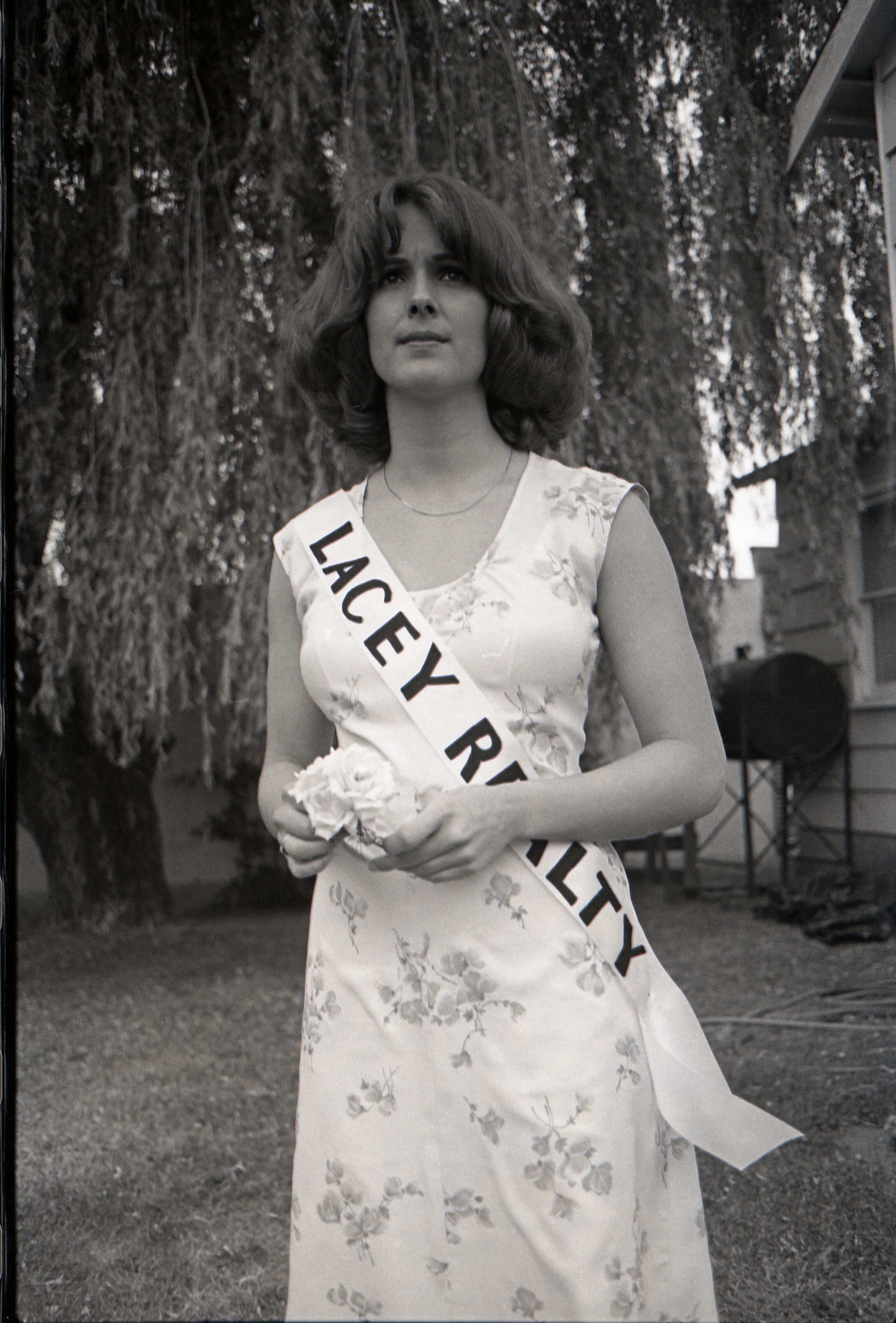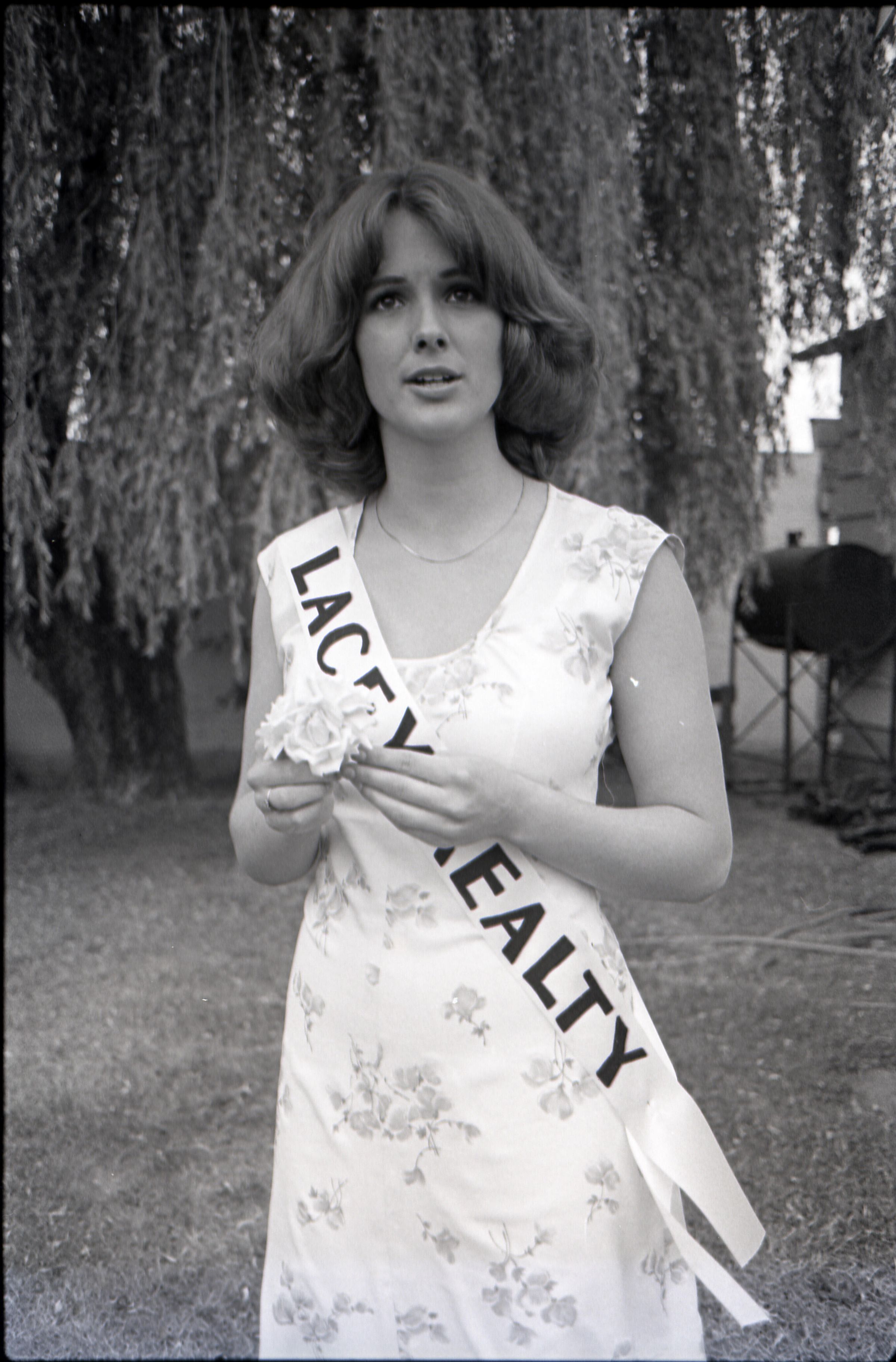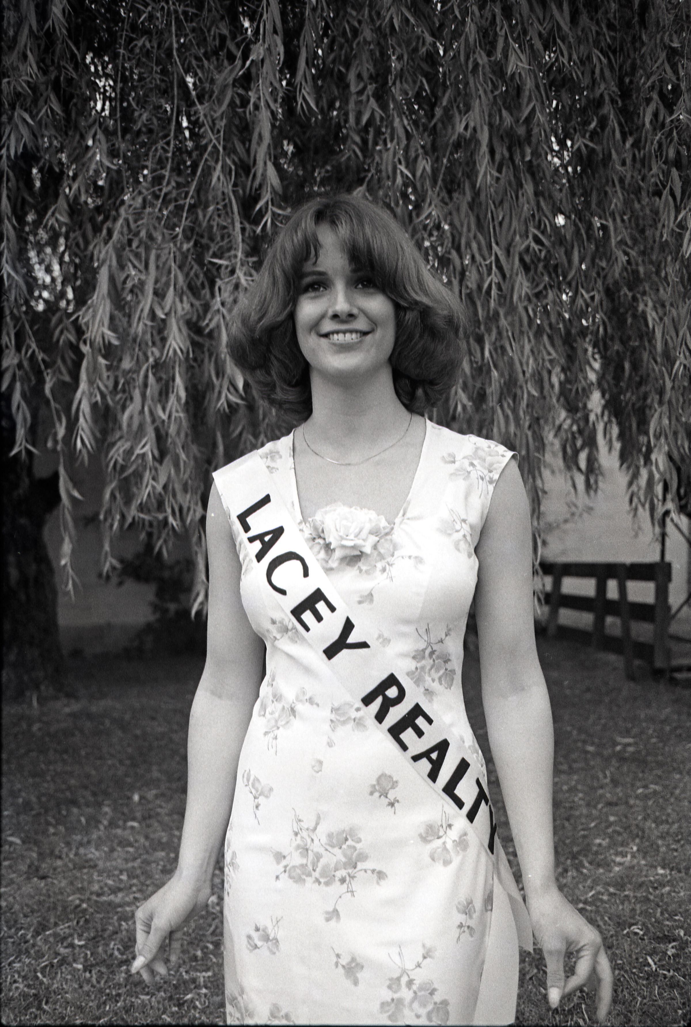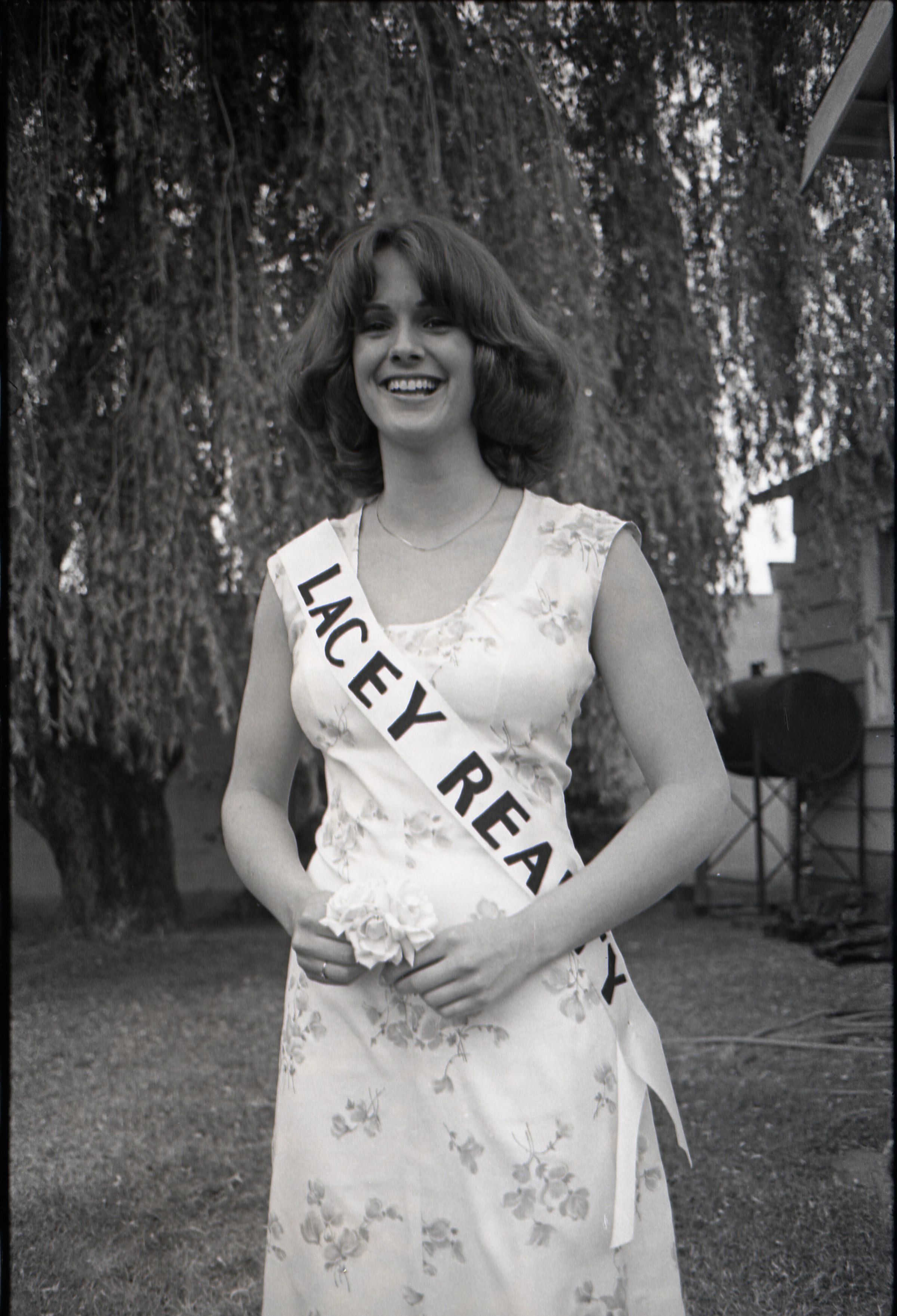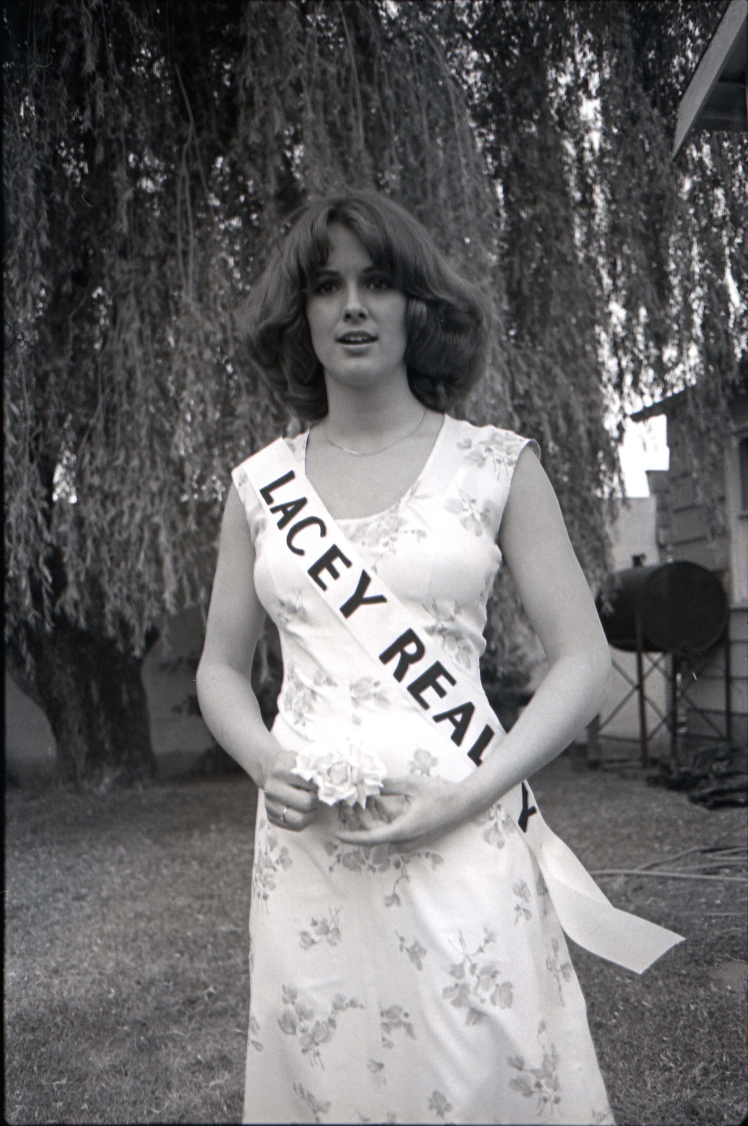 Cindy Levesque, 1979. These four black and white film negative strips were created for the Lacey Leader newspaper. These images show a young woman (Cindy Levesque) wearing a long, floral-print dress and a sash which reads "LACEY REALTY."Made/Created