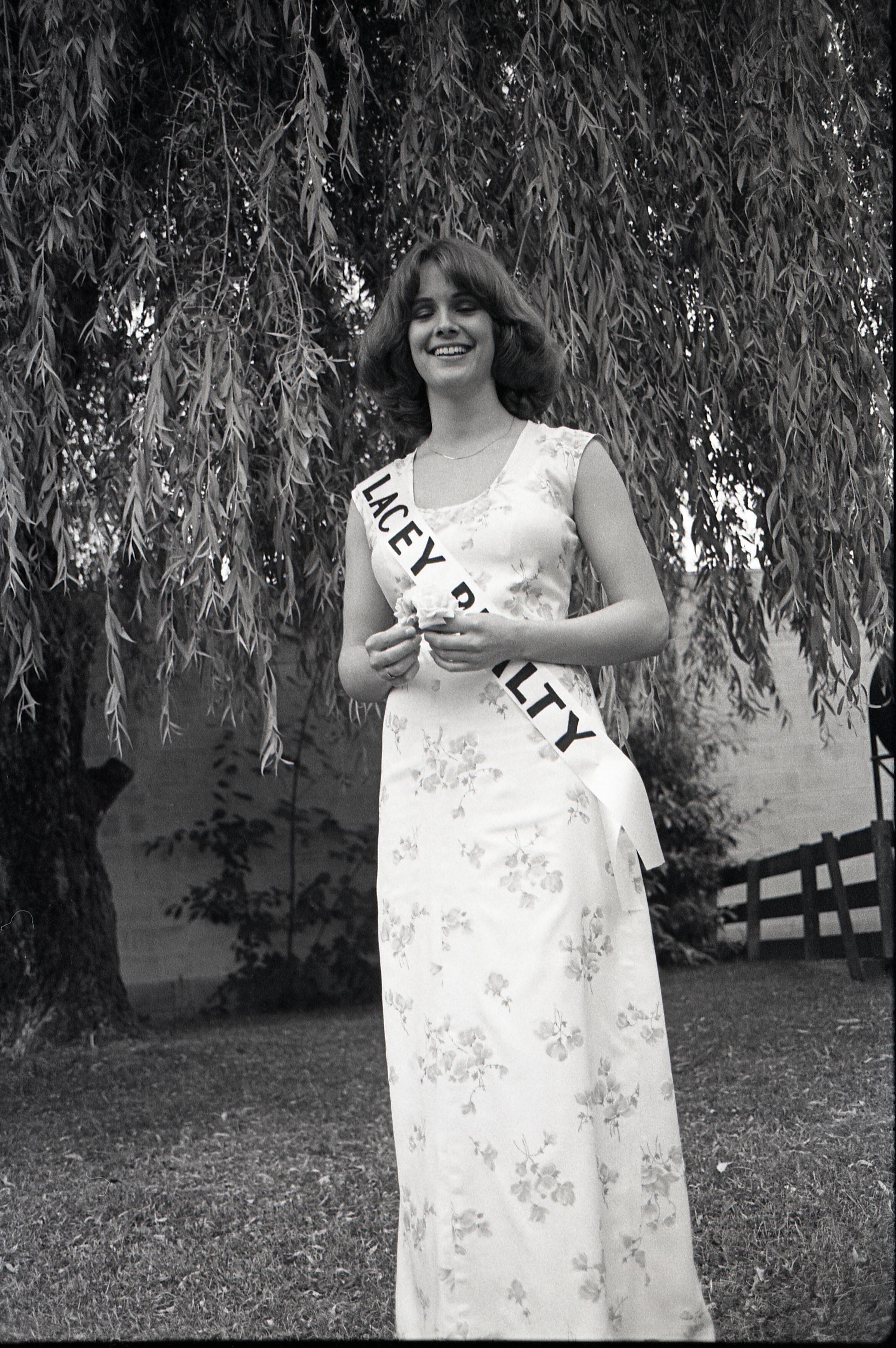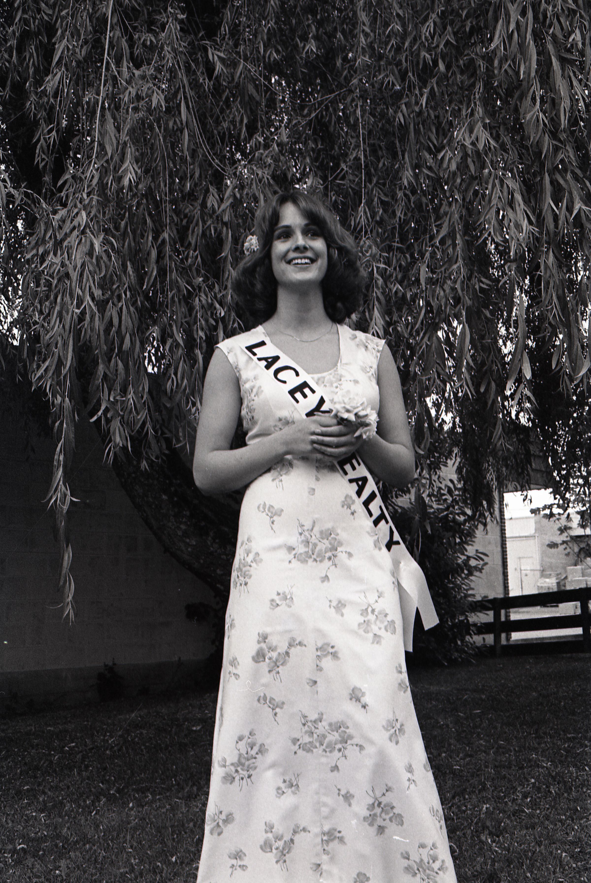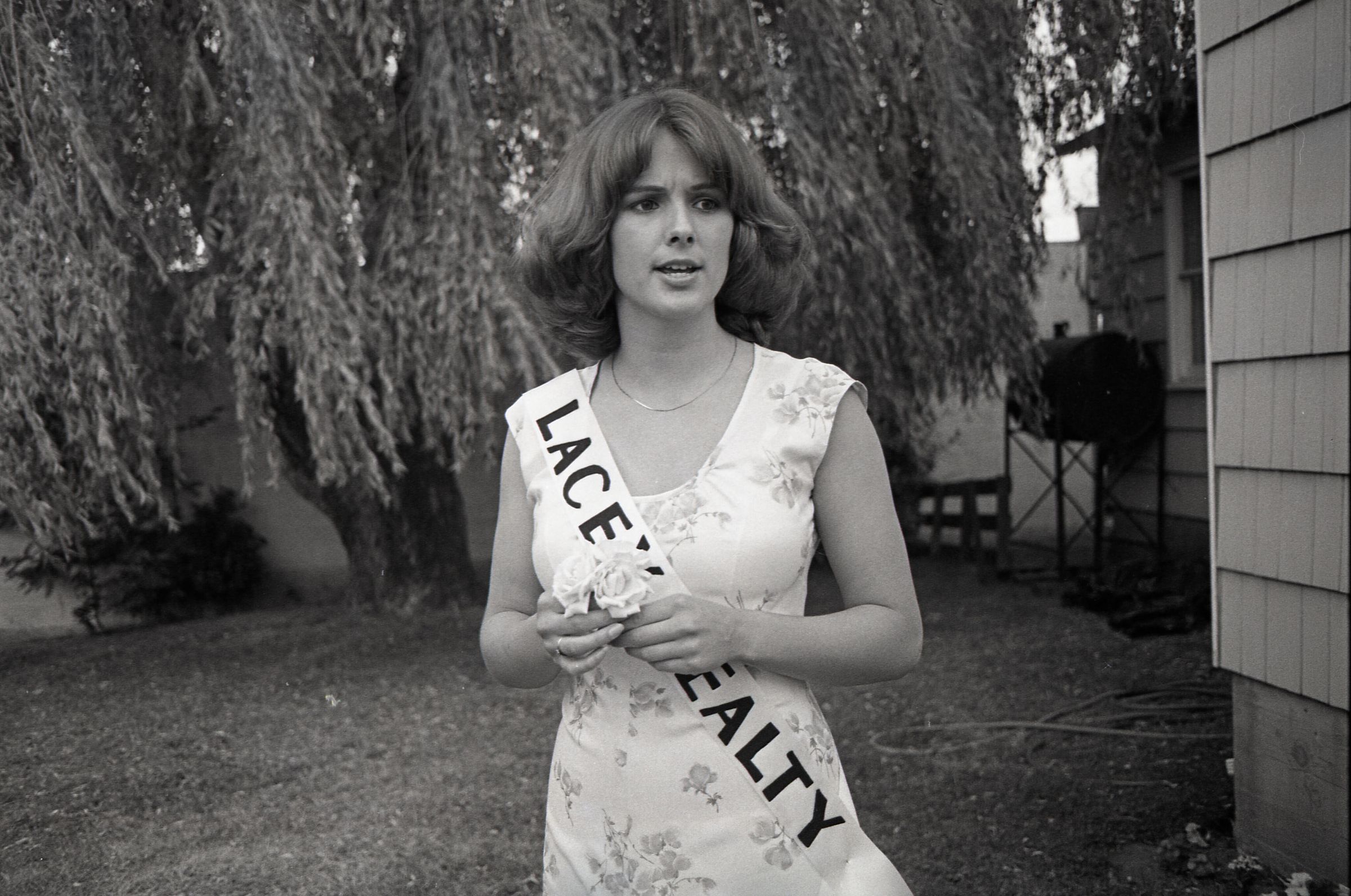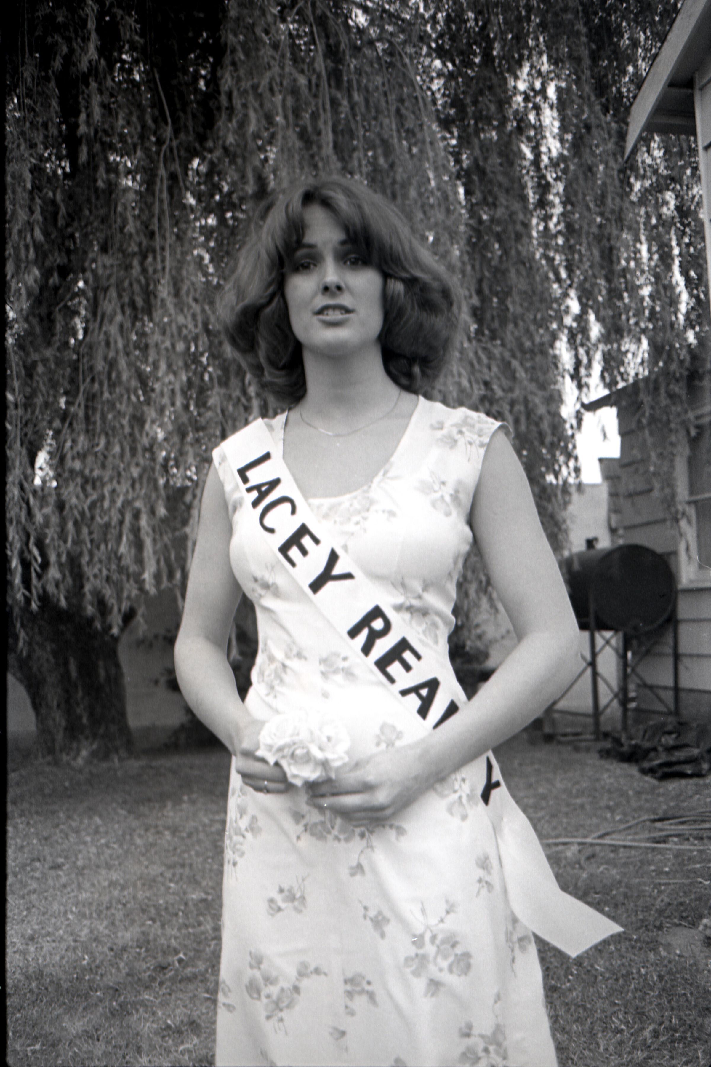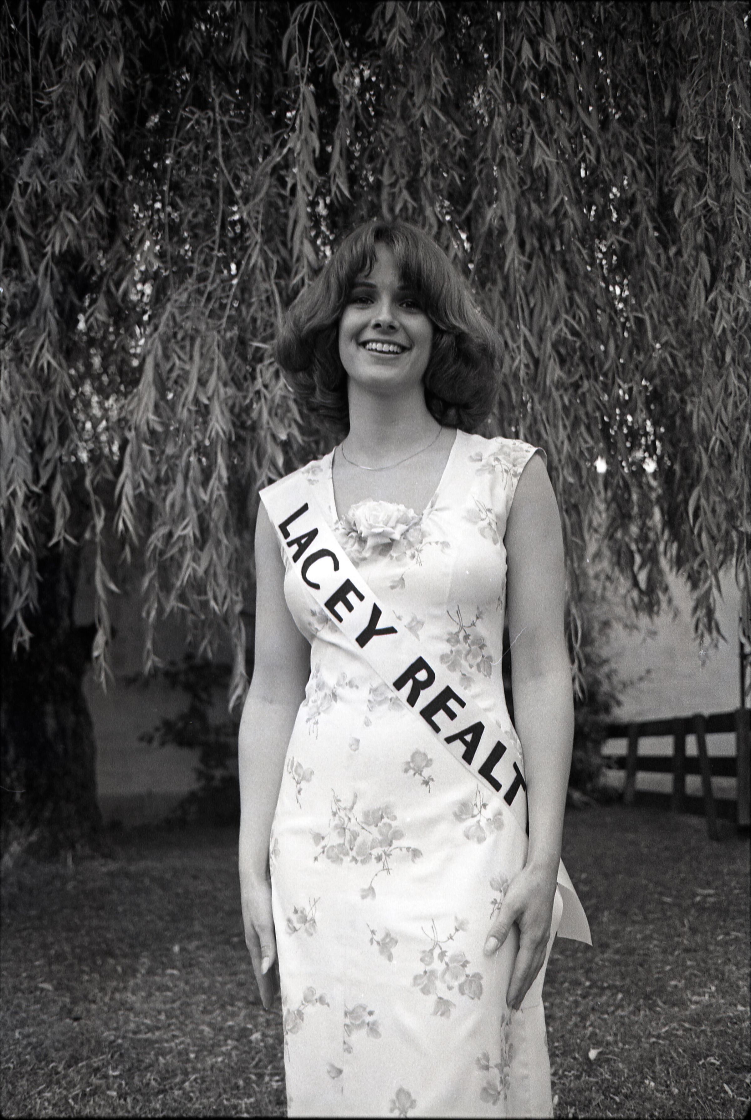 Cindy Levesque, 1979. These four black and white film negative strips were created for the Lacey Leader newspaper. These images show a young woman (Cindy Levesque) wearing a long, floral-print dress and a sash which reads "LACEY REALTY."Made/Created