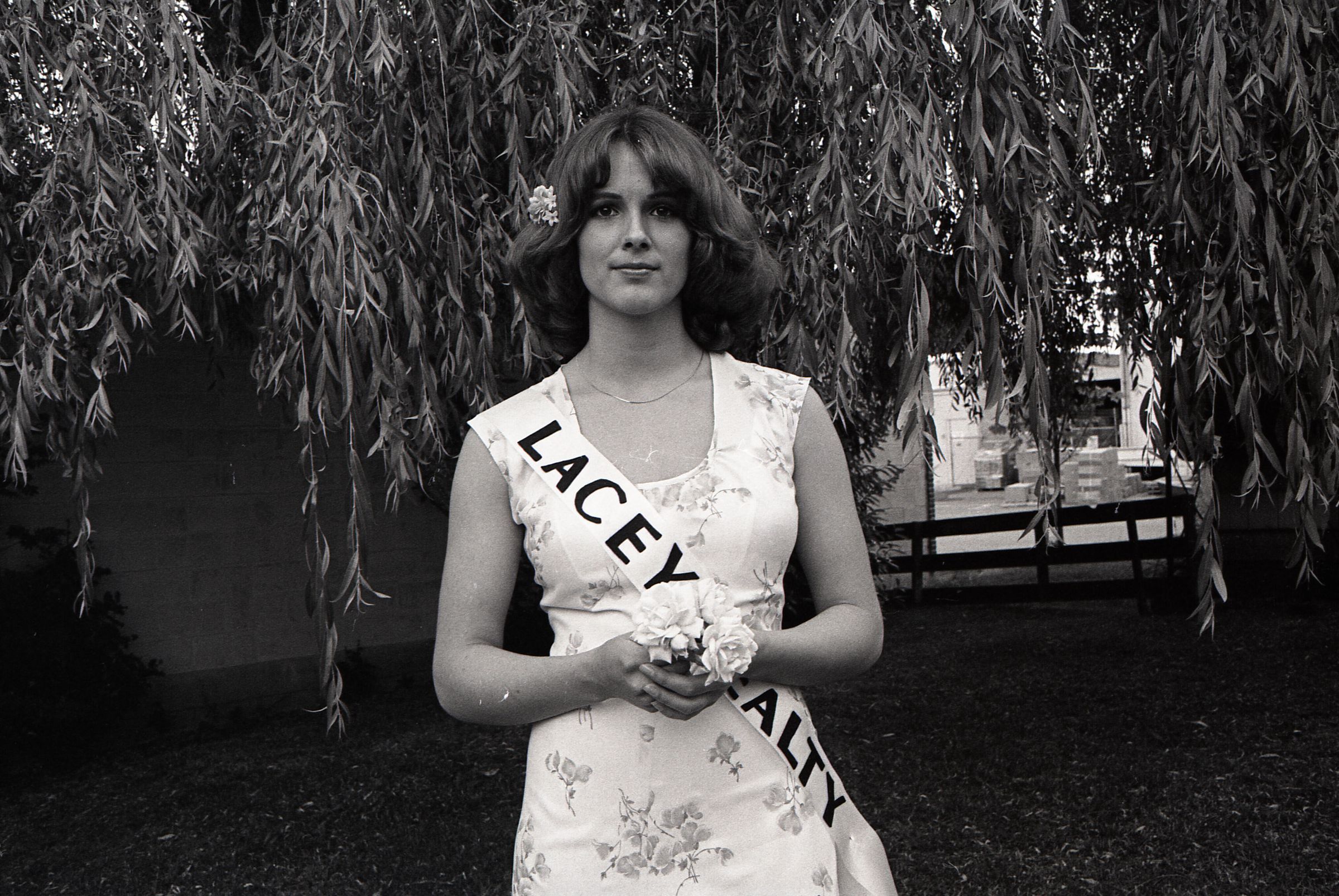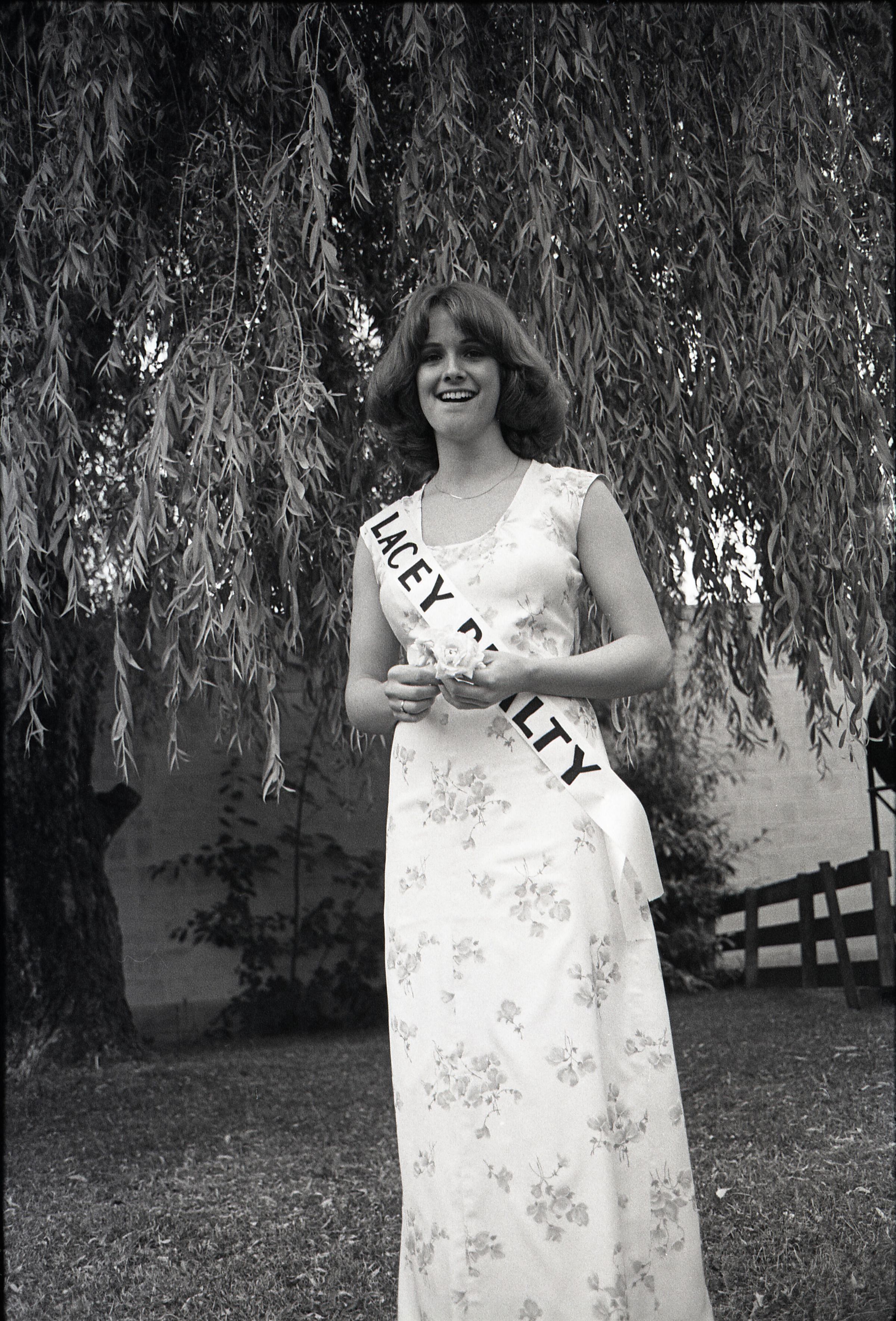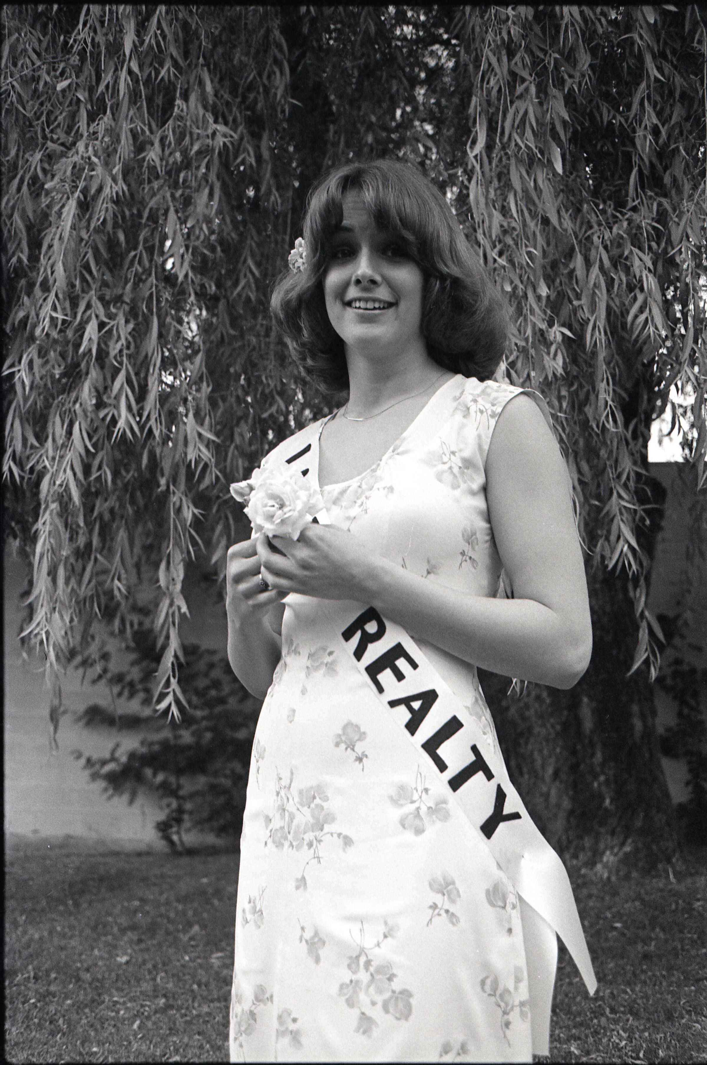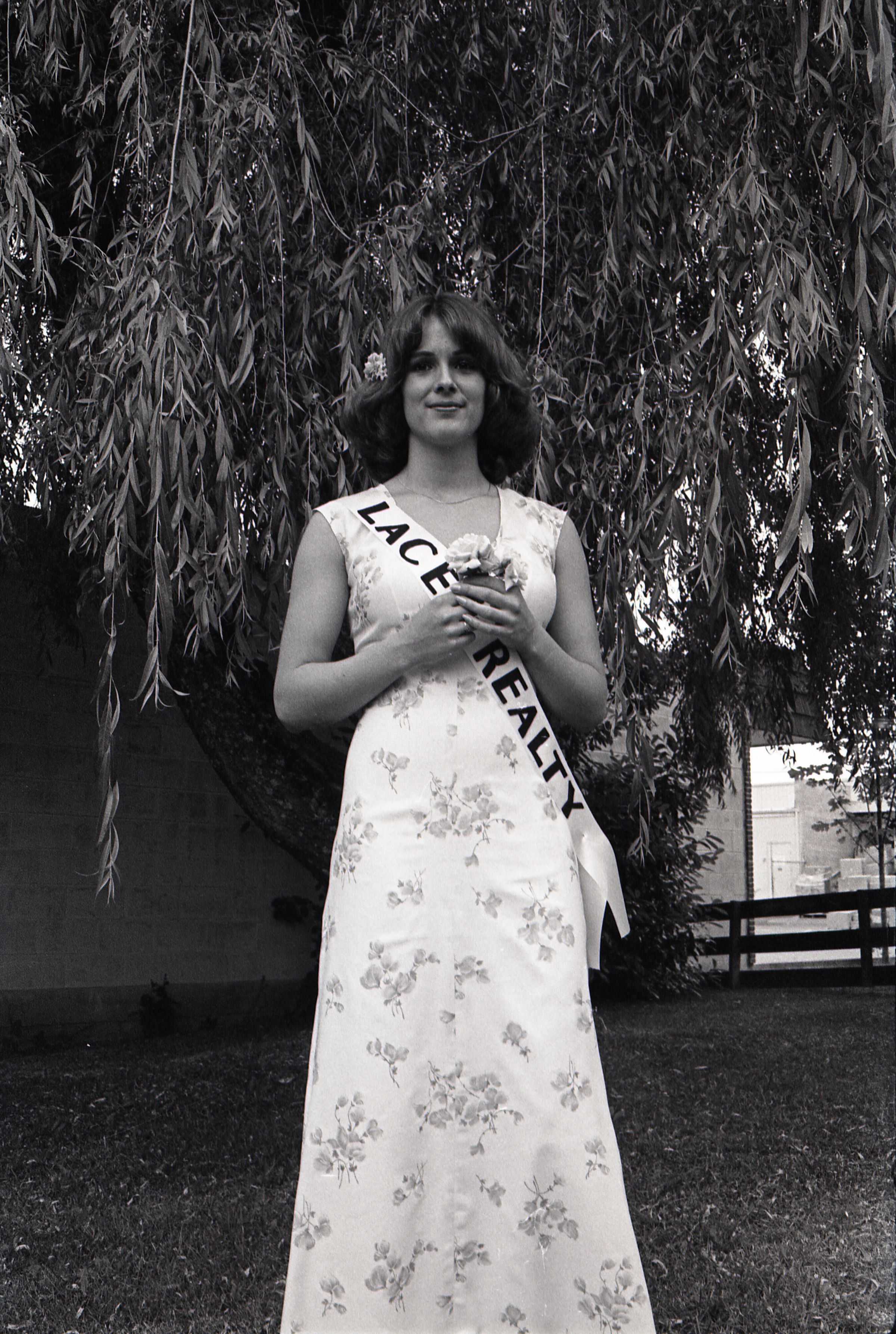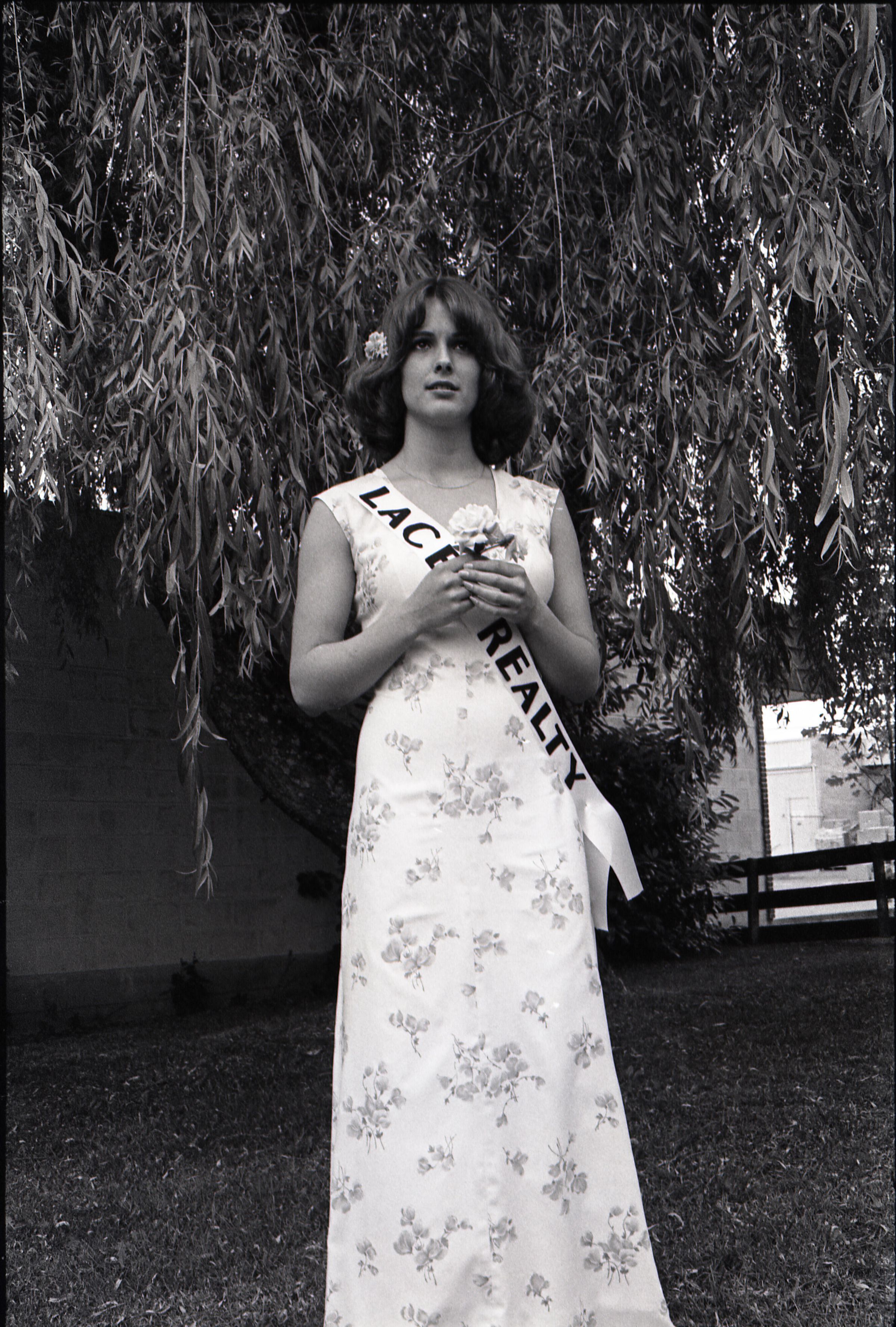 Cindy Levesque, 1979. These four black and white film negative strips were created for the Lacey Leader newspaper. These images show a young woman (Cindy Levesque) wearing a long, floral-print dress and a sash which reads "LACEY REALTY."Made/Created