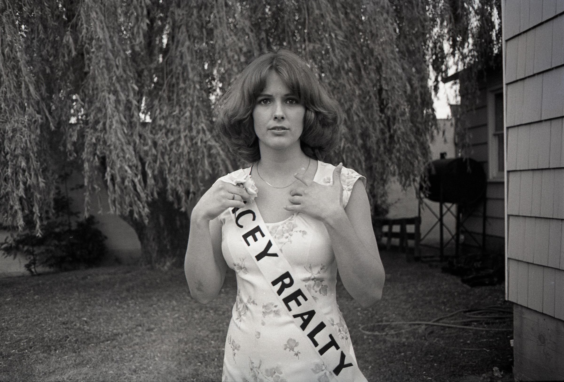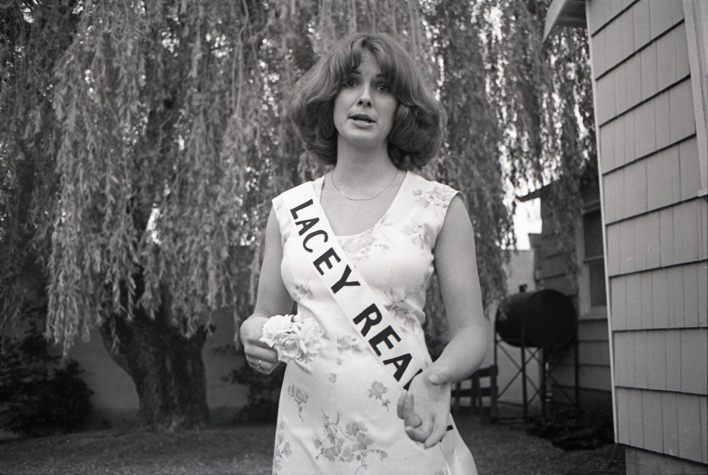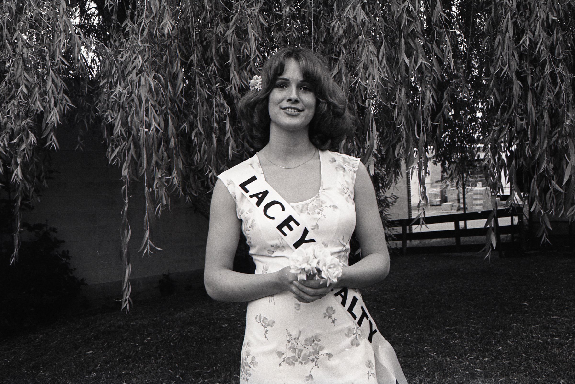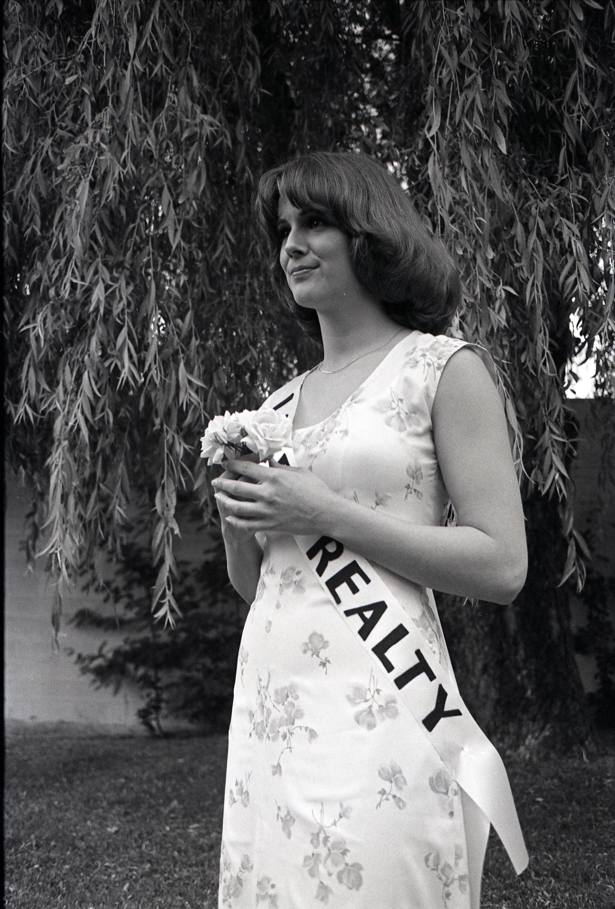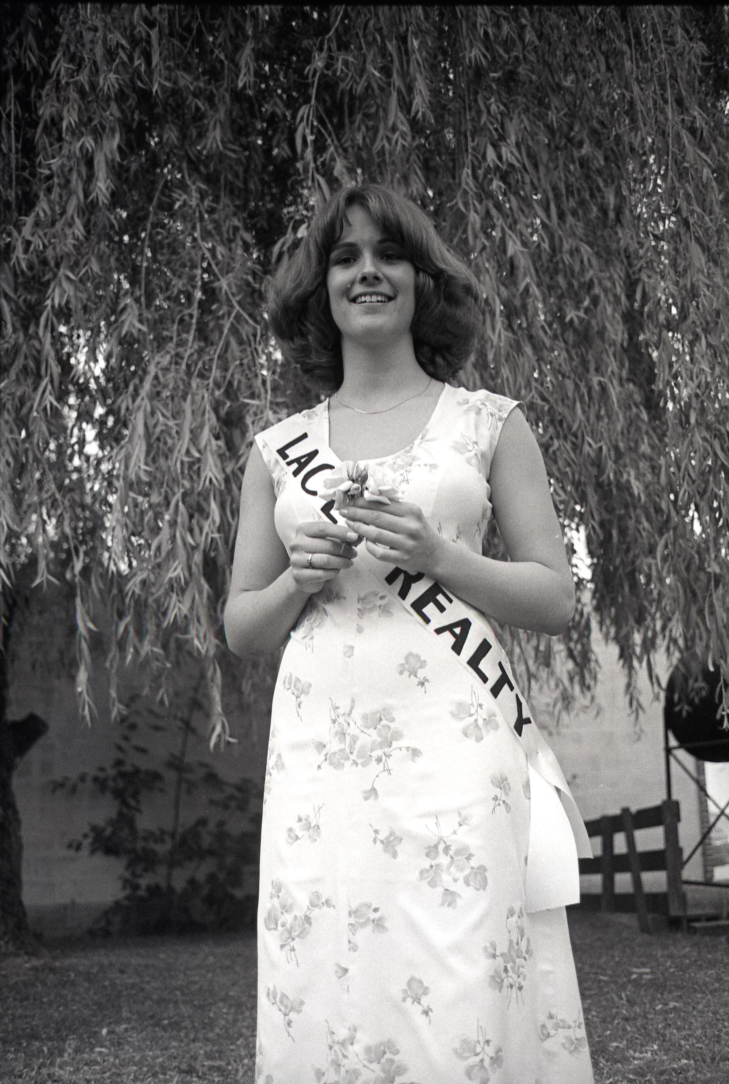 Cindy Levesque, 1979. These four black and white film negative strips were created for the Lacey Leader newspaper. These images show a young woman (Cindy Levesque) wearing a long, floral-print dress and a sash which reads "LACEY REALTY."Made/Created