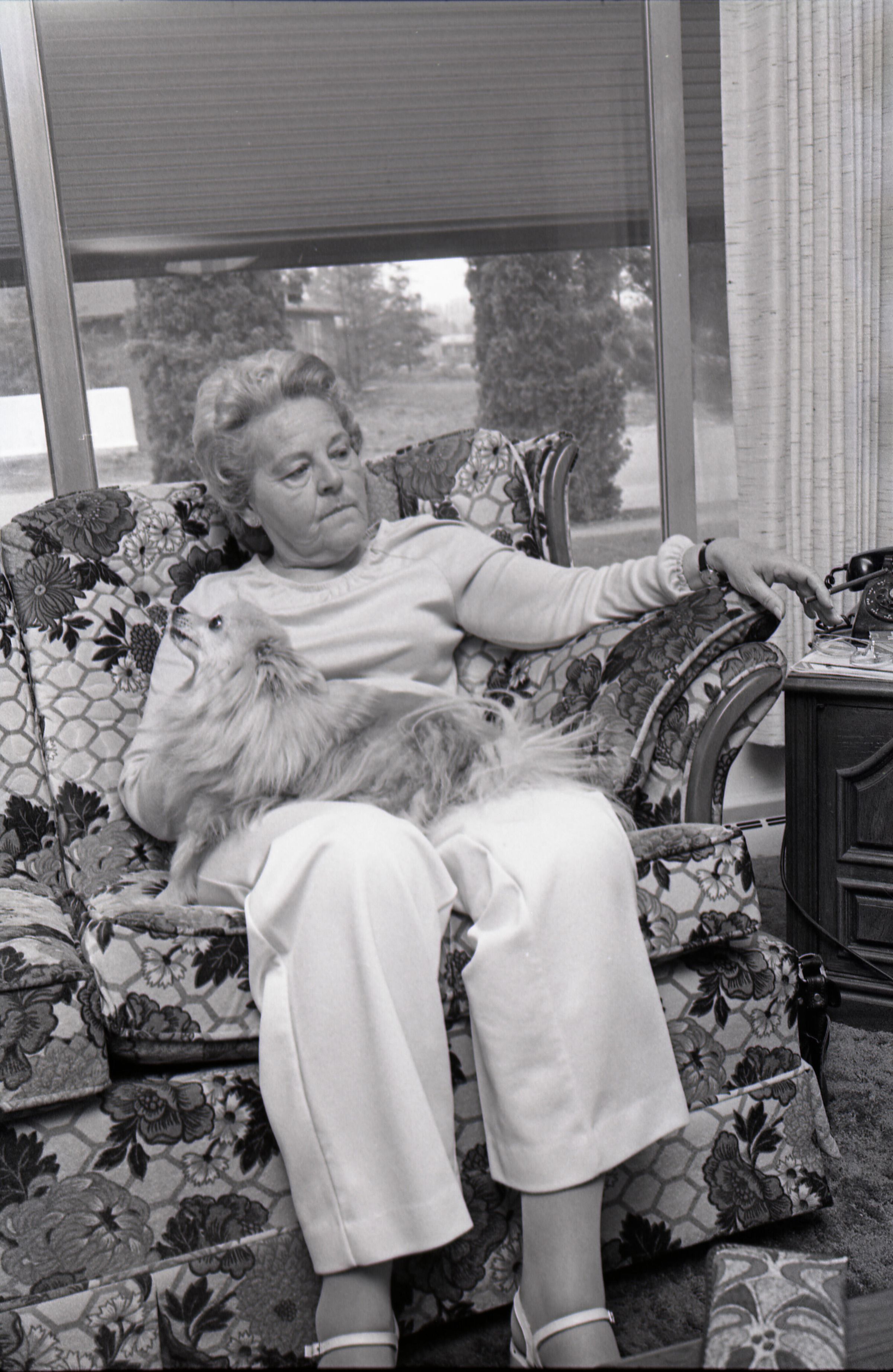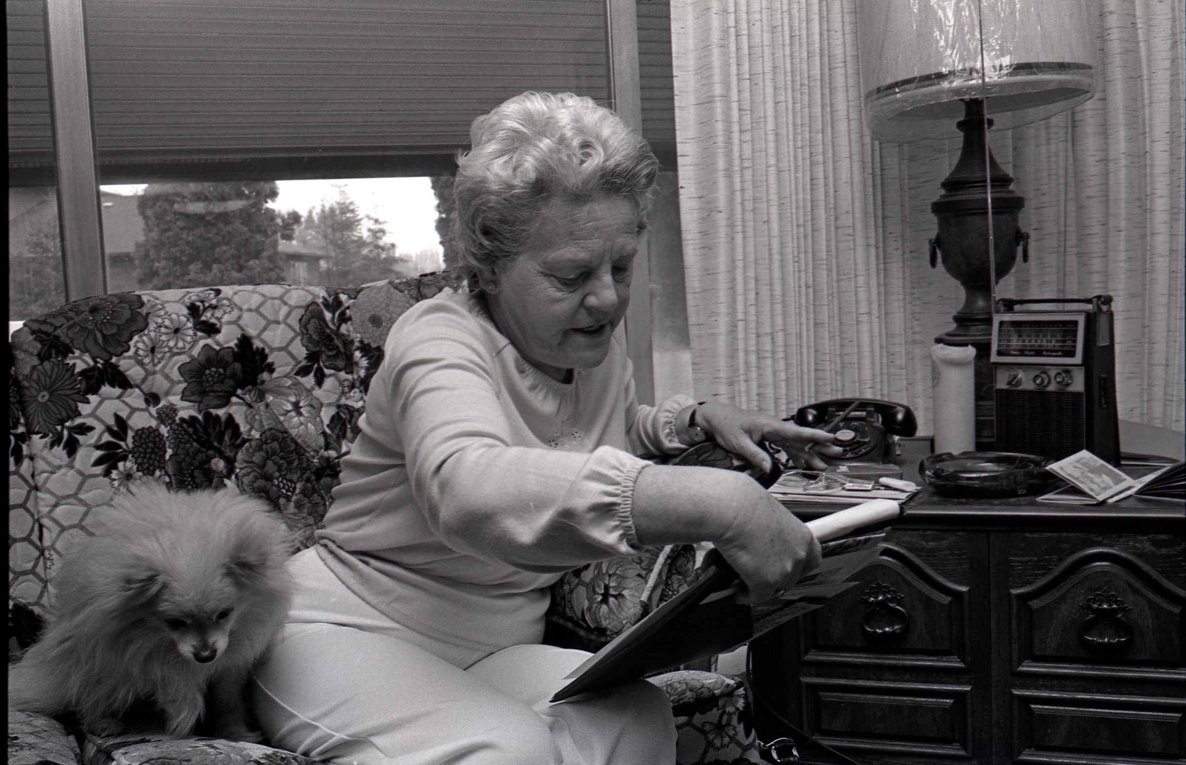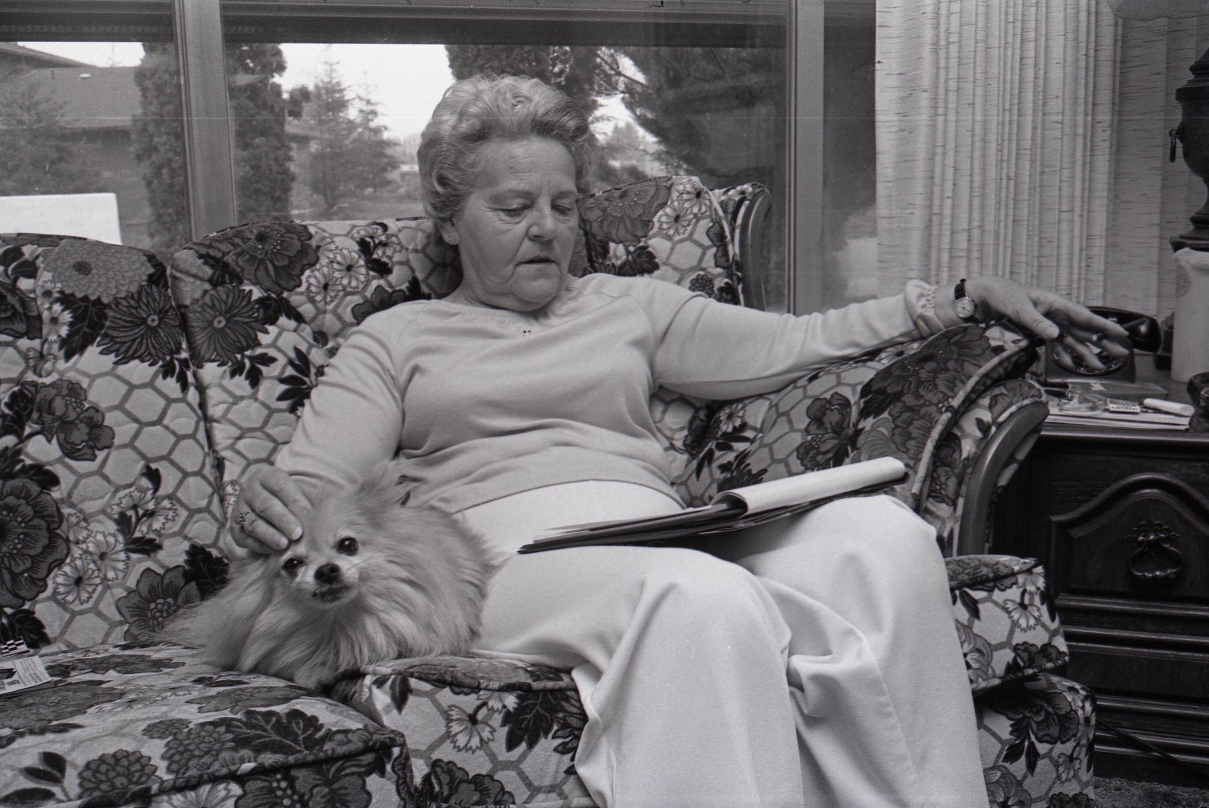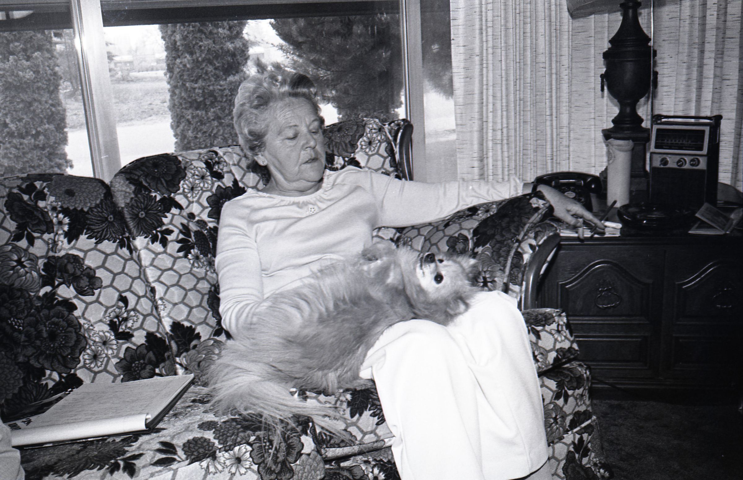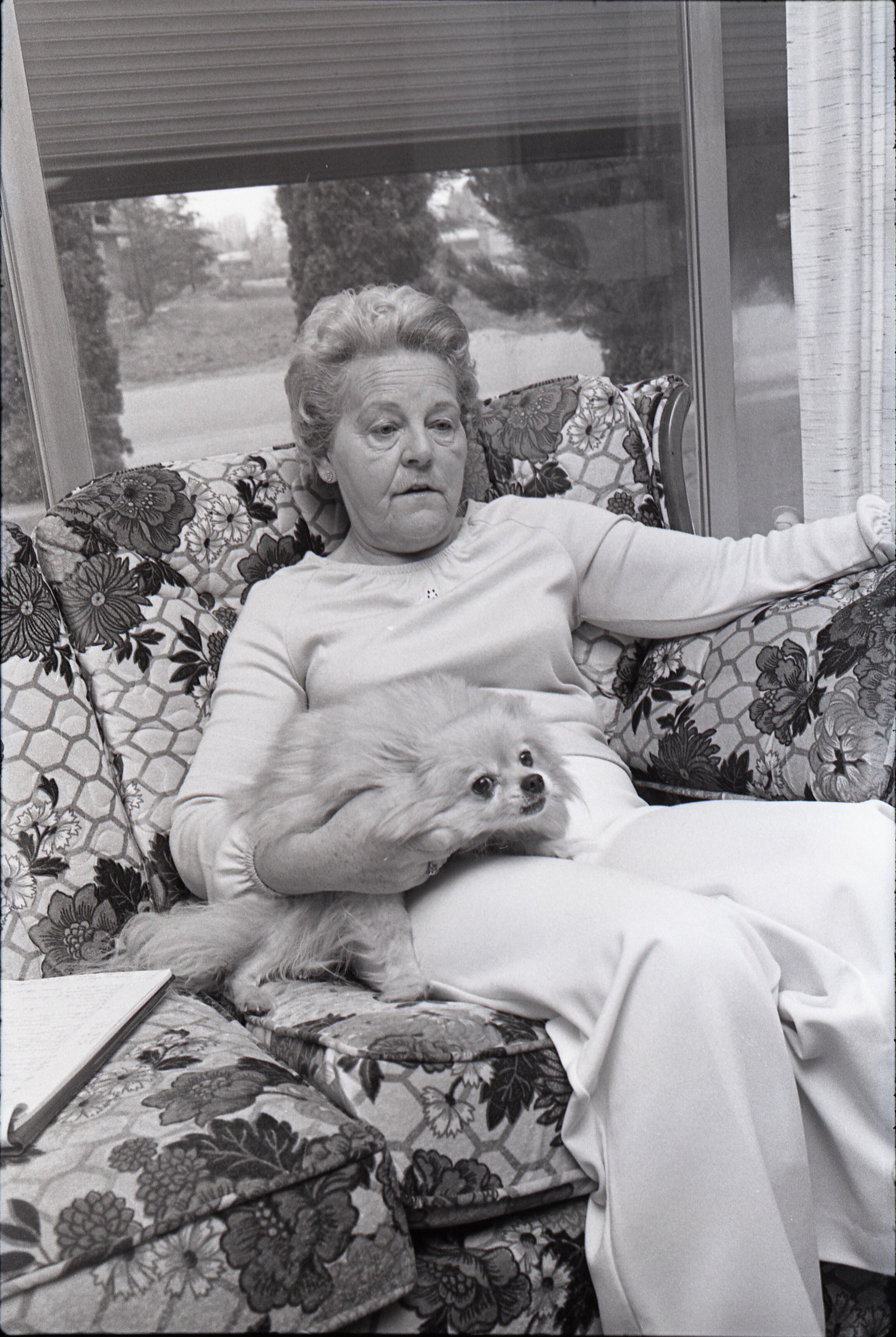 Anna Homann, 1979. These two black and white film negative strips were created for the Lacey Leader newspaper. These images show a woman (Anna Homann) seated with a small dog on a couch.Made/Created