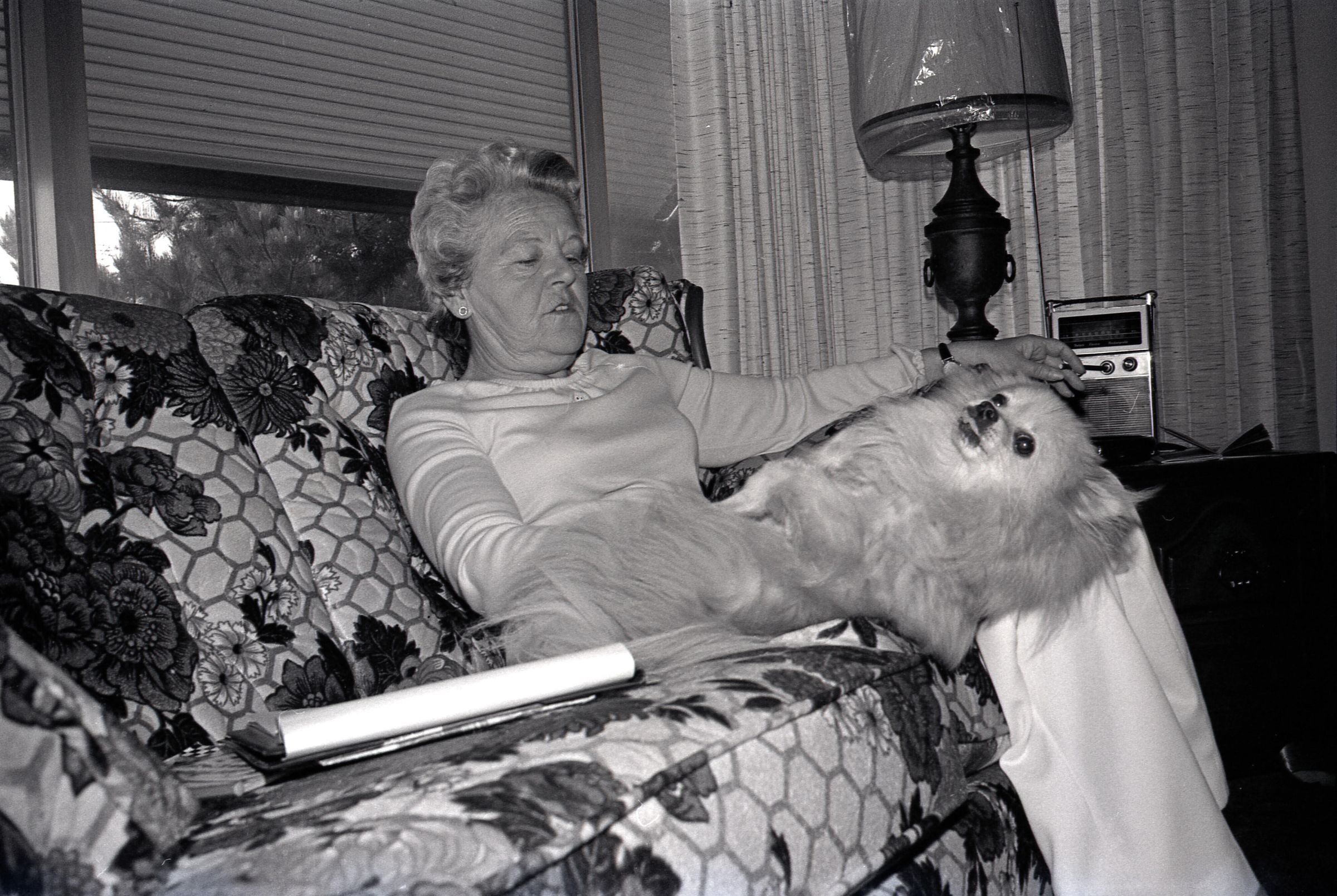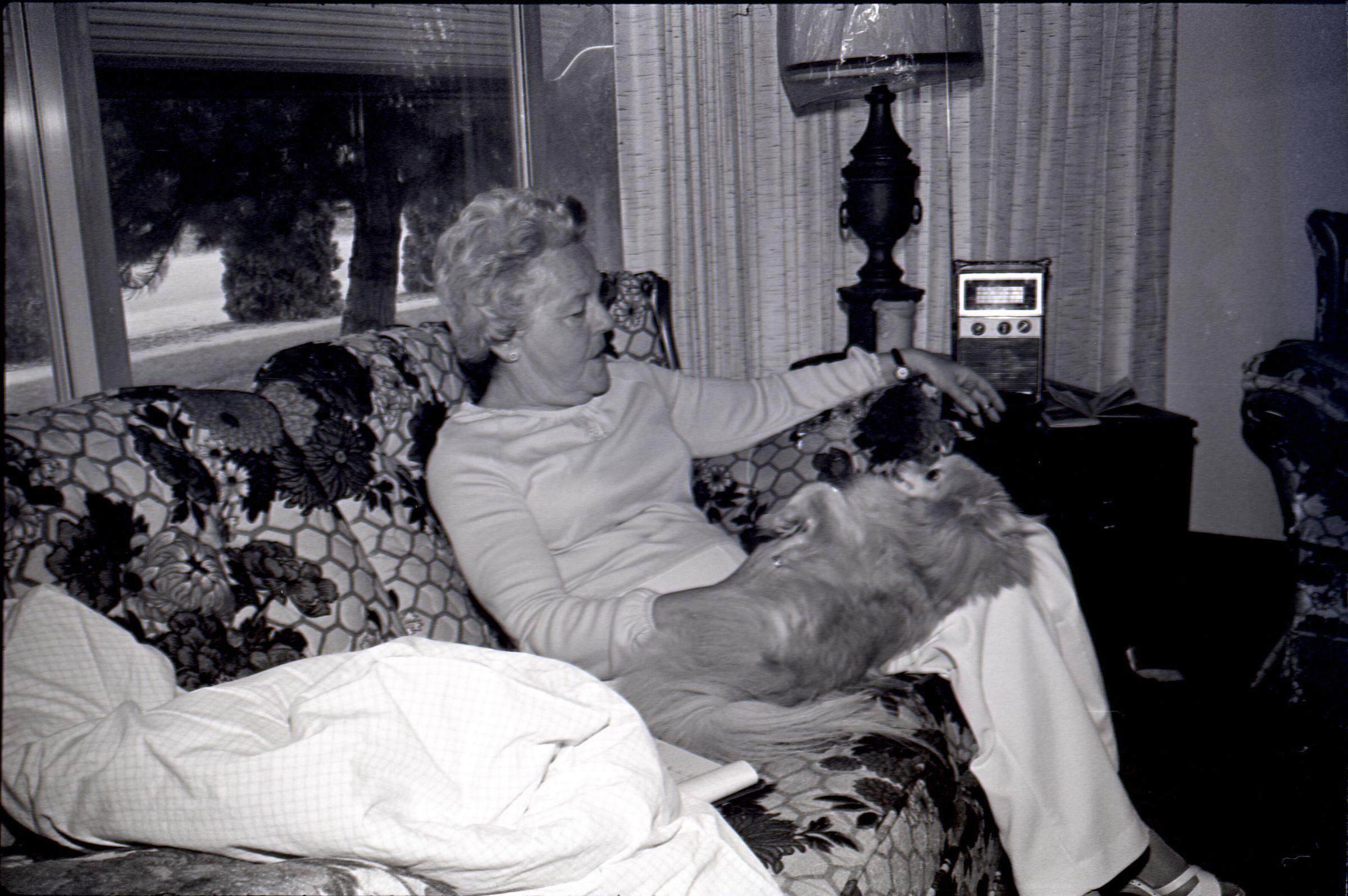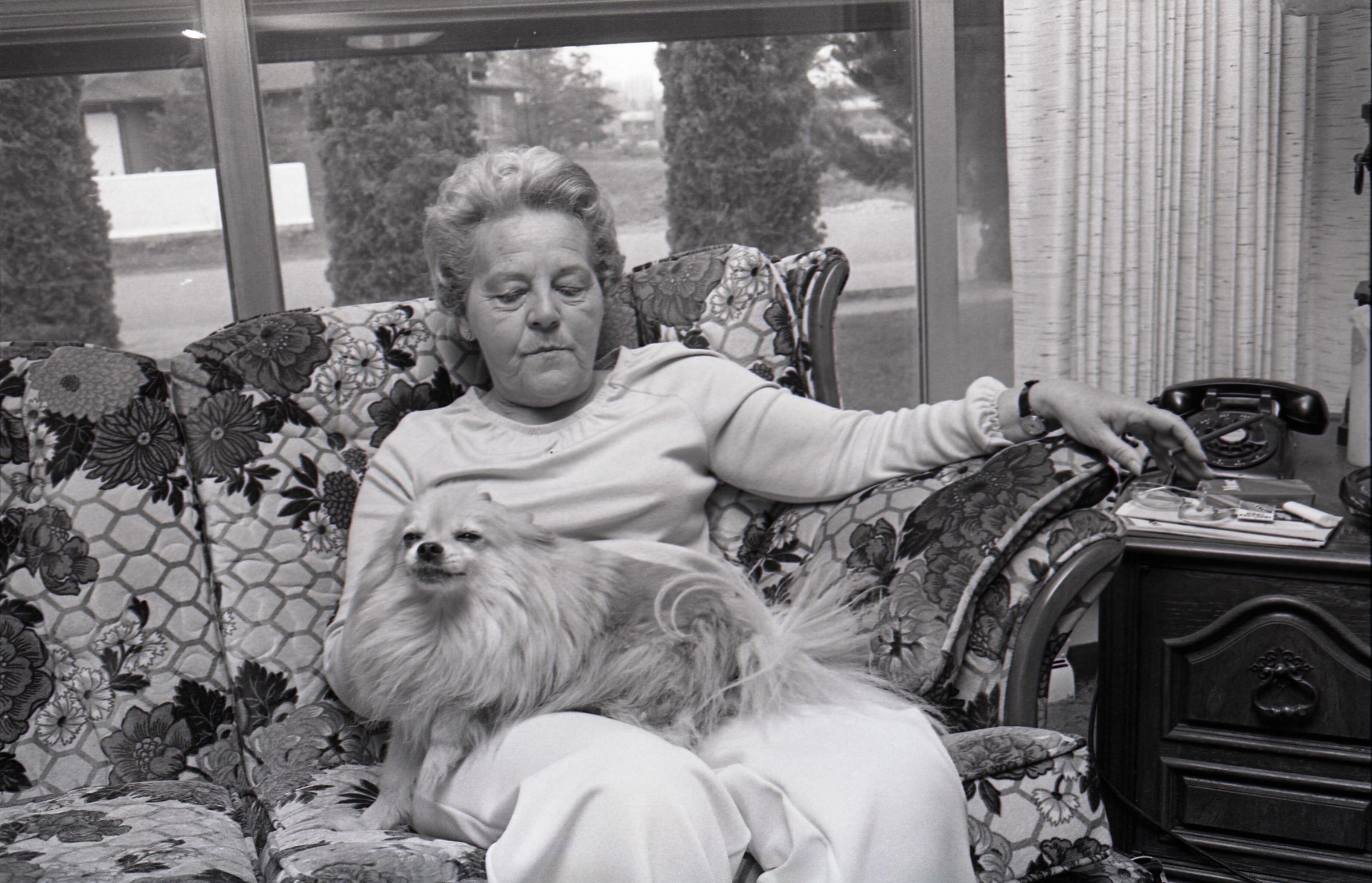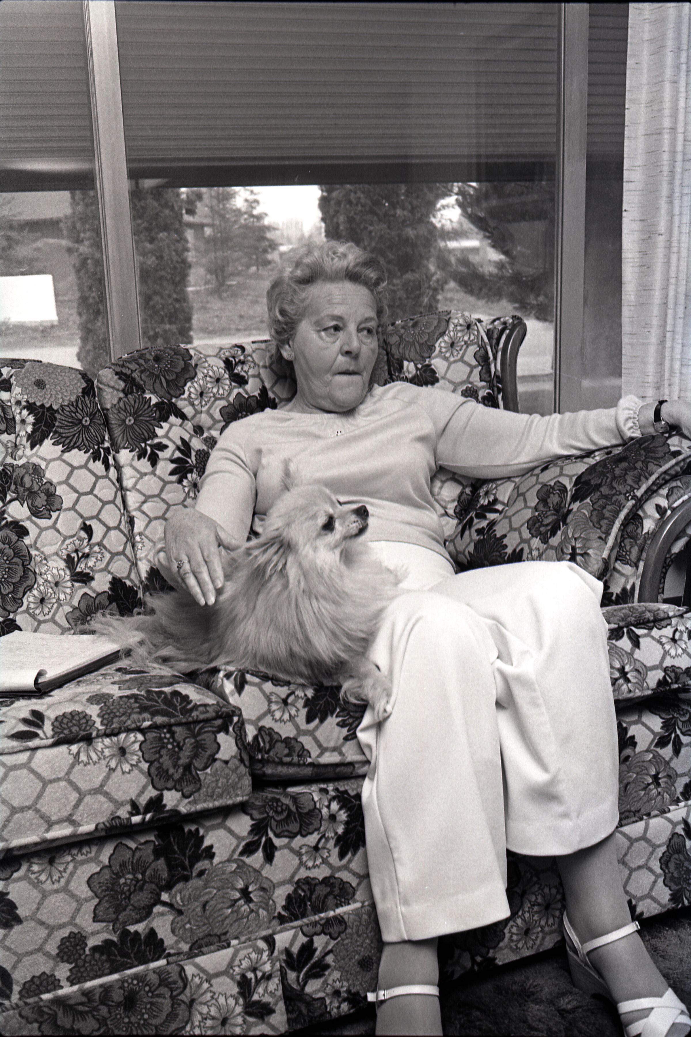 Anna Homann, 1979. These two black and white film negative strips were created for the Lacey Leader newspaper. These images show a woman (Anna Homann) seated with a small dog on a couch.Made/Created