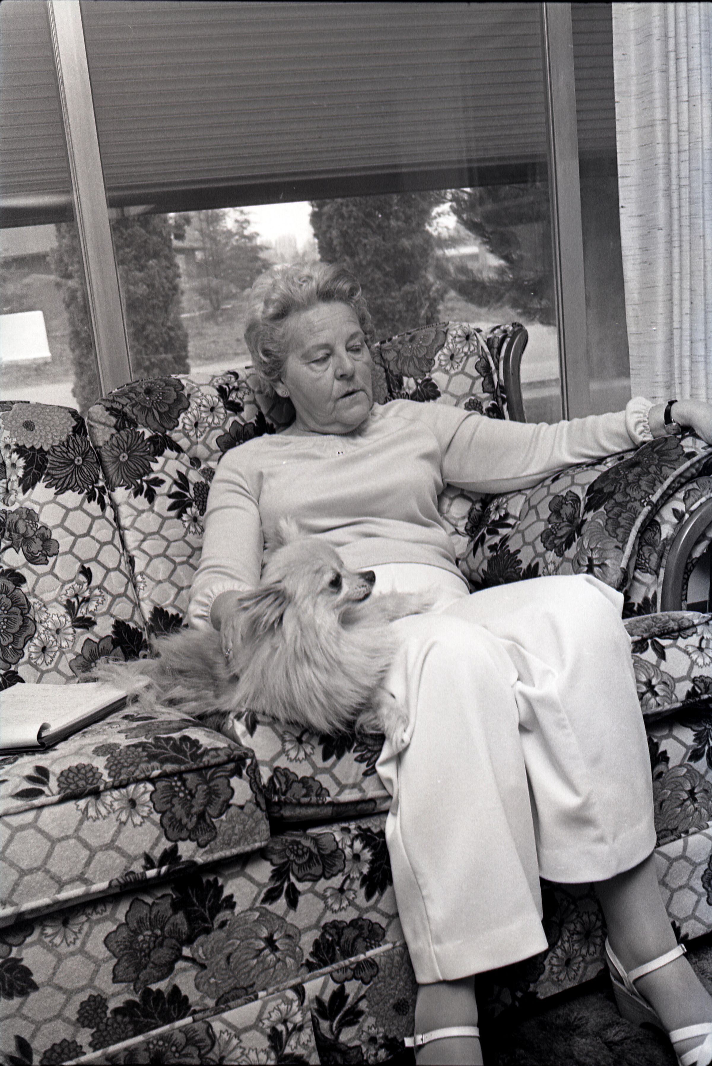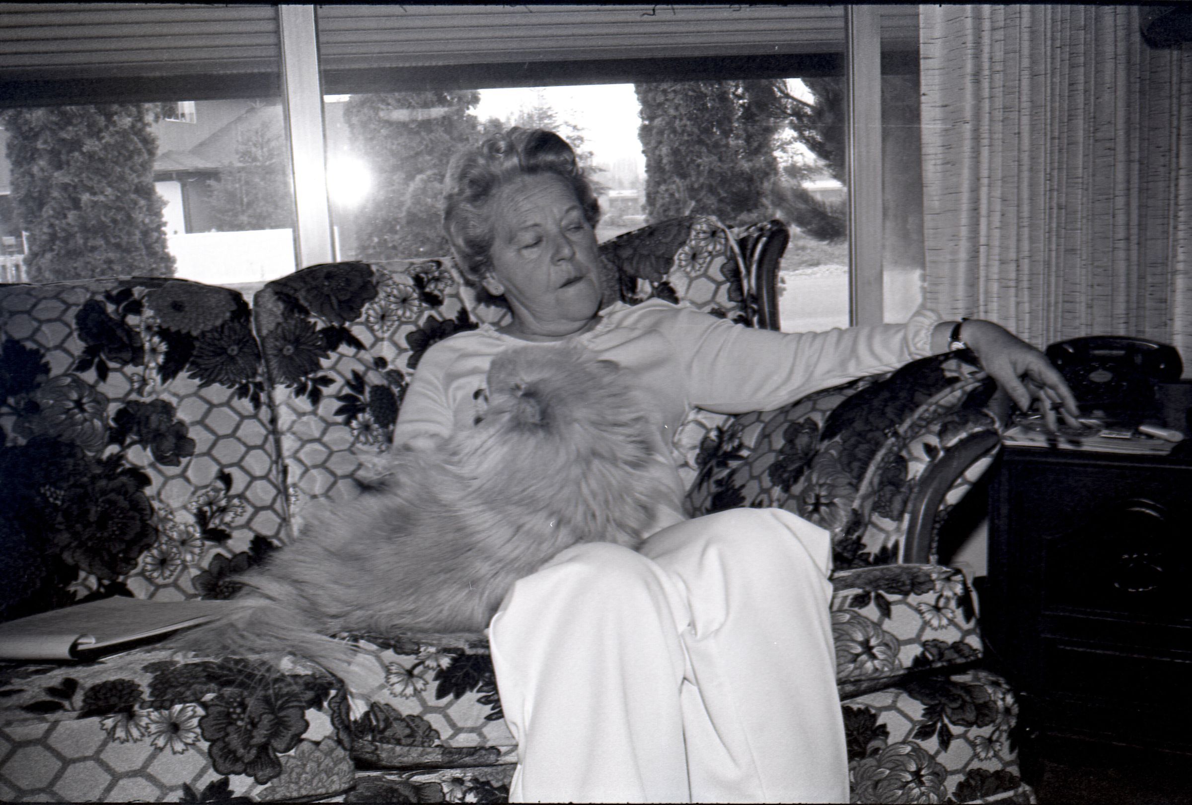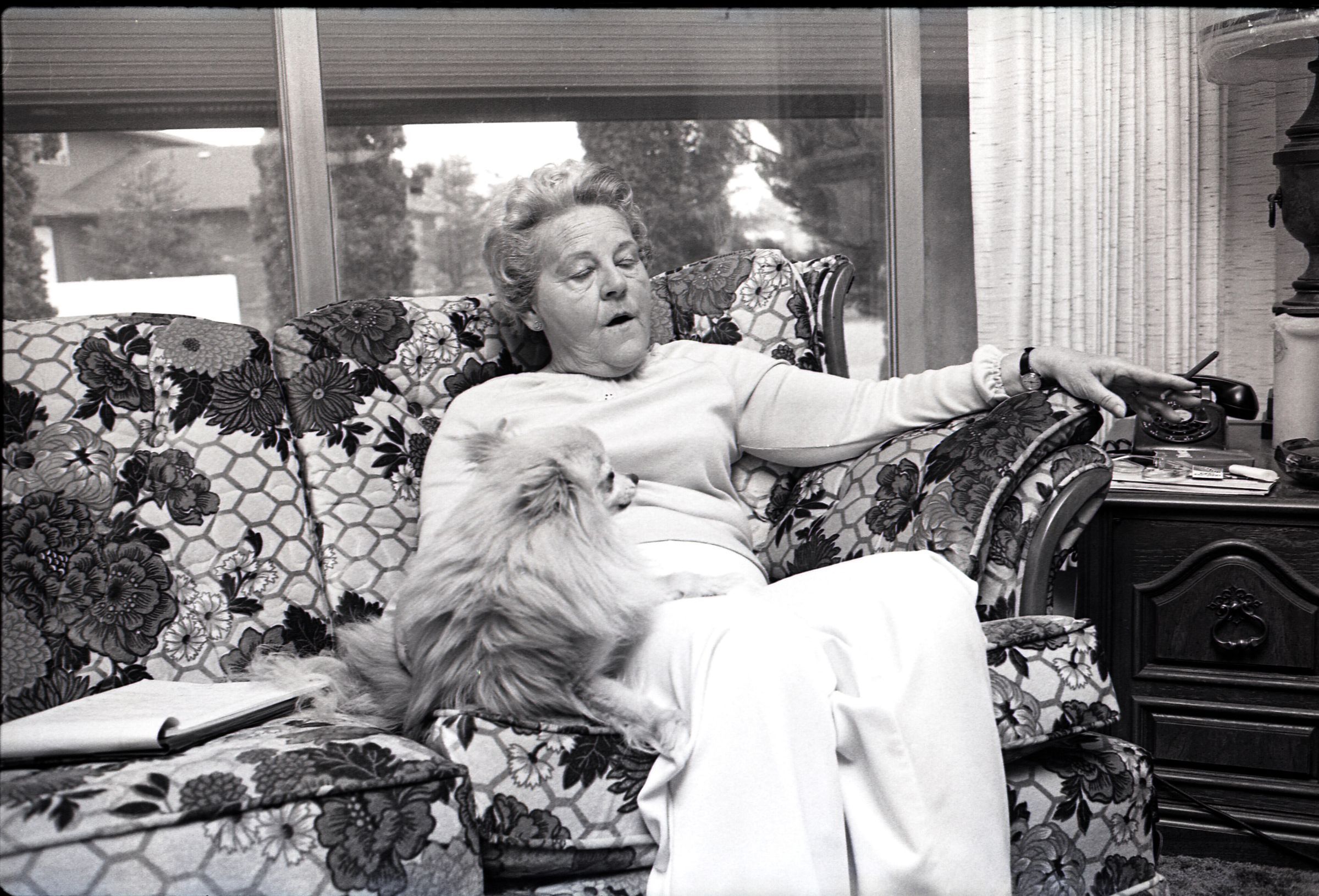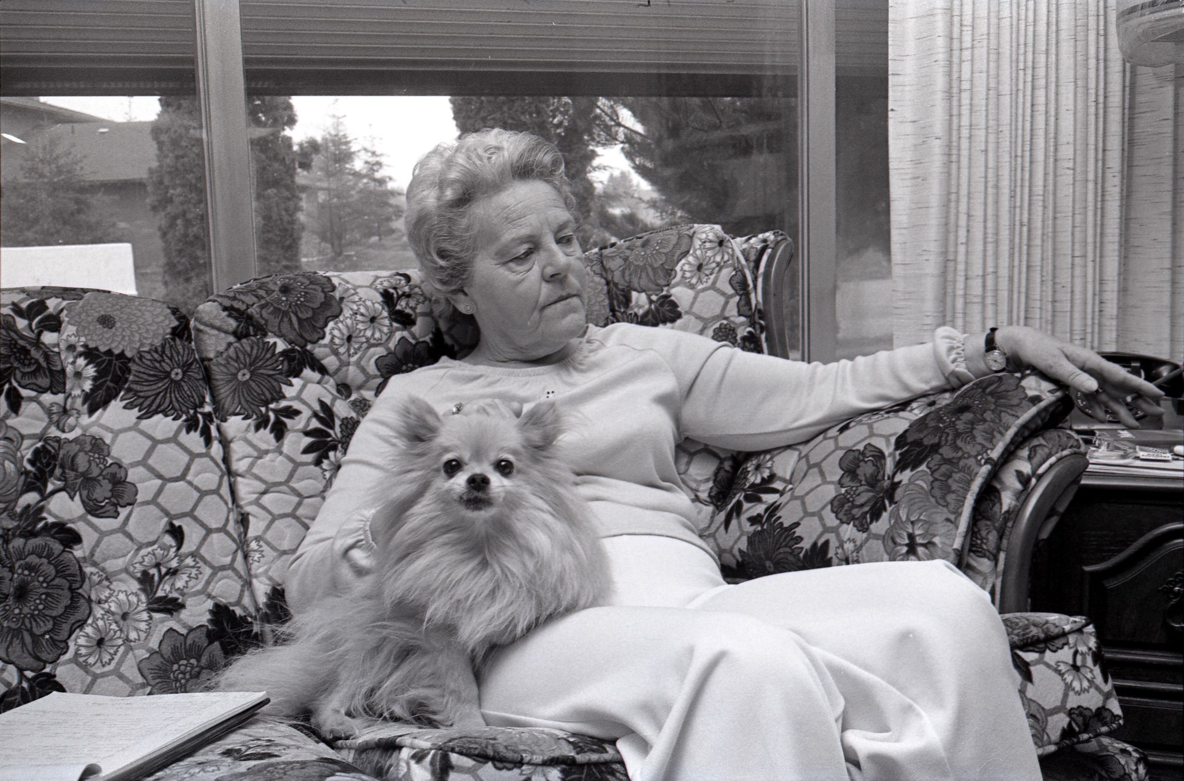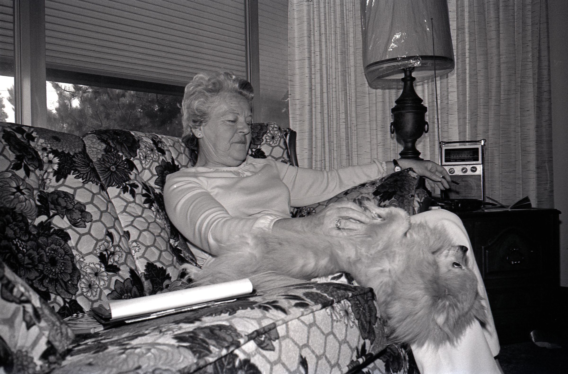 Anna Homann, 1979. These two black and white film negative strips were created for the Lacey Leader newspaper. These images show a woman (Anna Homann) seated with a small dog on a couch.Made/Created