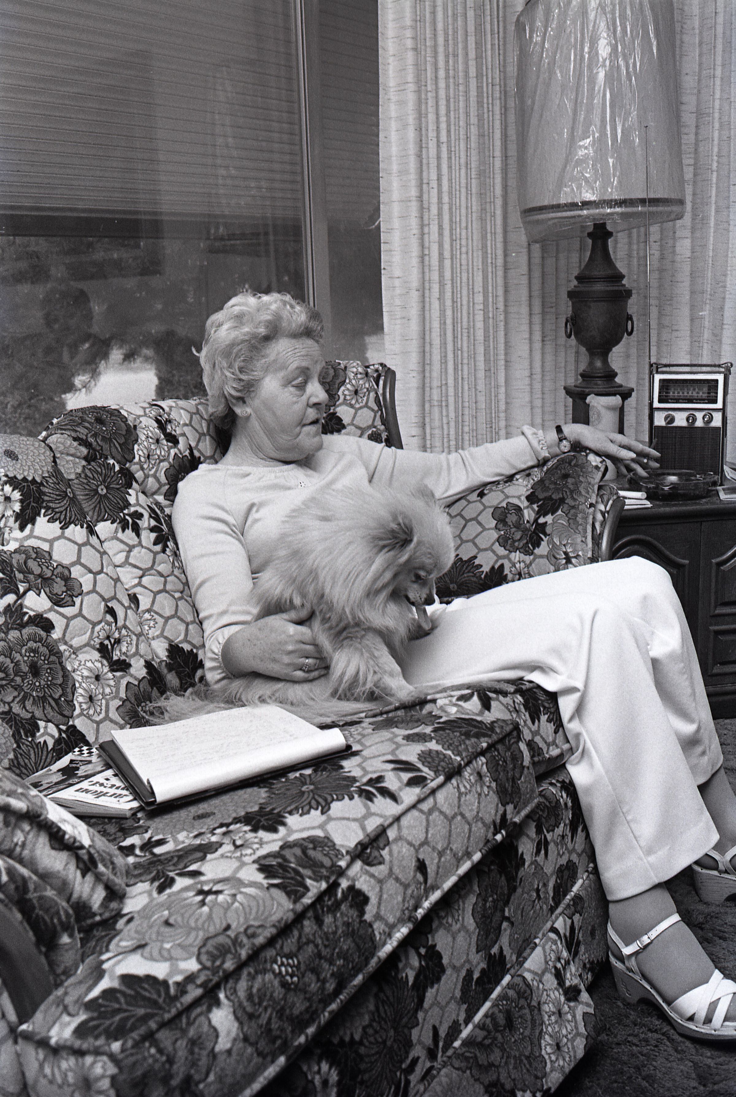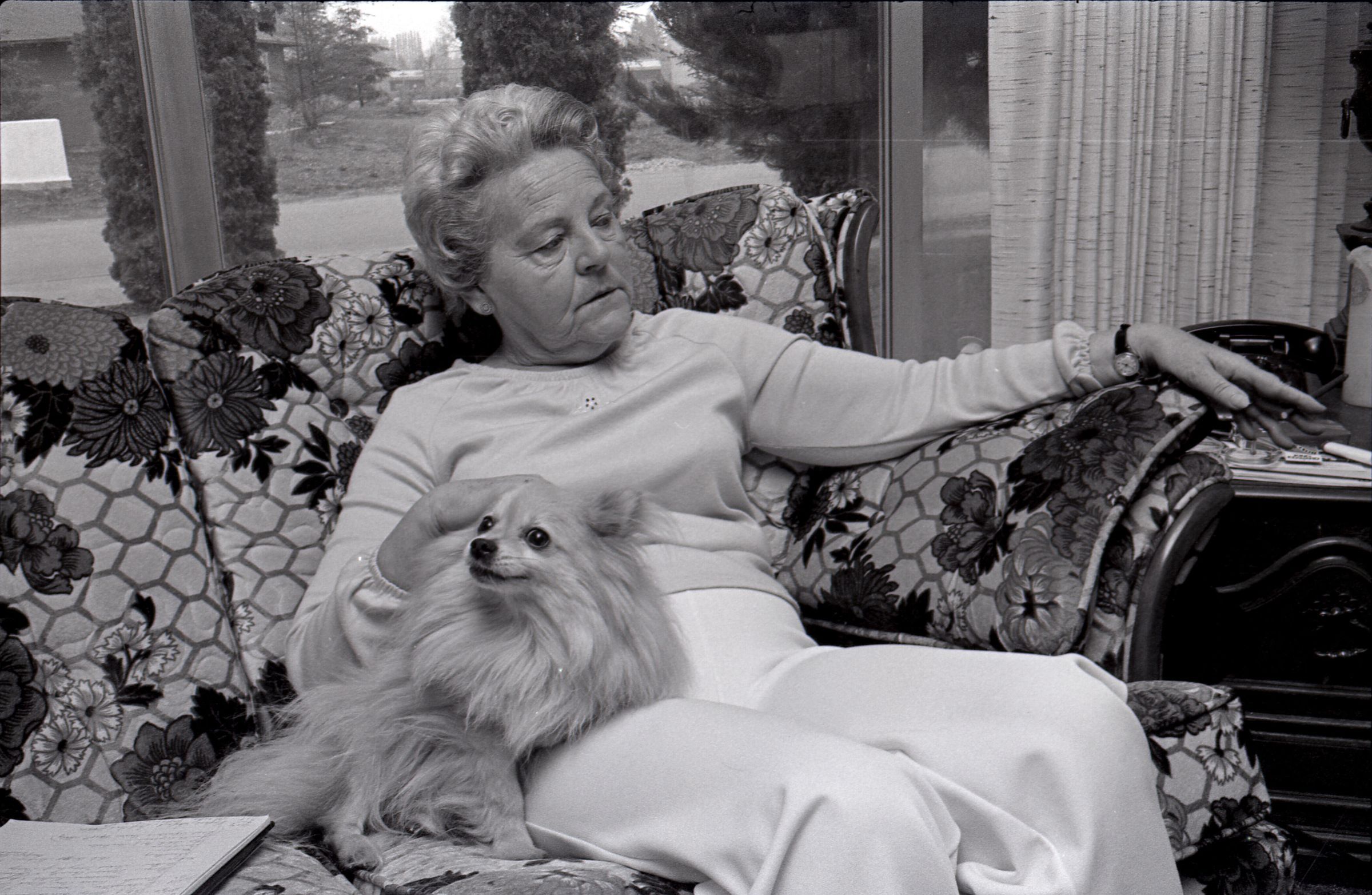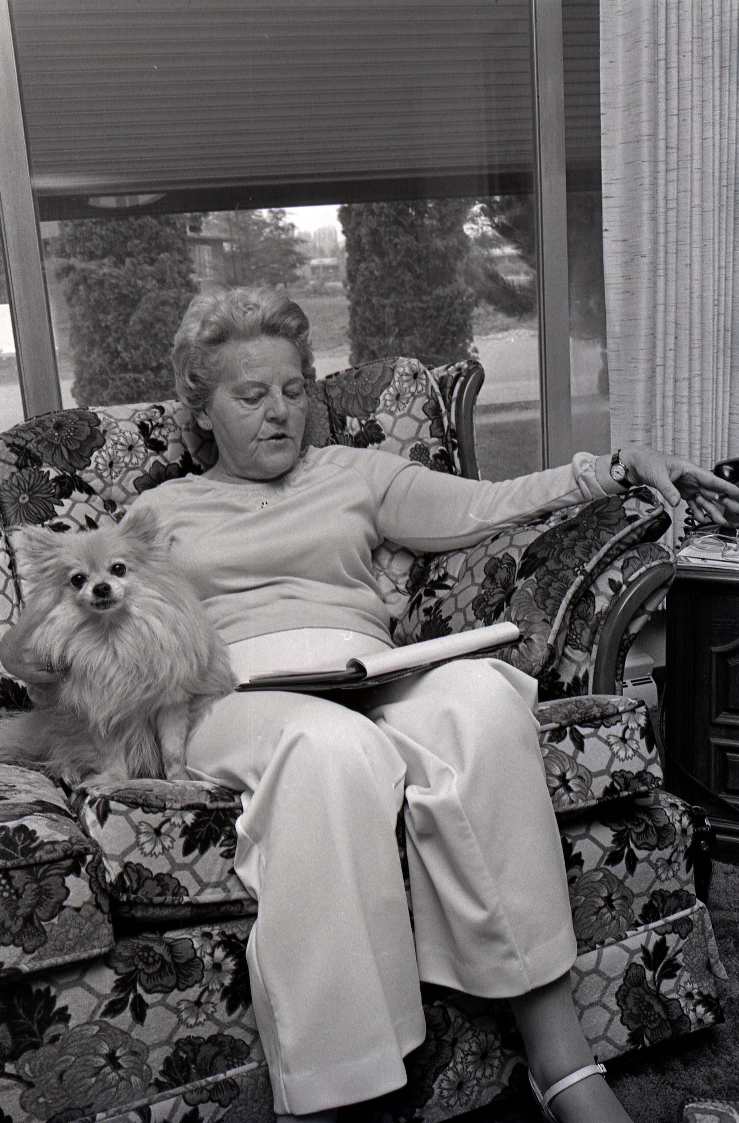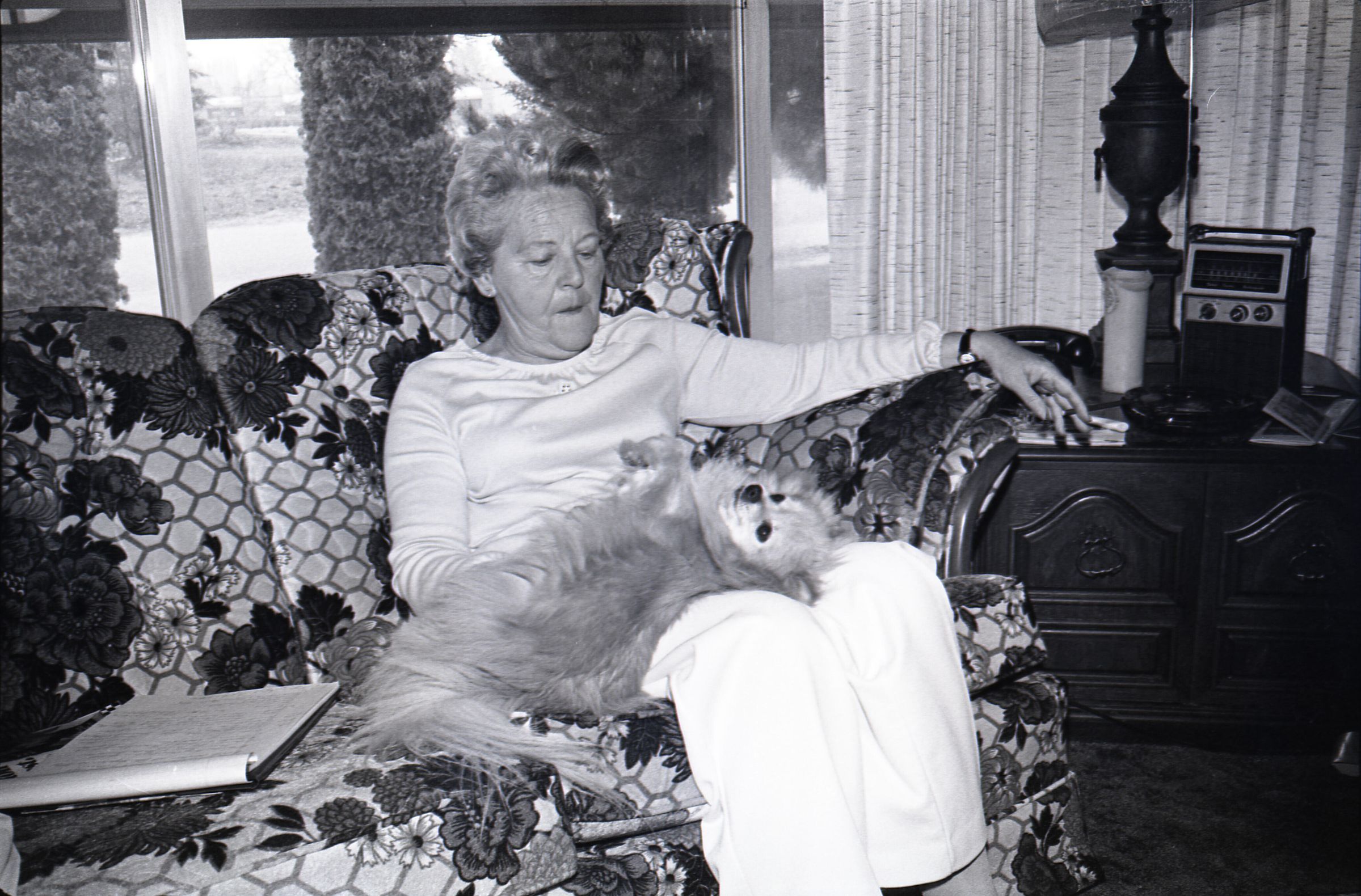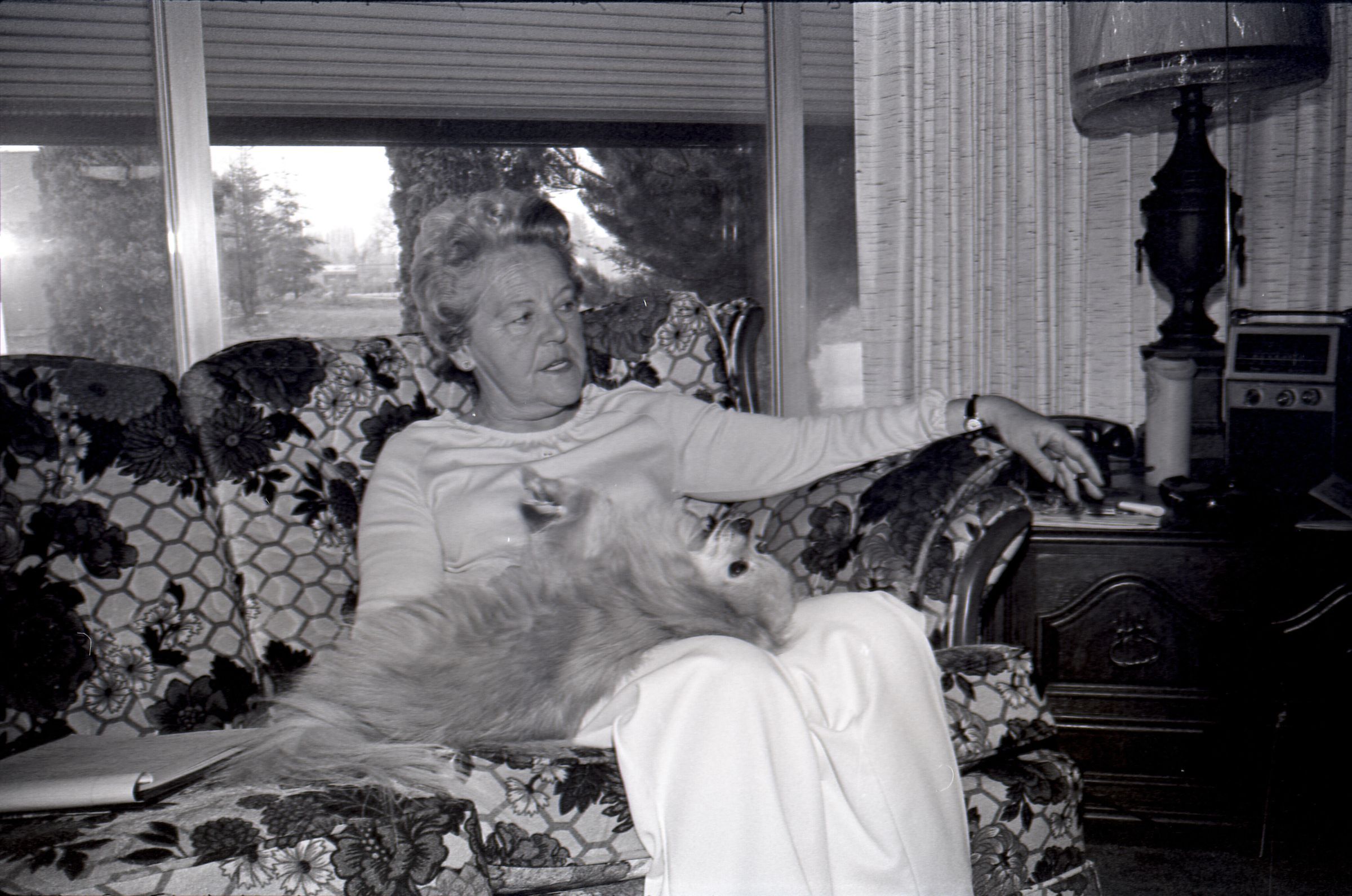 Anna Homann, 1979. These two black and white film negative strips were created for the Lacey Leader newspaper. These images show a woman (Anna Homann) seated with a small dog on a couch.Made/Created