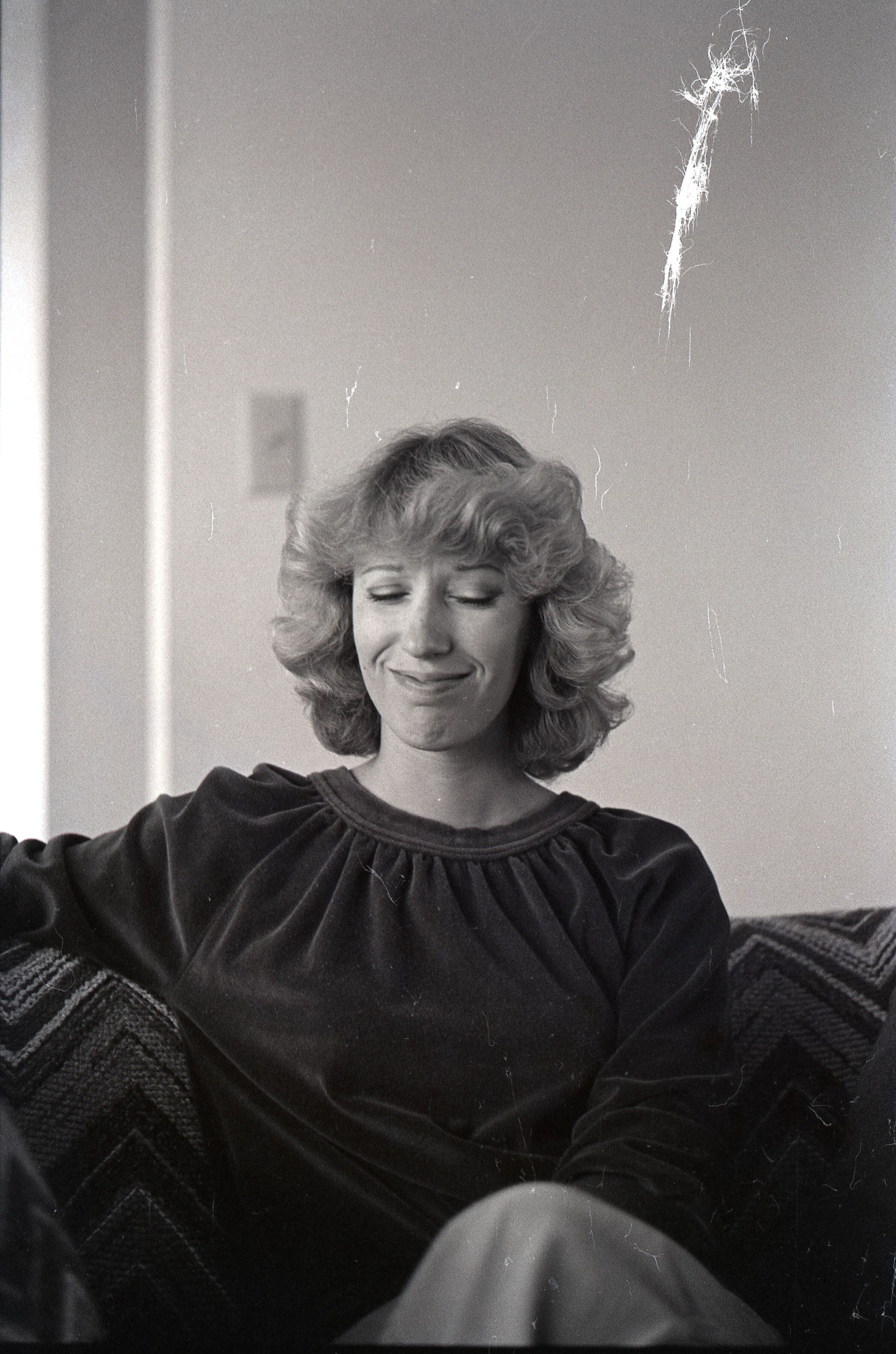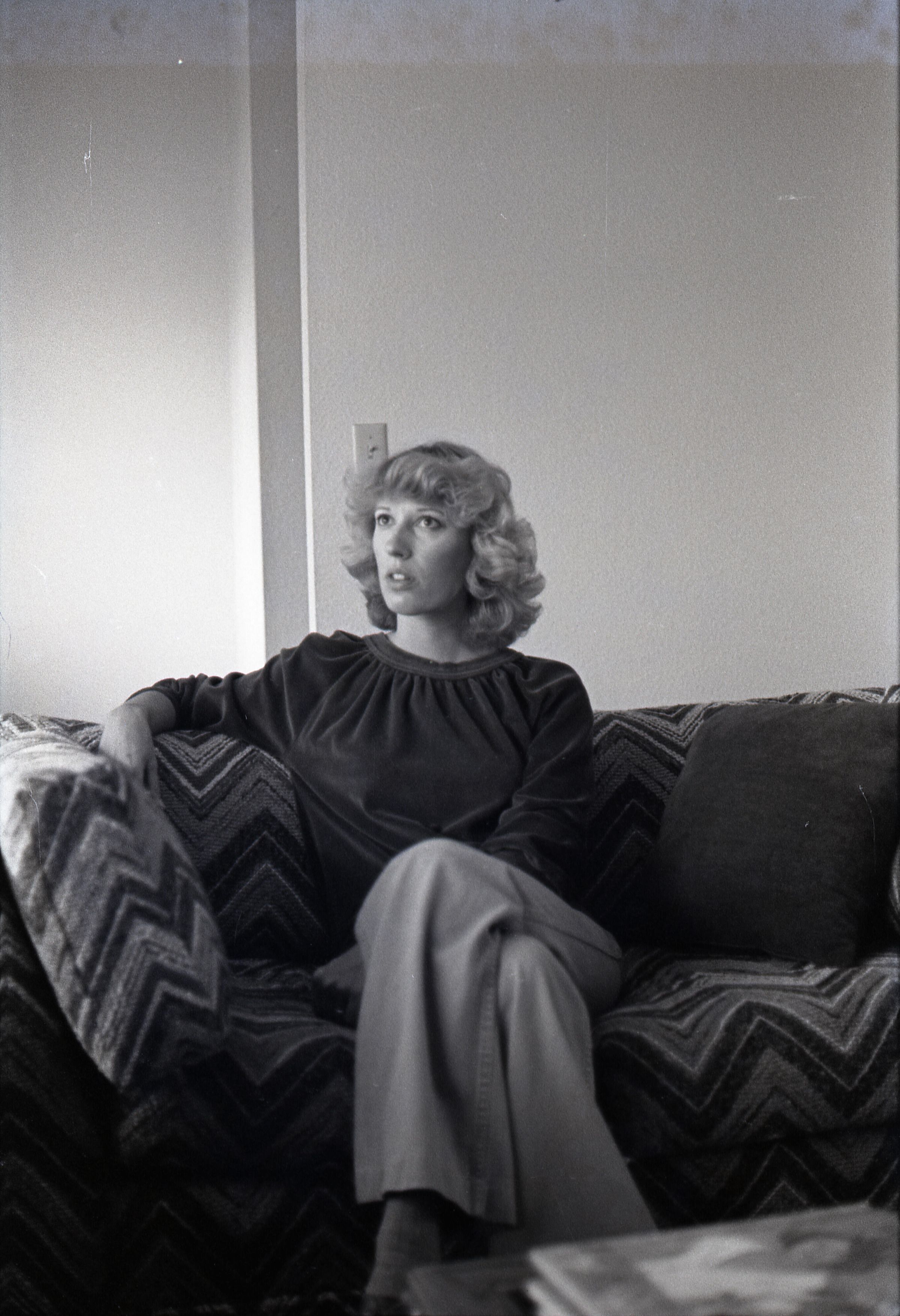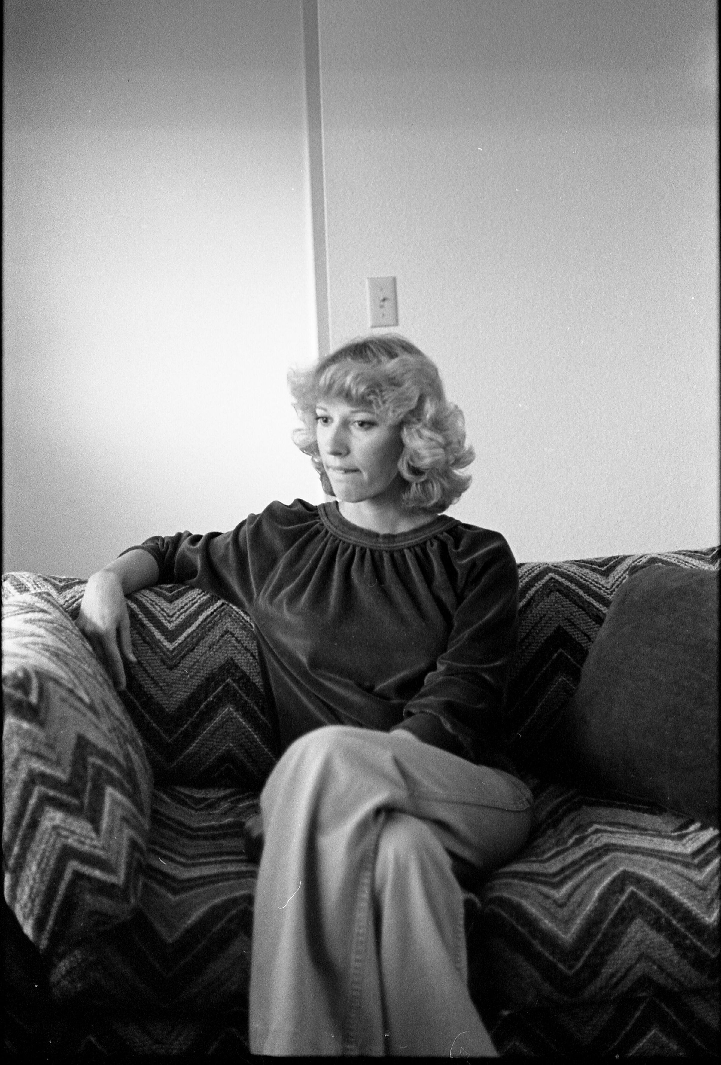 Linda Honeywell, Unknown Date. These two black and white film negative strips were created for the Lacey Leader newspaper. These images show a woman (Linda Honeywell) seated on a couch.Made/Created