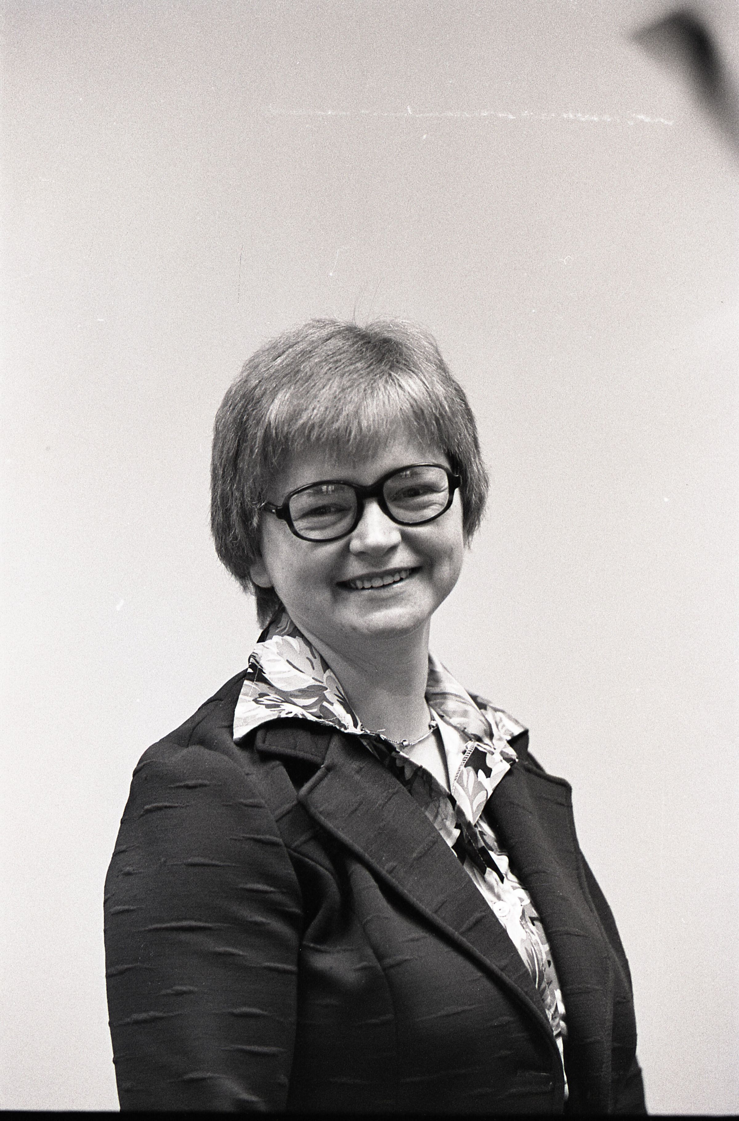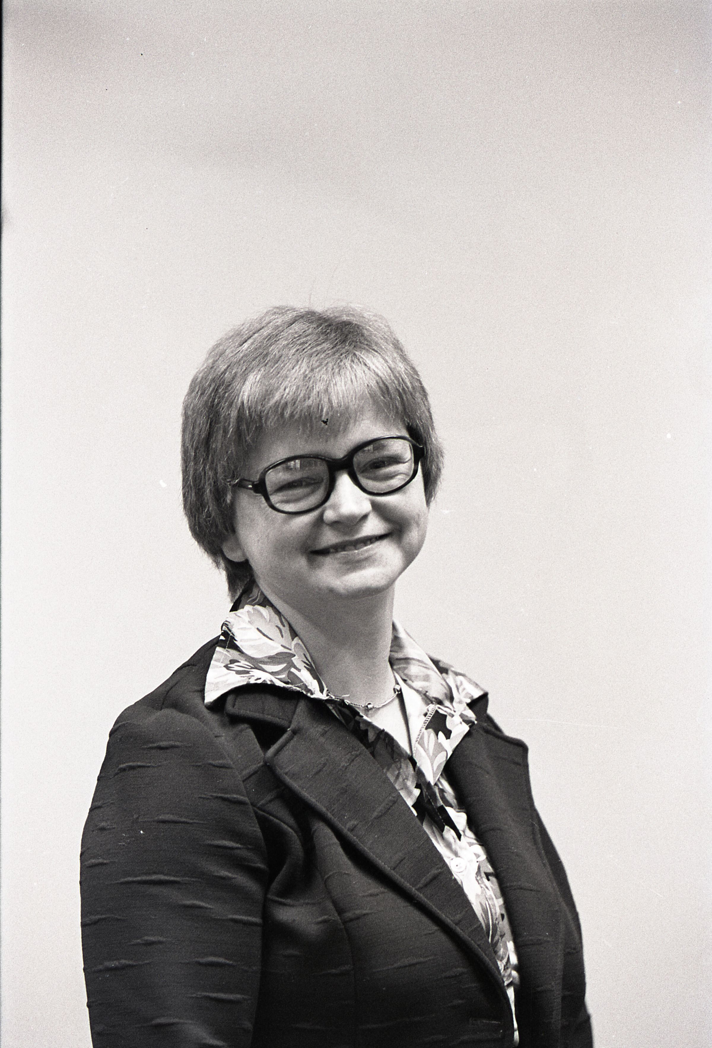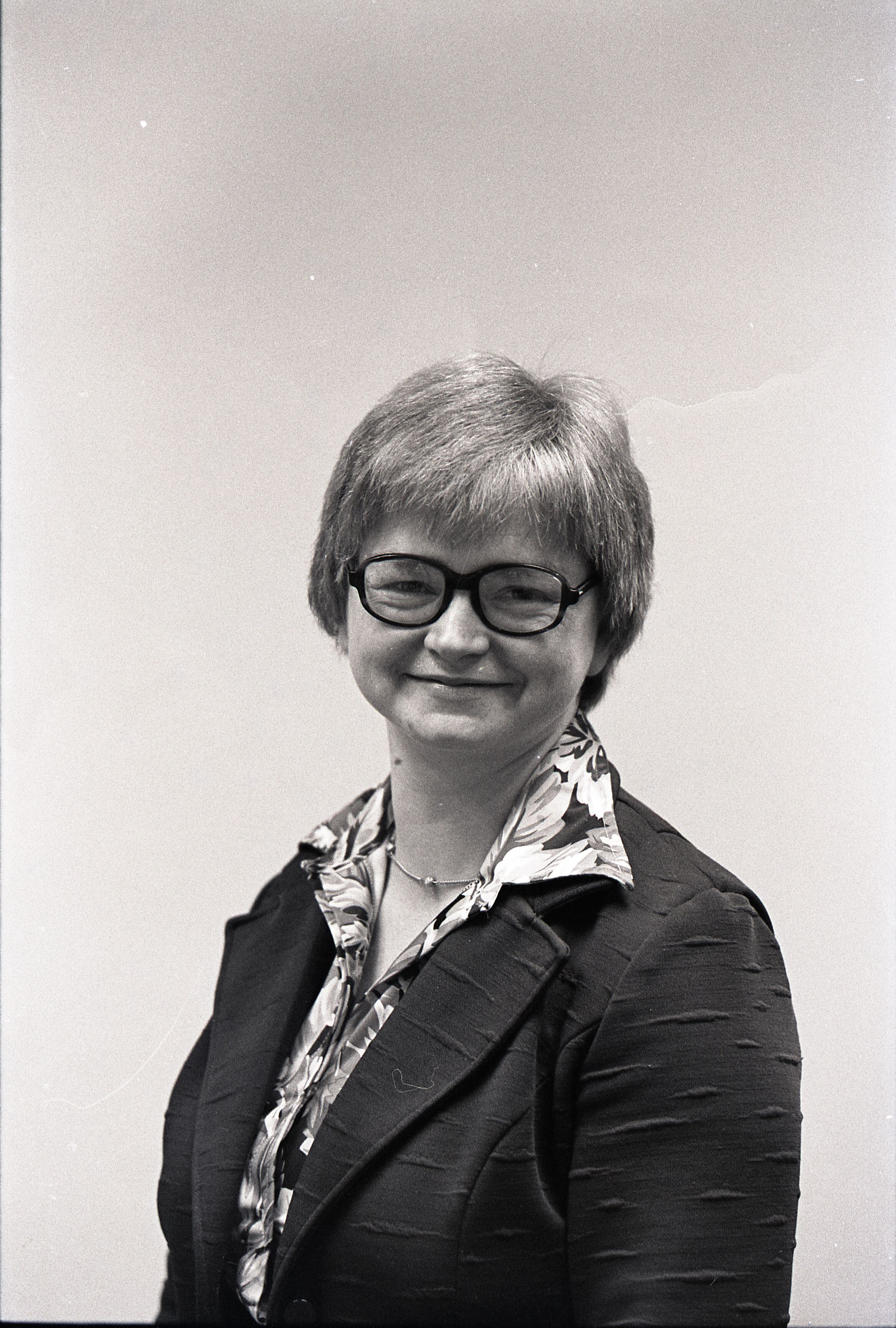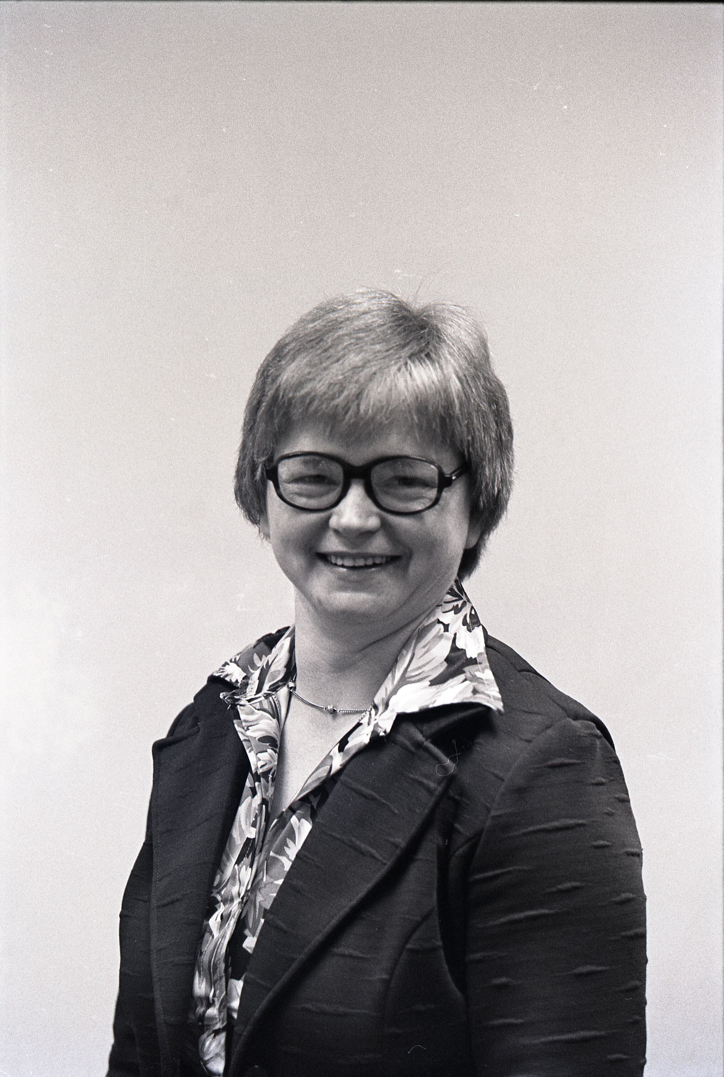 Stalt Lee, Unknown Date. This single black and white film negative strip was created for the Lacey Leader Newspaper. These images show a woman with fairly short hair wearing glasses and a blazer over a collared shirt.Made/Created