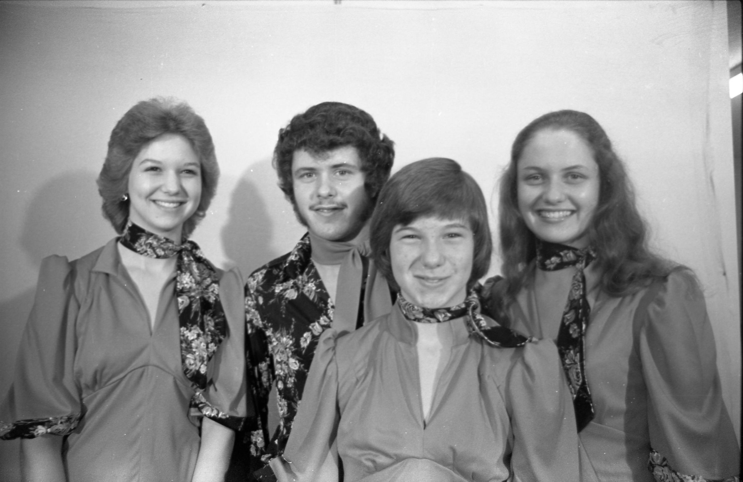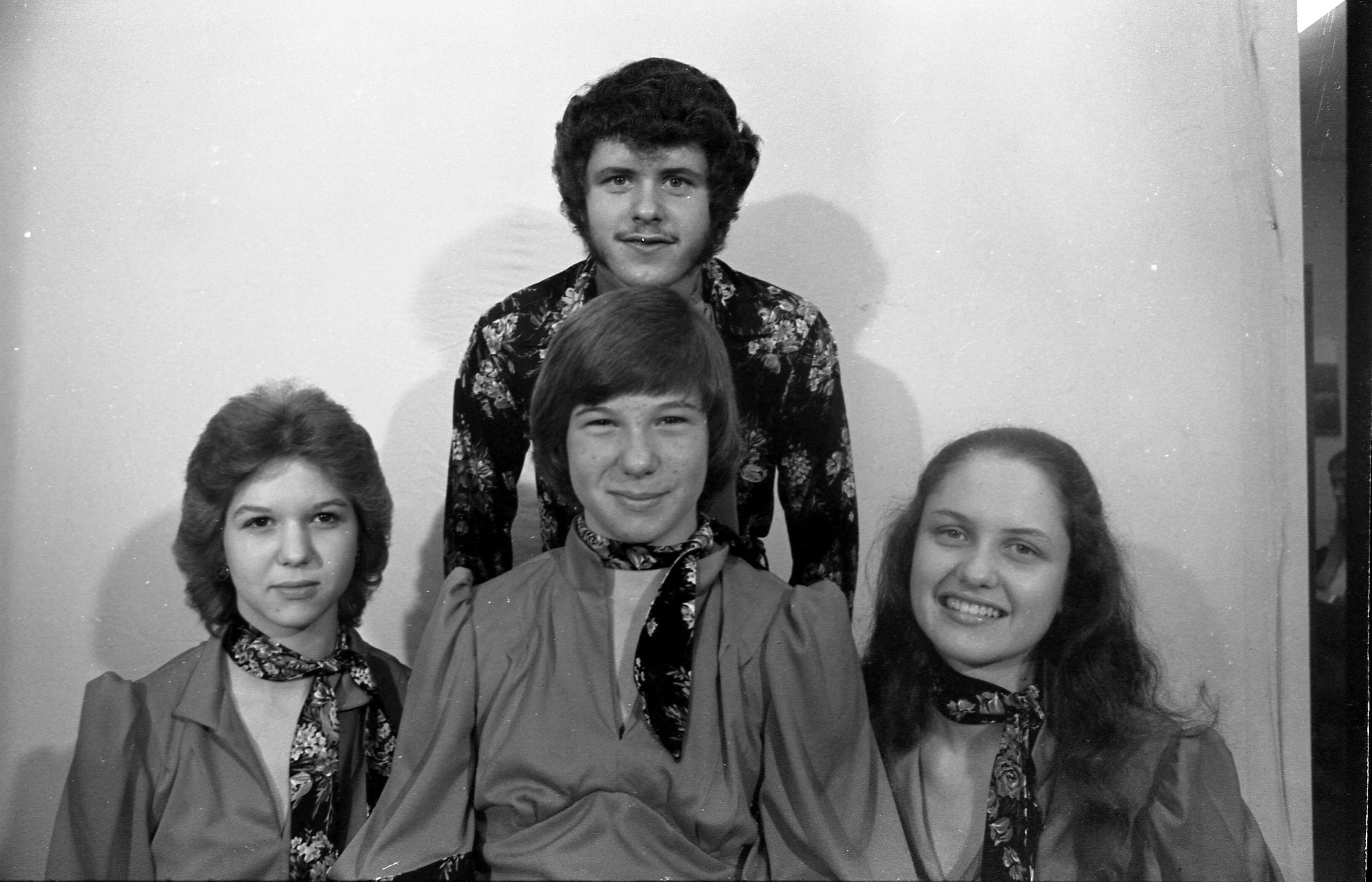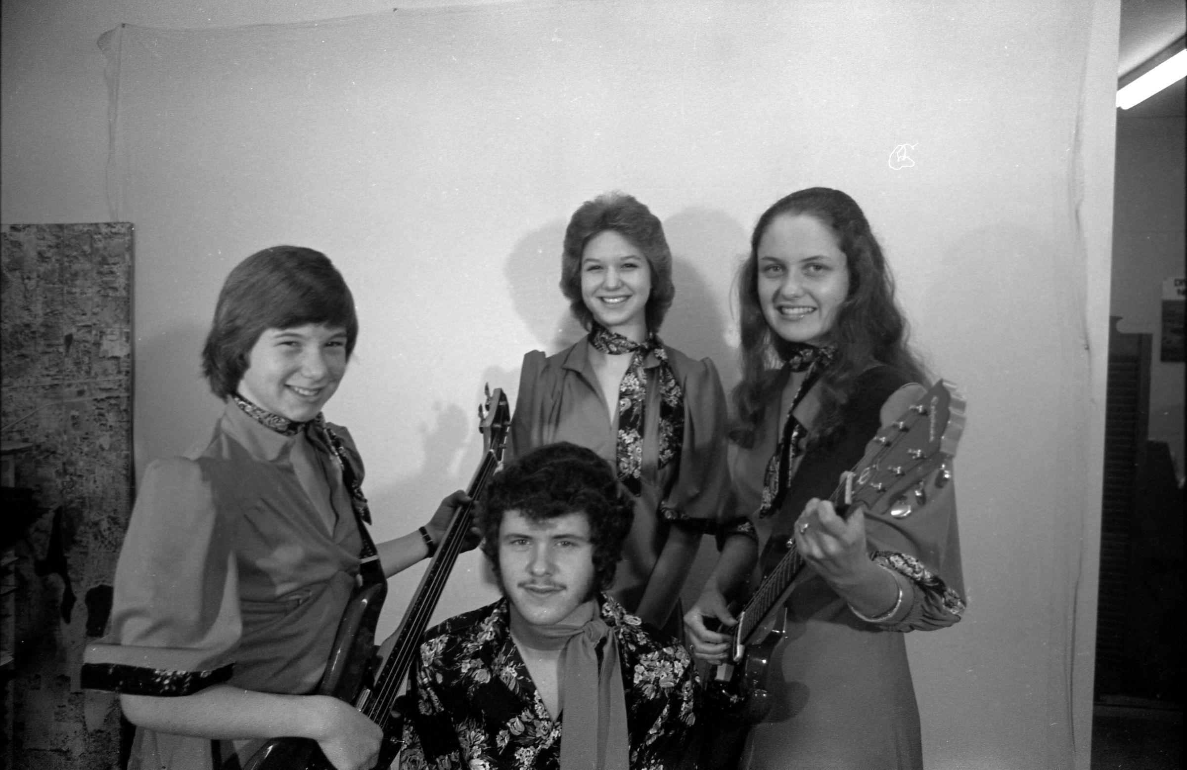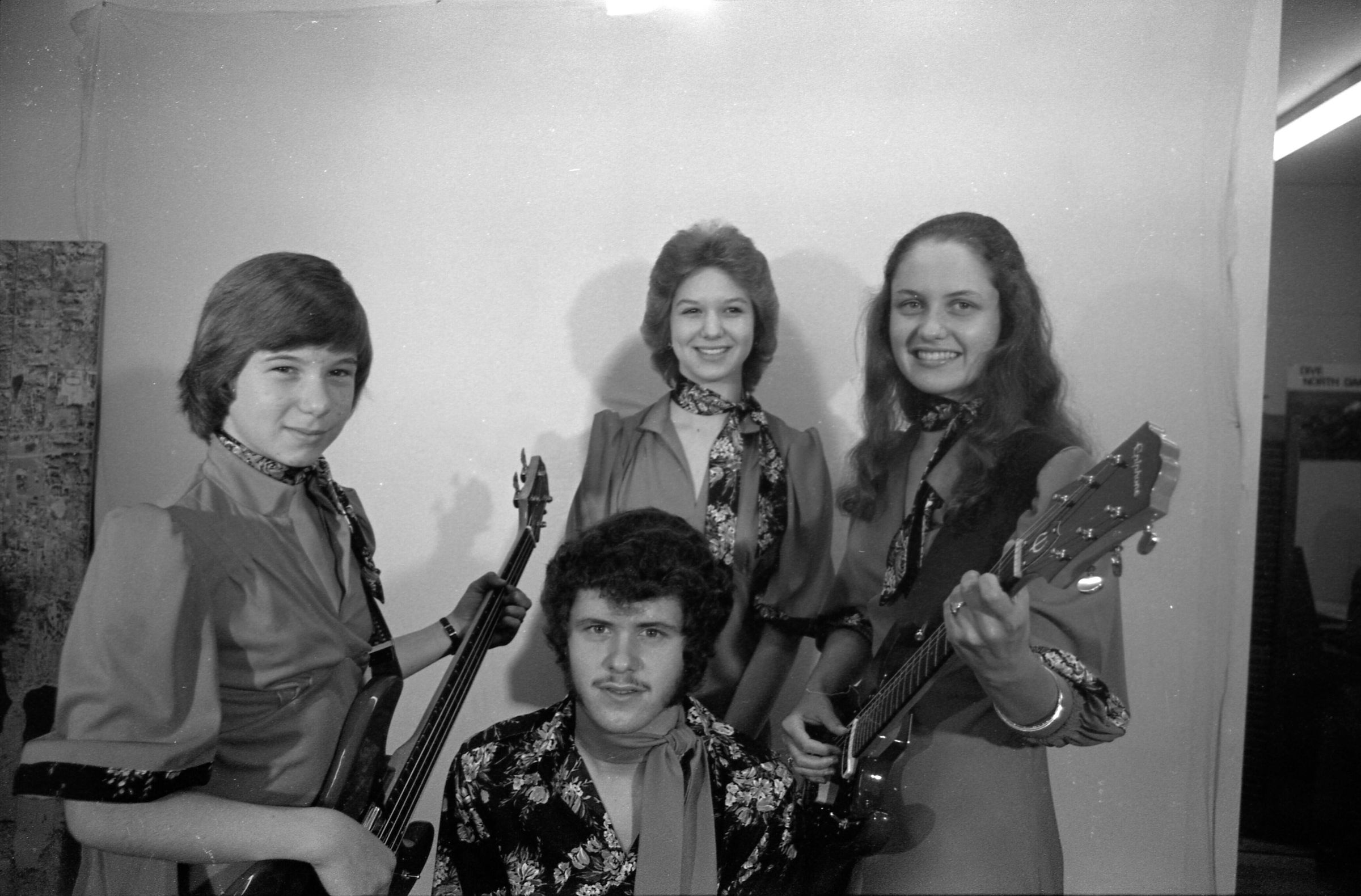 Unknown Band, Unknown Date. These two black and white film negative strips were created for the Lacey Leader newspaper. These images show three young women and one young man posing together for photos. In some of the images, some of the people are holding musical instruments.Made/Created