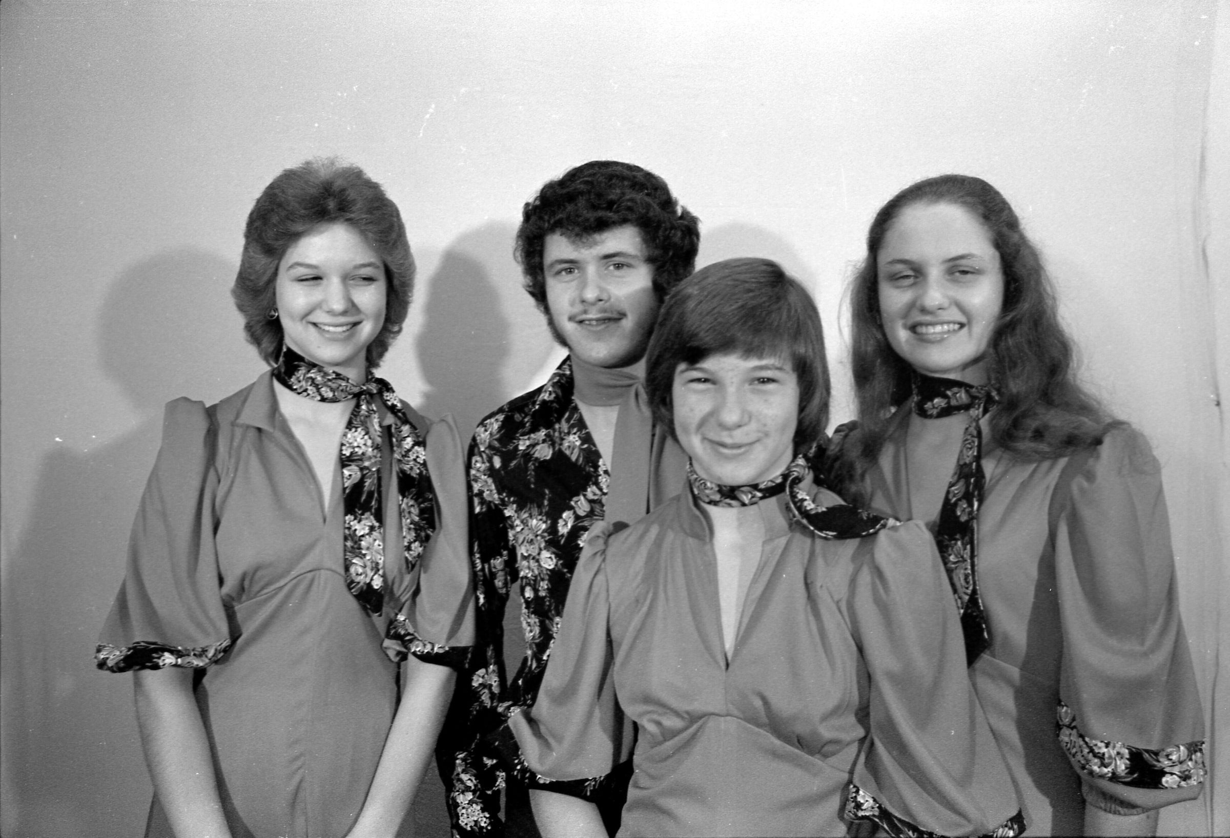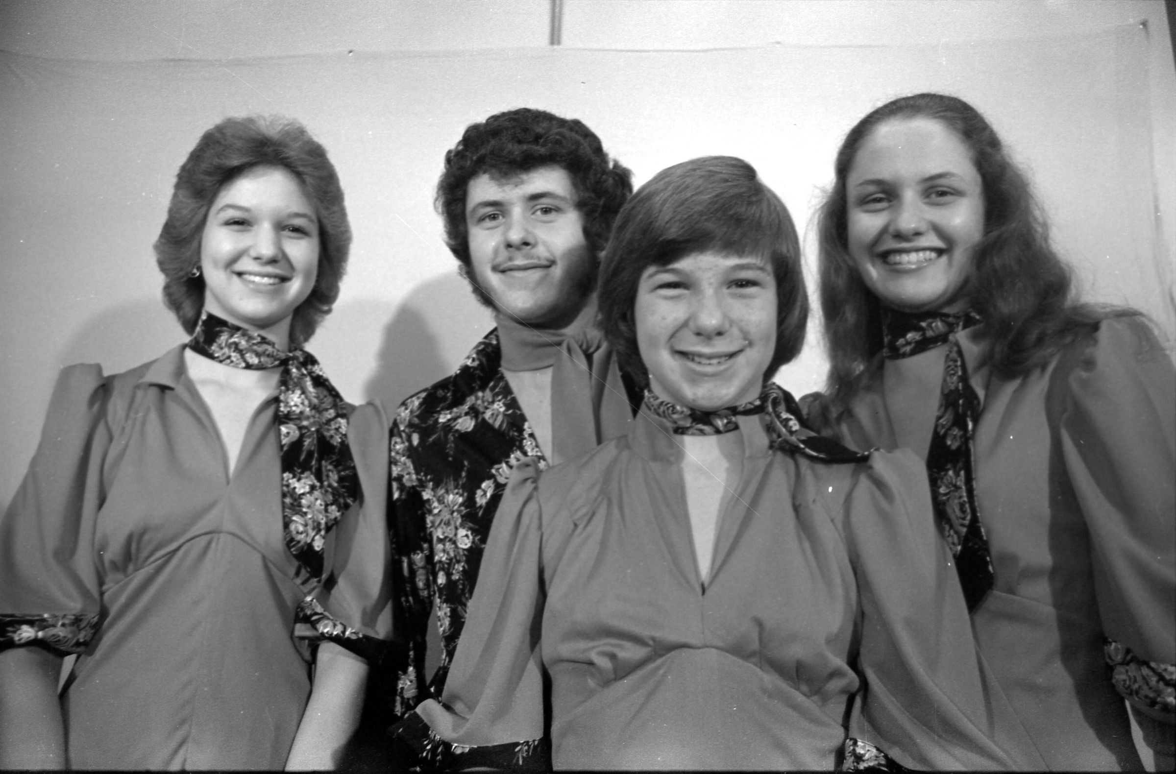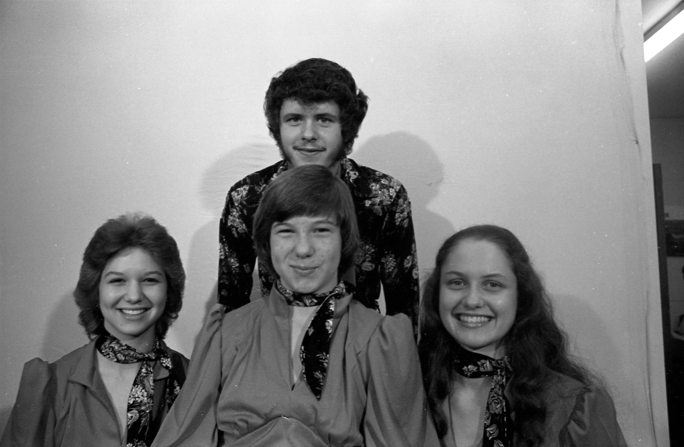 Unknown Band, Unknown Date. These two black and white film negative strips were created for the Lacey Leader newspaper. These images show three young women and one young man posing together for photos. In some of the images, some of the people are holding musical instruments.Made/Created