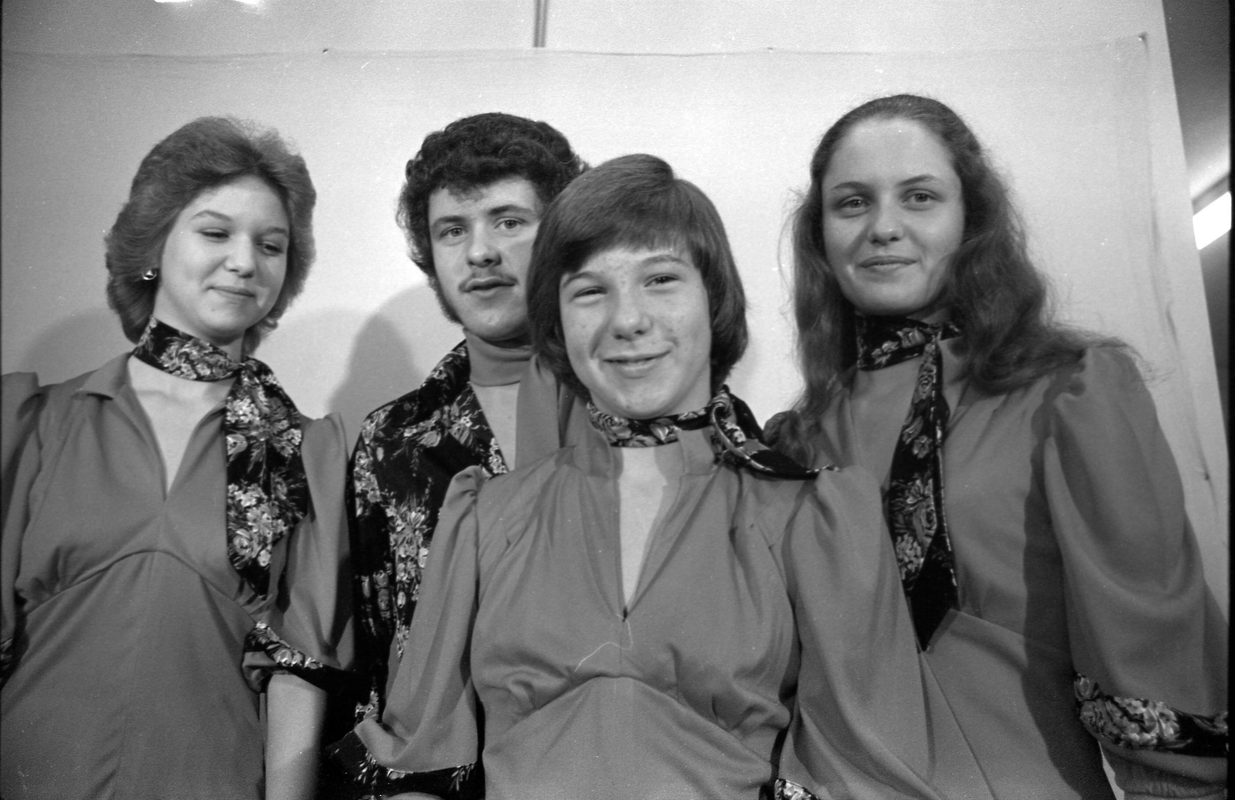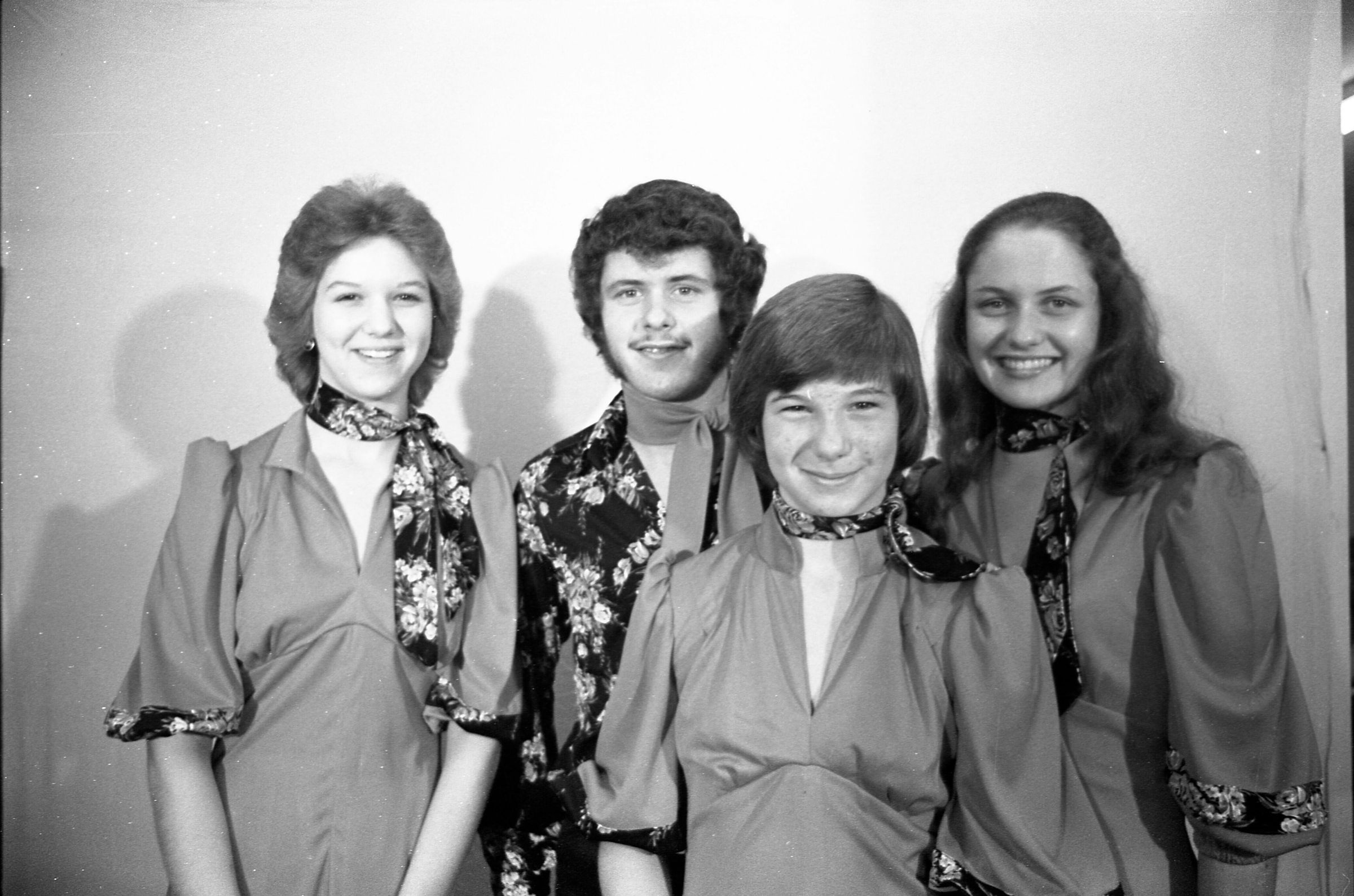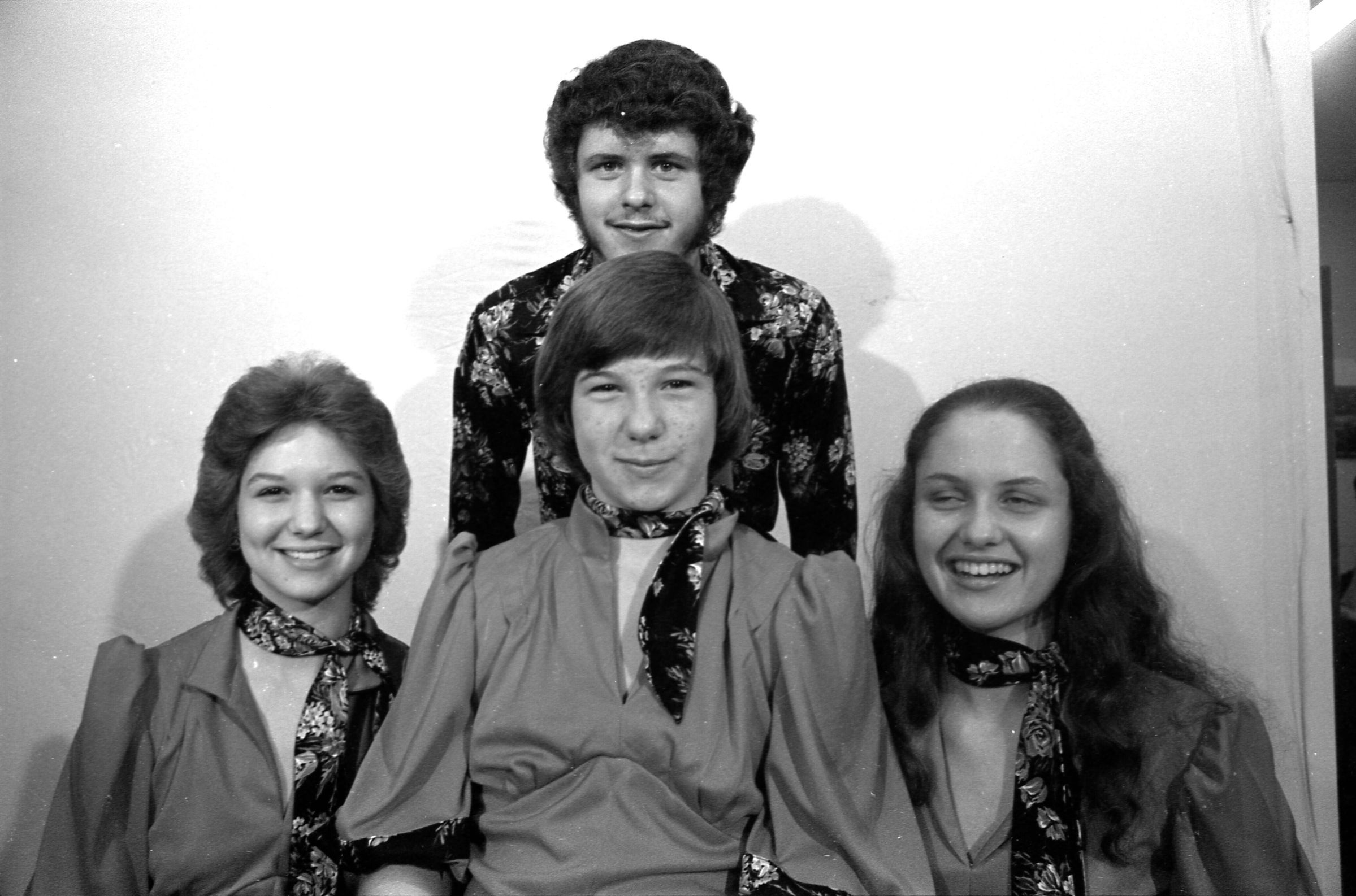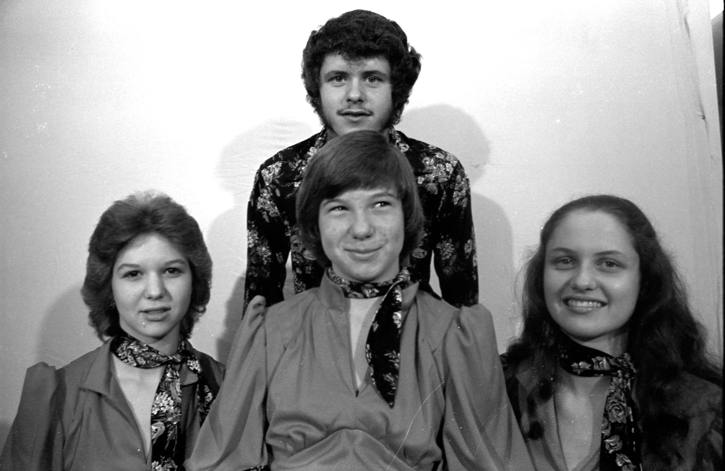 Unknown Band, Unknown Date. These two black and white film negative strips were created for the Lacey Leader newspaper. These images show three young women and one young man posing together for photos. In some of the images, some of the people are holding musical instruments.Made/Created