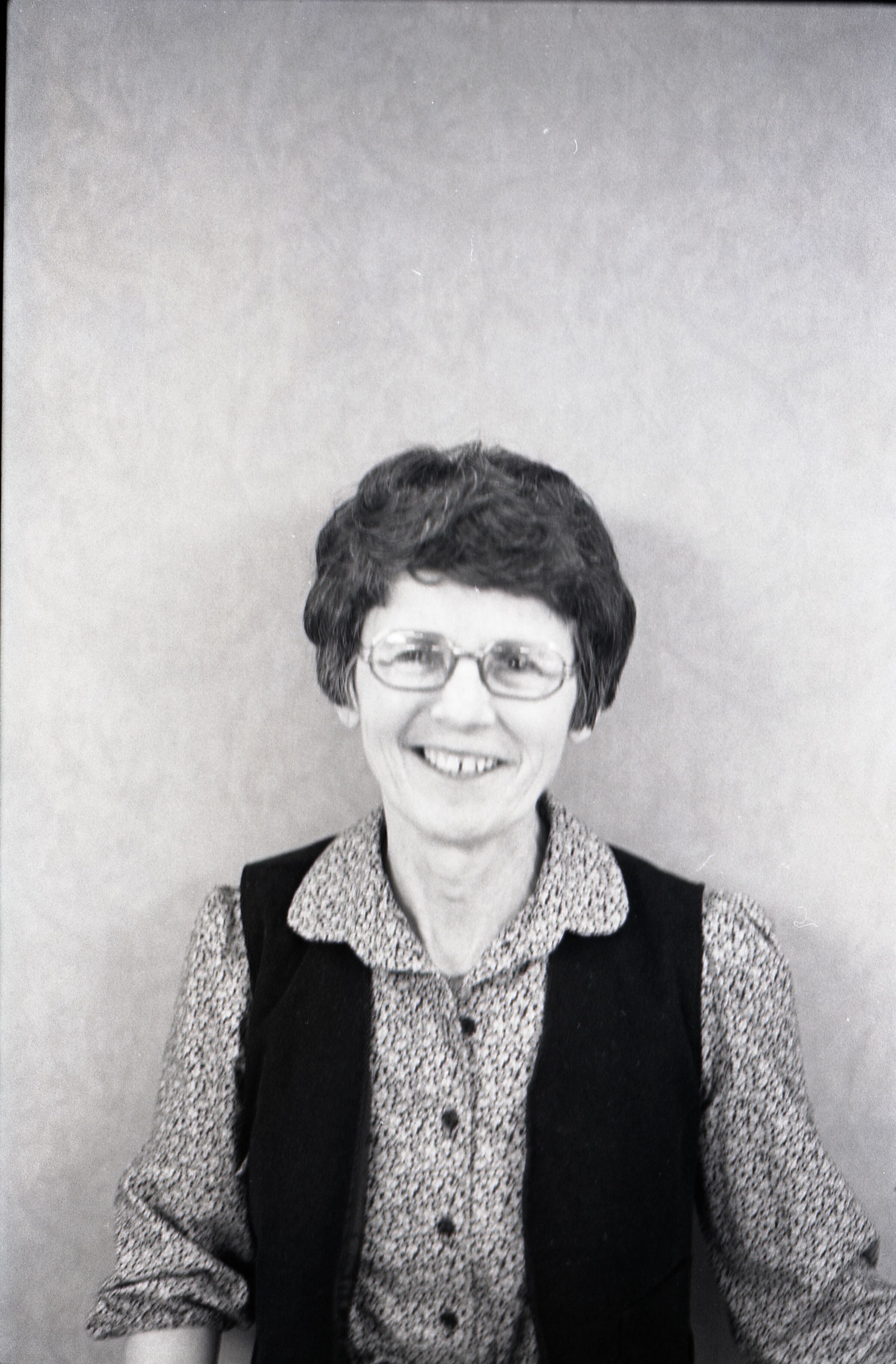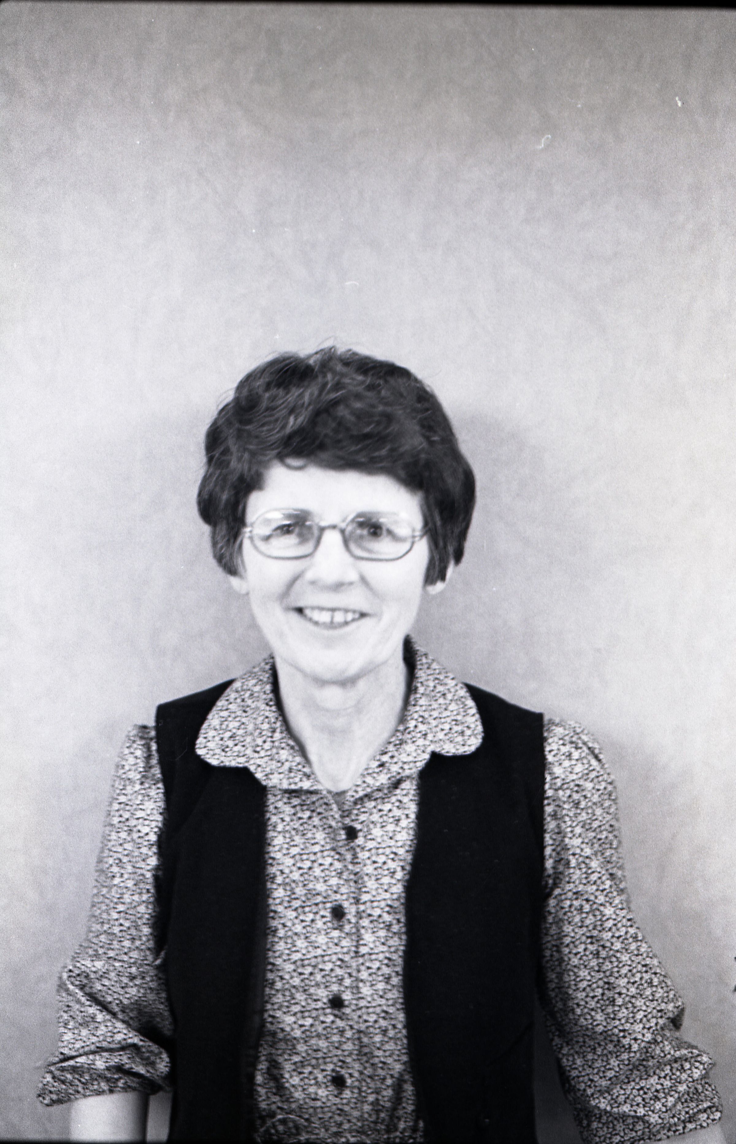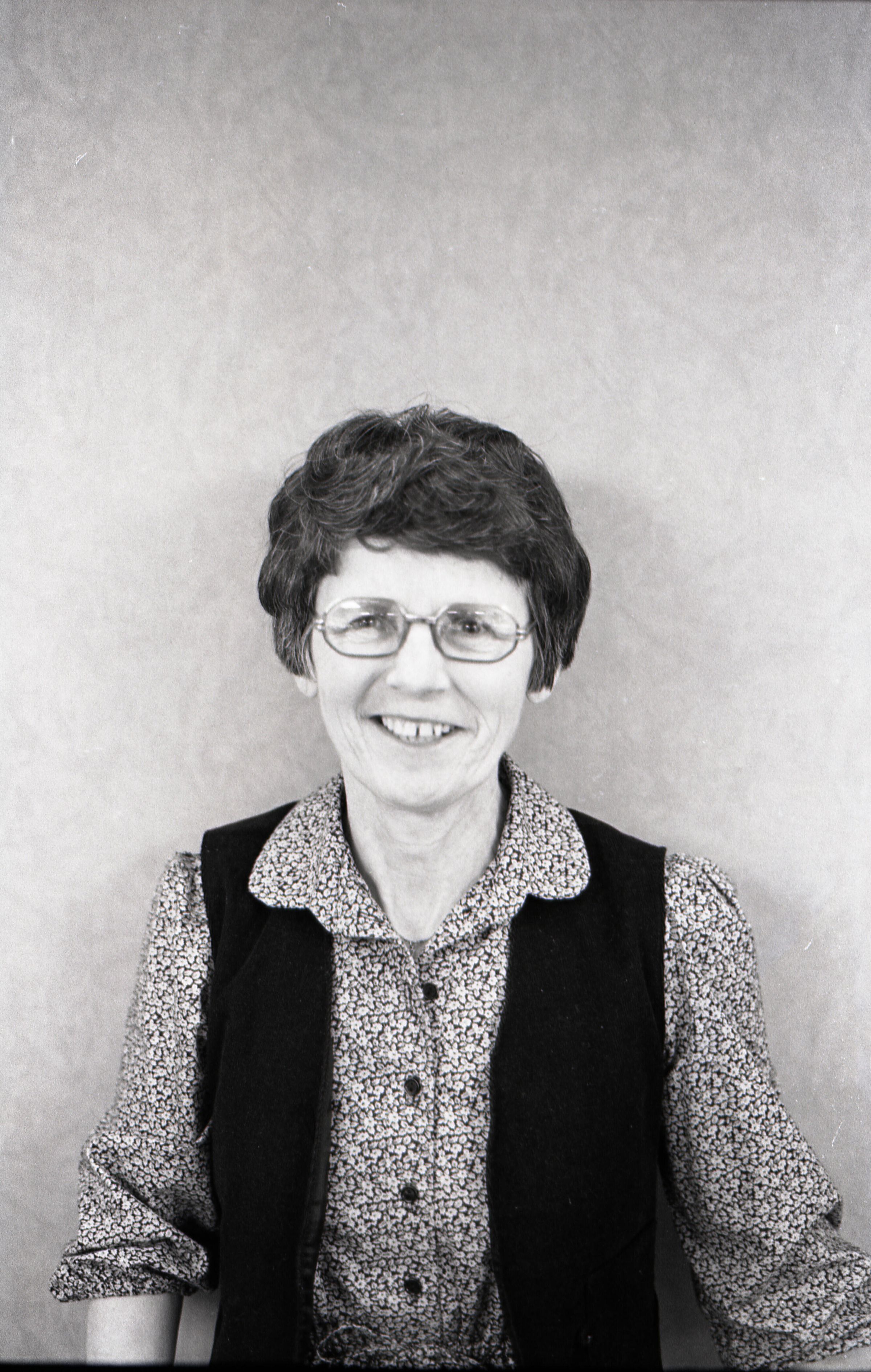 Ida Jane Taylor, Thurston County Citizen of the Year, 1980. These two black and white film negative strips were created for the Lacey Leader newspaper. These images show a woman (Ida Jane Taylor) wearing a vest or smock over a floral-print dress posing for photos.Made/Created