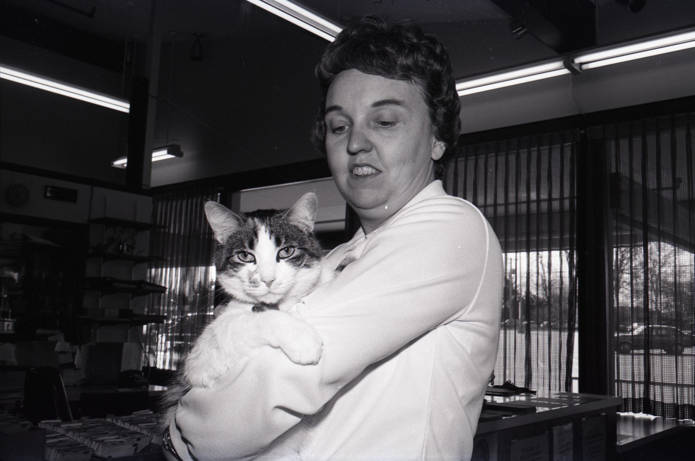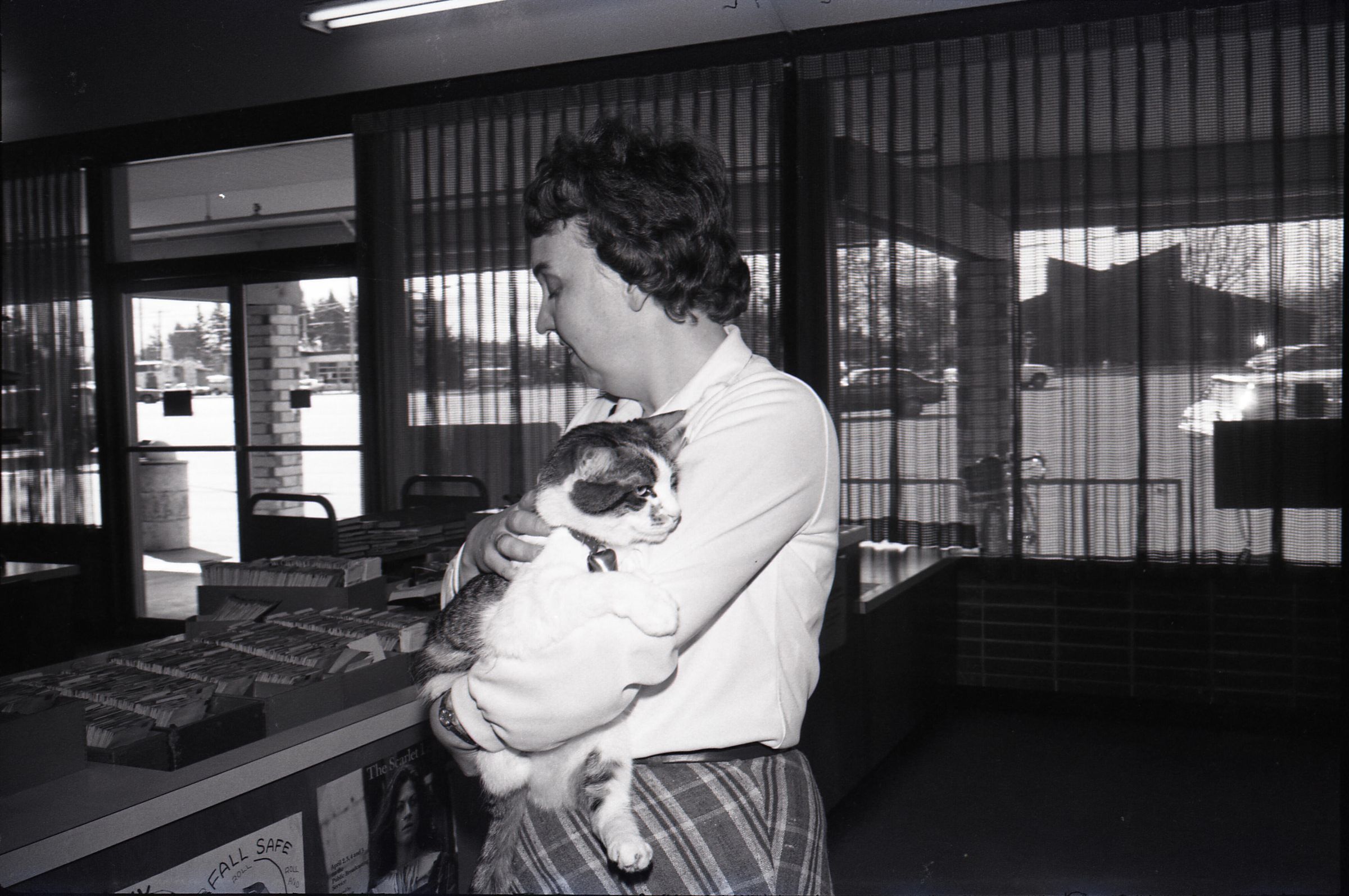 Mary Russell and Kapuki, Lacey Public Library, 1979. These two black and white film negative strips were created for the Lacey Leader newspaper. These images show a woman (Mary Russell) posing for photos in several locations in the Lacey Timberland Library. In some of the photos, Ms. Russell is holding Kapuki, the library cat.Made/Created