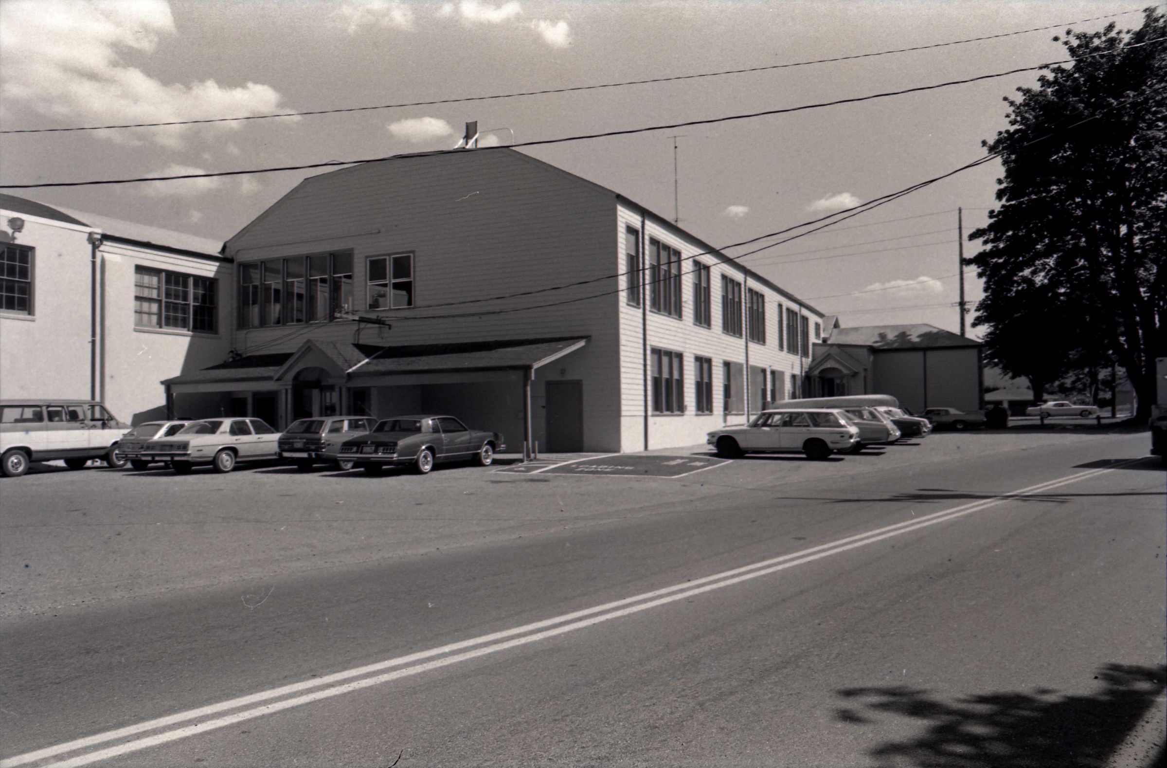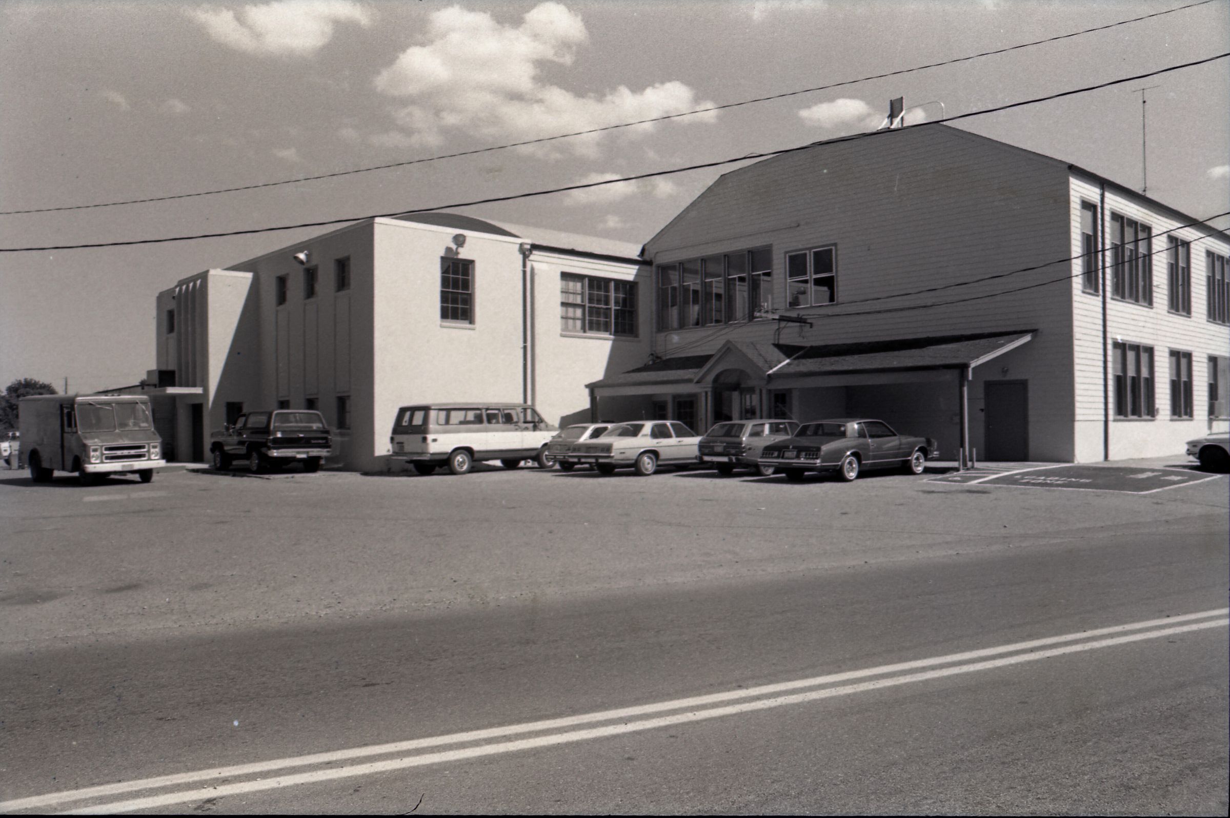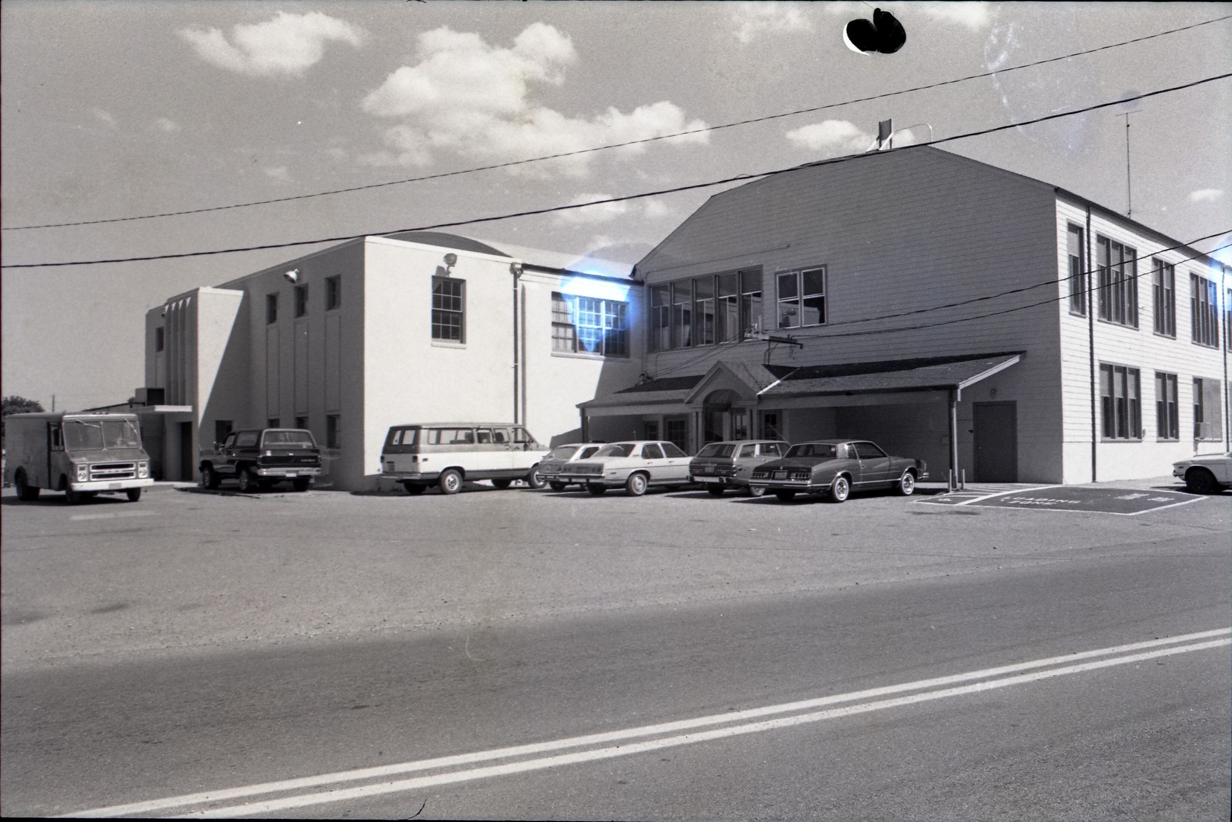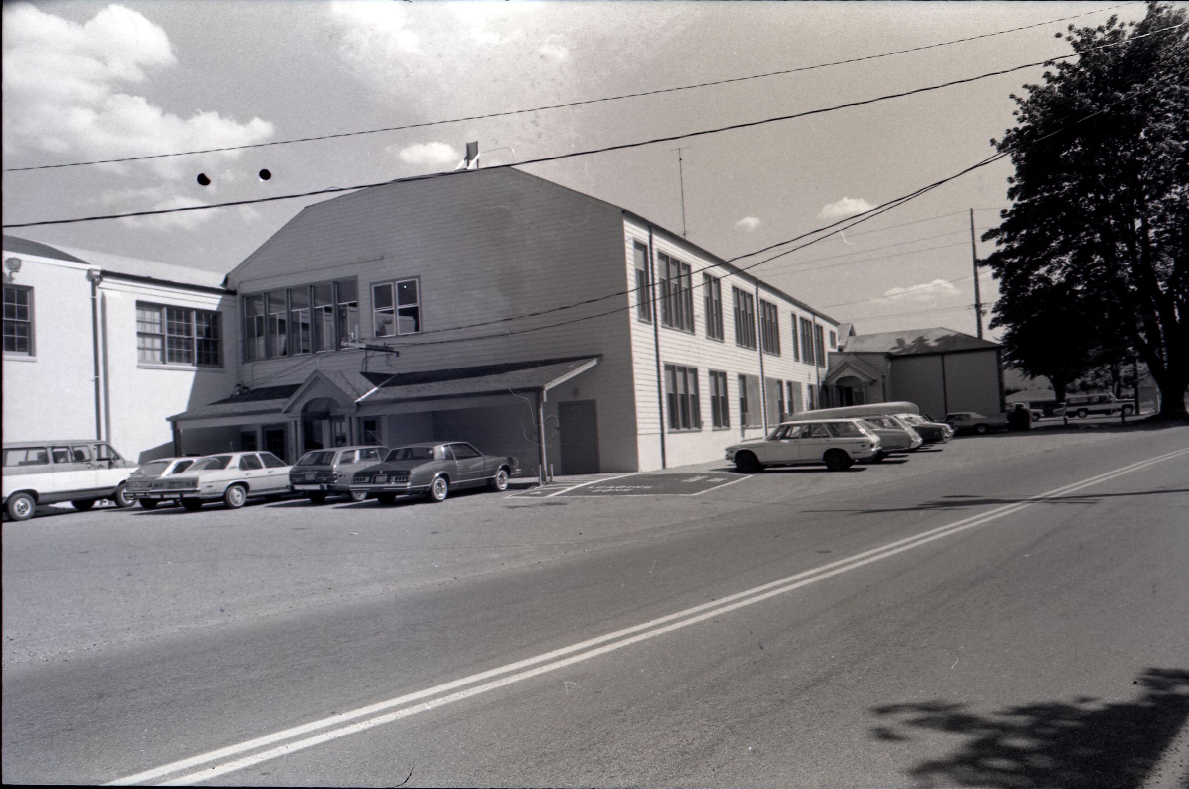 School District Office Building, 1979. This single black and white film negative strip was created for the Lacey Leader newspaper. These images show two large two-story buildings.Made/Created