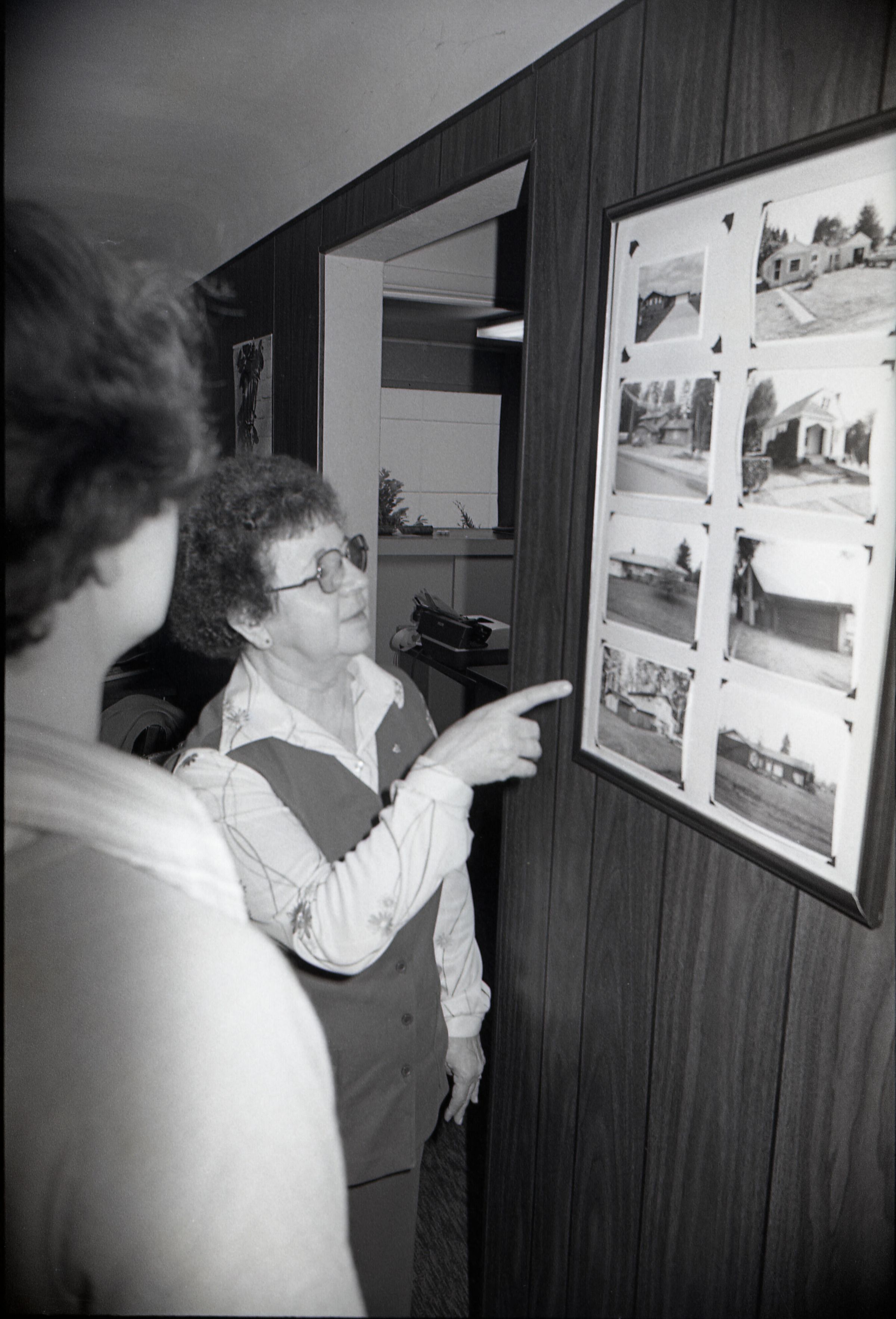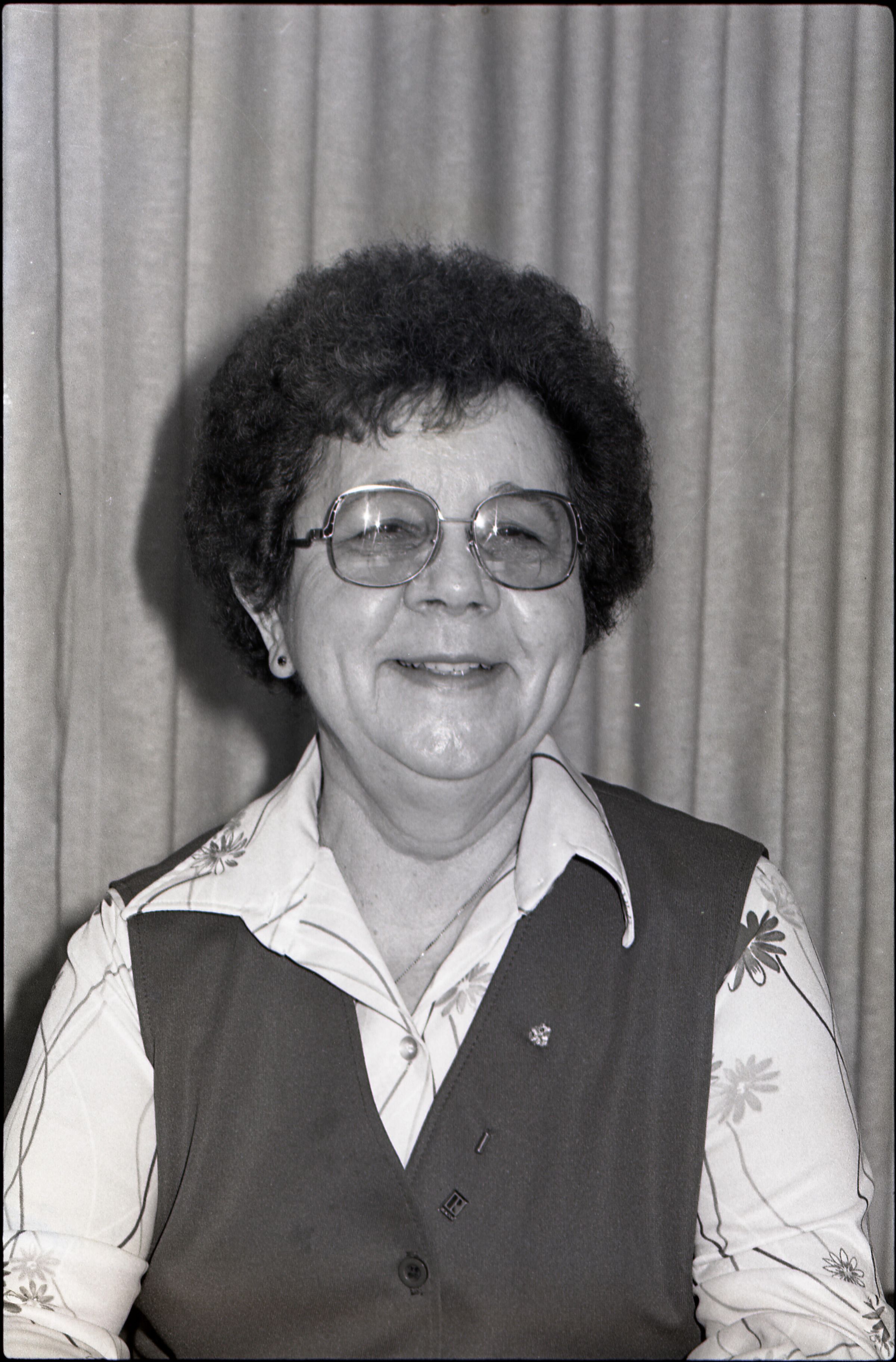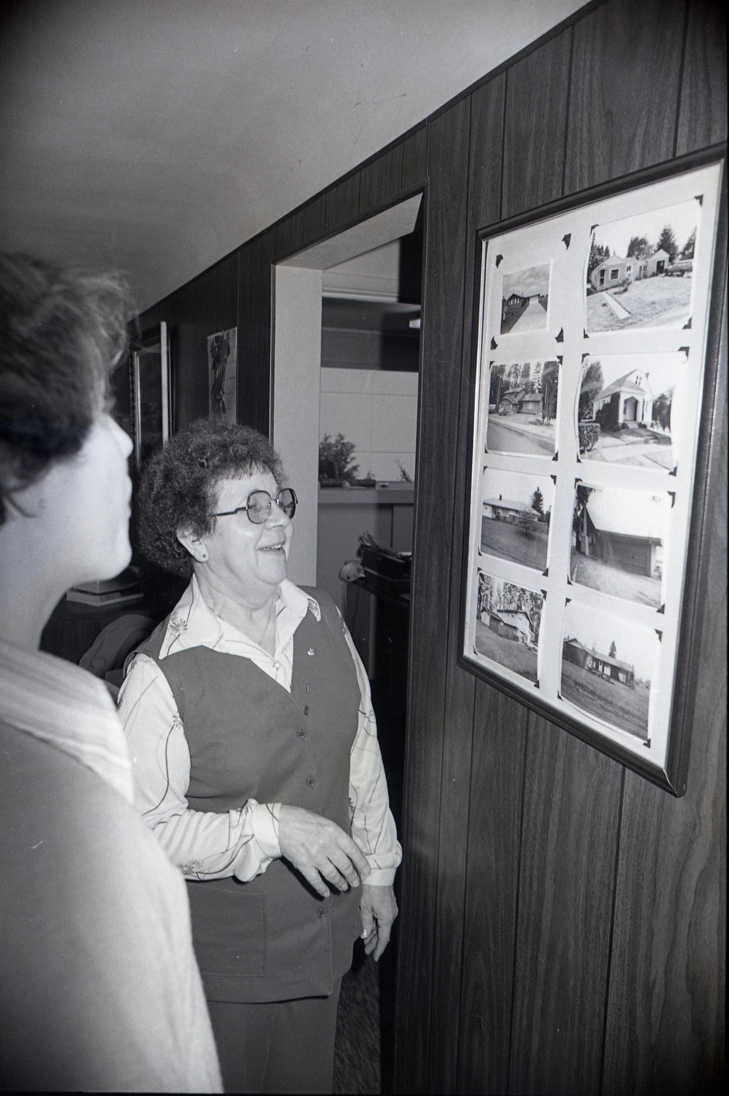 Action Guide Ruth Juono, Lacey Realty, 12-31-1980. These two black and white negative film strips were created for the Lacey Leader newspaper. They depict a woman in glasses and a vest.Made/Created