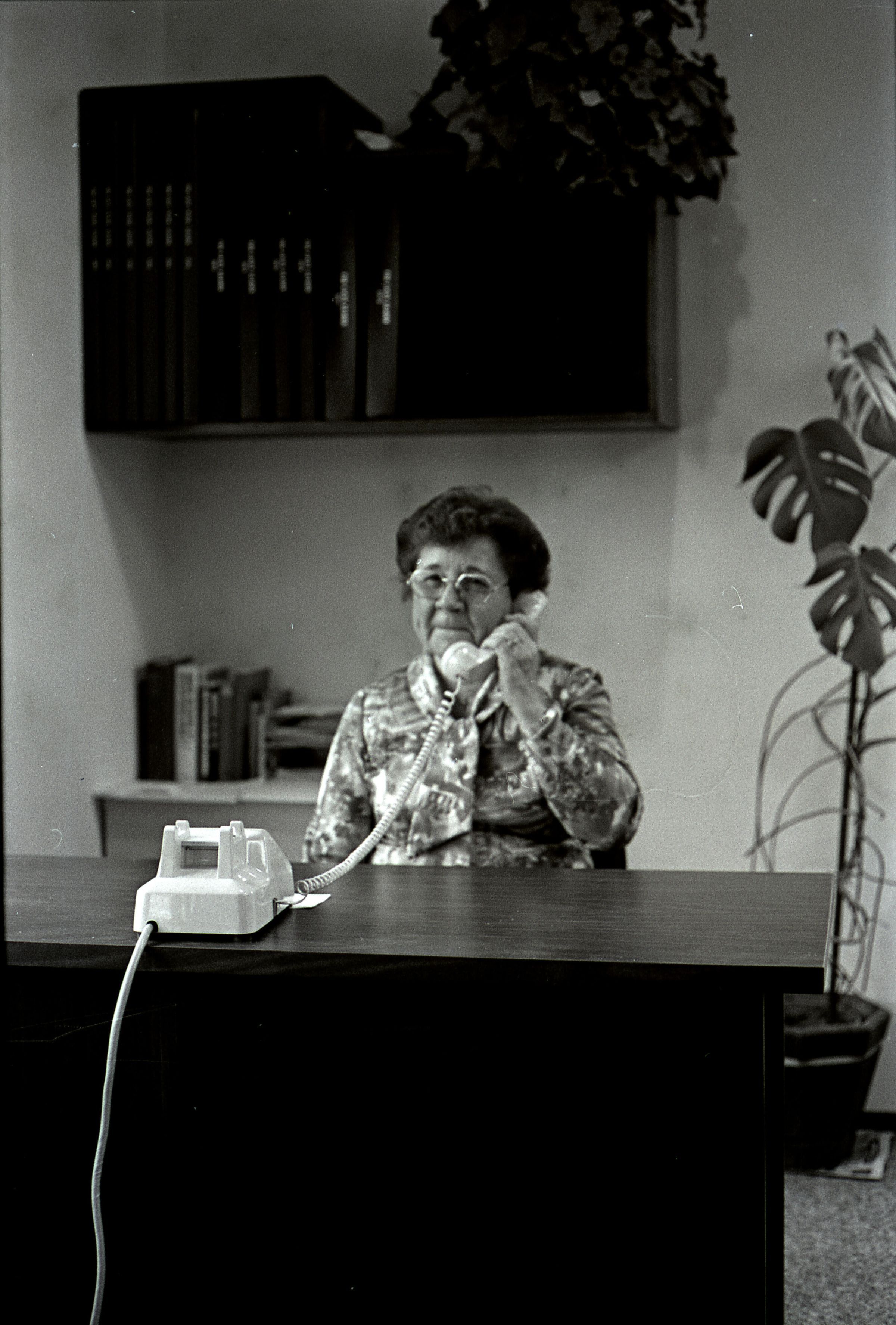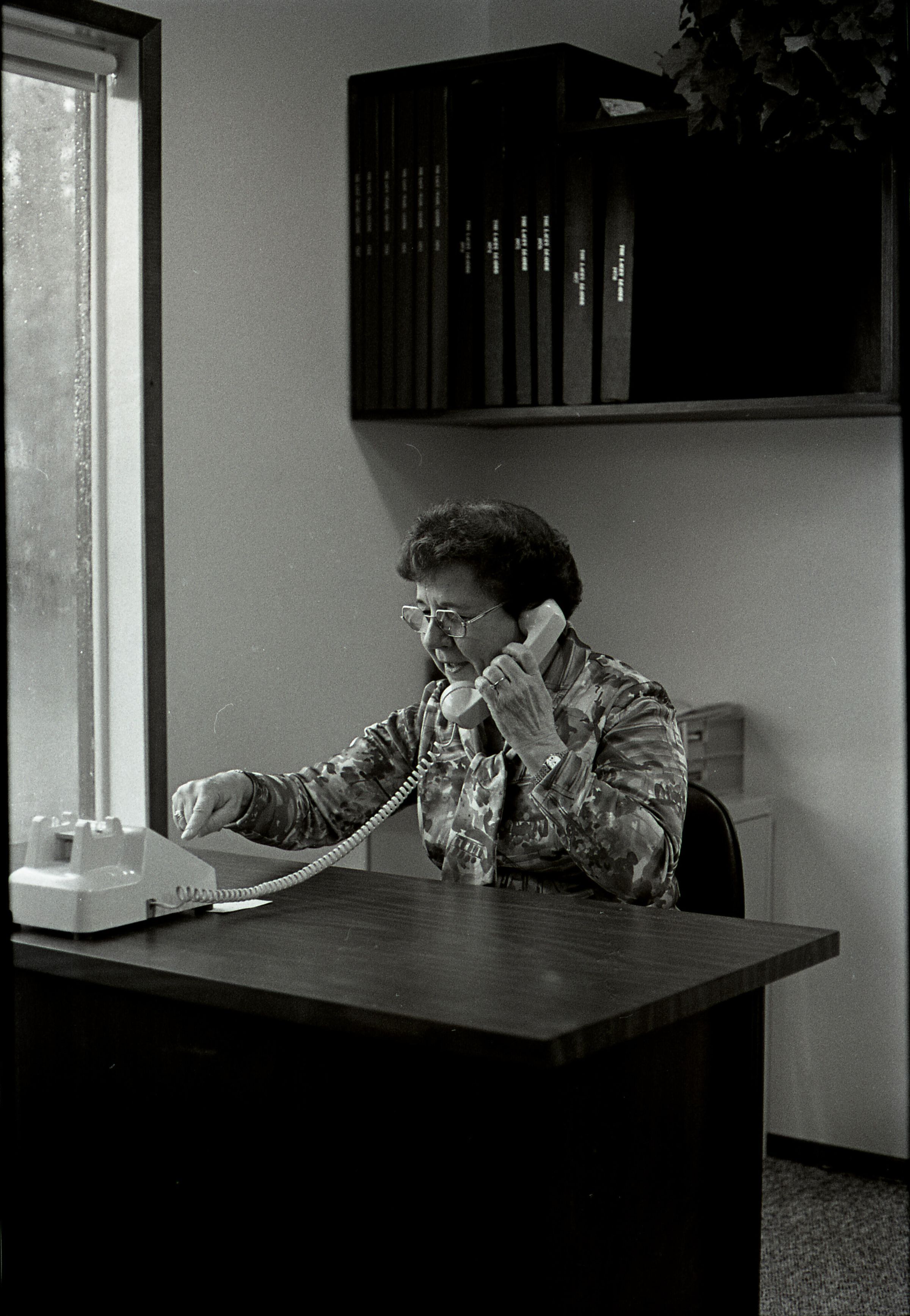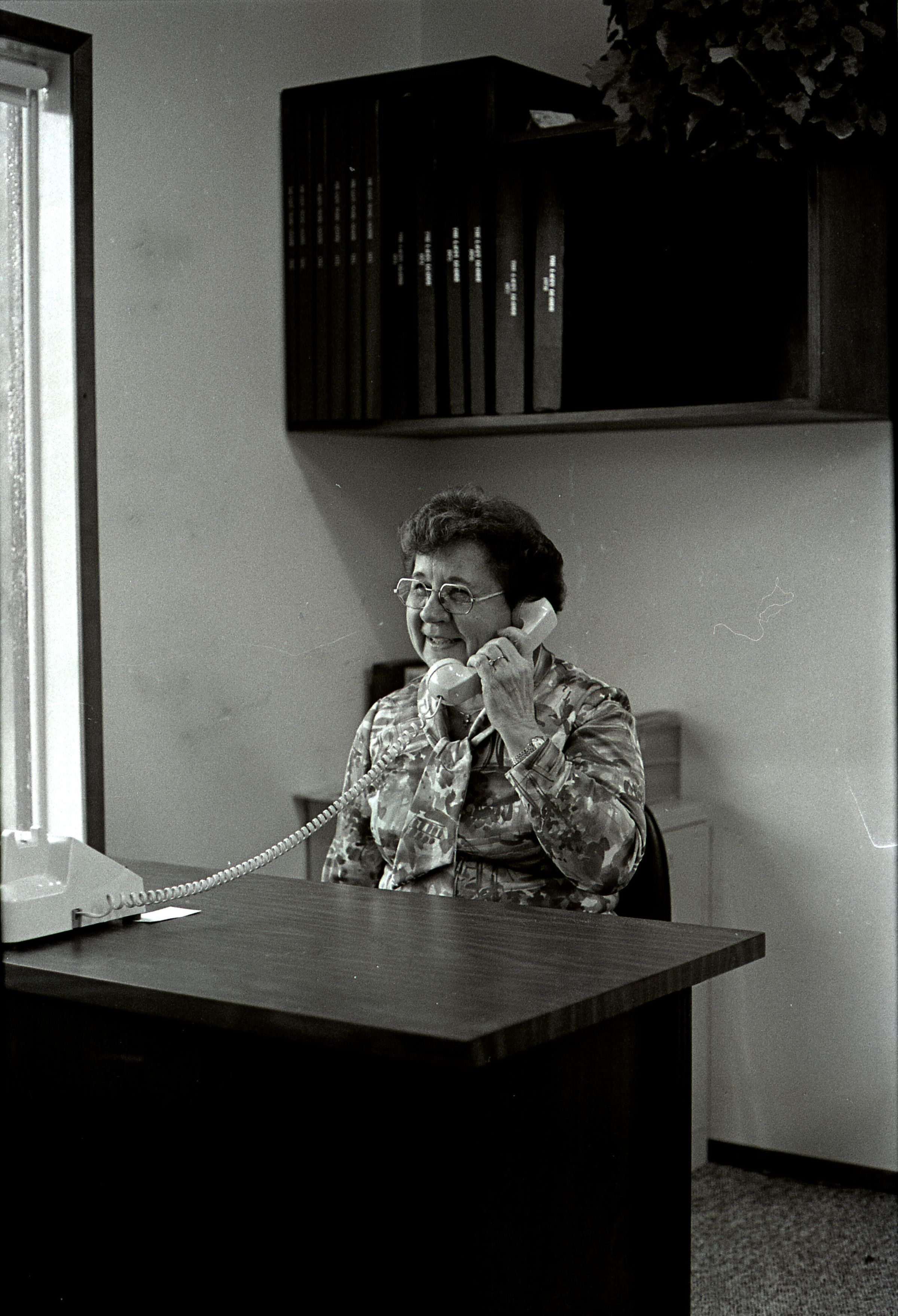 Lacey Realty Advertisement, Unknown Date. These images were created for the Lacey Leader newspaper. These images show a woman seated behind a desk and speaking on a telephone.Made/Created