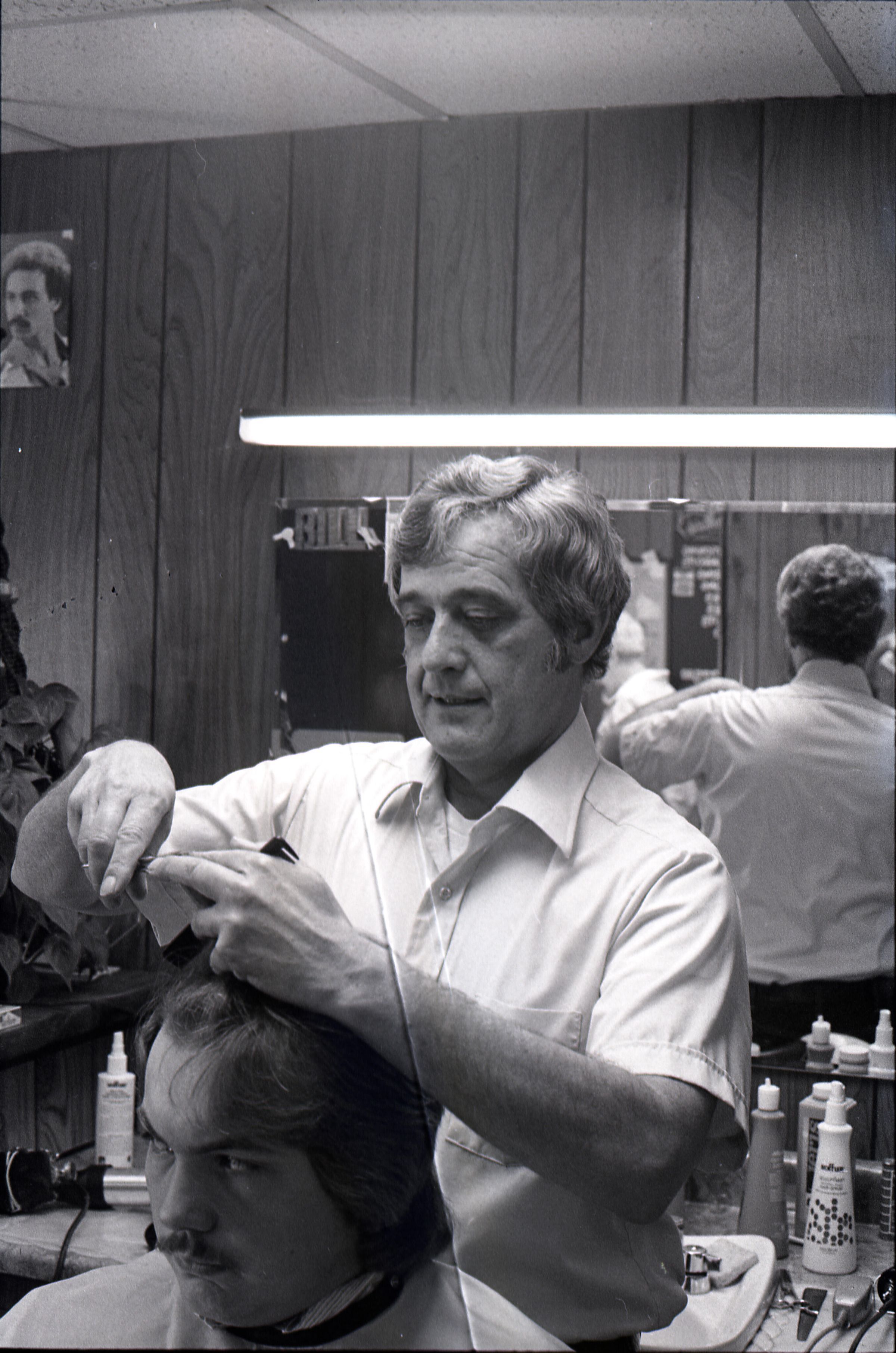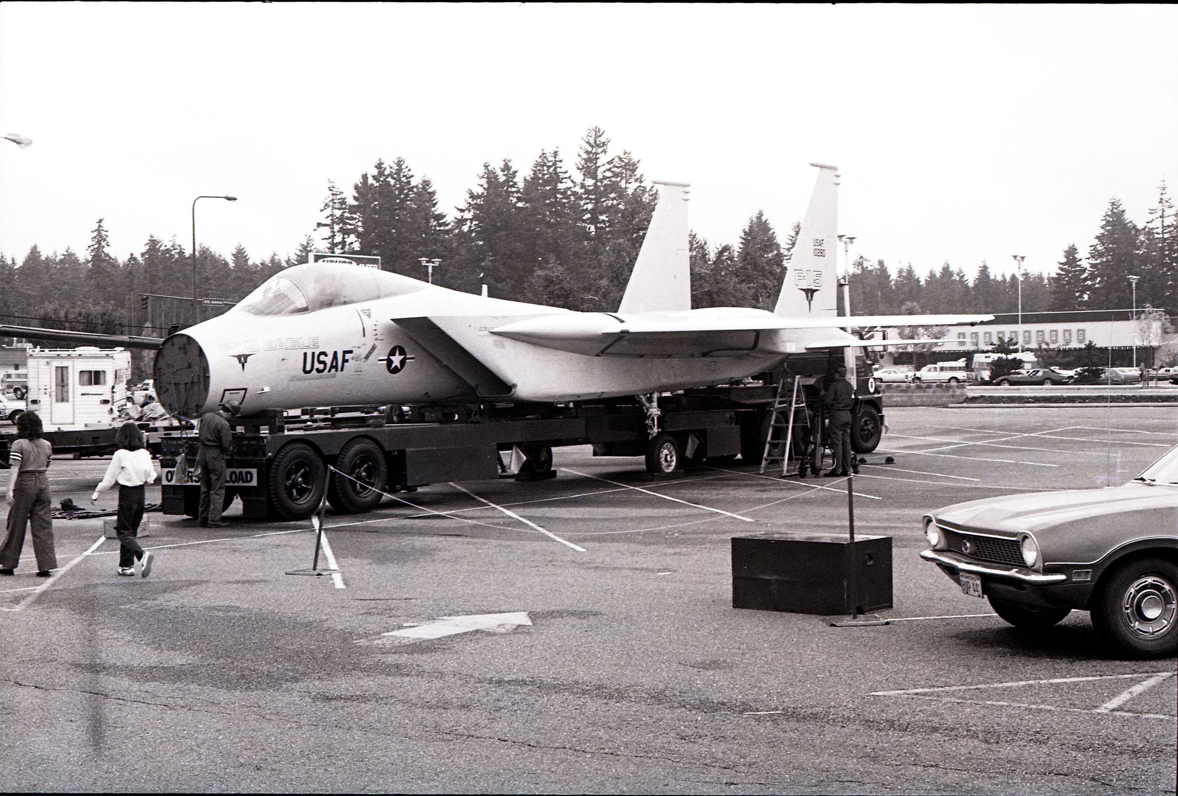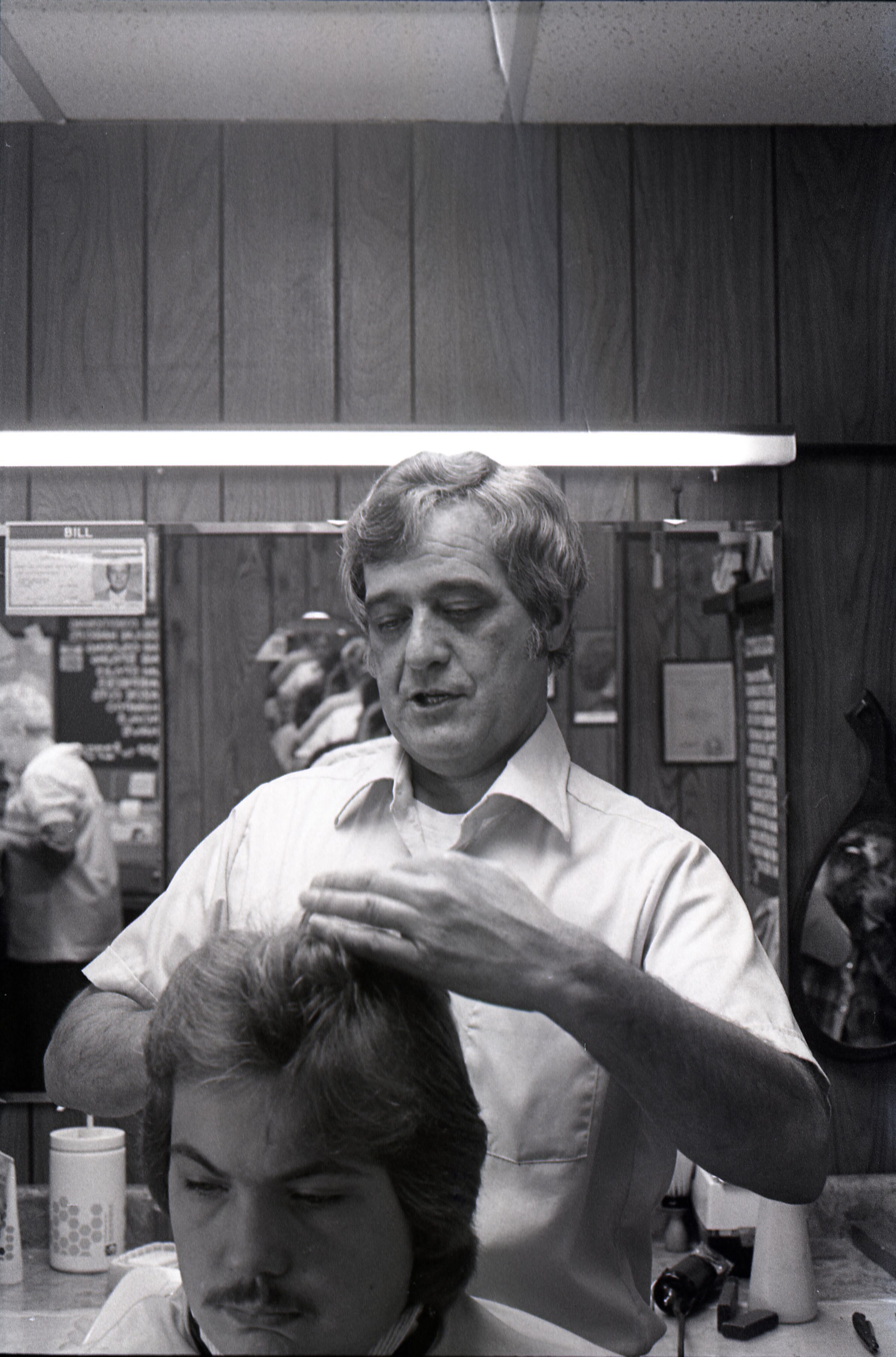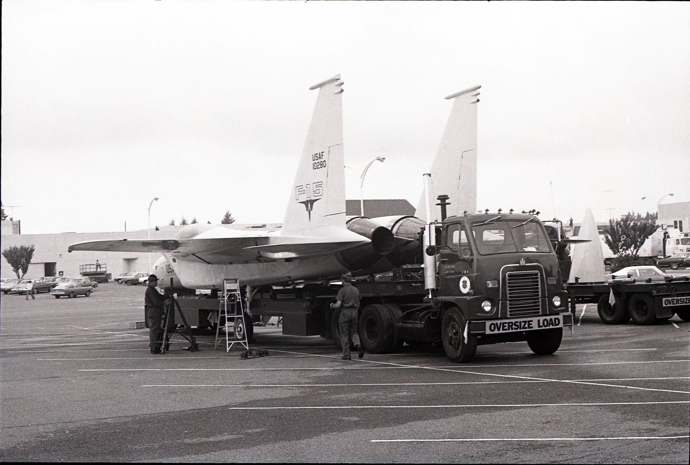Bill Stume, unknown date. These two black and white negative film strips were created for the Lacey Leader newspaper. They depict a man giving a haircut and an F15 jet on a truck.Made/Created