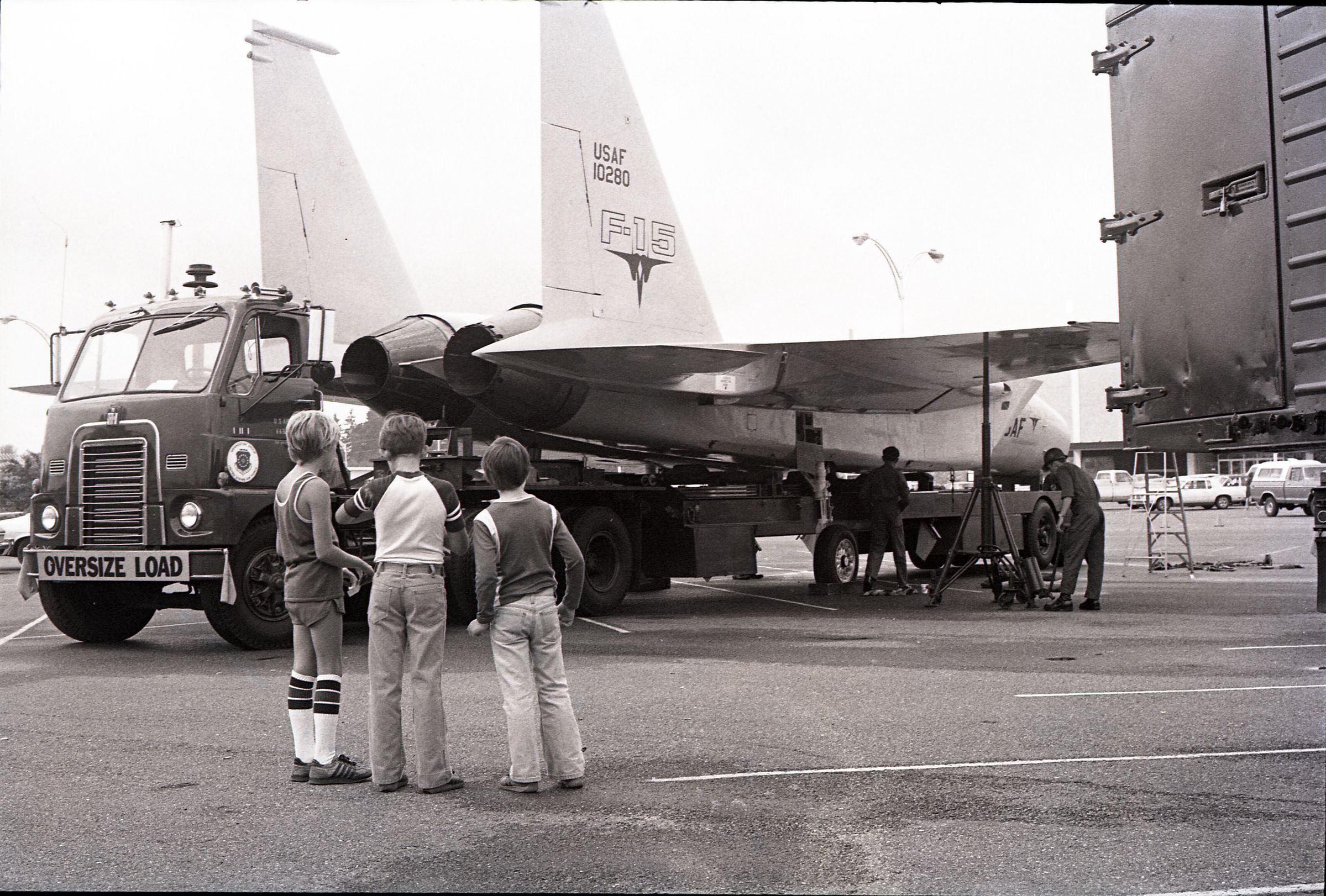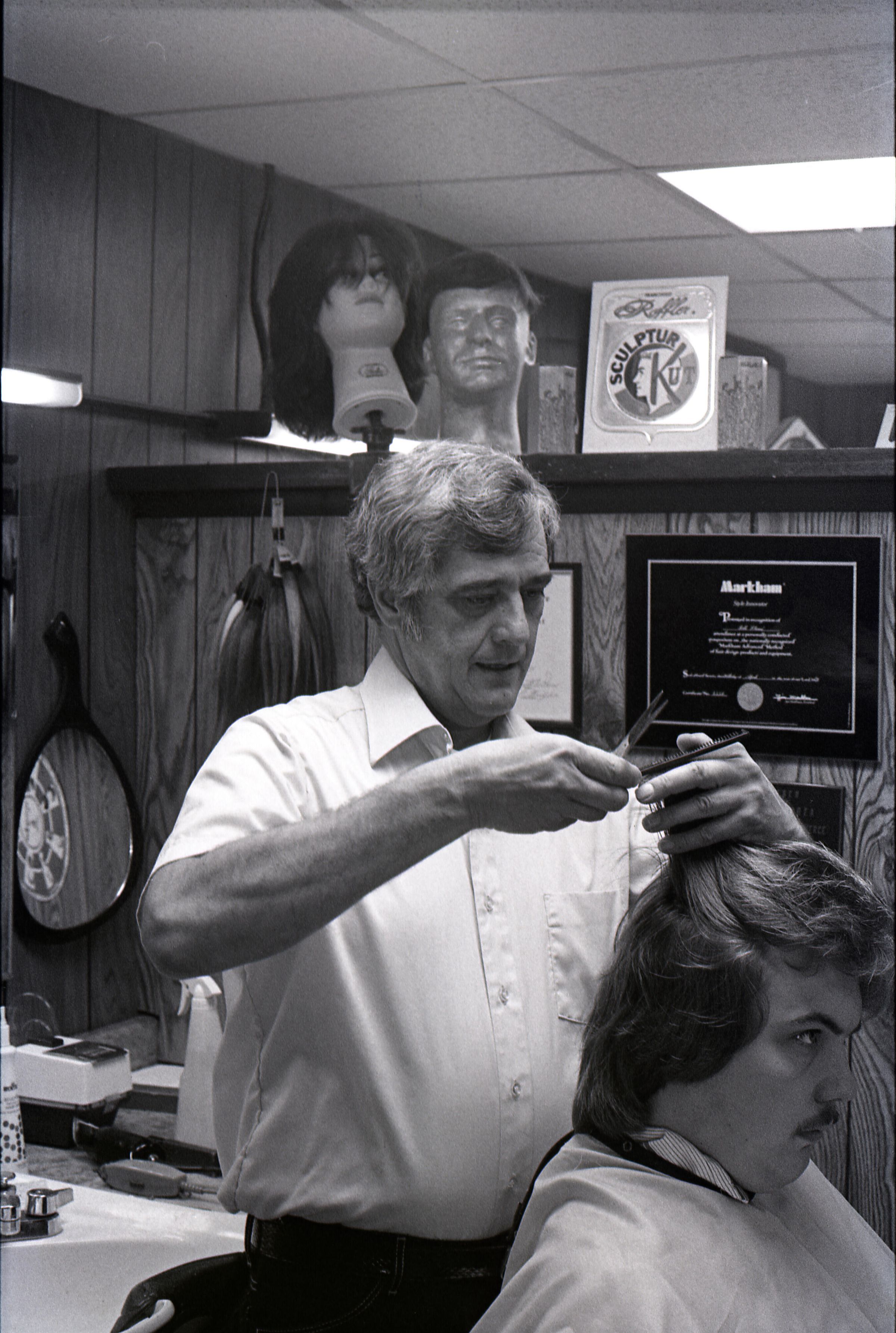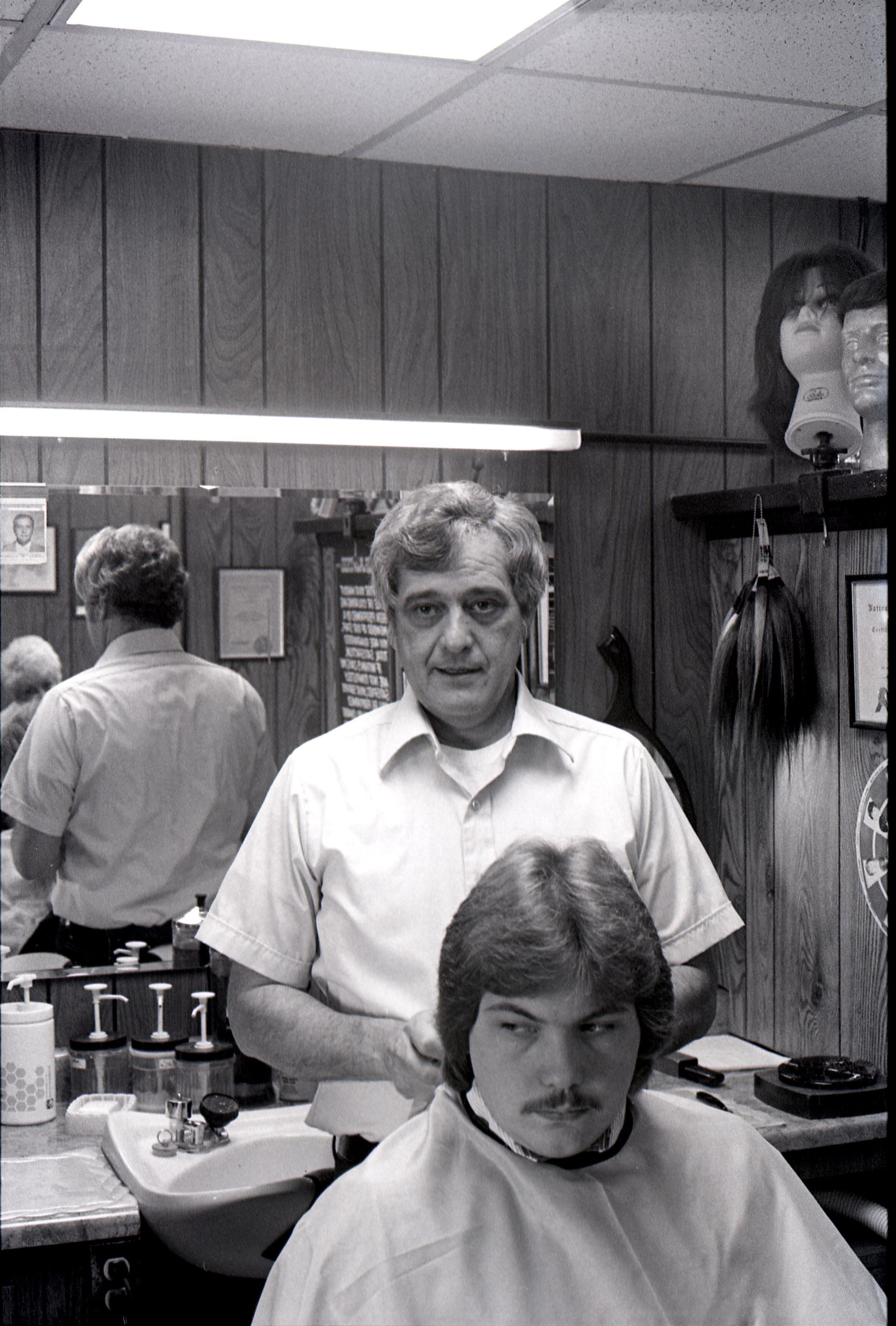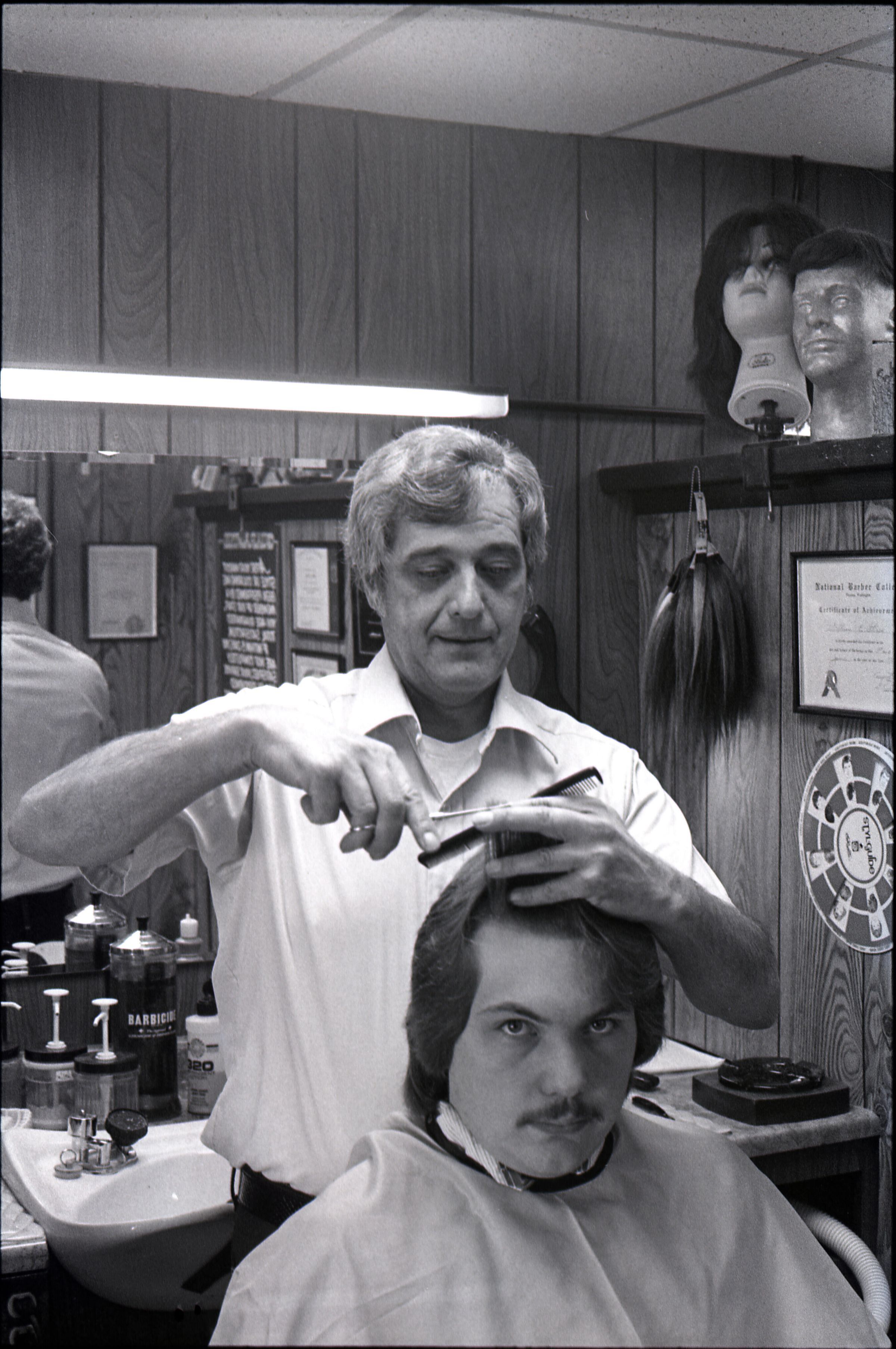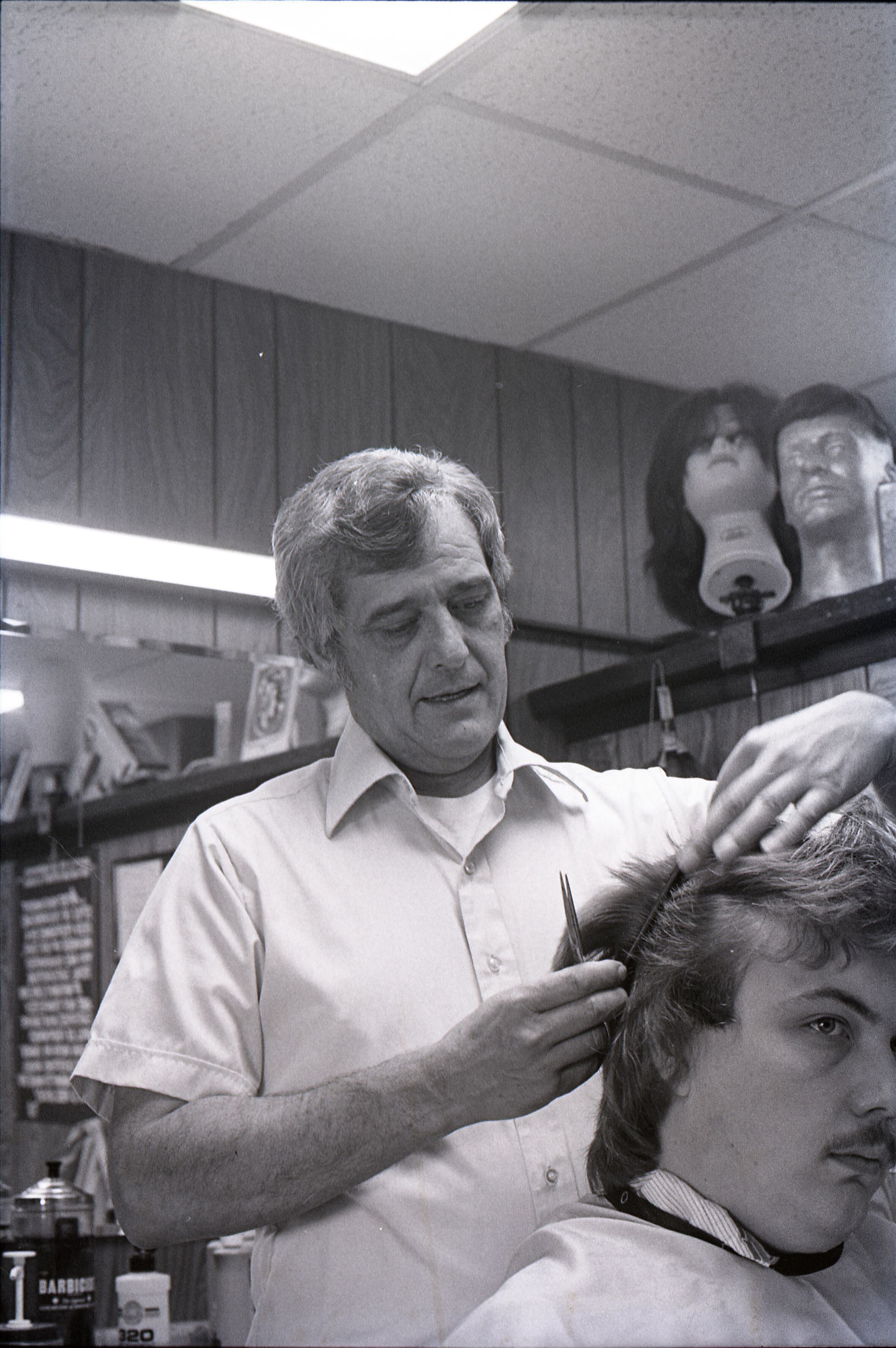 Bill Stume, unknown date. These two black and white negative film strips were created for the Lacey Leader newspaper. They depict a man giving a haircut and an F15 jet on a truck.Made/Created