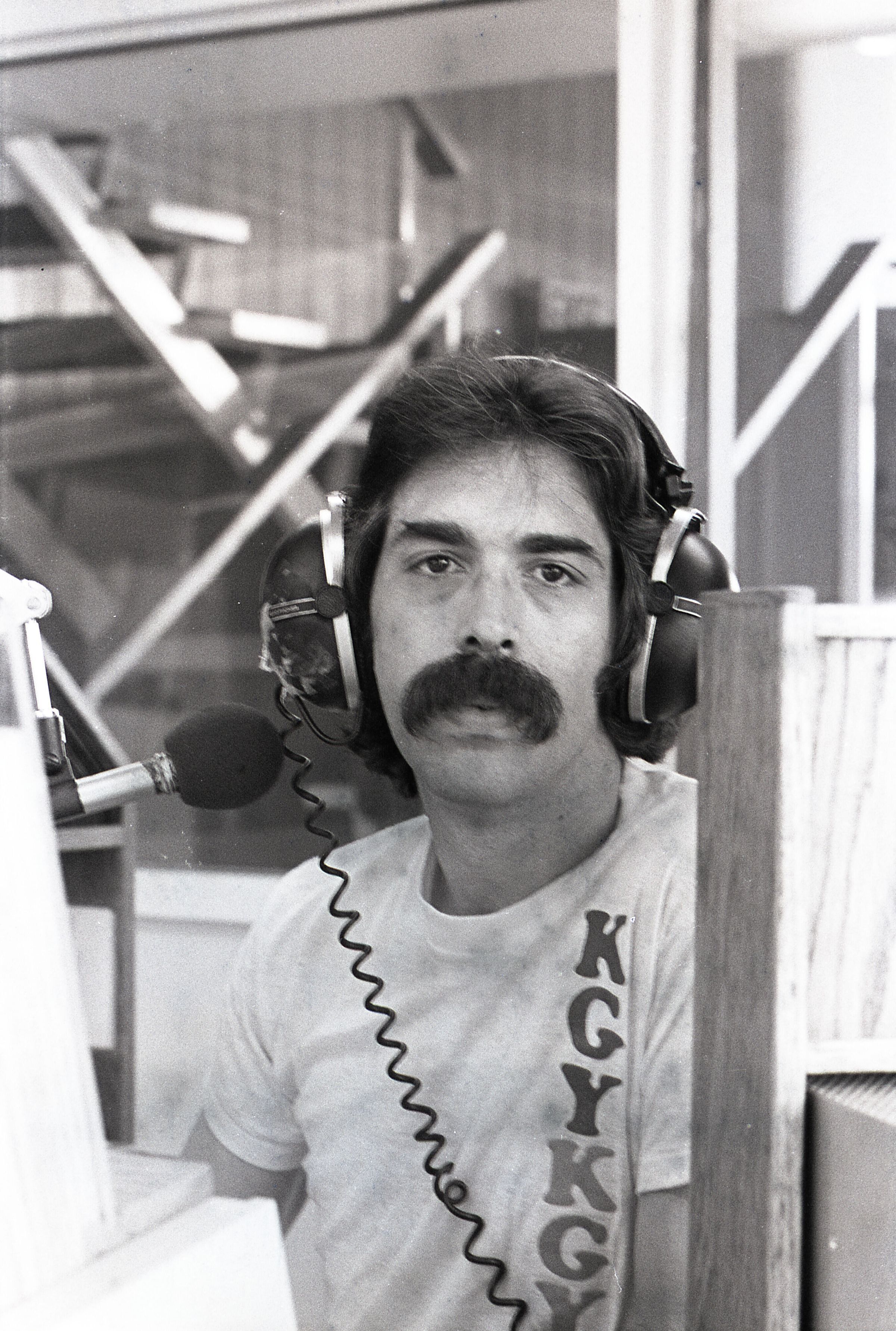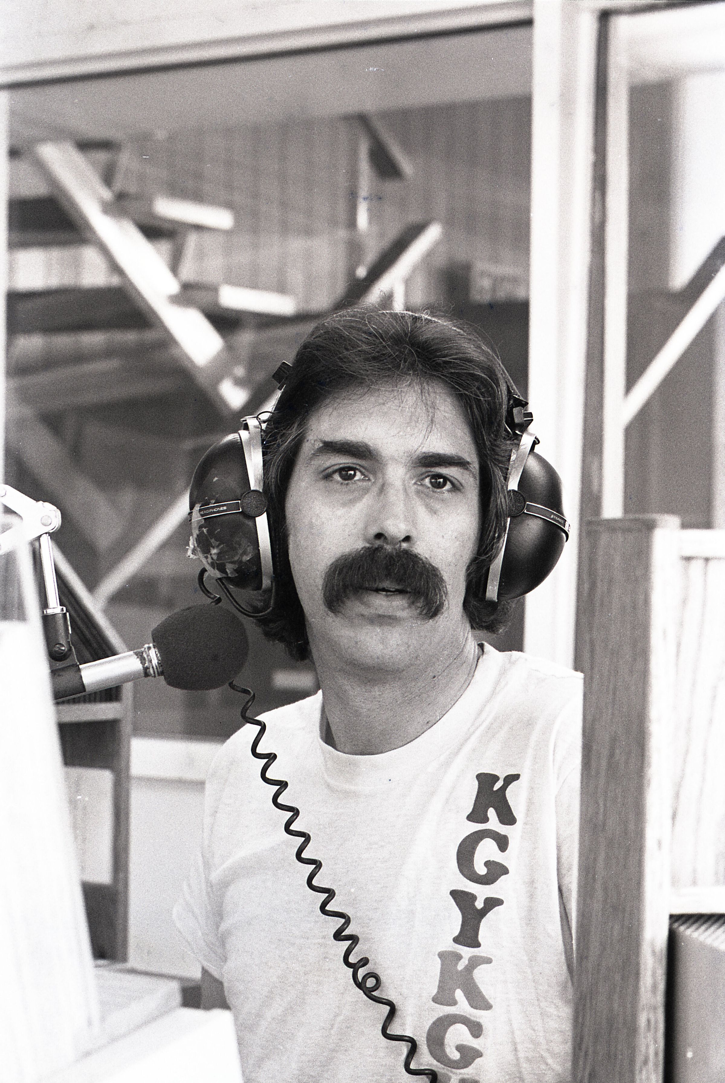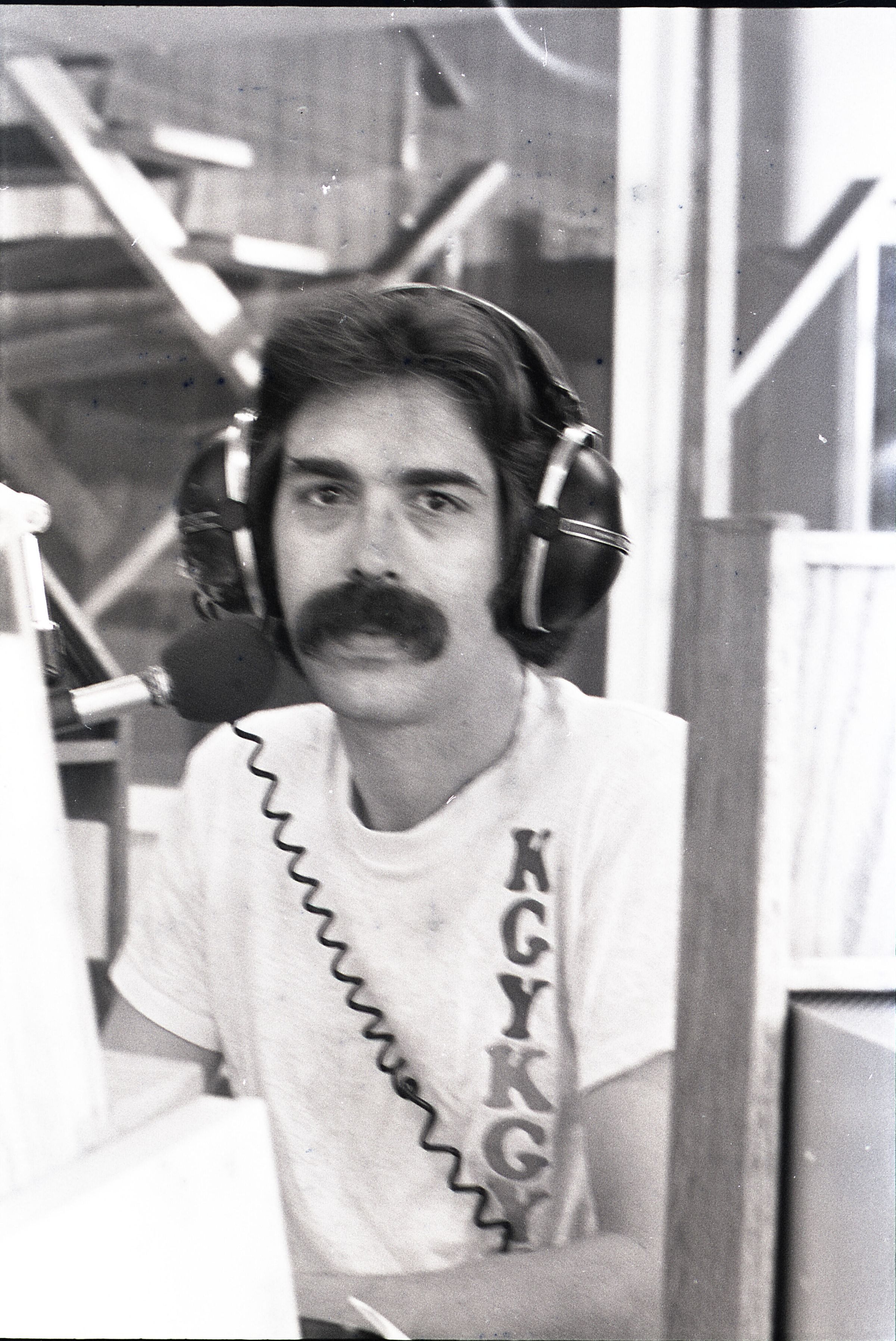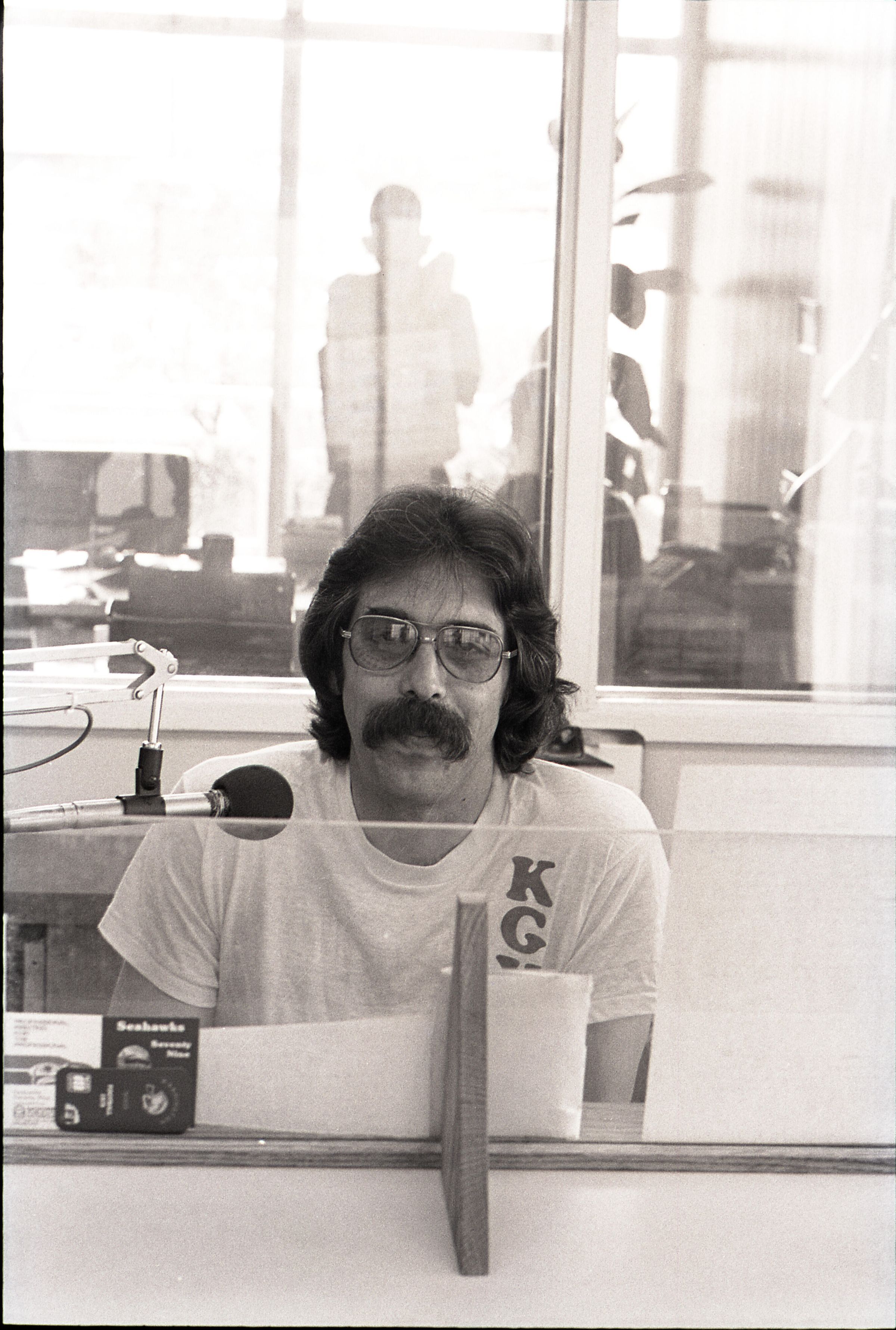 KGY Carl Cook, unknown date. These two black and white negative film strips were created for the Lacey Leader newspaper. They depict a man with a mustache wearing a KGY tee shirt in a seated position.Made/Created