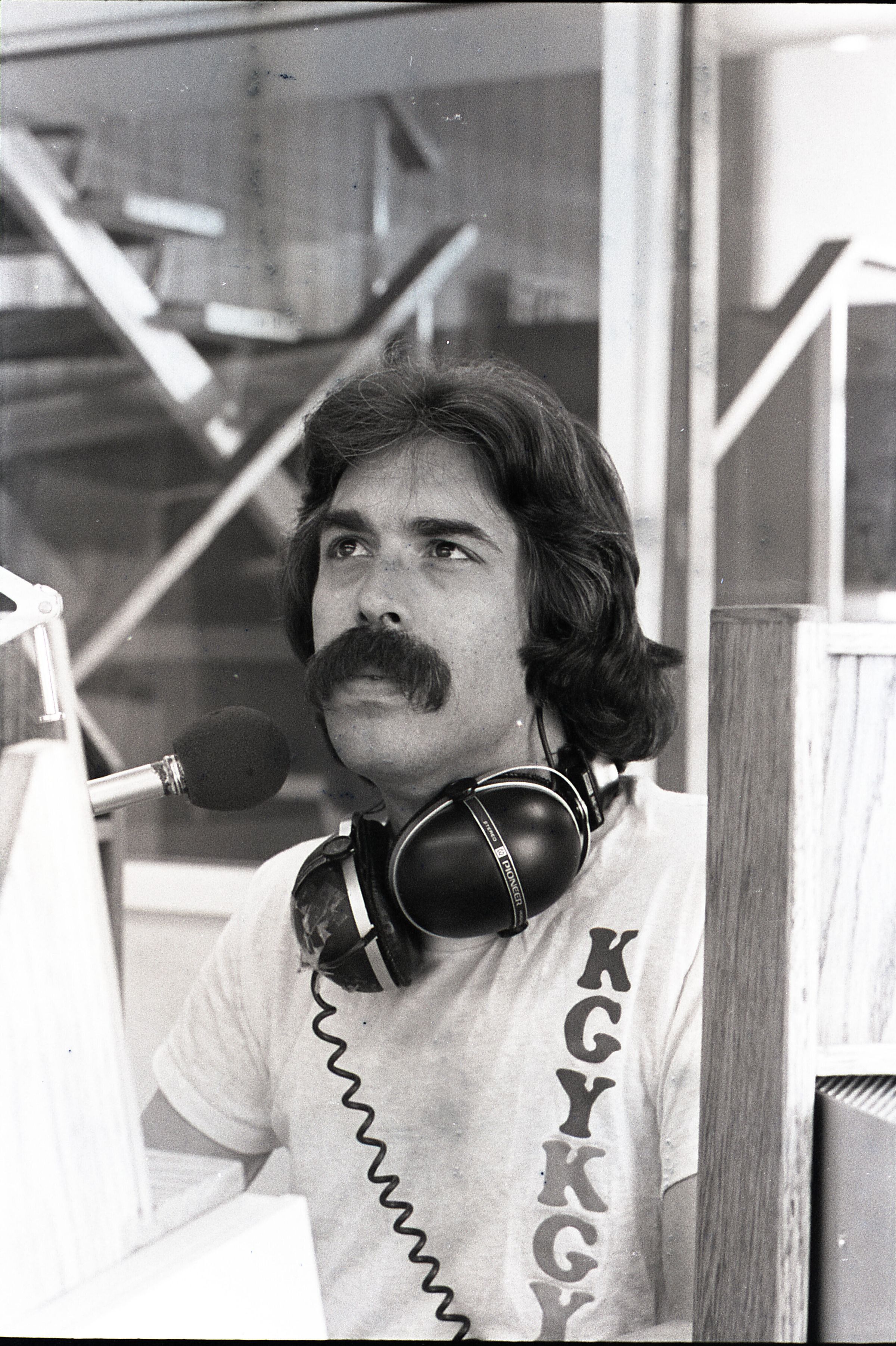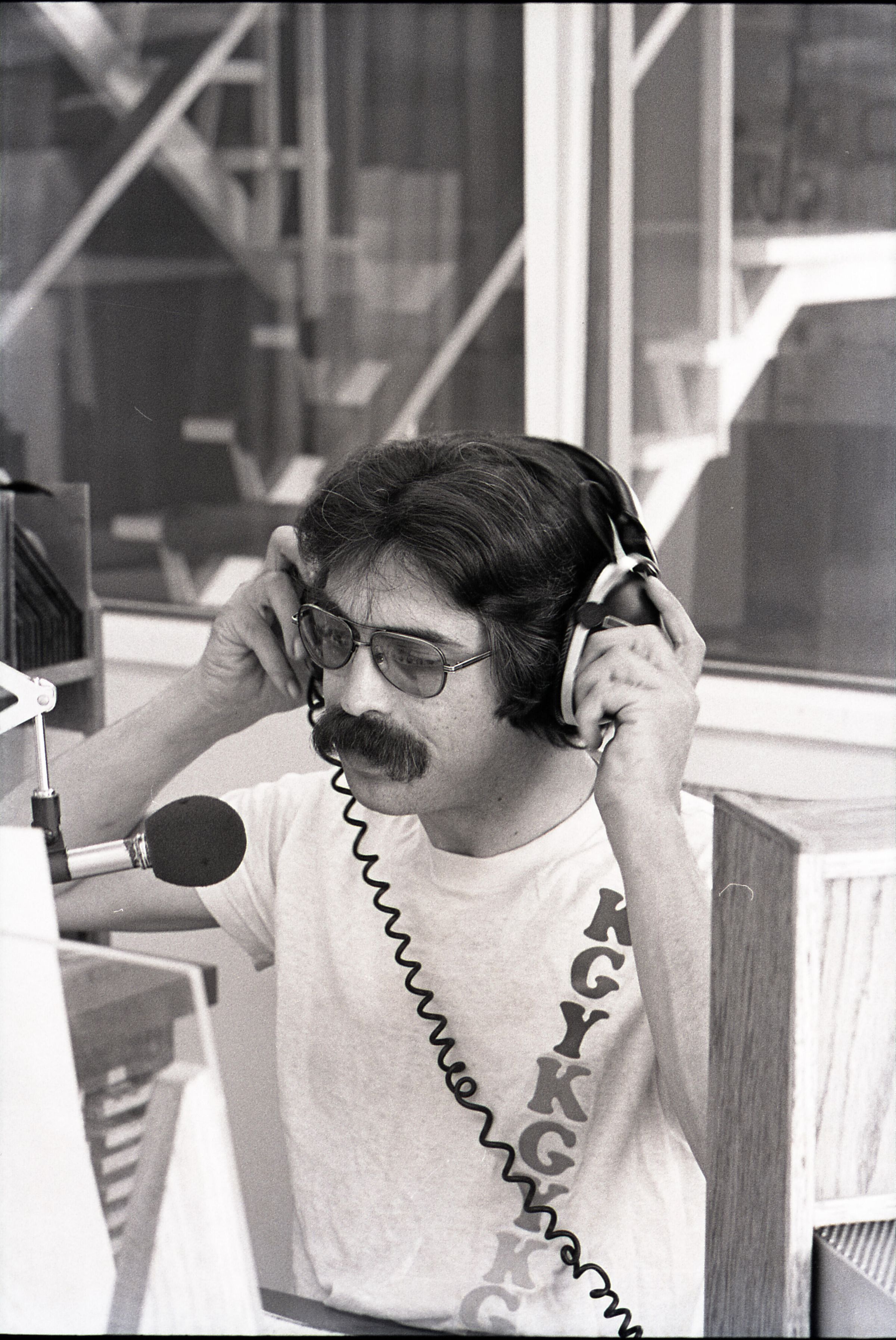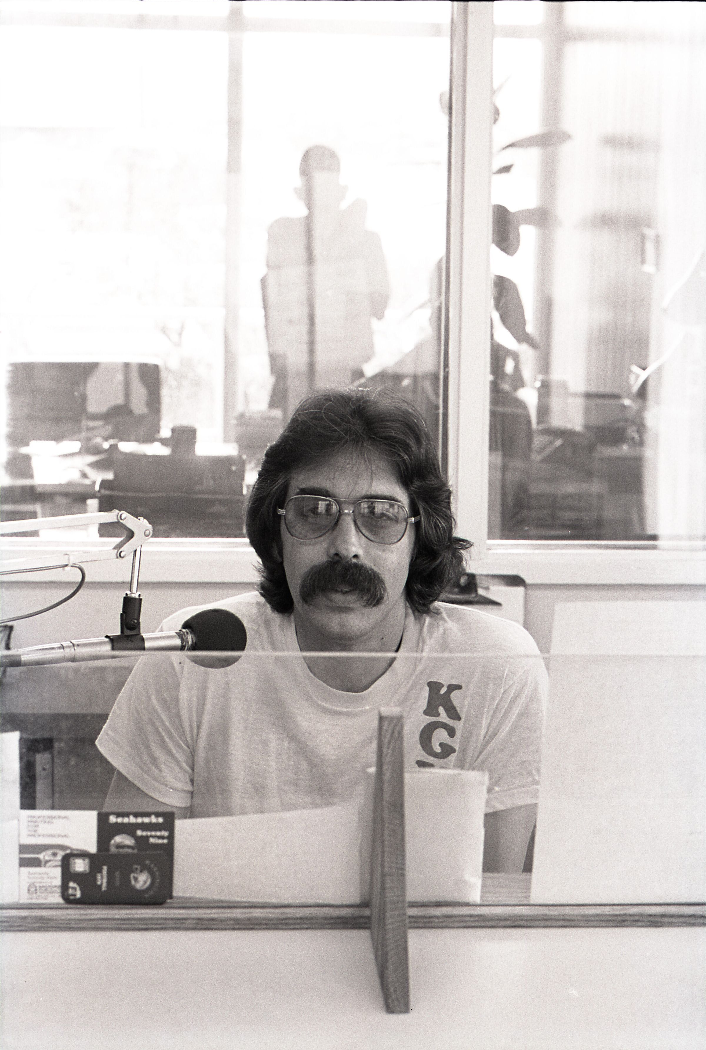 KGY Carl Cook, unknown date. These two black and white negative film strips were created for the Lacey Leader newspaper. They depict a man with a mustache wearing a KGY tee shirt in a seated position.Made/Created