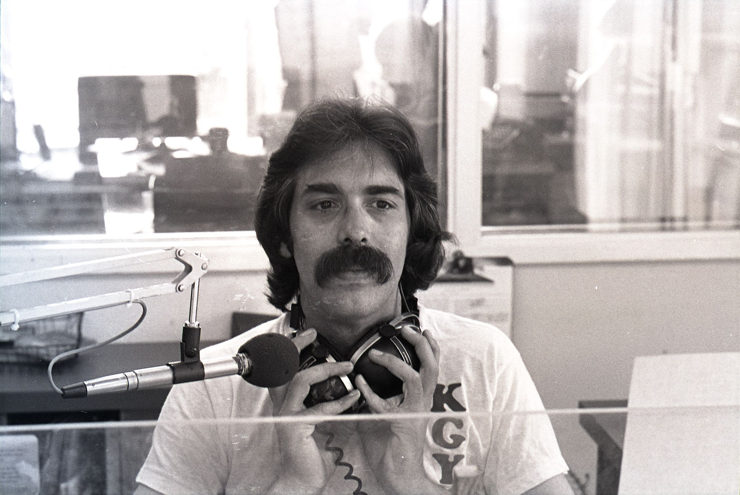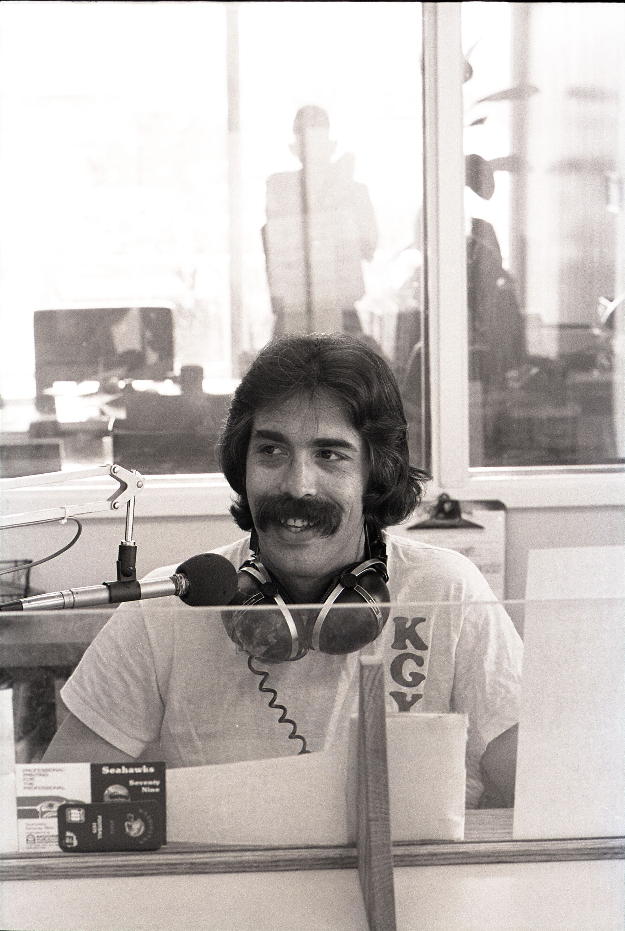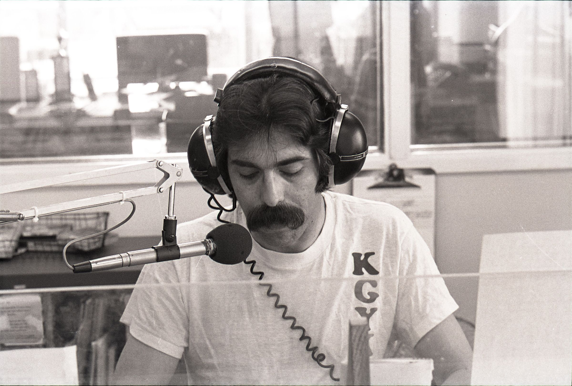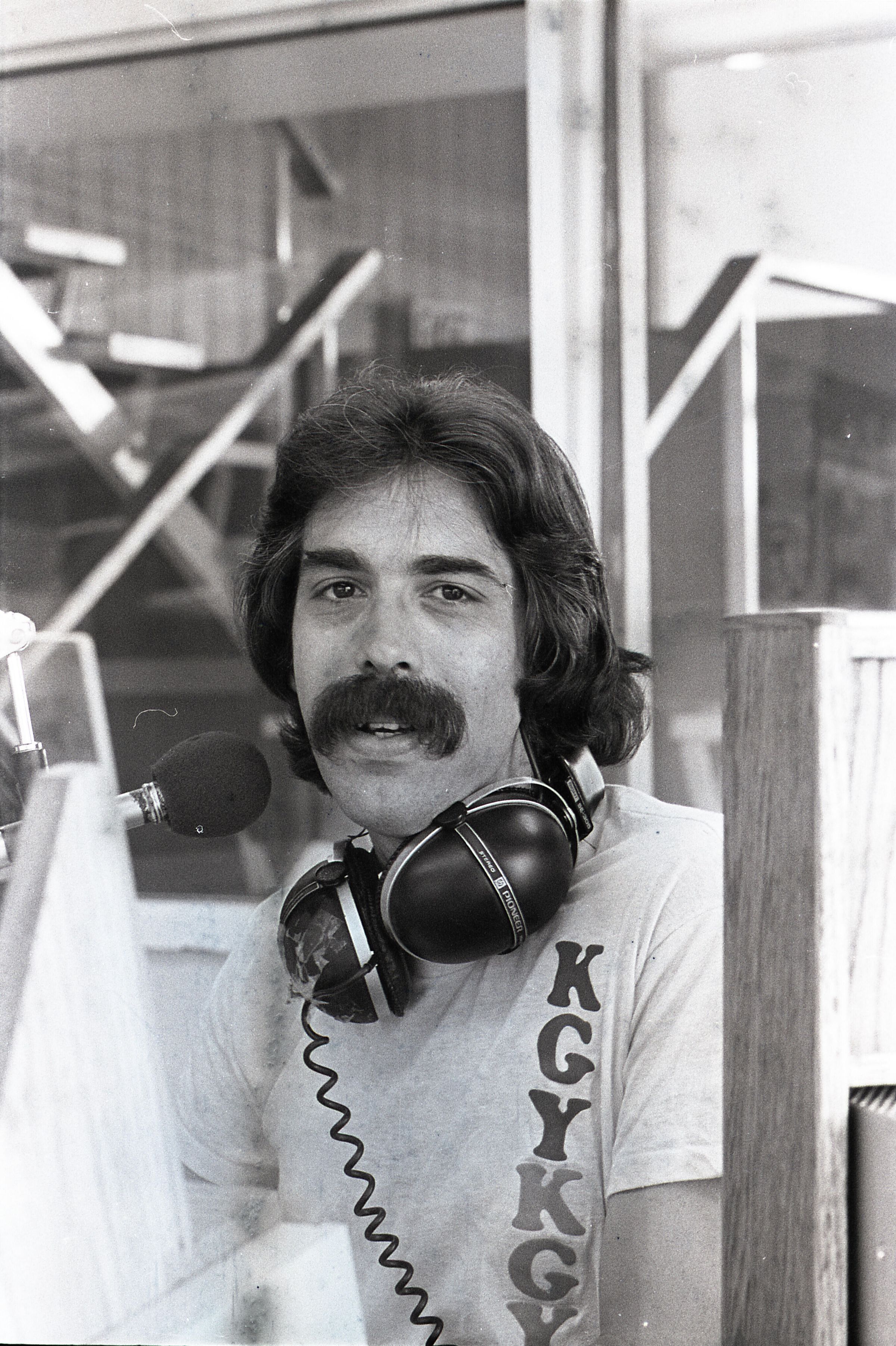 KGY Carl Cook, unknown date. These two black and white negative film strips were created for the Lacey Leader newspaper. They depict a man with a mustache wearing a KGY tee shirt in a seated position.Made/Created