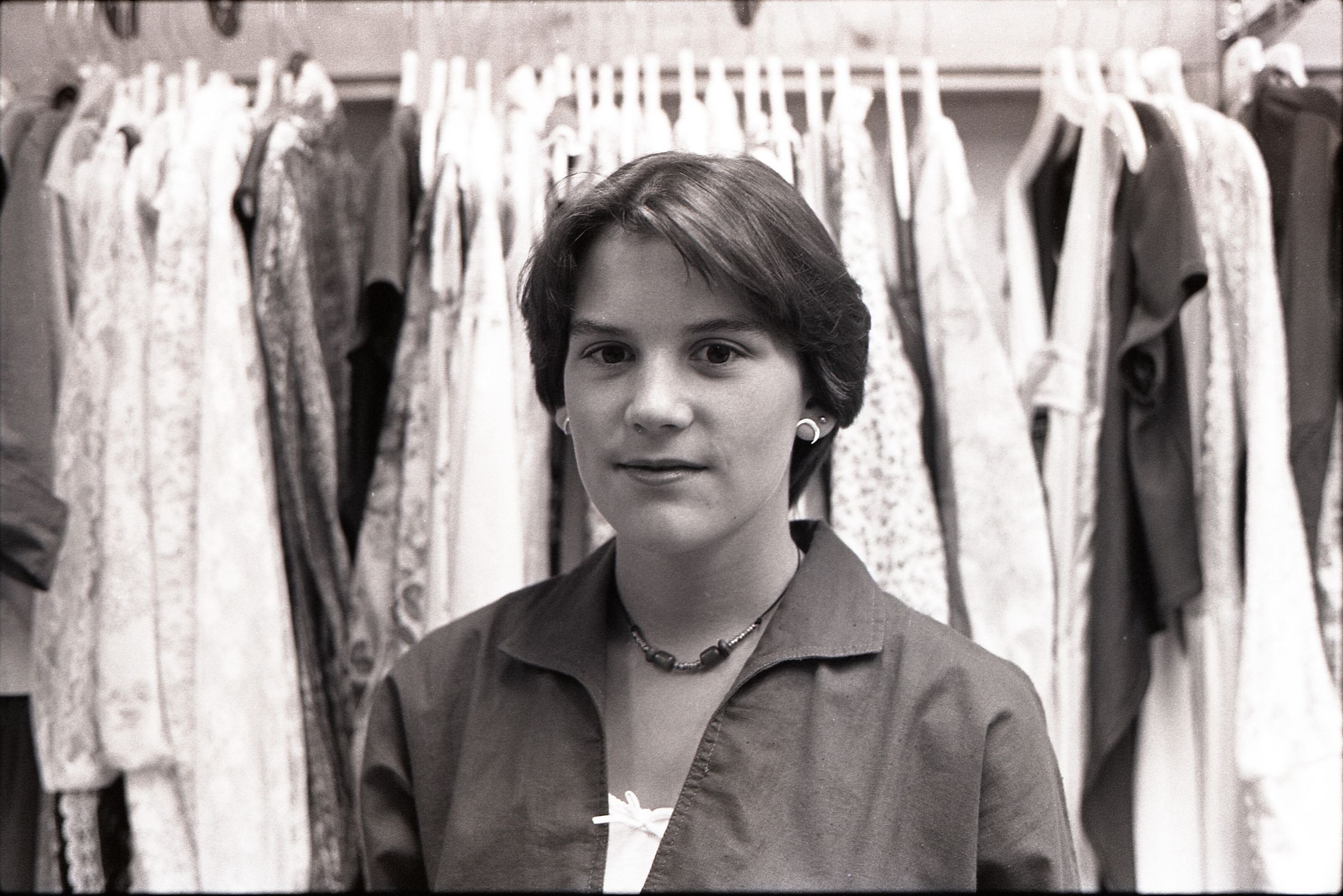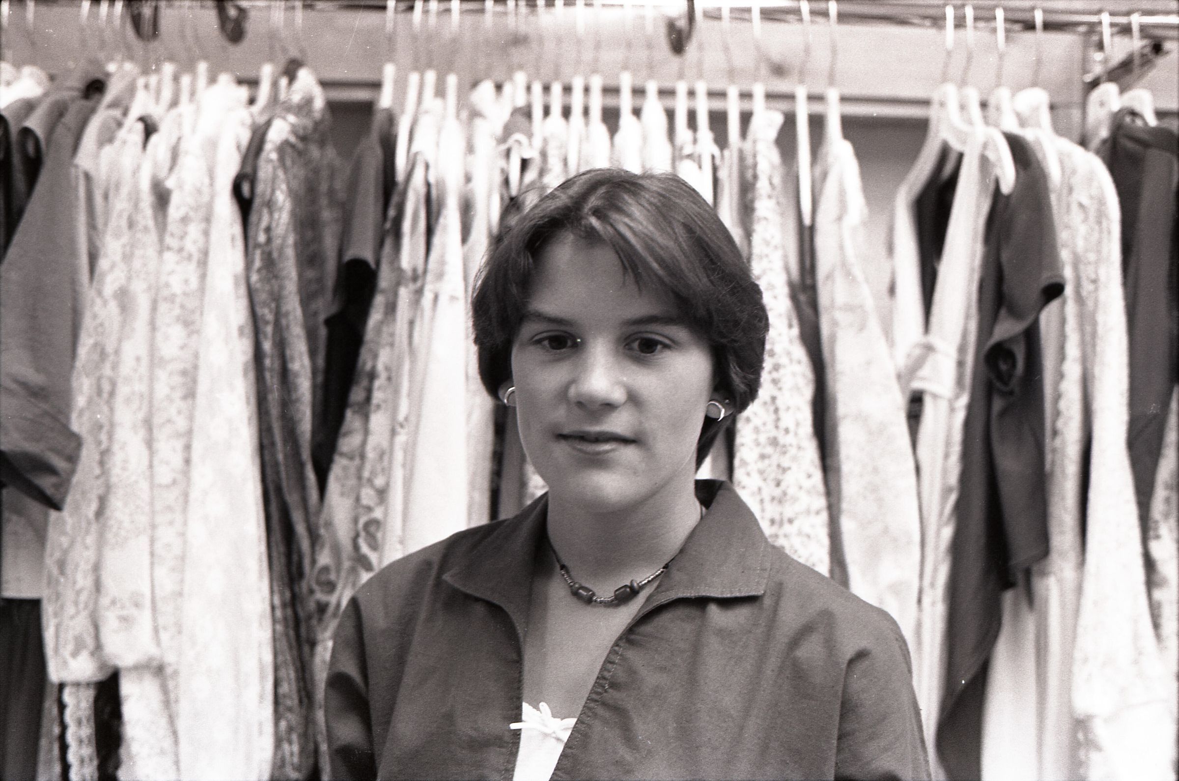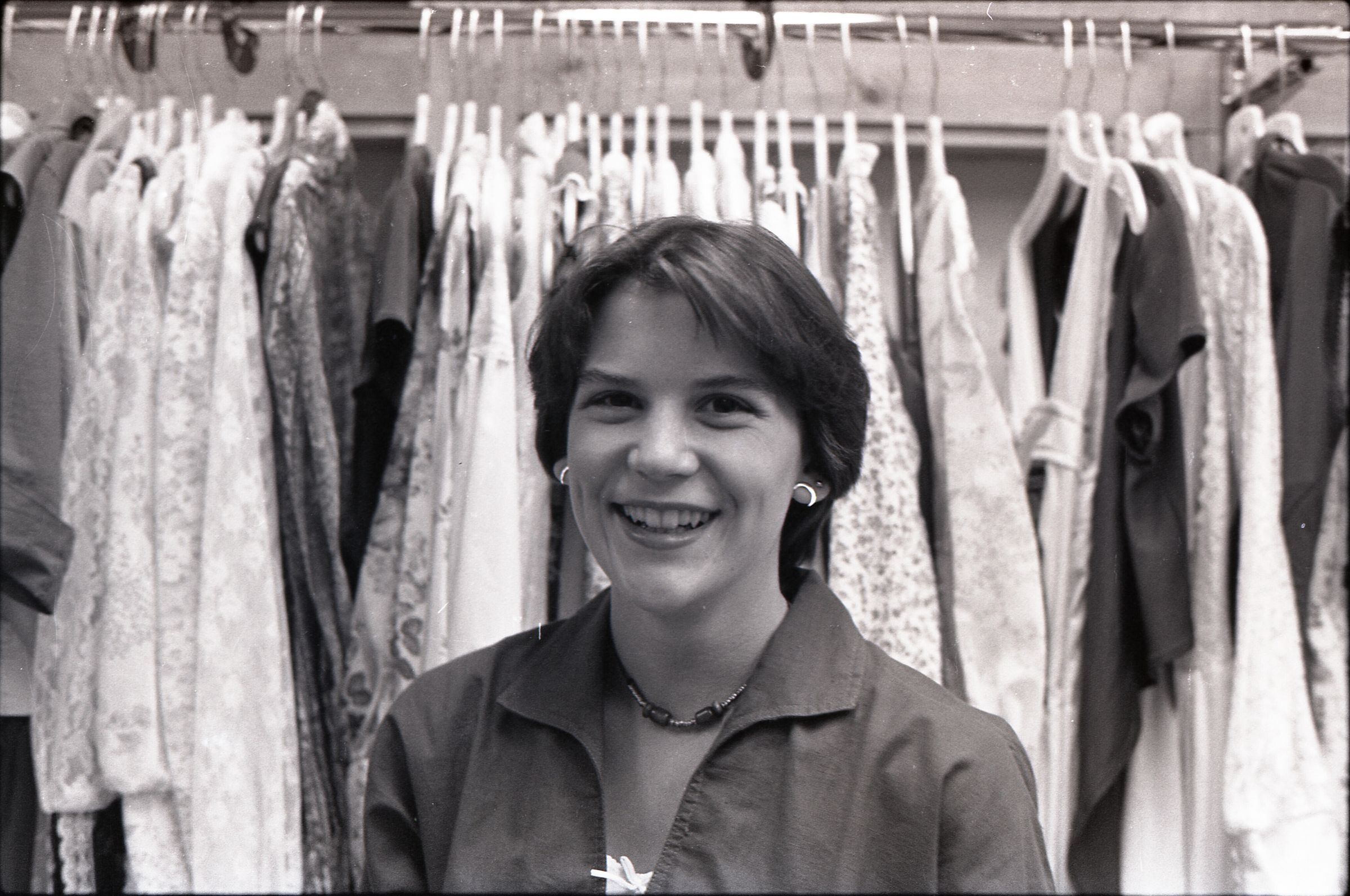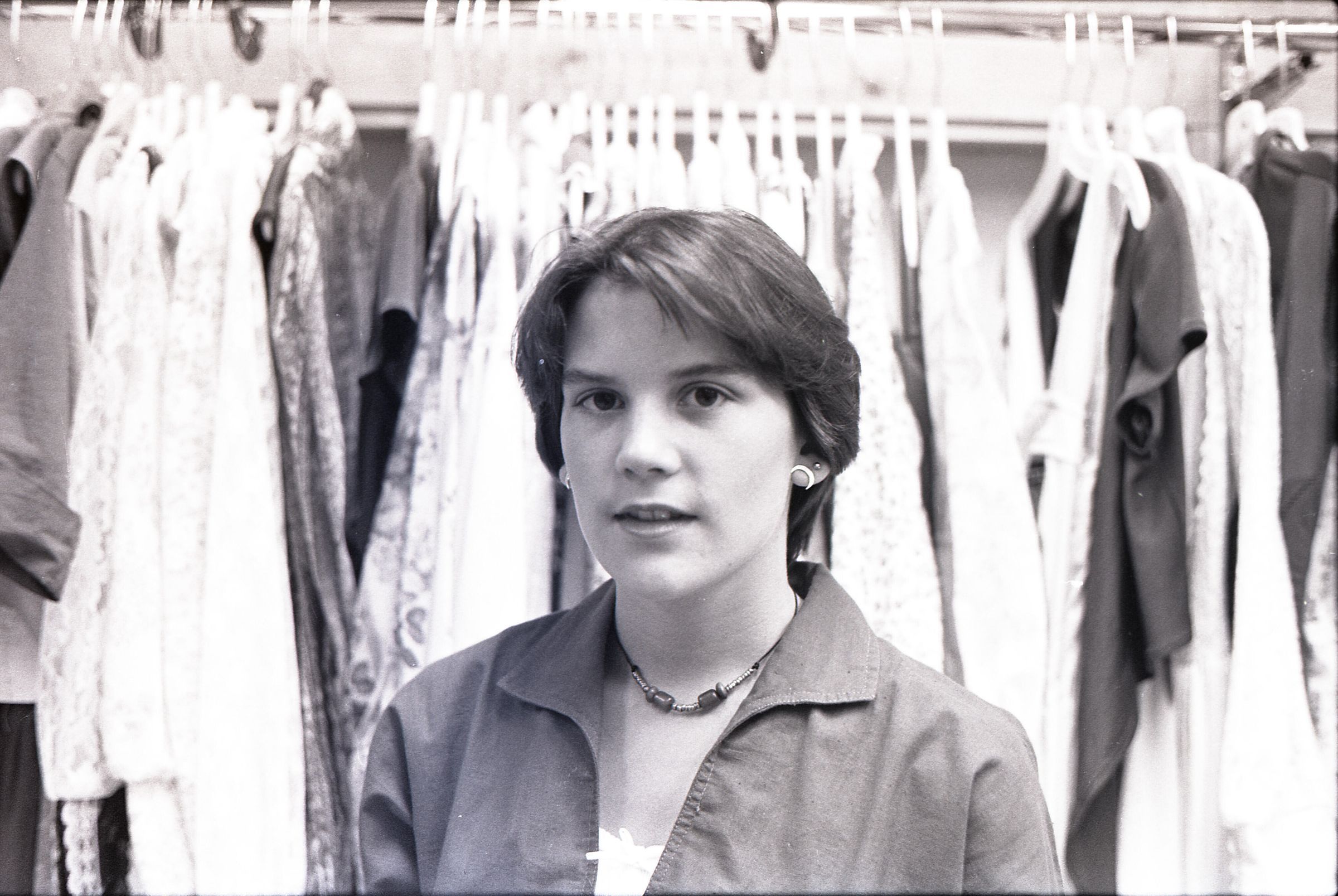 This black and white negative film strip was created for the Lacey Leader newspaper. The images depict a person looking at the camera, standing in front of a rack of clothing on hangers. Each image is minimally different from the others.Made/Created