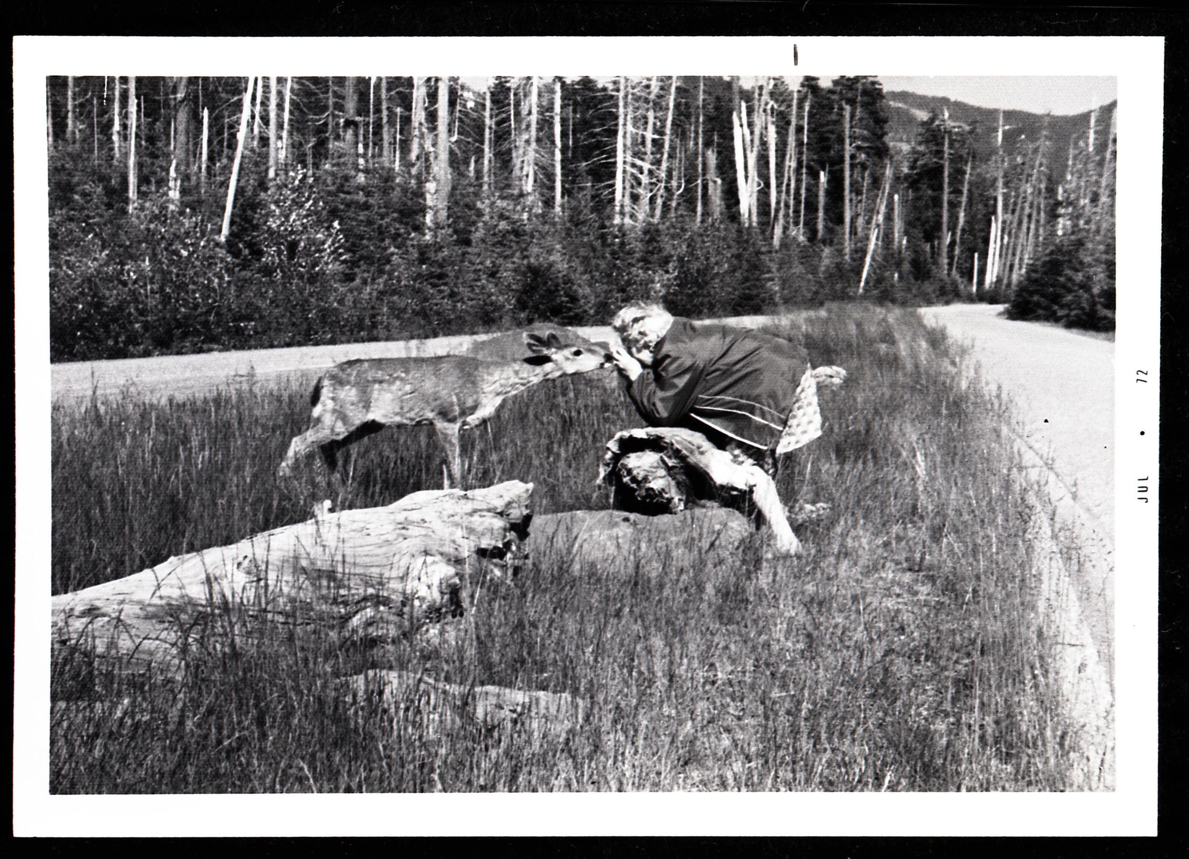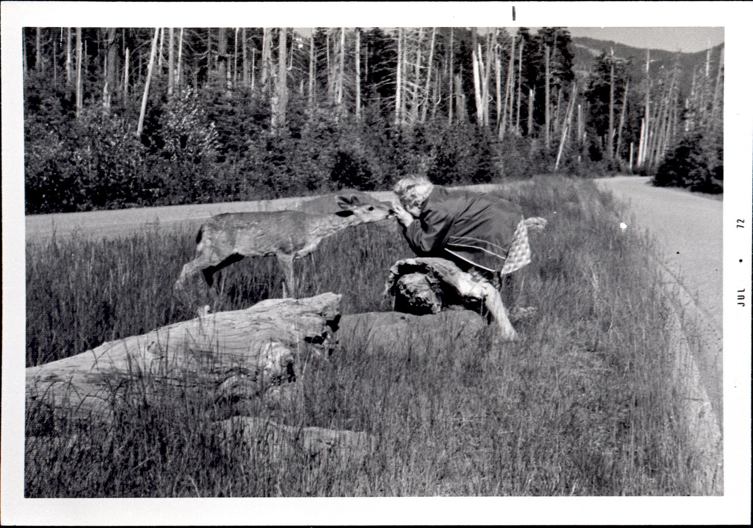 Woman Feeding Deer, unknown date. This black and white negative film strip was created for the Lacey Leader newspaper.Made/Created