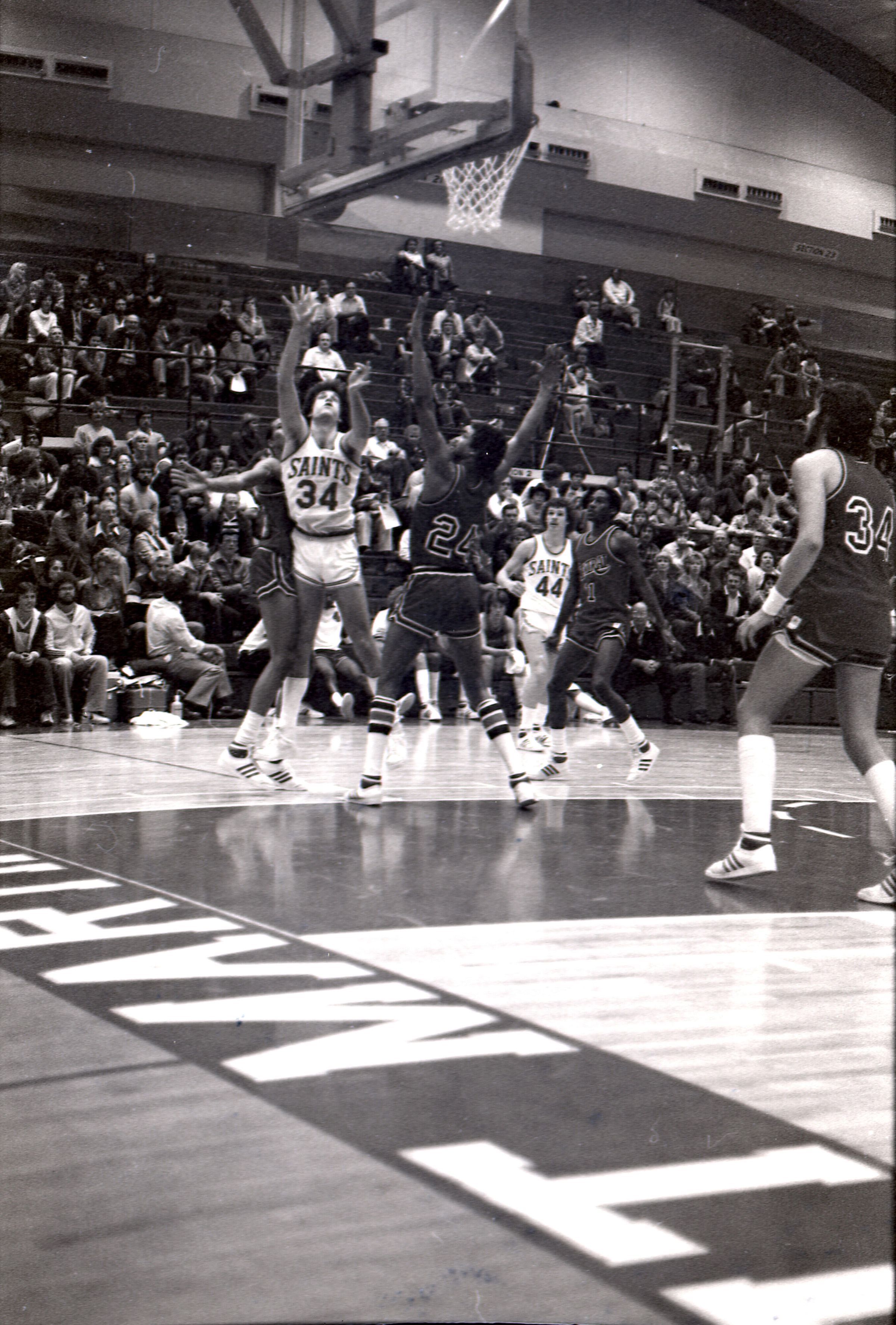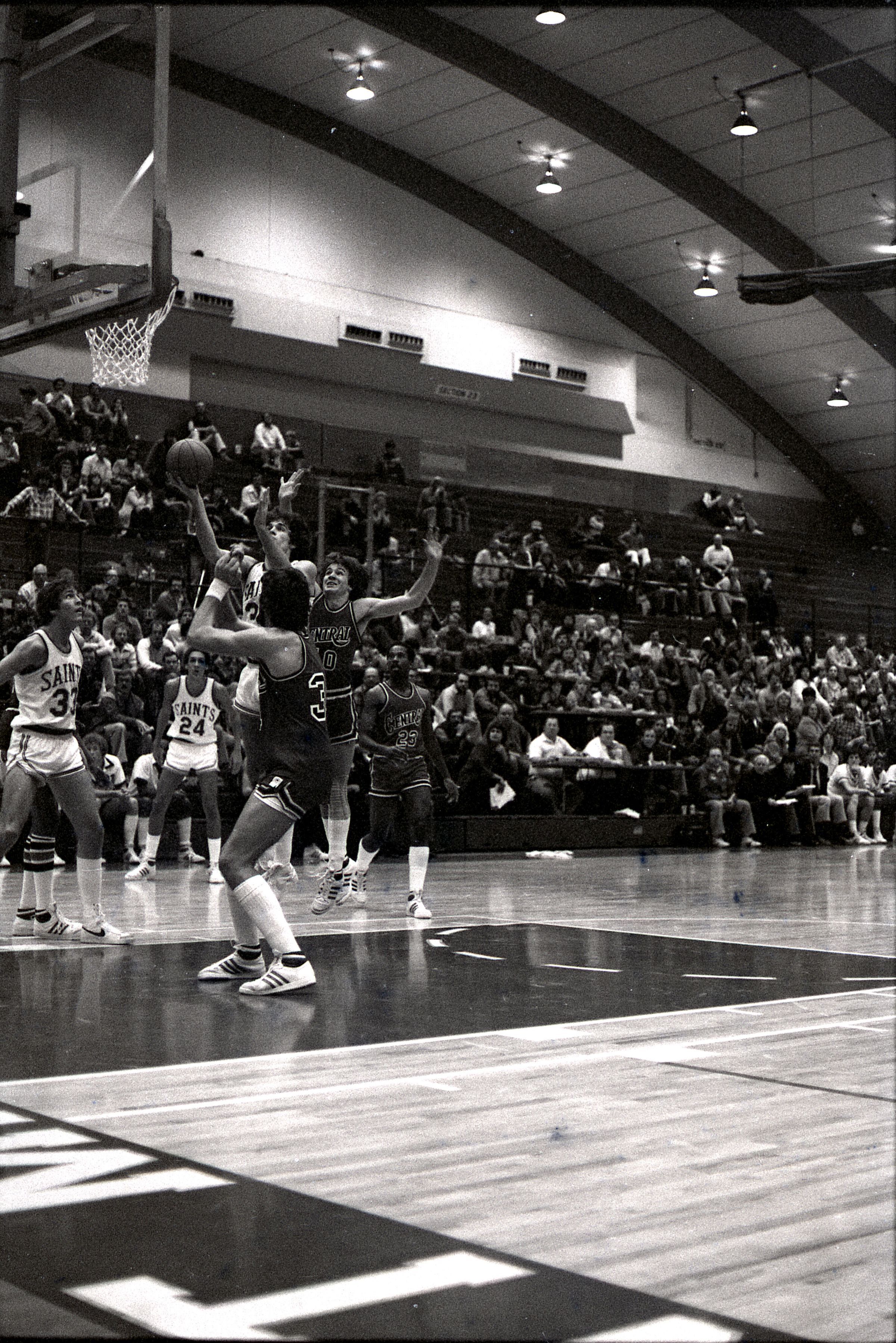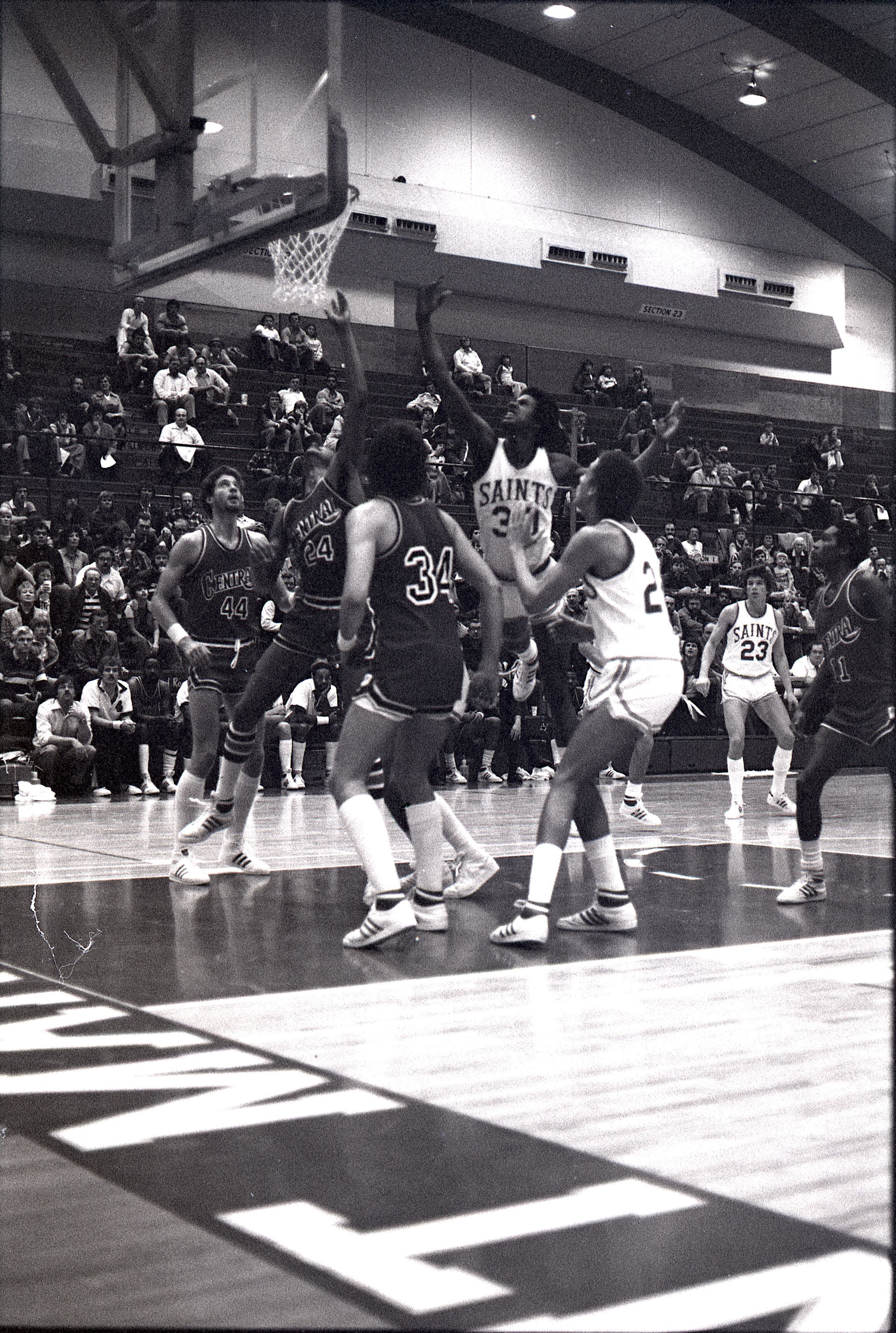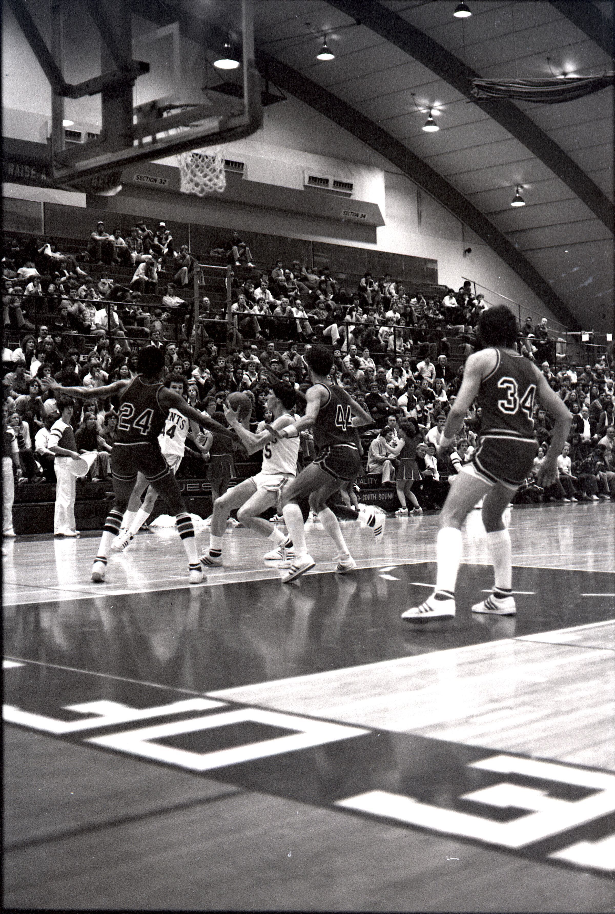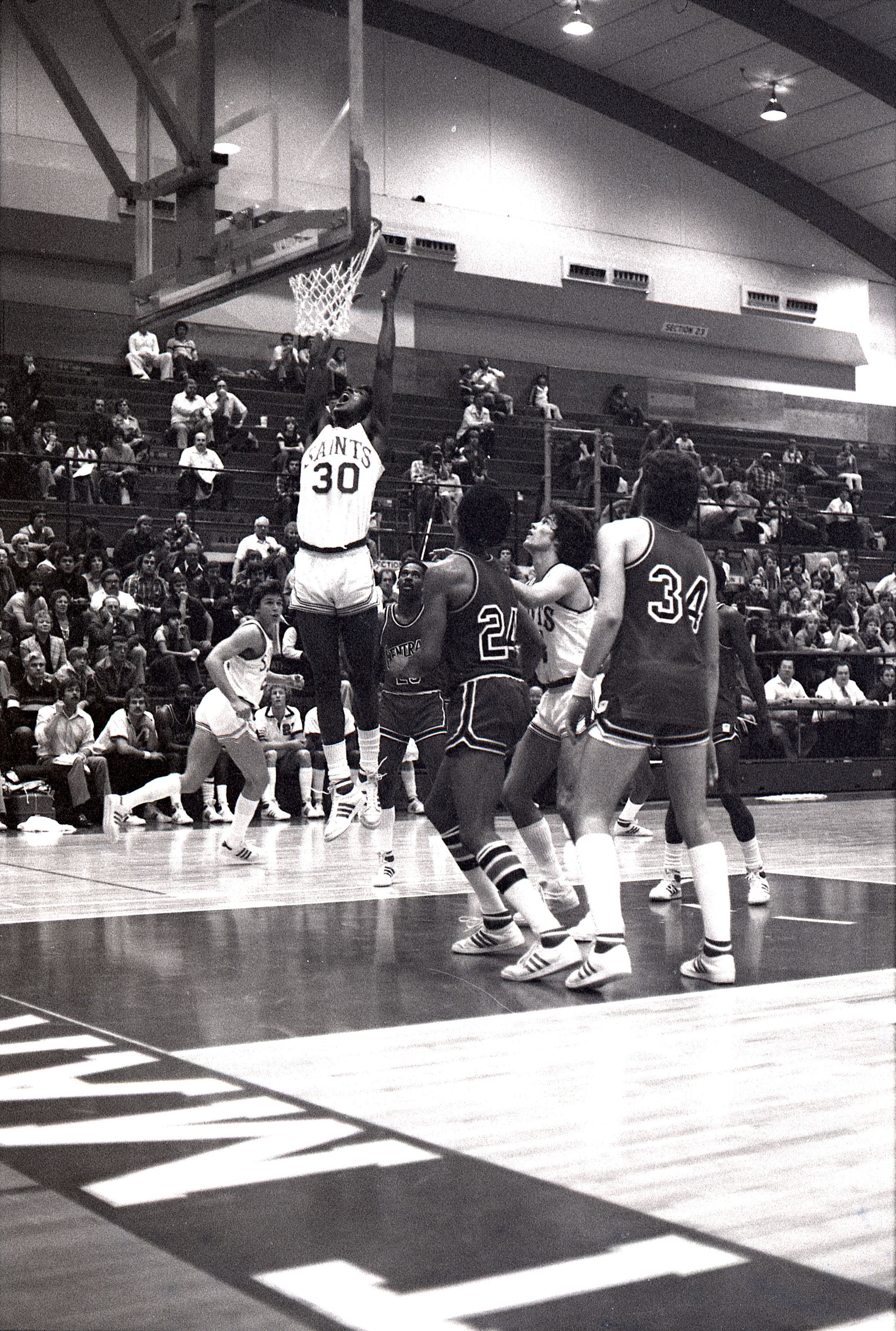 Saint Martin's College Basketball, 1980. These seventeen black and white film negative strips were created for the Lacey Leader newspaper.Made/Created