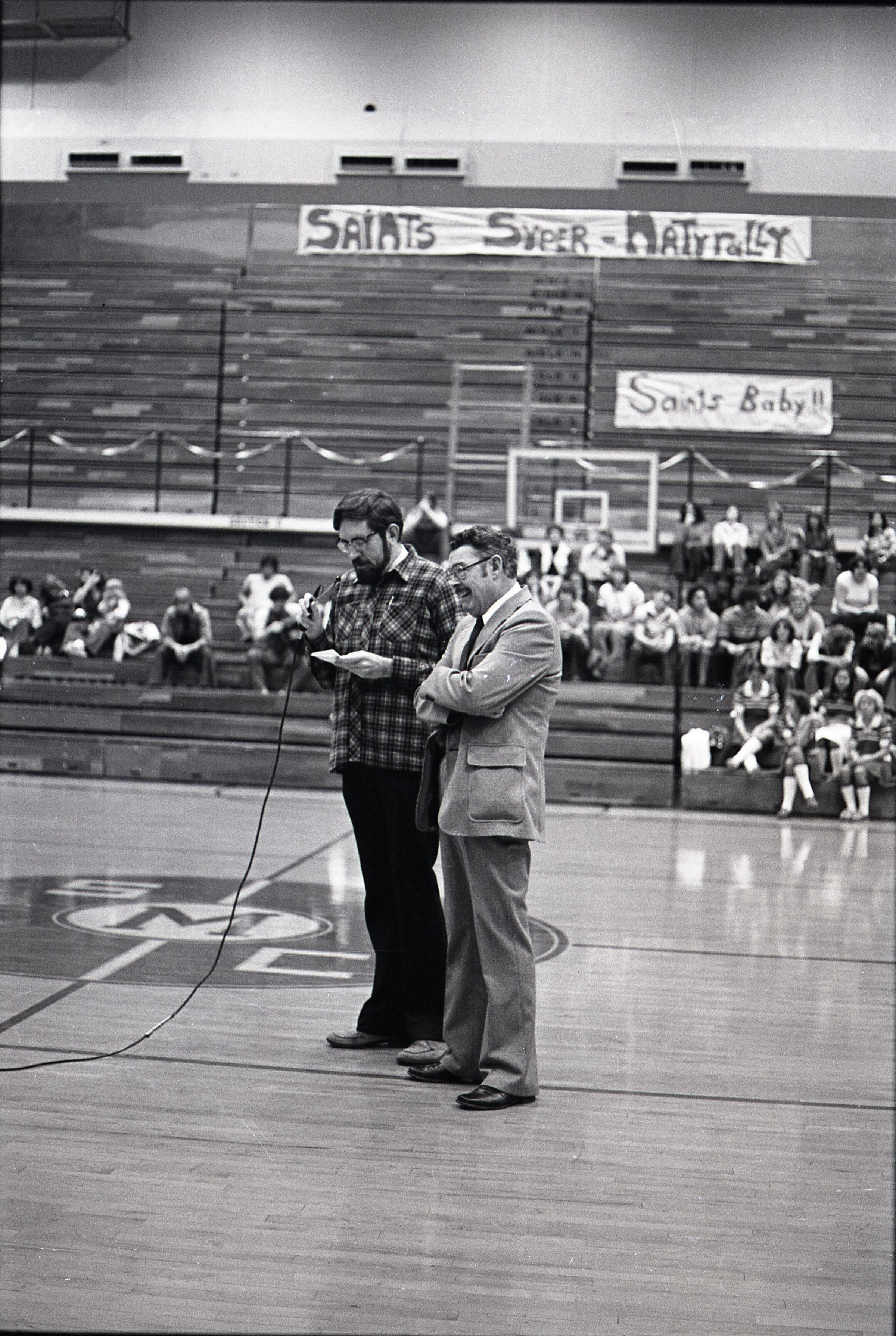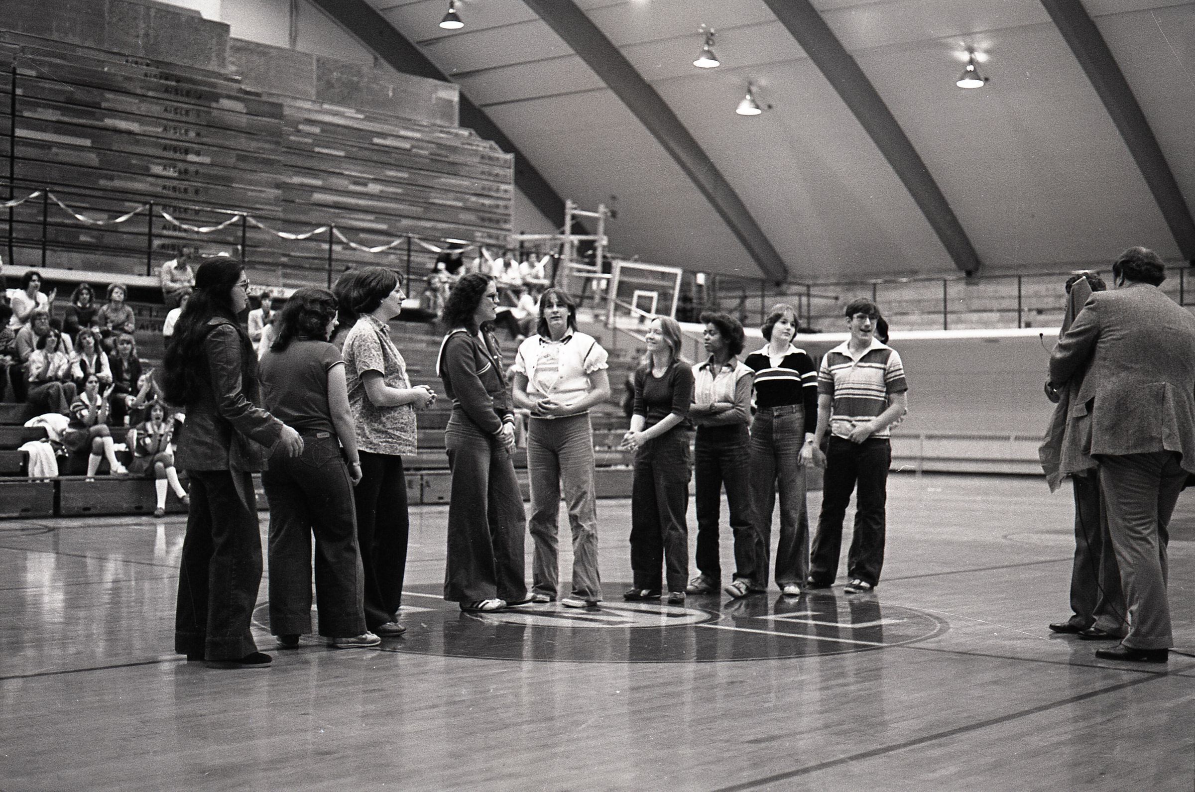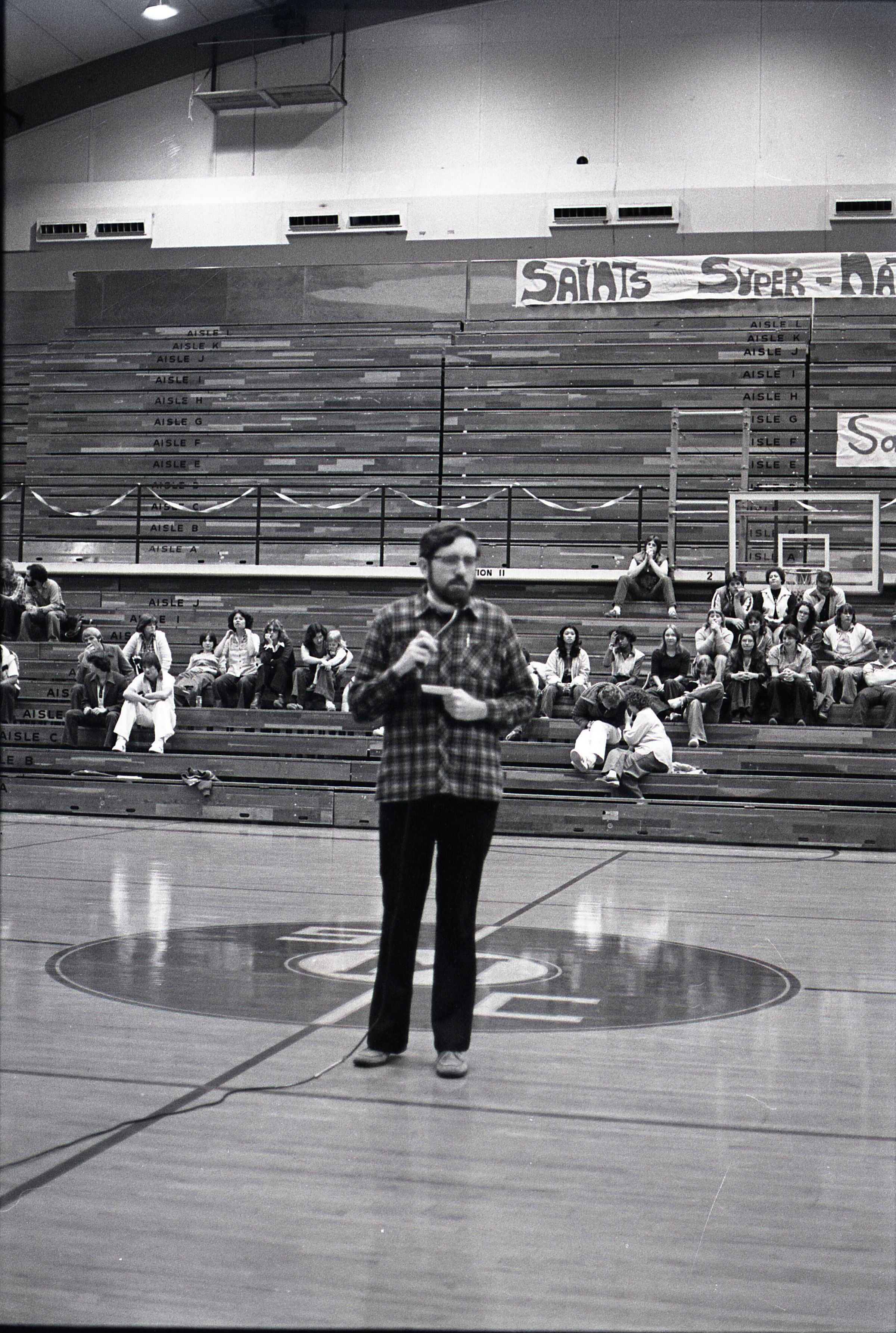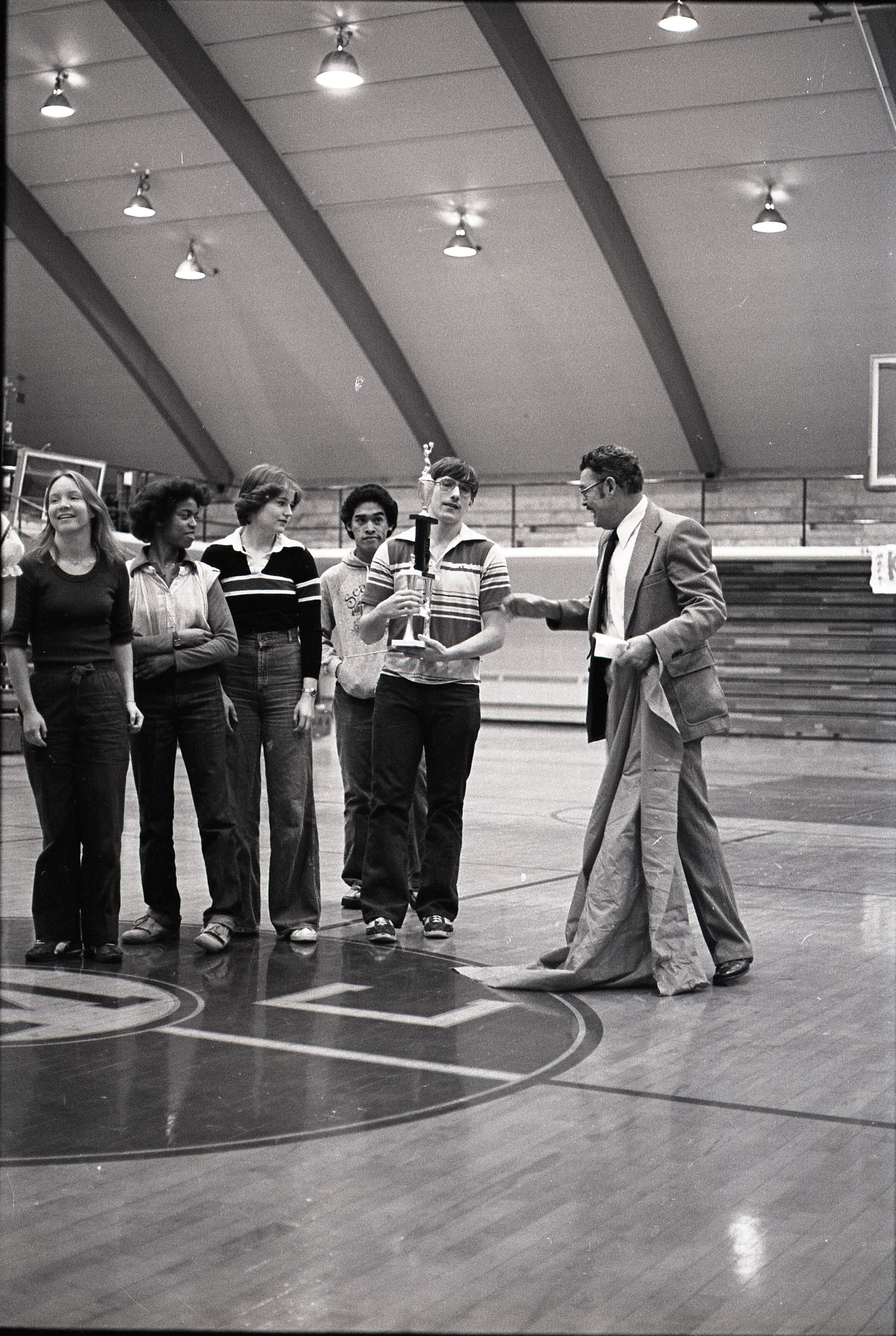 Trophy Presentation, 1979. This single black and white film negative strip was created for the Lacey Leader newspaper. These images show Father John Scott addressing a small crowd of people, and a group of 10-12 young people receiving a trophy. All of these images were captured on the basketball court in the Capital (Marcus) Pavilion on the Saint Martin's campus.Made/Created