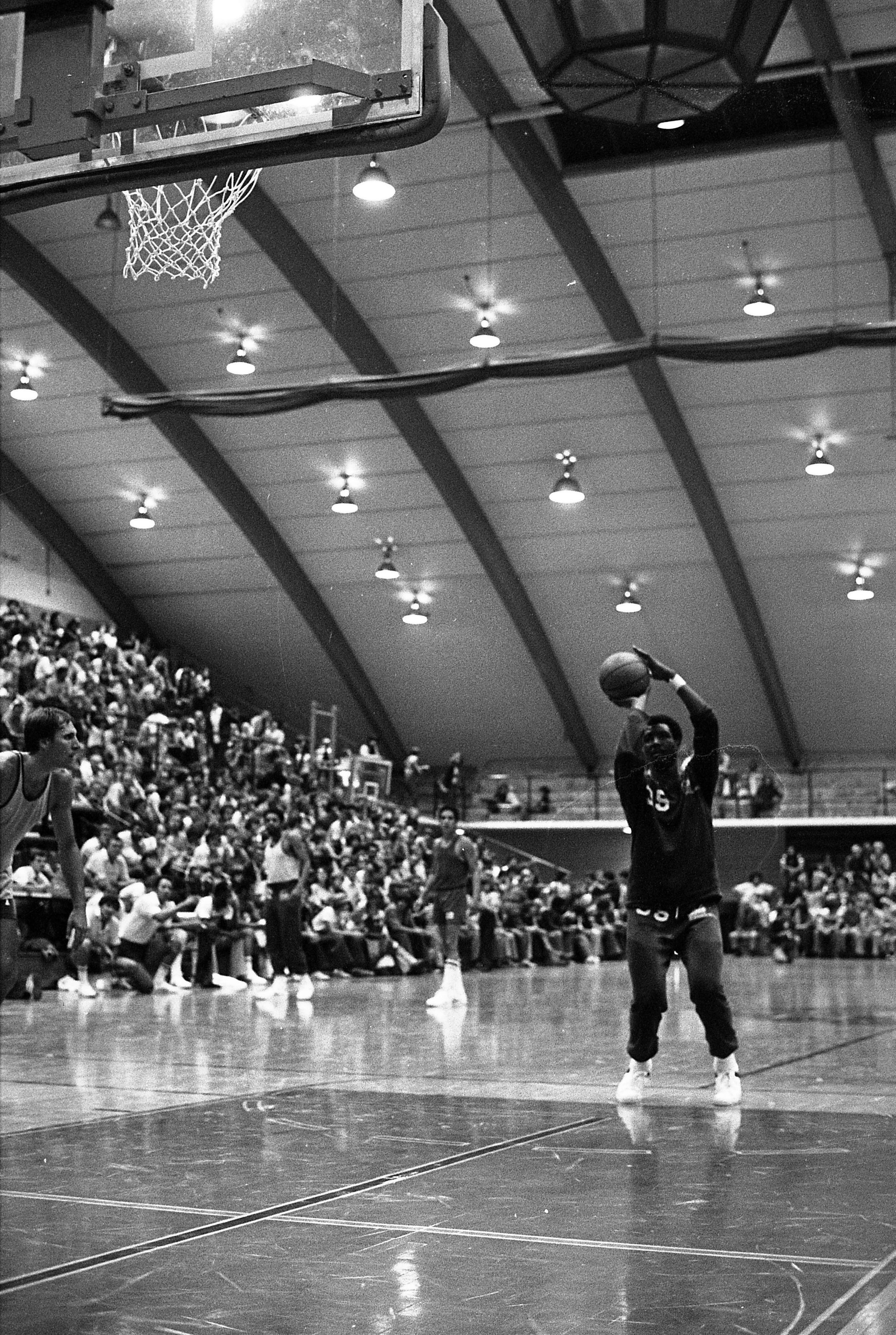 The images in group "a" show what appears to be a men's basketball practice/practice game taking place in the Capital (Marcus) Pavilion on the Saint Martin's campus. The men practicing are likely members of the Seattle Supersonics.