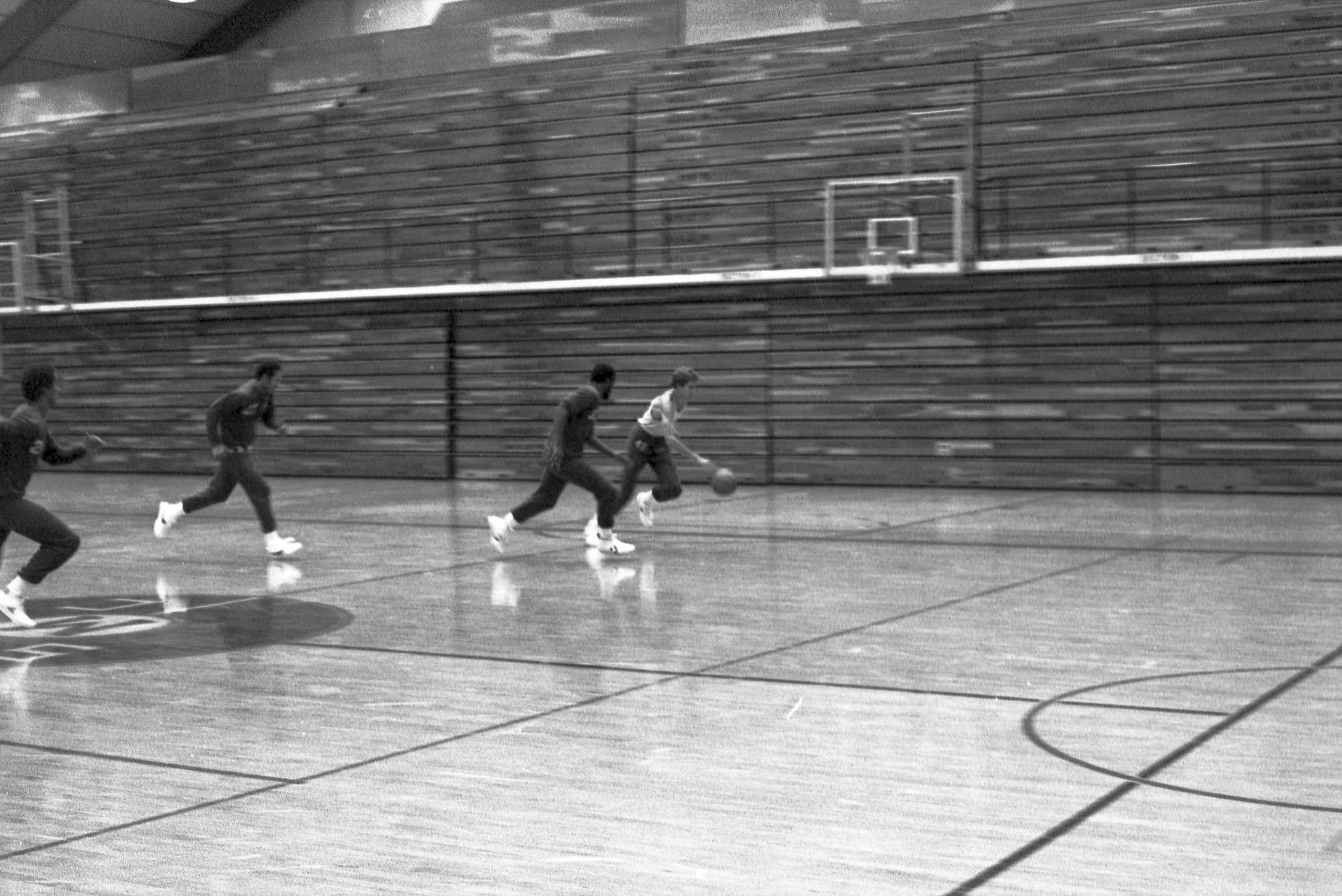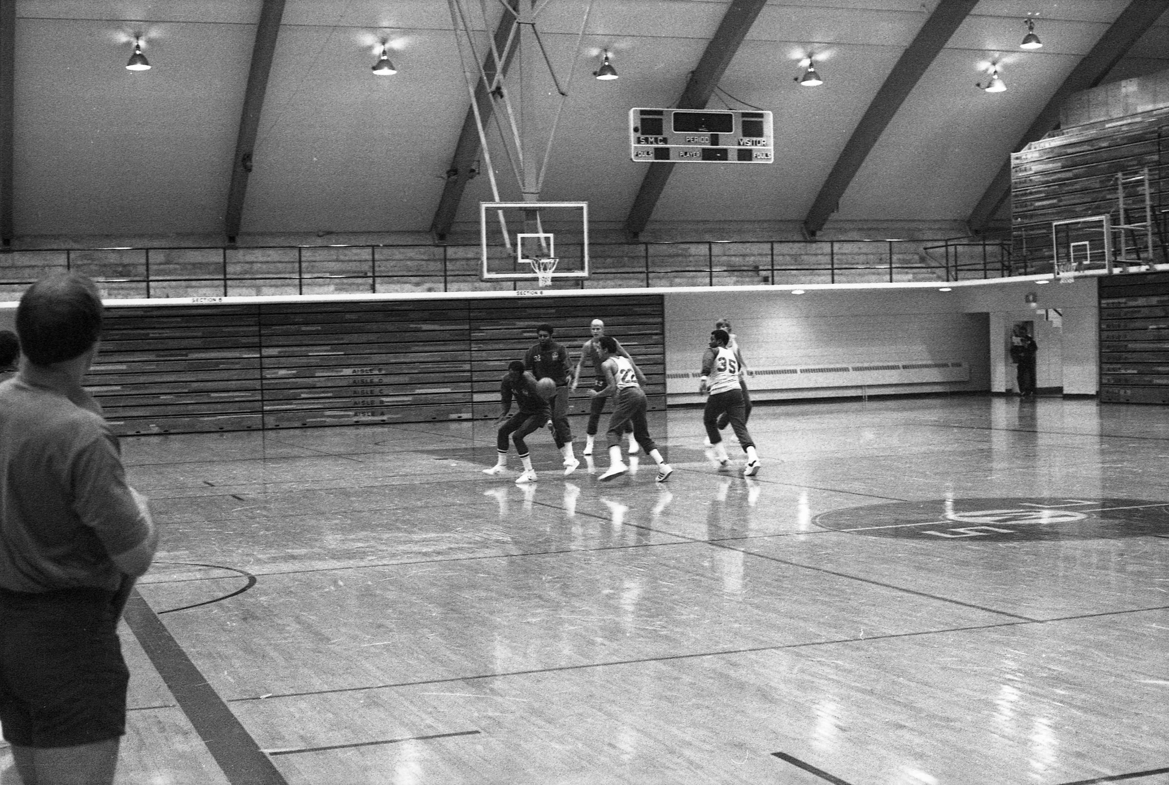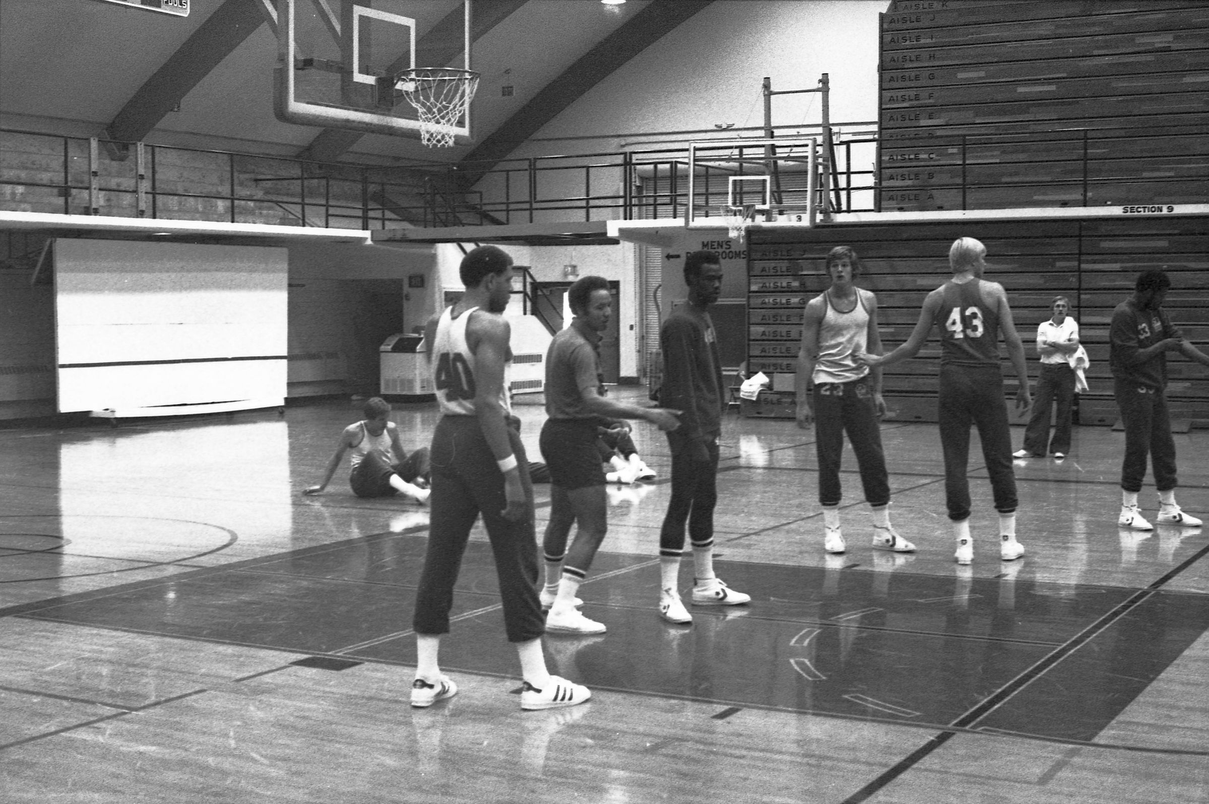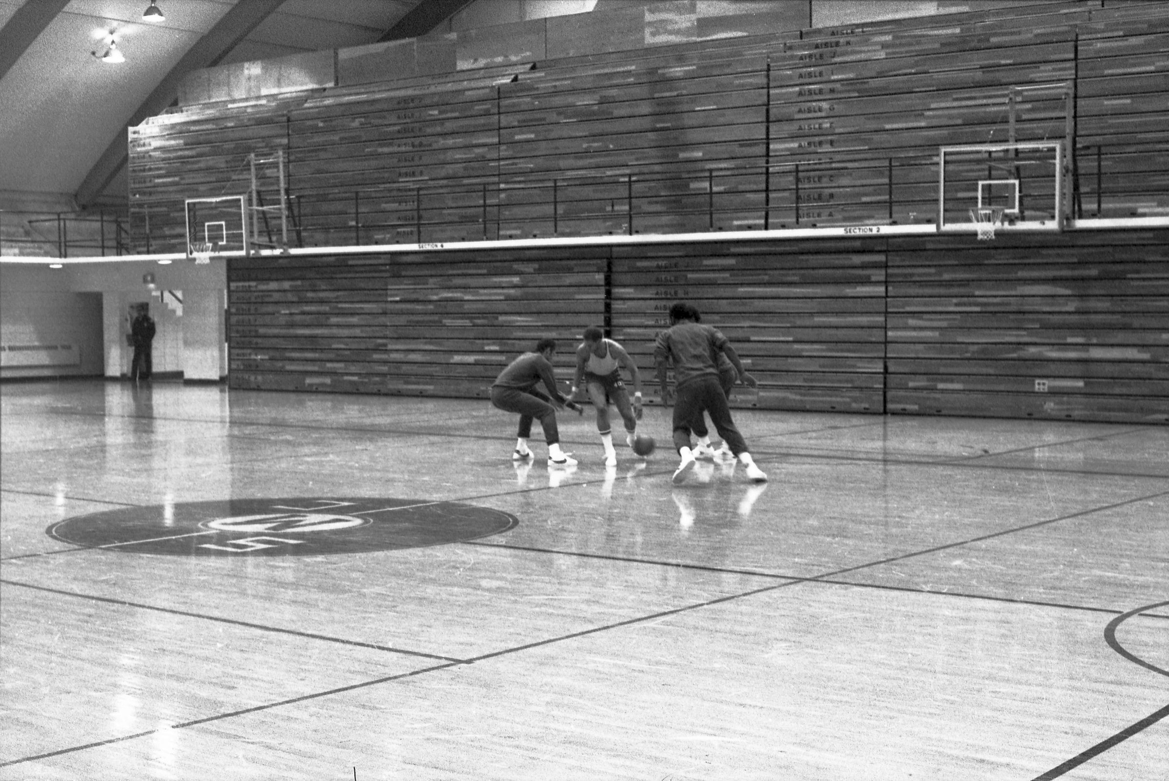 The images in group "a" show members of the Seattle Supersonics practicing at the Capital Pavilion on the Saint Martin's campus.