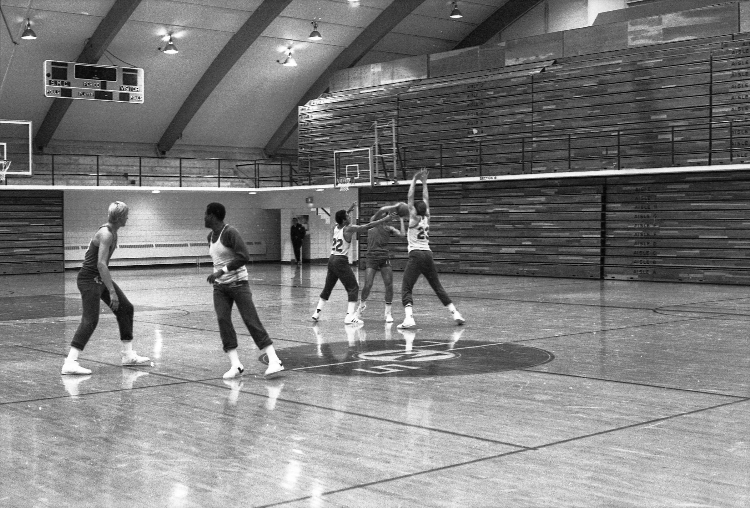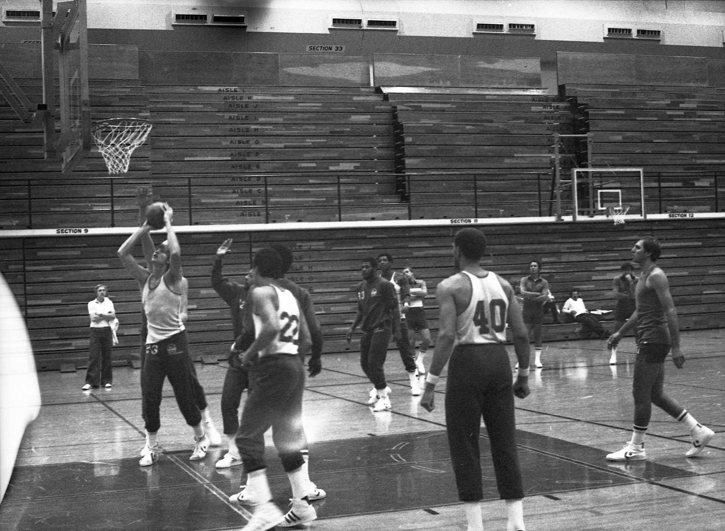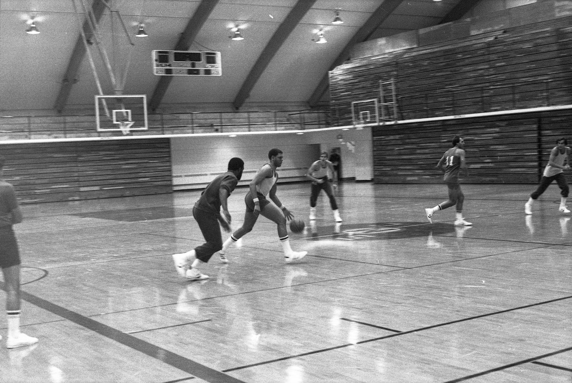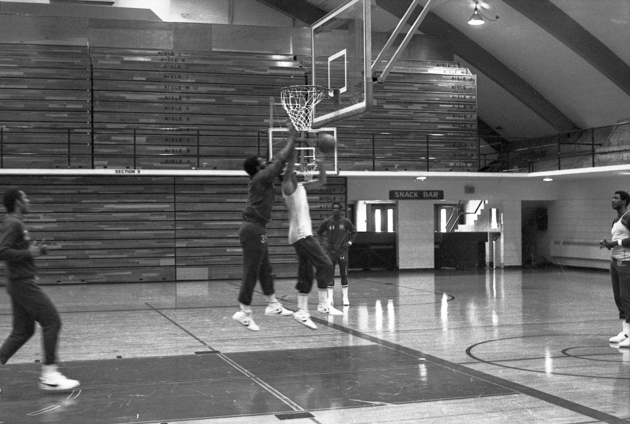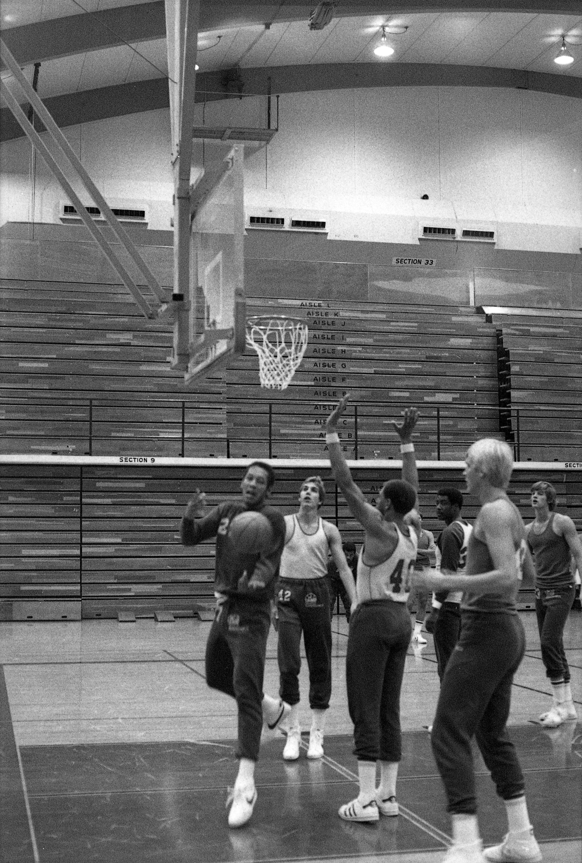The images in group "a" show members of the Seattle Supersonics practicing at the Capital Pavilion on the Saint Martin's campus.