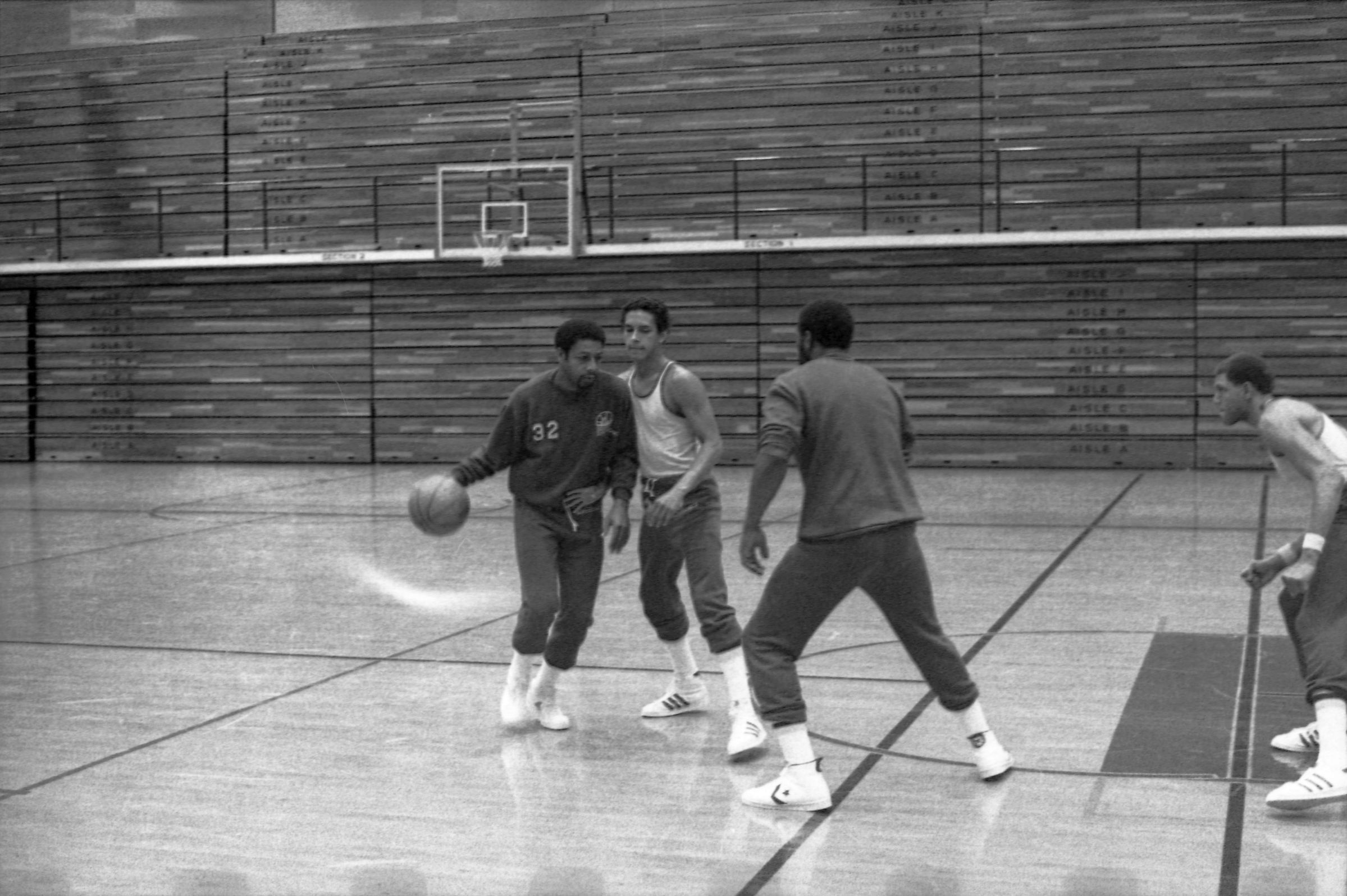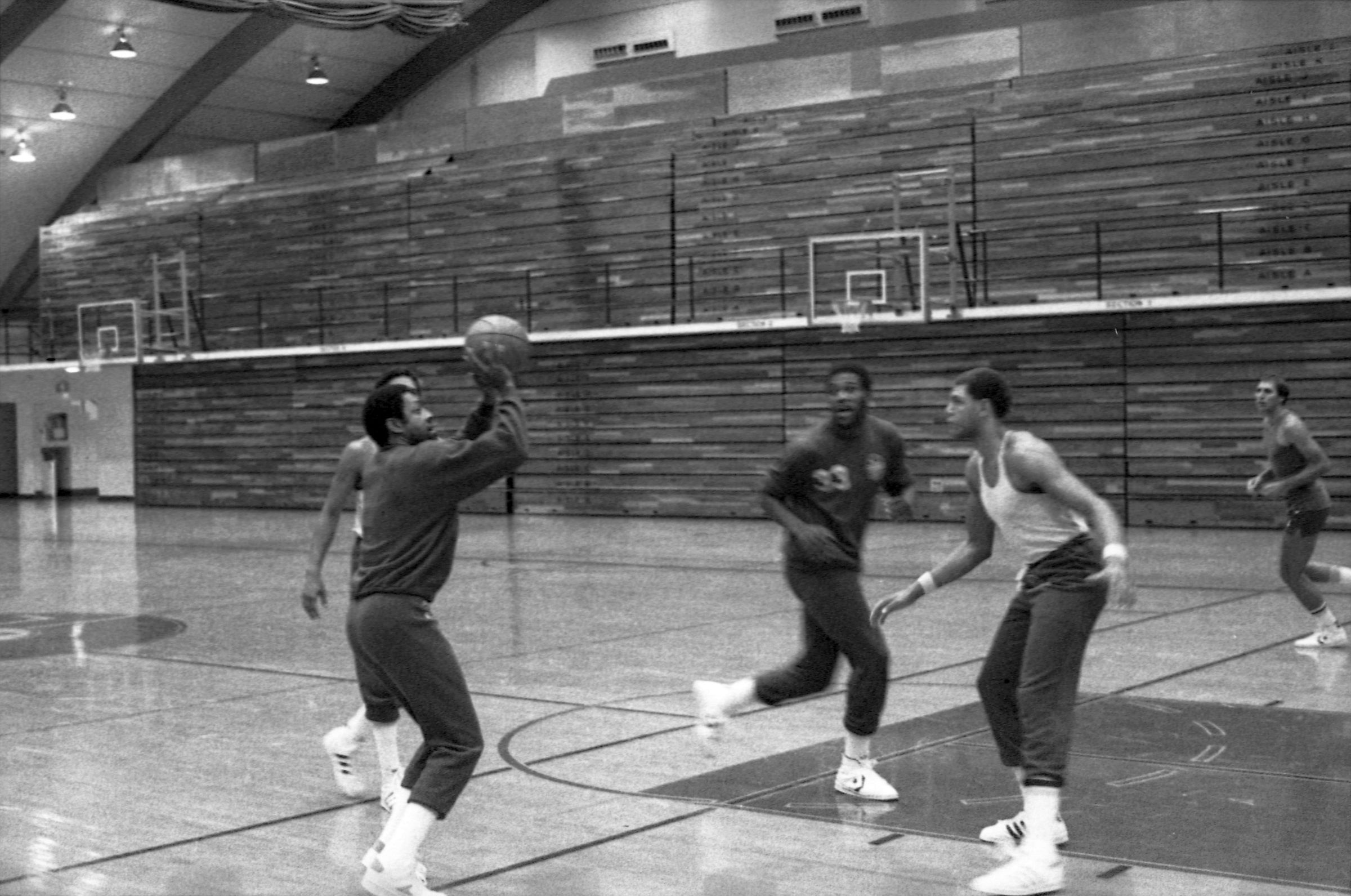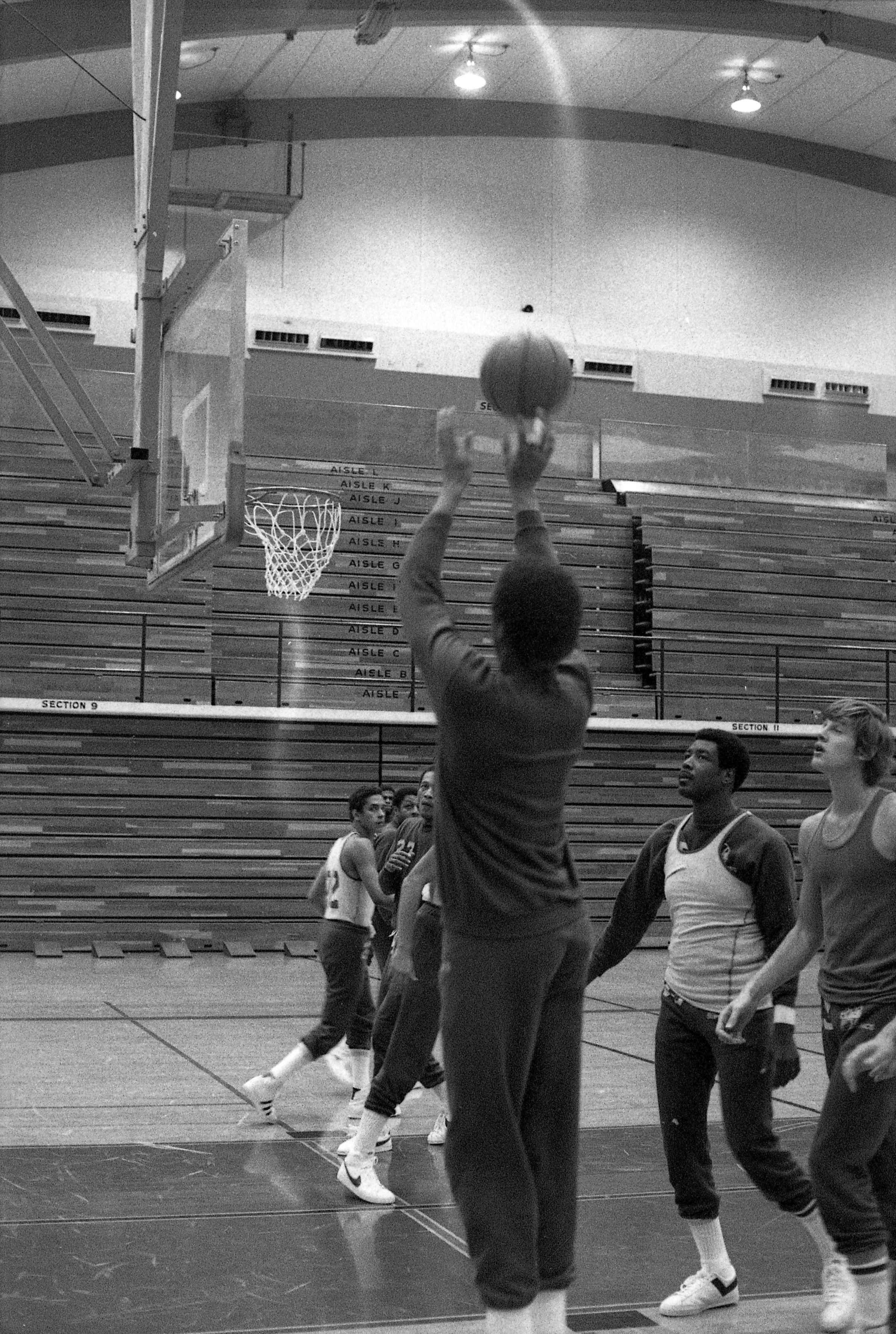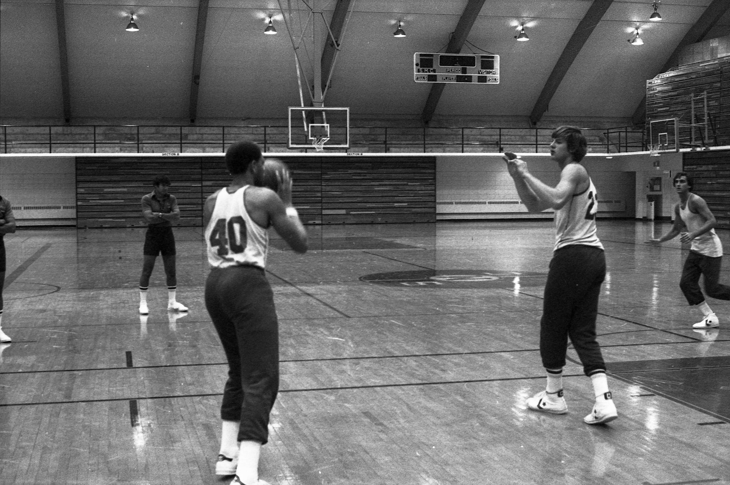 The images in group "a" show members of the Seattle Supersonics practicing at the Capital Pavilion on the Saint Martin's campus.