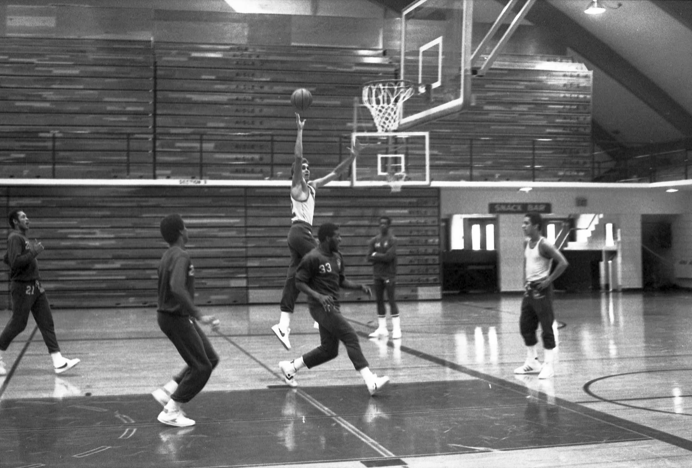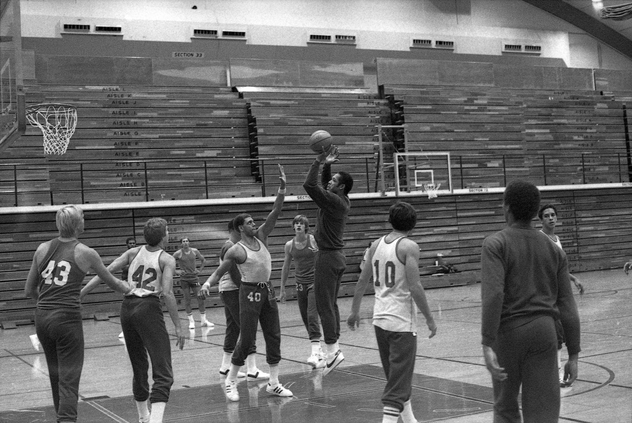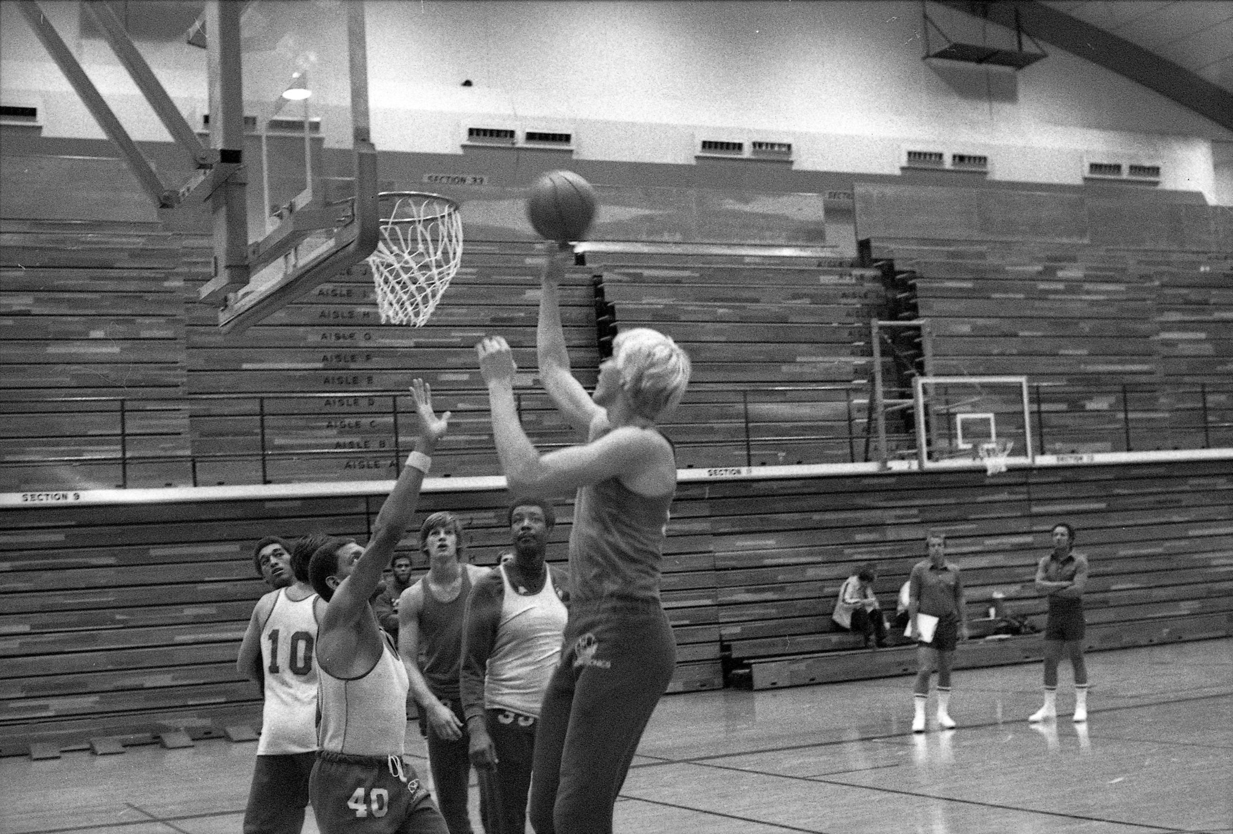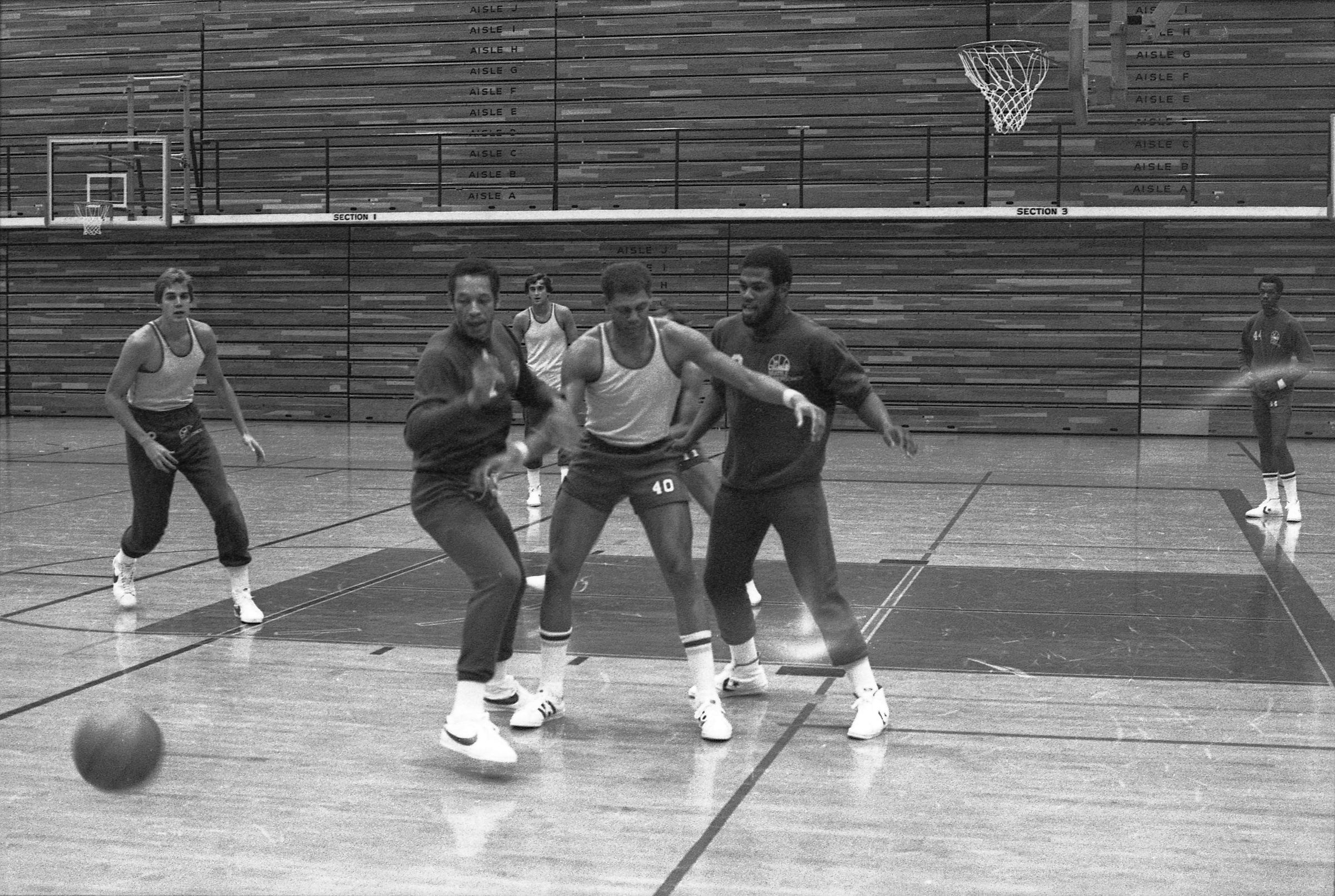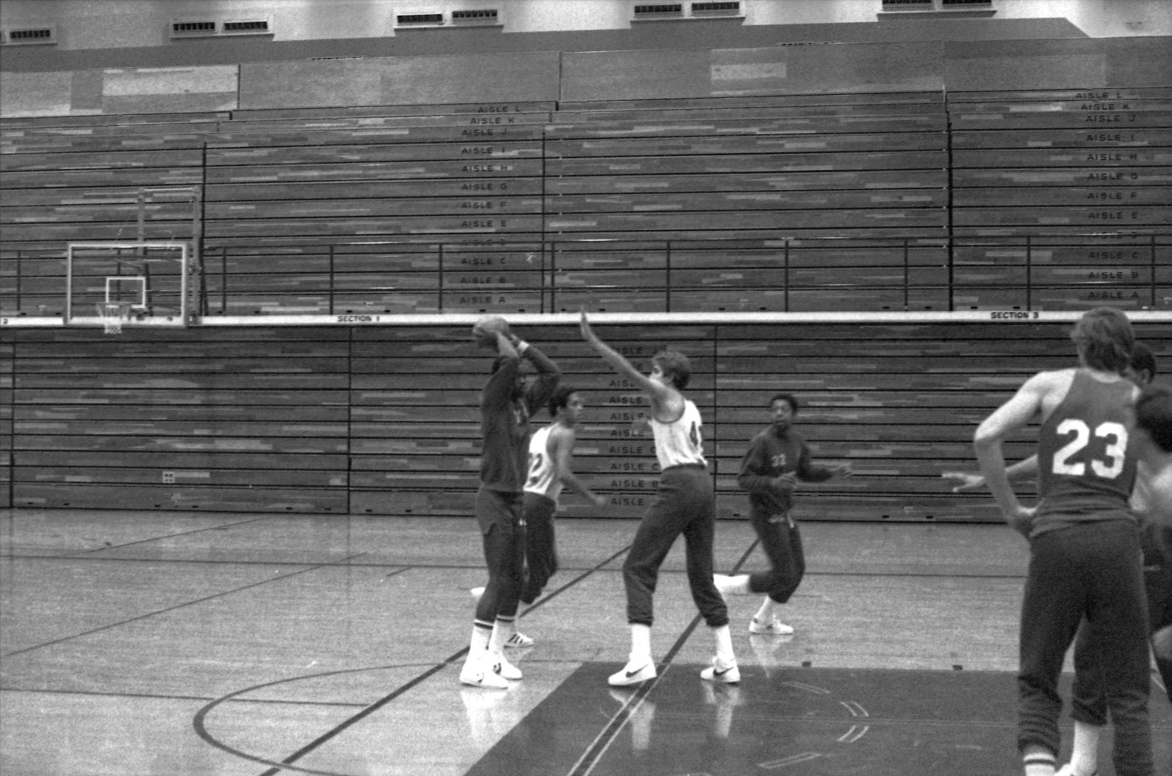 The images in group "a" show members of the Seattle Supersonics practicing at the Capital Pavilion on the Saint Martin's campus.