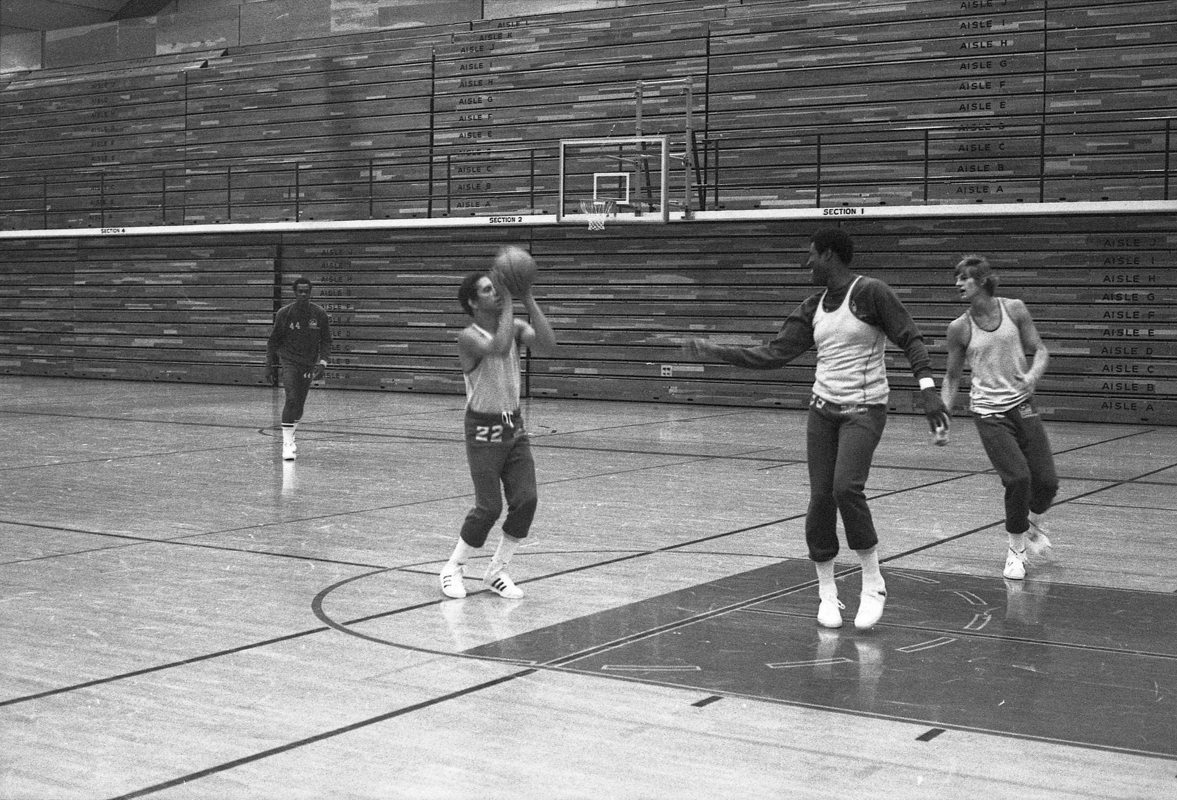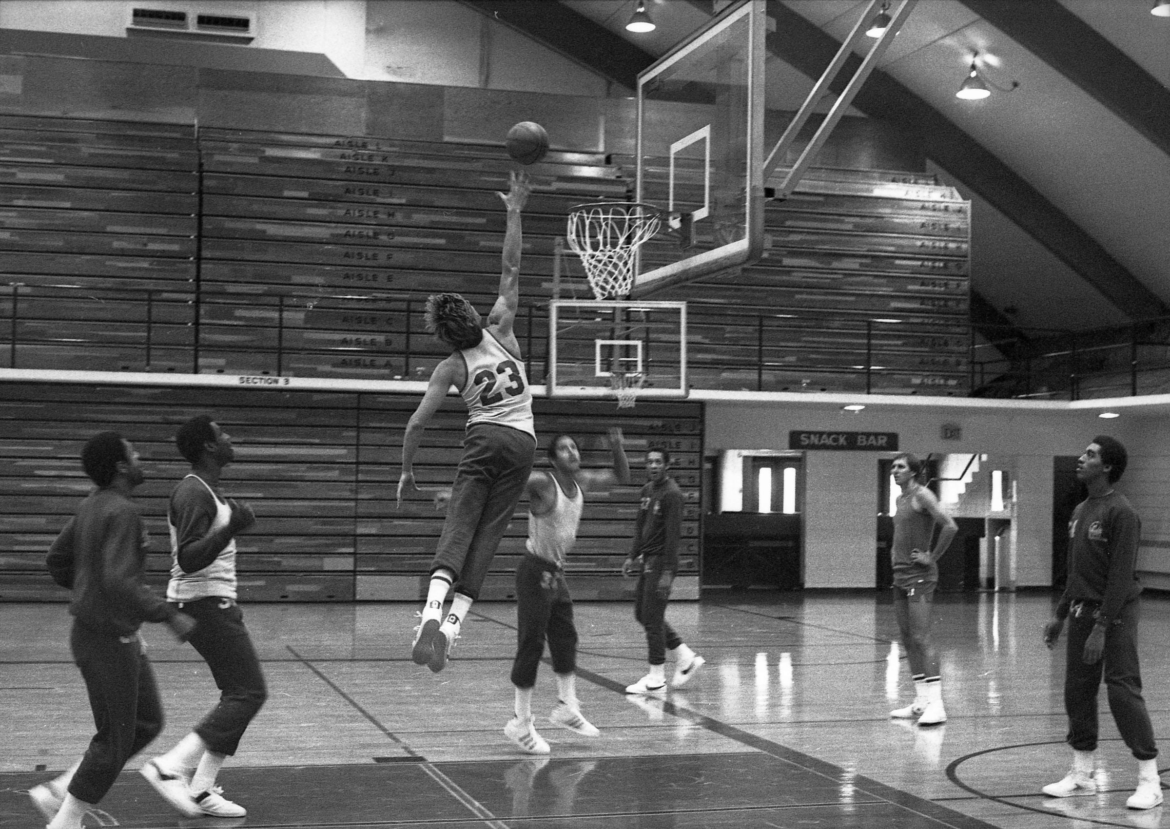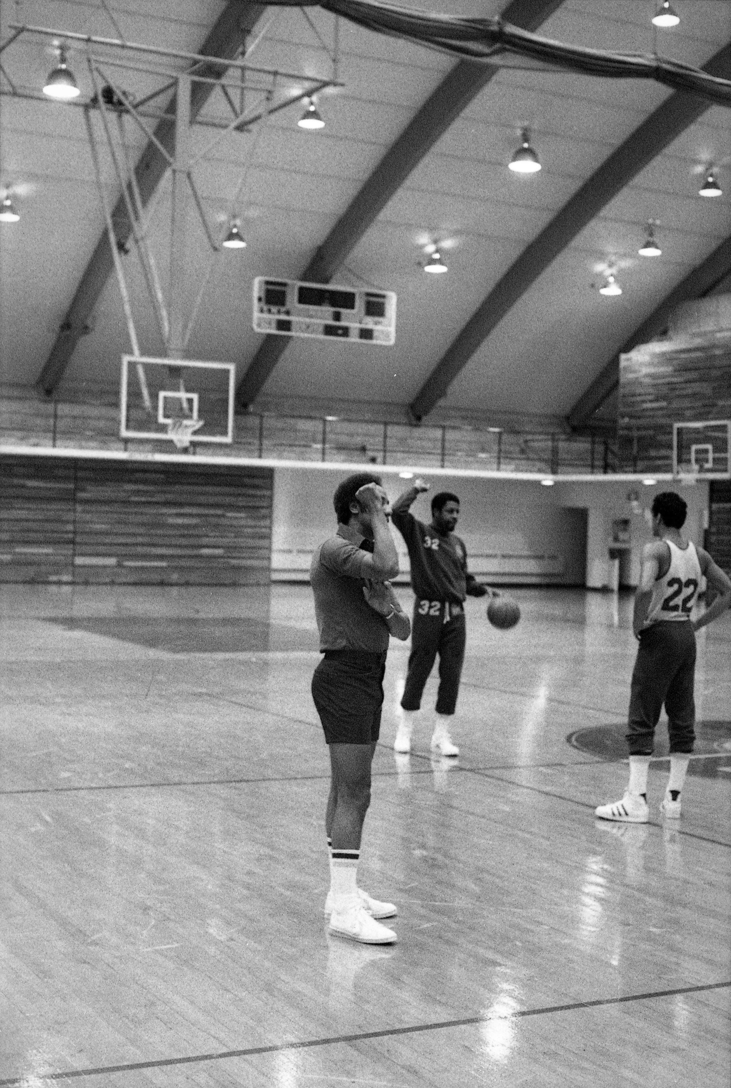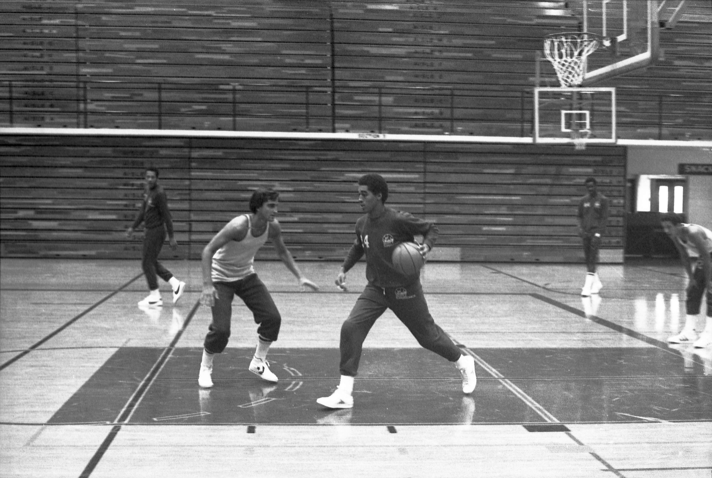 The images in group "a" show members of the Seattle Supersonics practicing at the Capital Pavilion on the Saint Martin's campus.