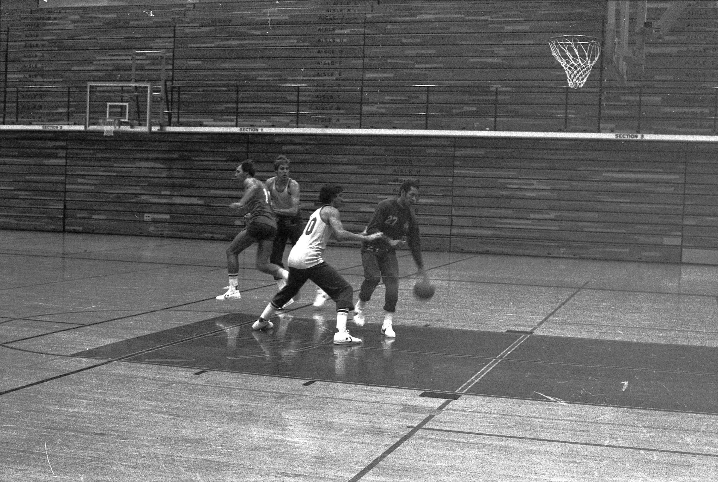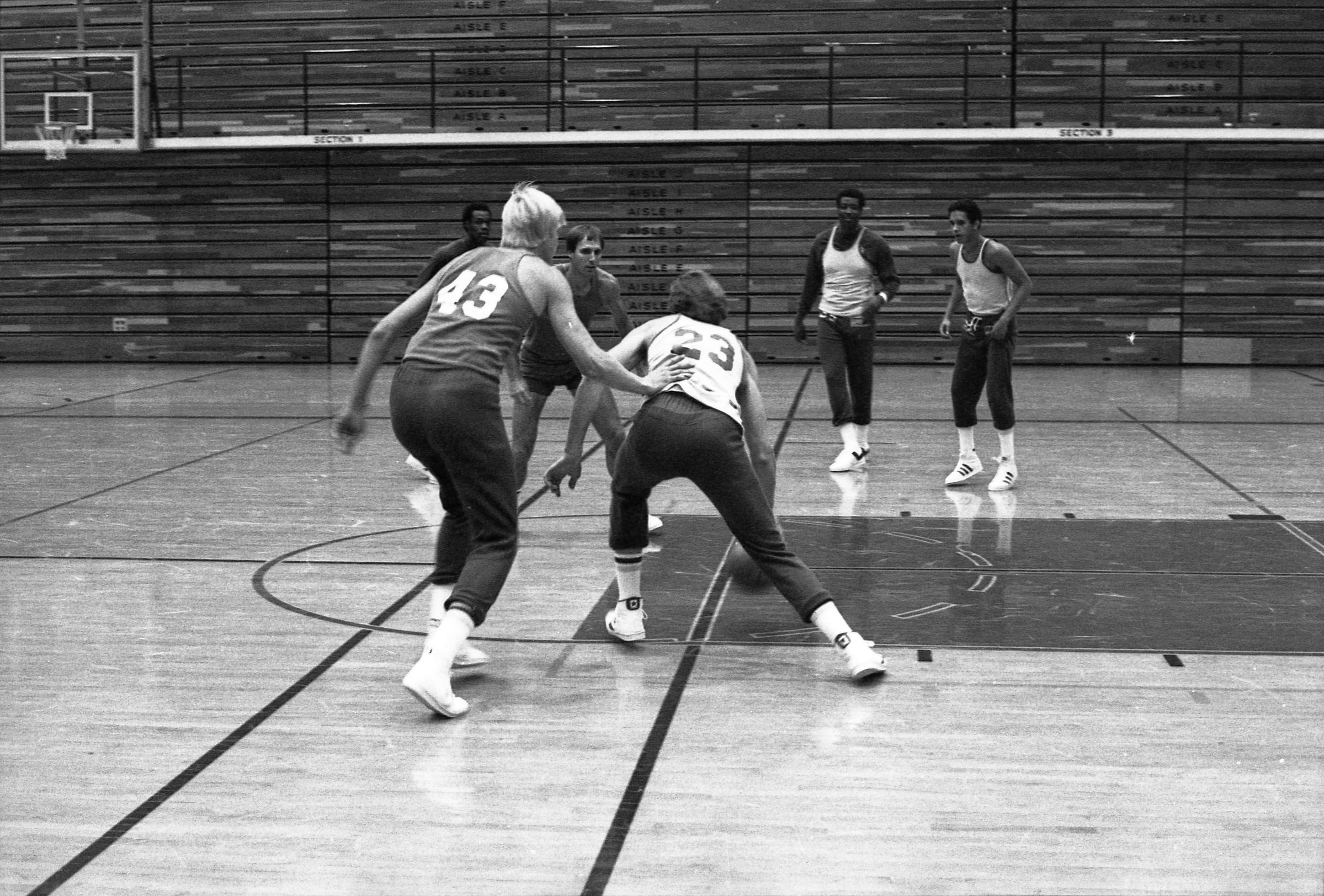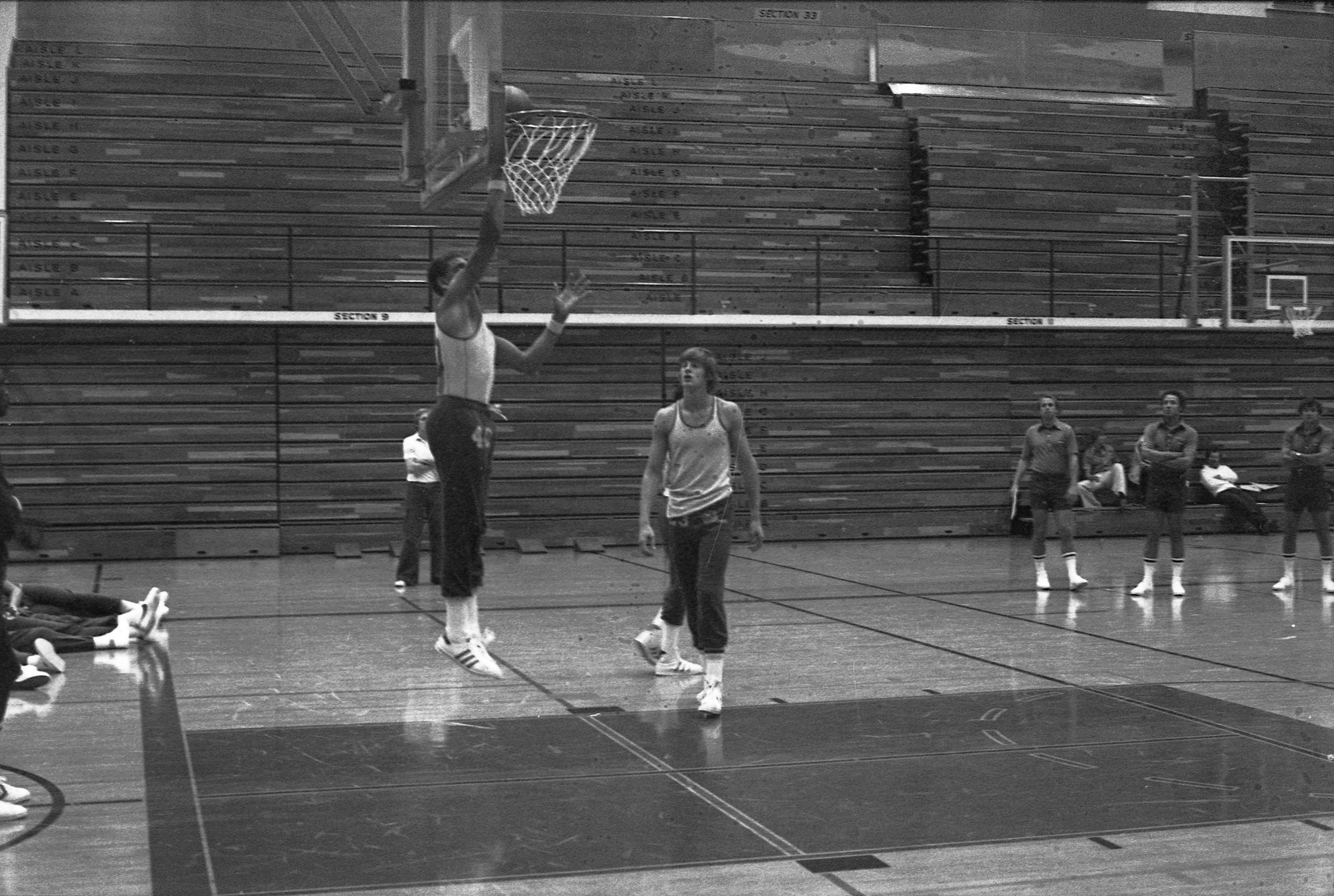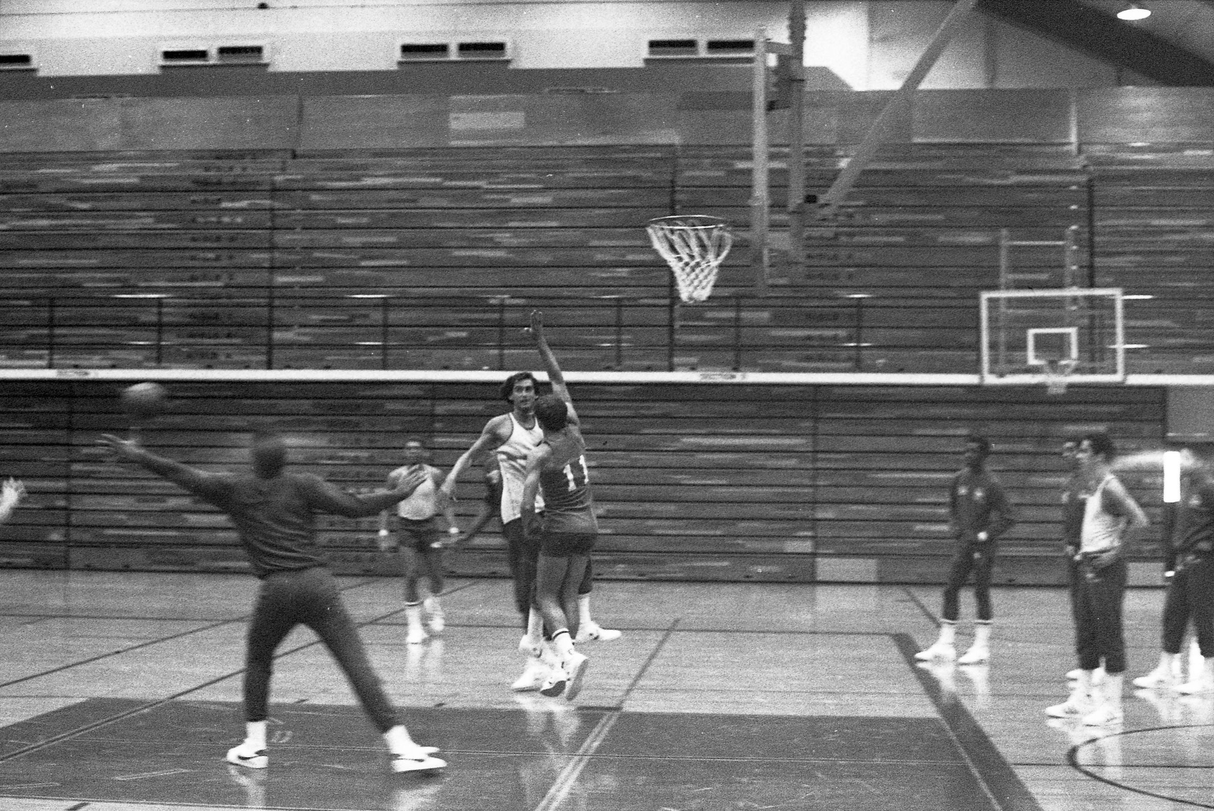 Seattle Supersonics at Capital Pavilion, Unknown Date. These seven black and white film negative strips were created for the Lacey Leader newspaper. These images were created using two separate film rolls, so some of the physical numbers on the strips are repeated. For the purposes of this description, these strips will be grouped according to the film roll from which they originally came. Each group will be assigned a lower-case letter to go along with the physical numbers on the strips (ex: 1a, 2a, 3a, 1b, 2b, 3b, etc.) to help differentiate between images.
