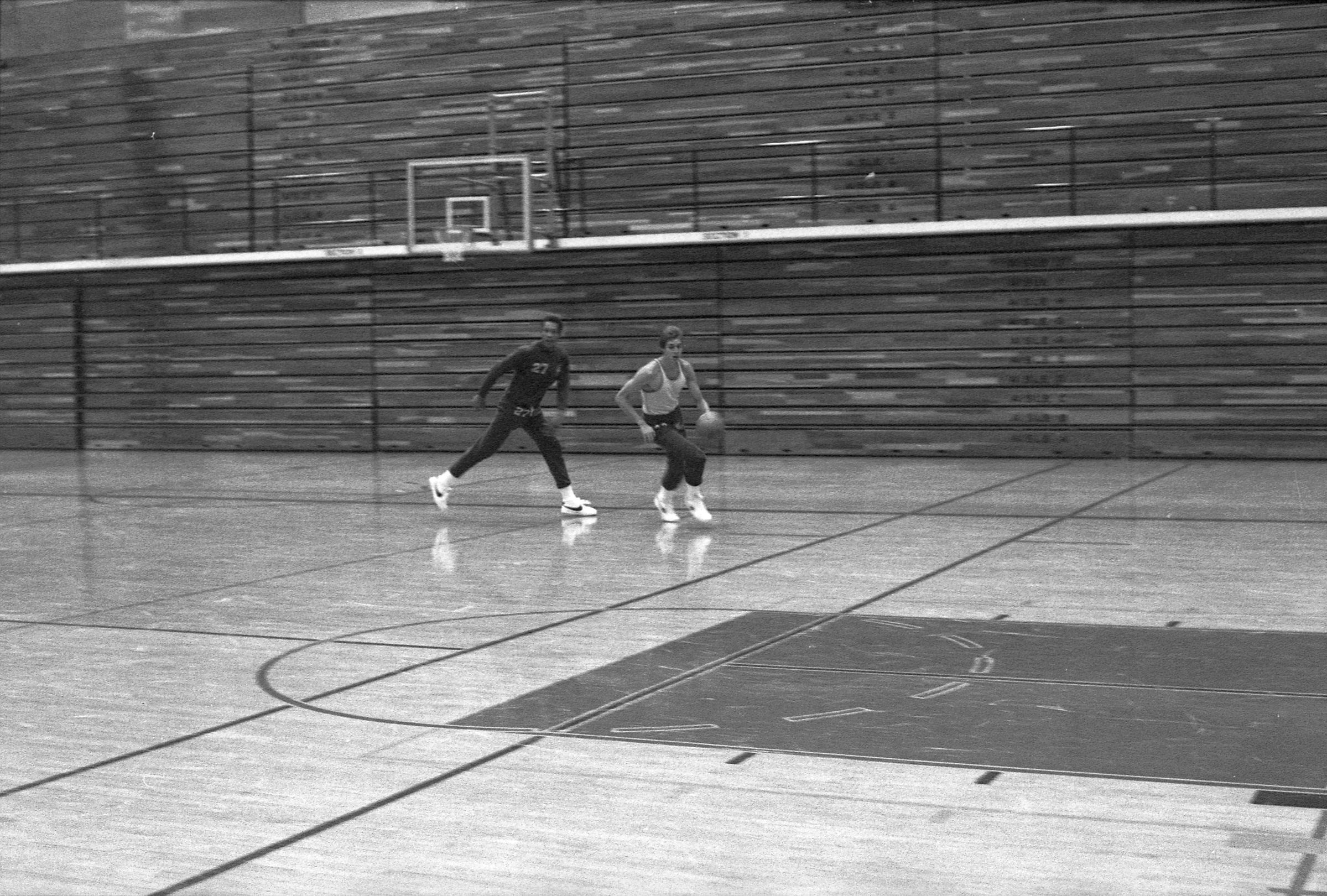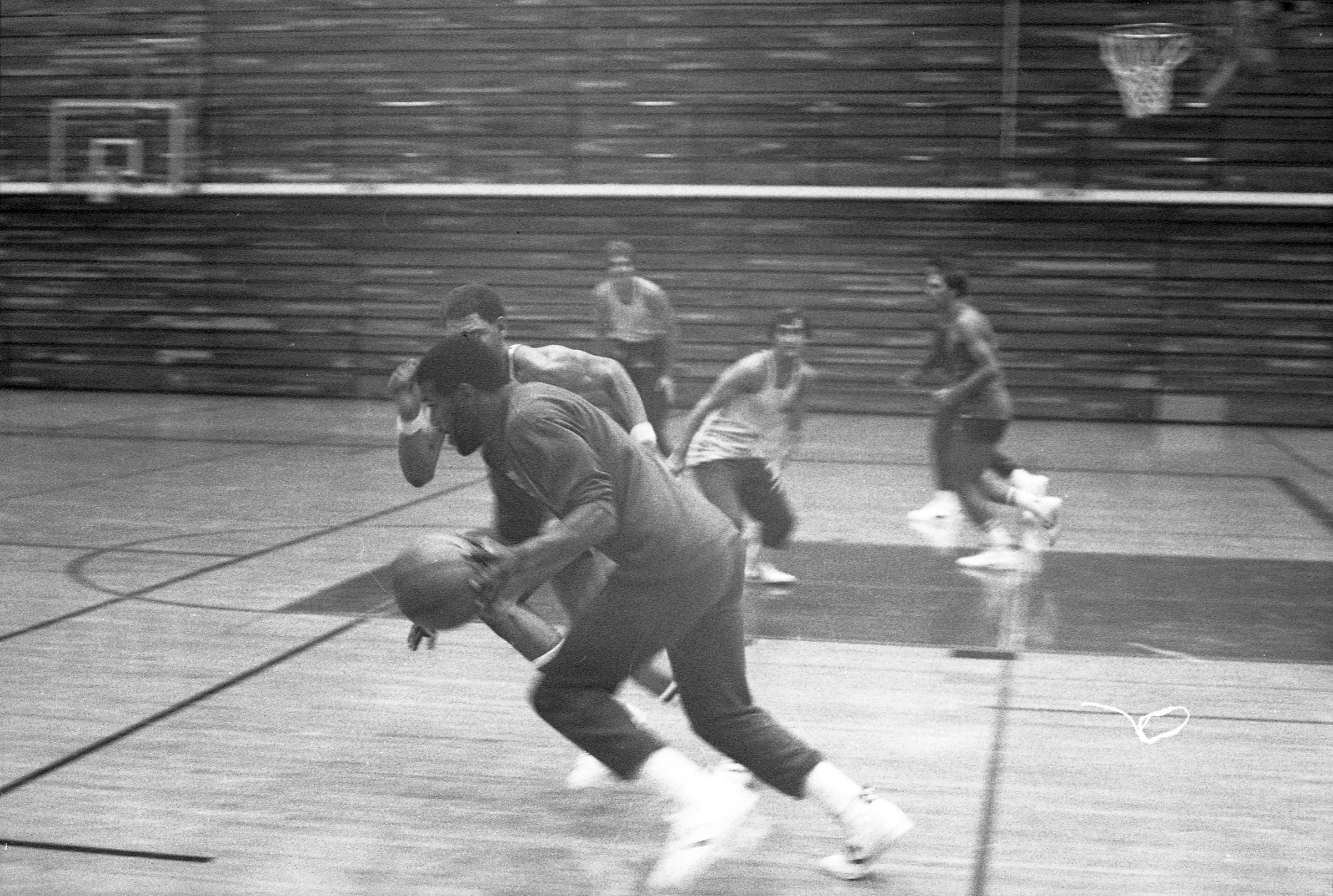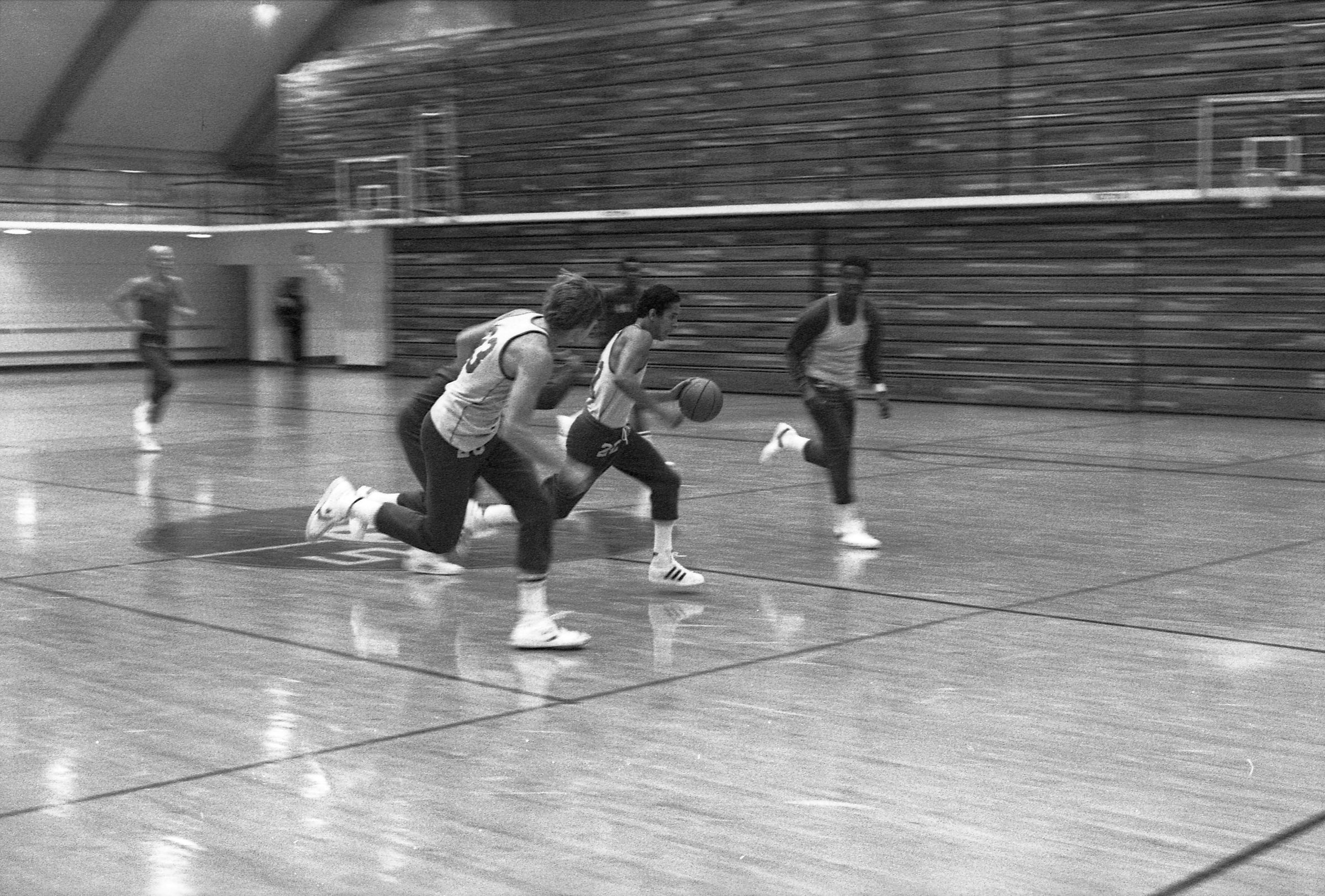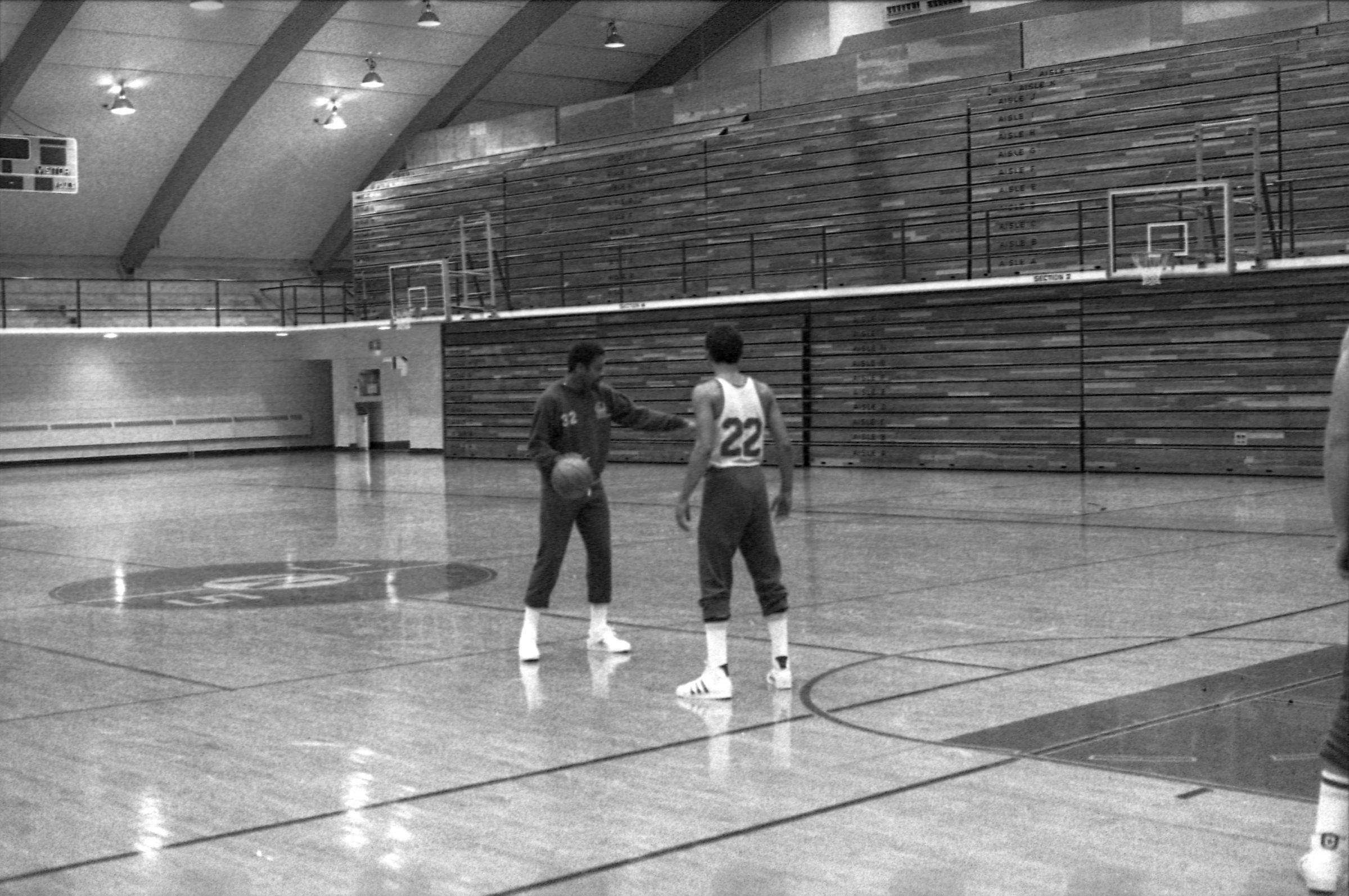 Seattle Supersonics at Capital Pavilion, Unknown Date. These seven black and white film negative strips were created for the Lacey Leader newspaper. These images were created using two separate film rolls, so some of the physical numbers on the strips are repeated. For the purposes of this description, these strips will be grouped according to the film roll from which they originally came. Each group will be assigned a lower-case letter to go along with the physical numbers on the strips (ex: 1a, 2a, 3a, 1b, 2b, 3b, etc.) to help differentiate between images.