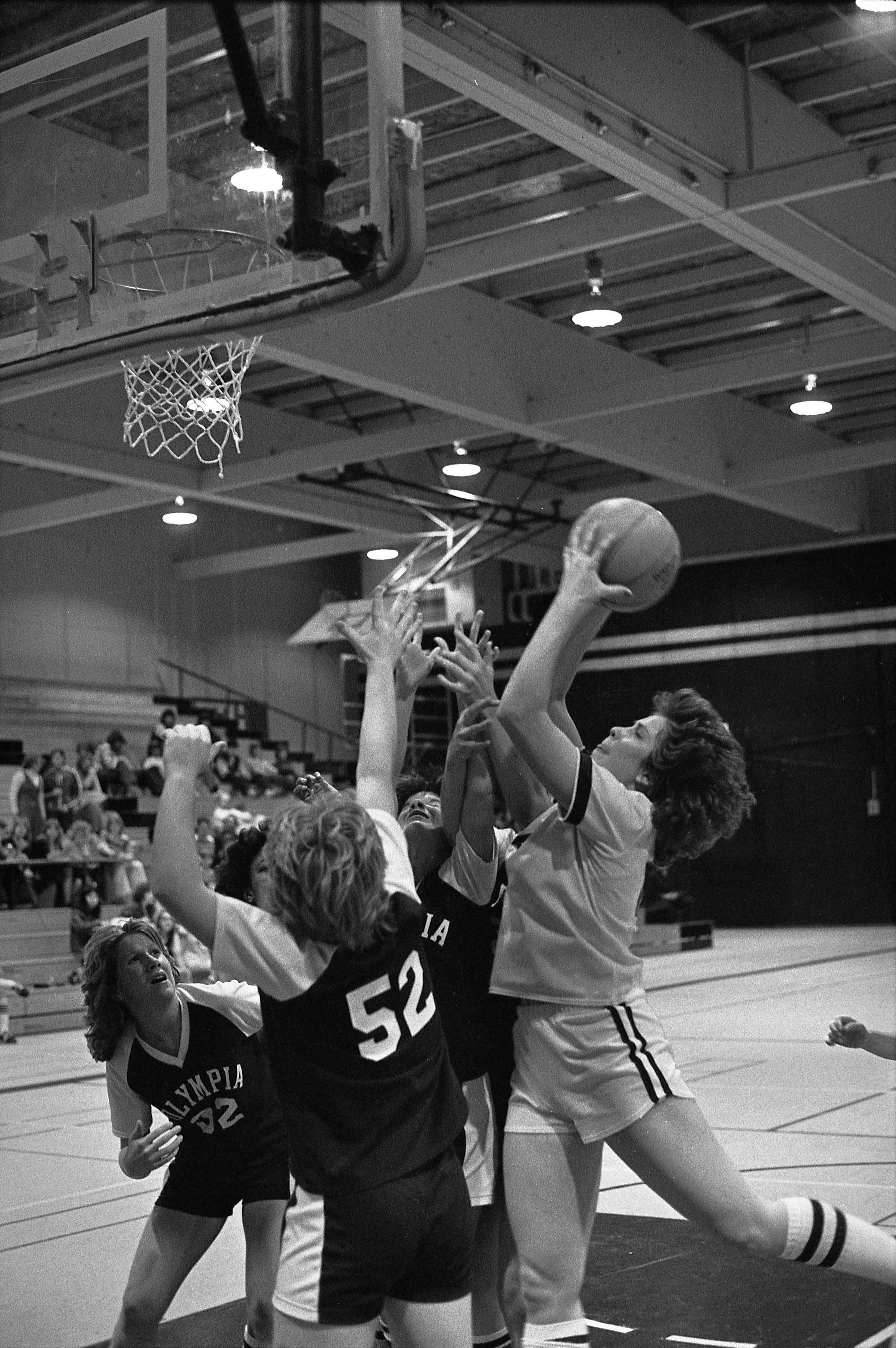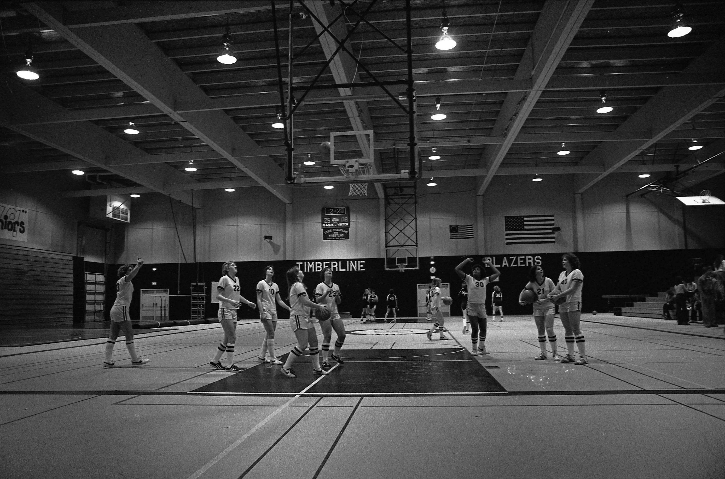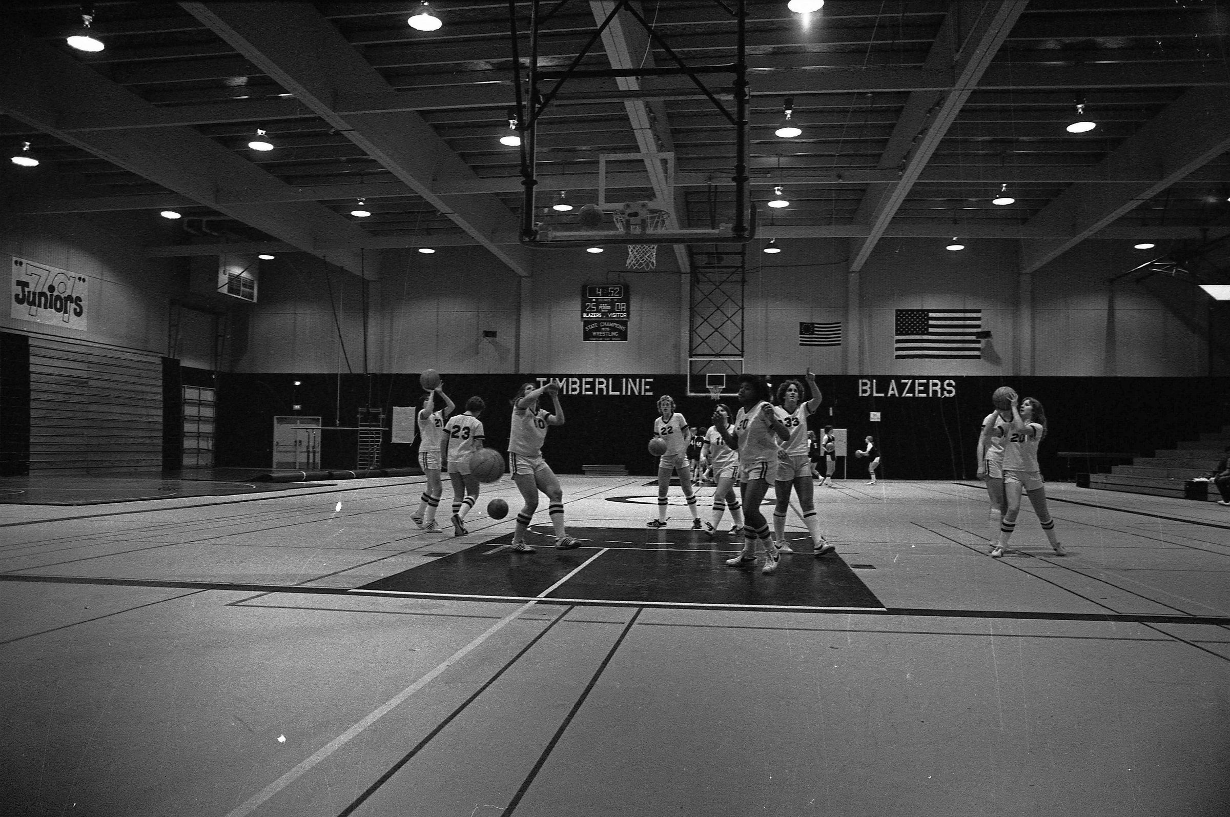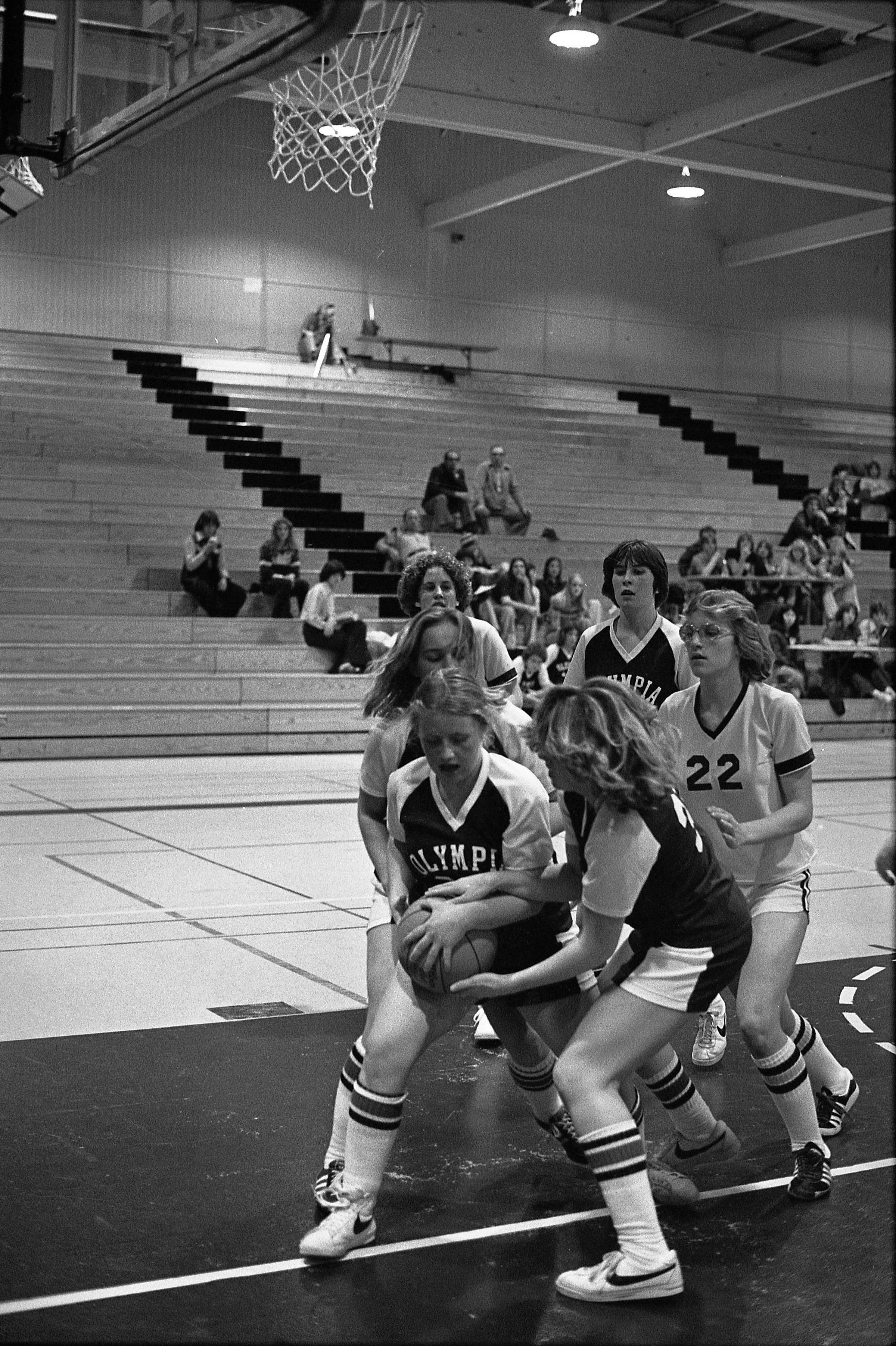 Timberline vs. Olympia, Women's Basketball, 1978. These five black and white film negative strips were created for the Lacey Leader newspaper. These images show a women's basketball game between the teams from Timberline and Olympia high schools. Although the team from Timberline does not have any text on their jerseys, the words "TIMBERLINE" and "BLAZERS" can be seen painted on the walls of the gymnasium.Made/Created