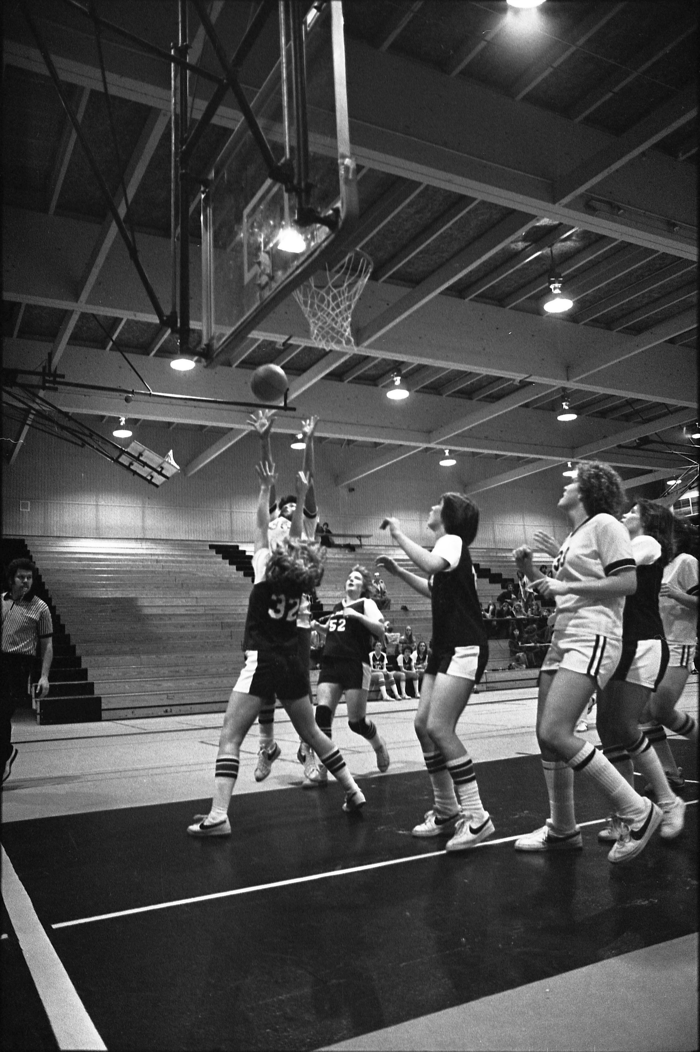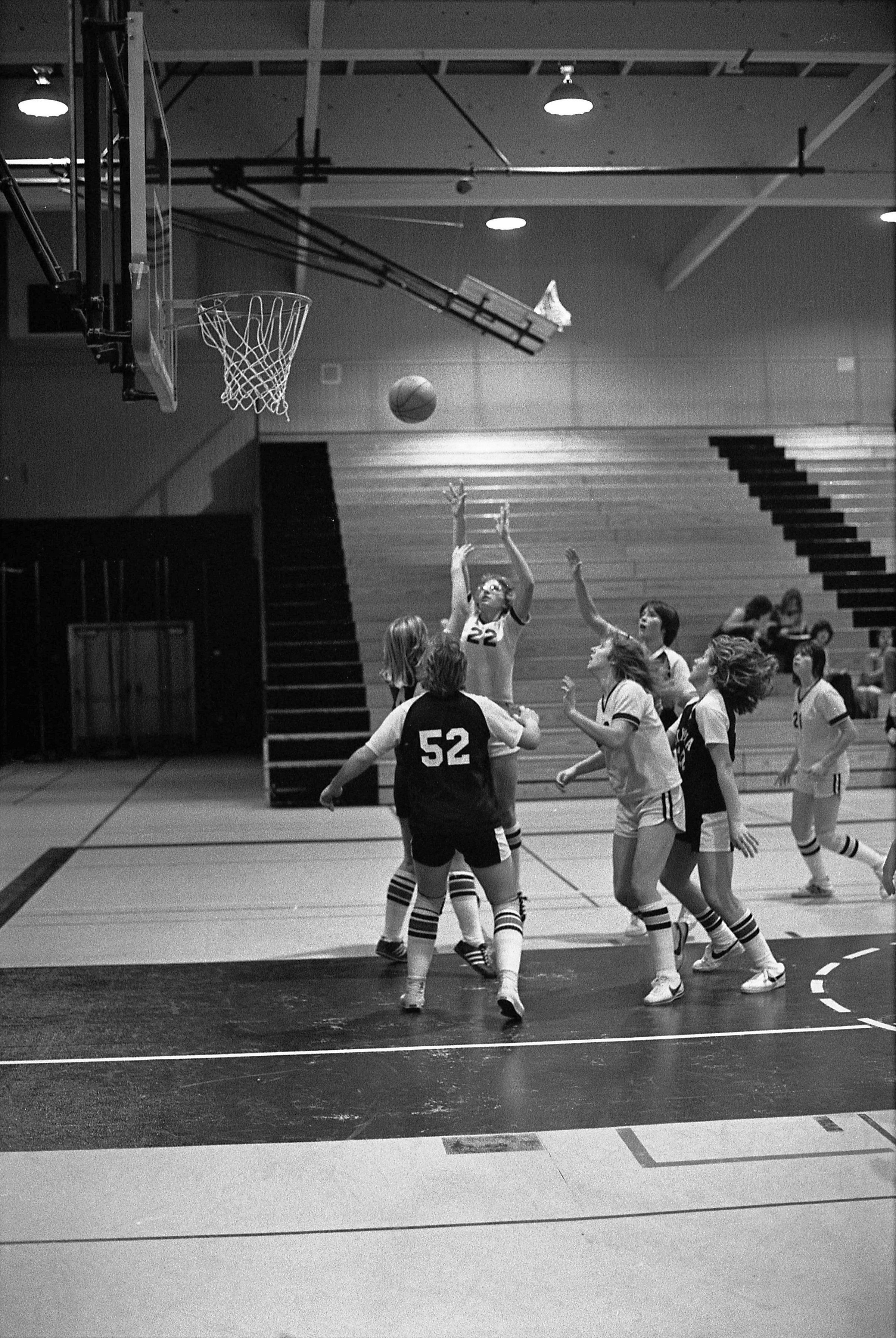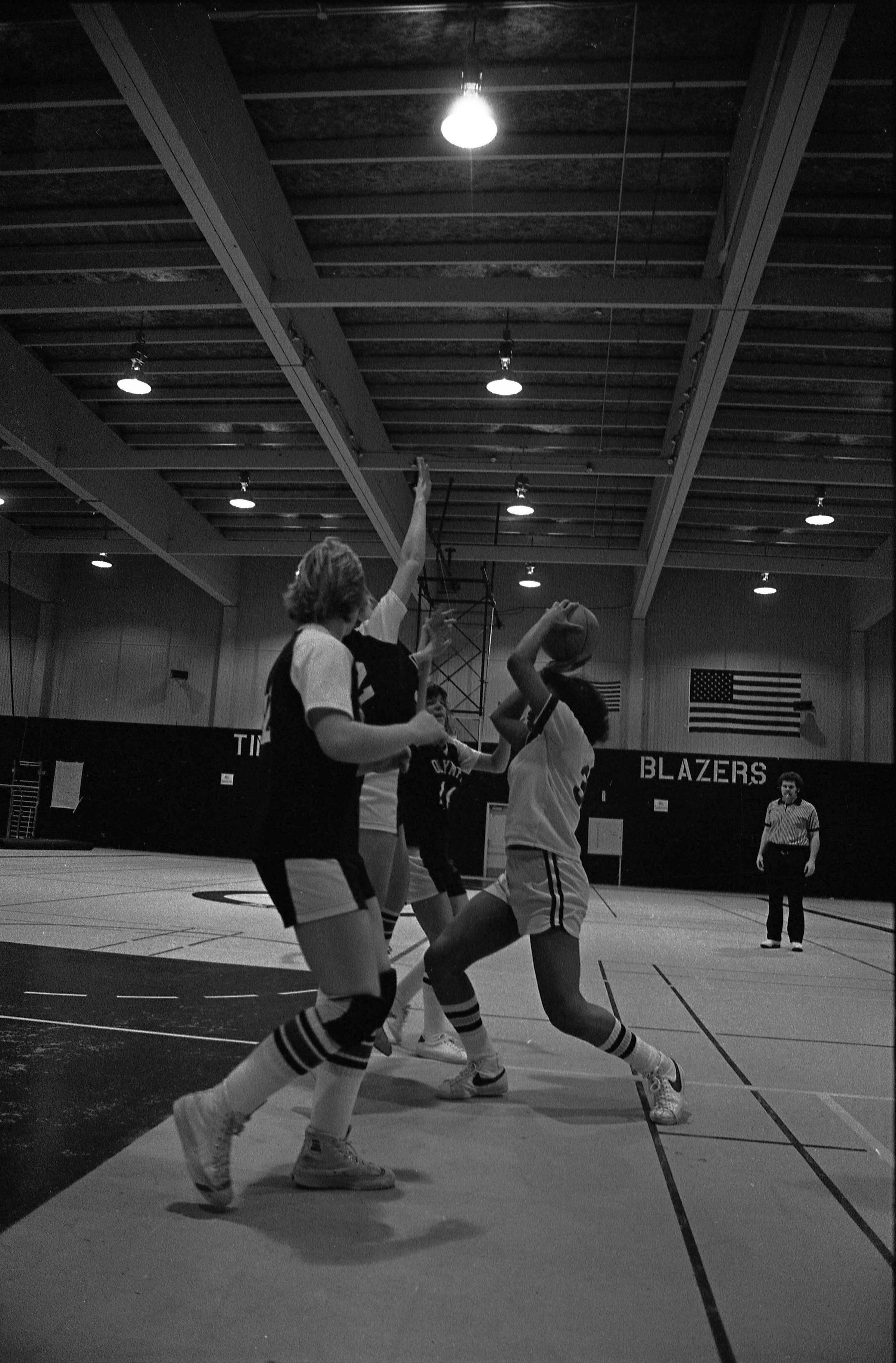 Timberline vs. Olympia, Women's Basketball, 1978. These five black and white film negative strips were created for the Lacey Leader newspaper. These images show a women's basketball game between the teams from Timberline and Olympia high schools. Although the team from Timberline does not have any text on their jerseys, the words "TIMBERLINE" and "BLAZERS" can be seen painted on the walls of the gymnasium.Made/Created