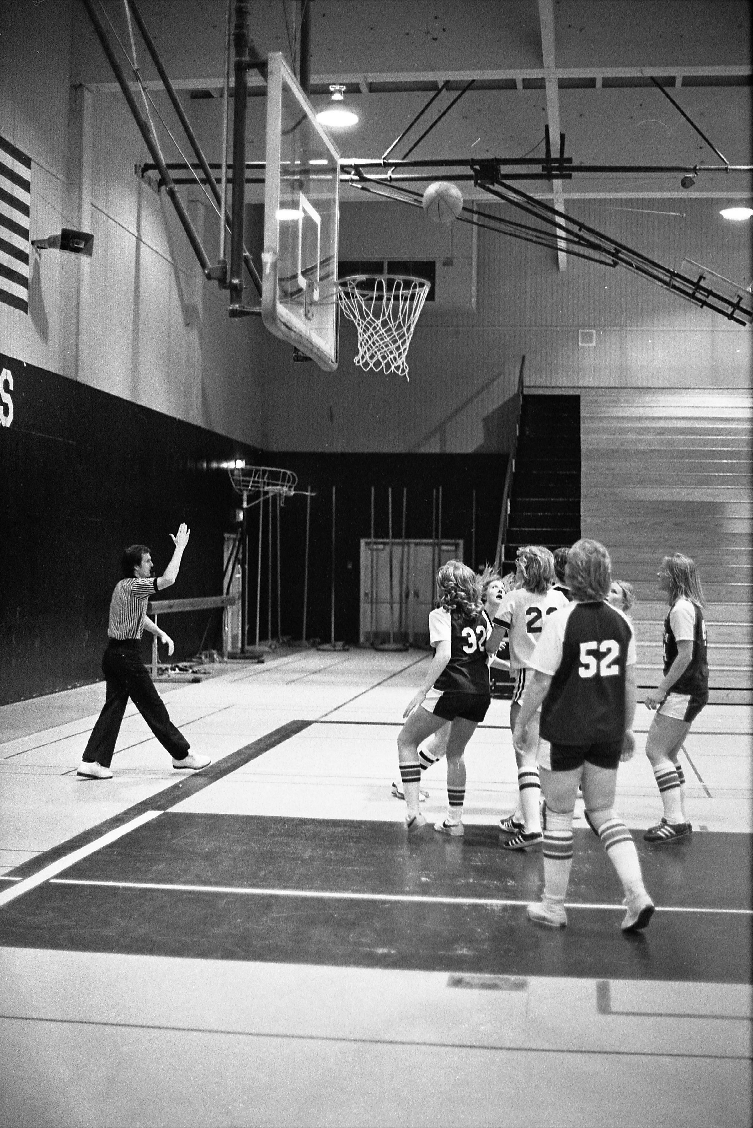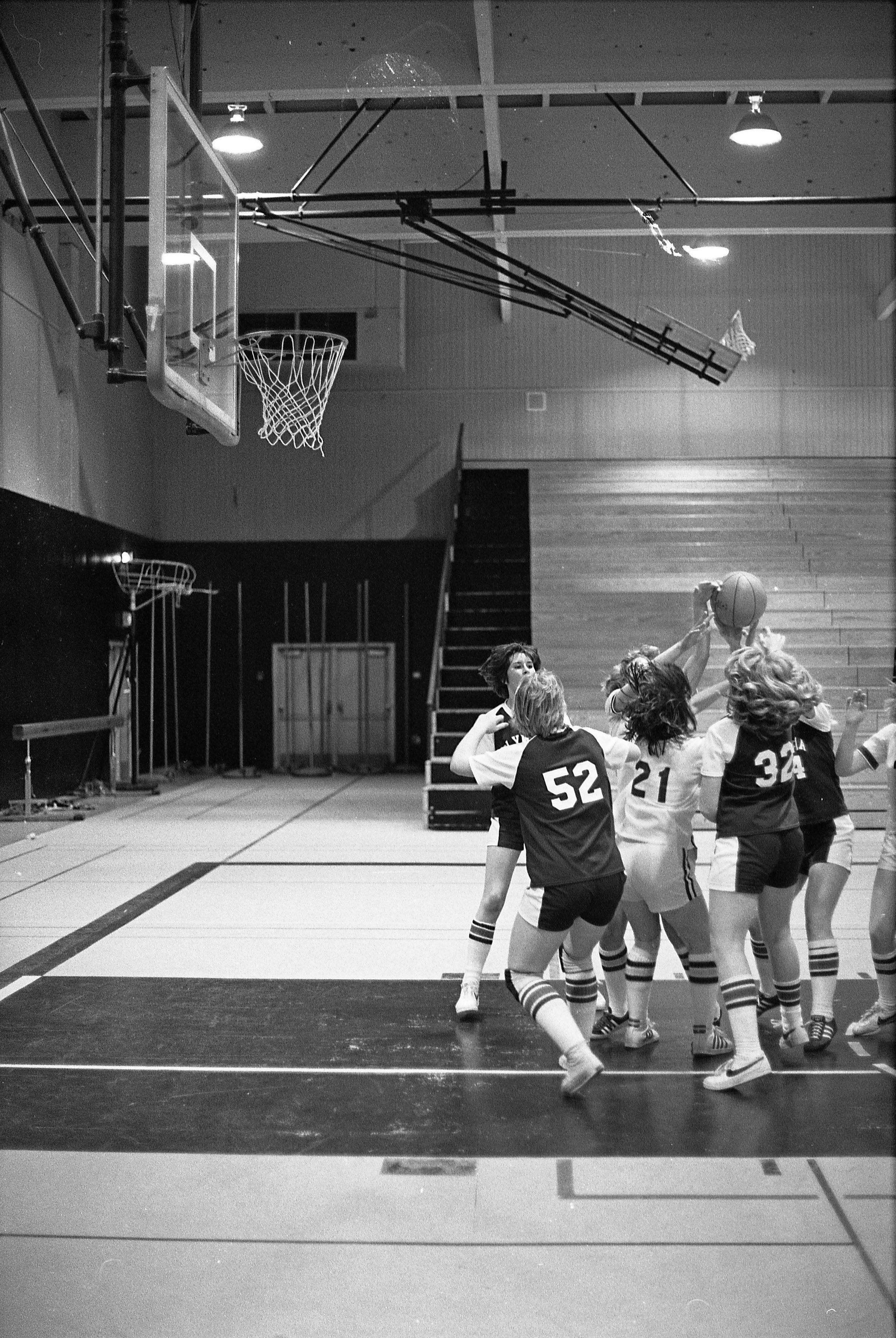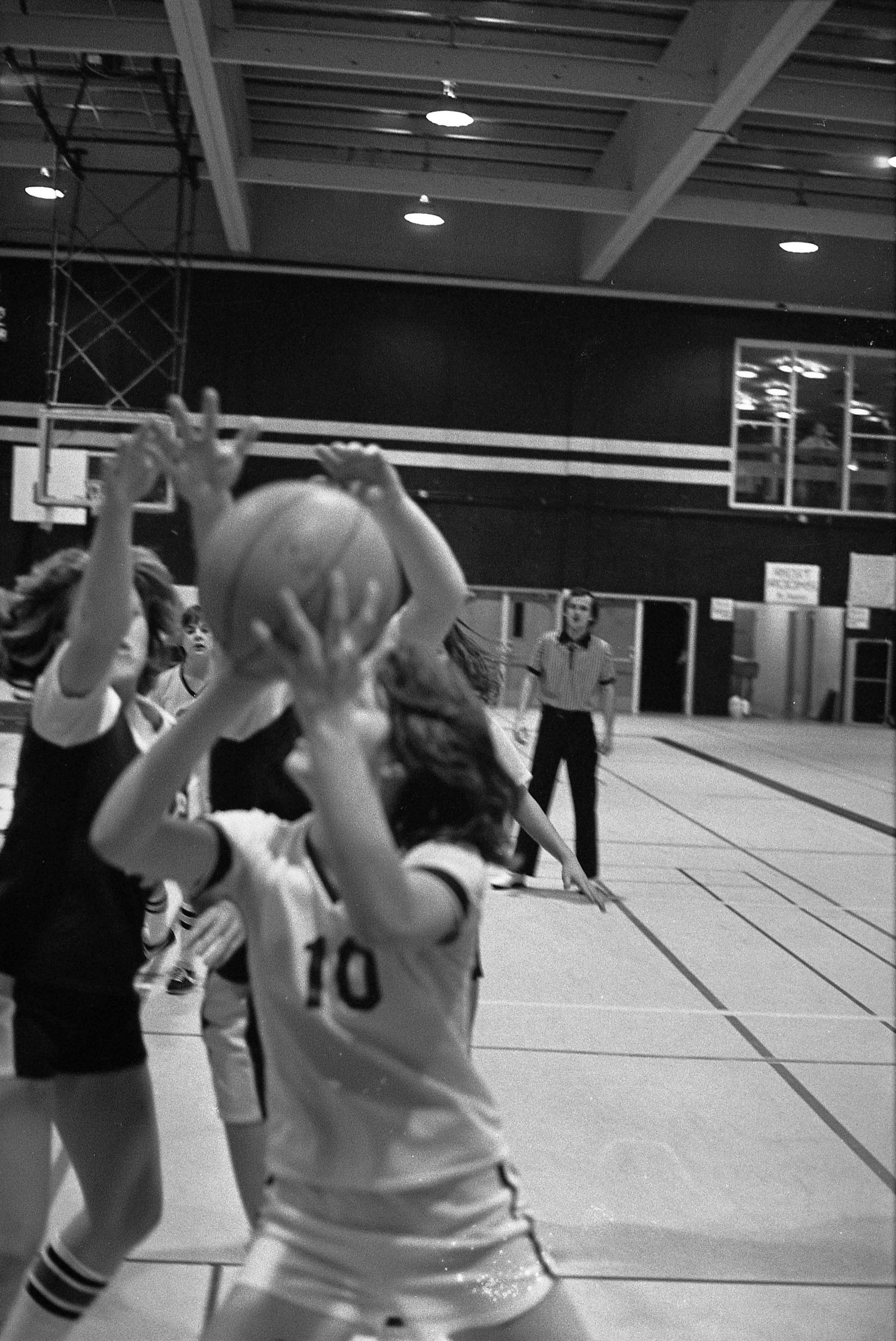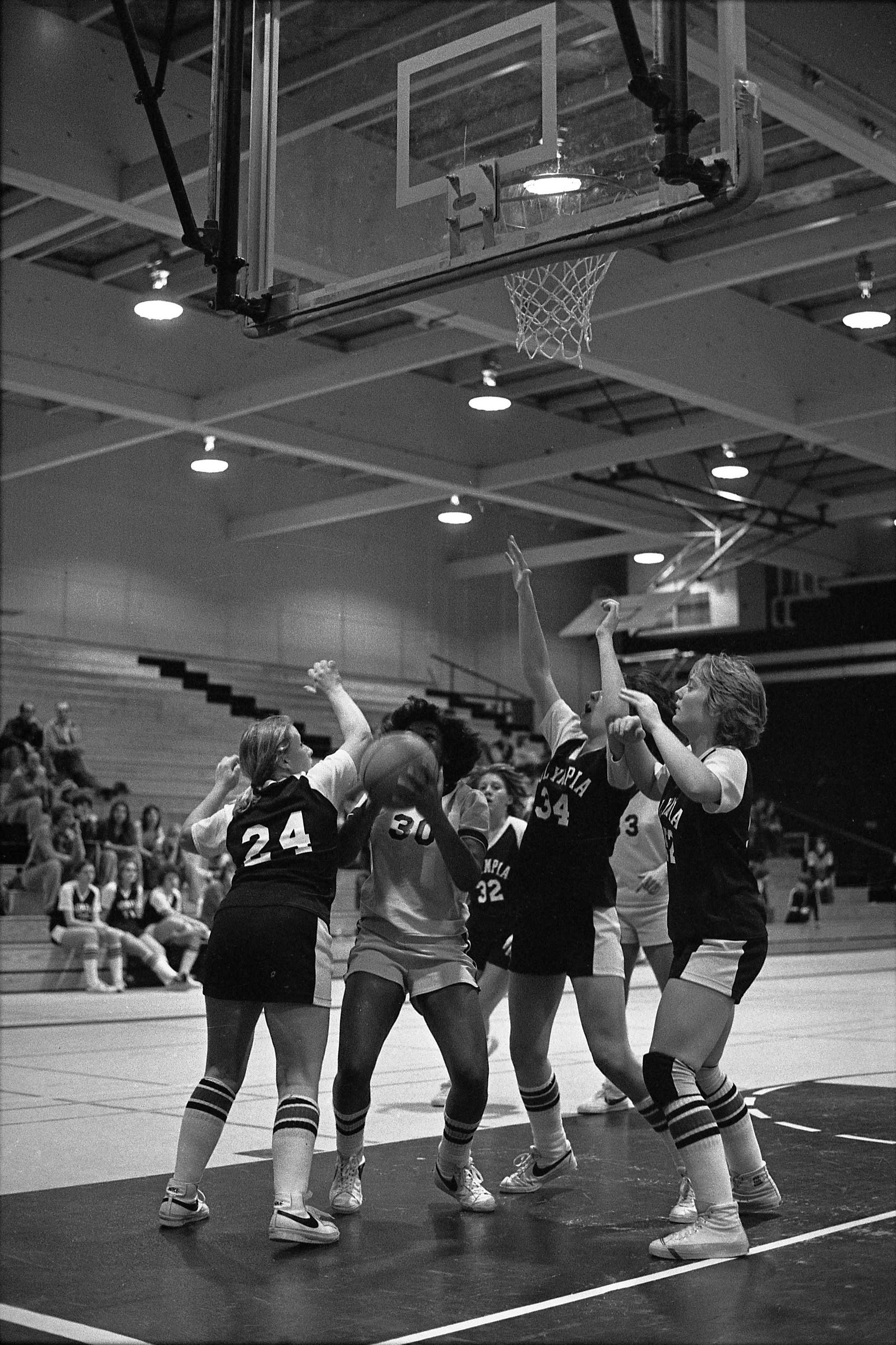 Timberline vs. Olympia, Women's Basketball, 1978. These five black and white film negative strips were created for the Lacey Leader newspaper. These images show a women's basketball game between the teams from Timberline and Olympia high schools. Although the team from Timberline does not have any text on their jerseys, the words "TIMBERLINE" and "BLAZERS" can be seen painted on the walls of the gymnasium.Made/Created