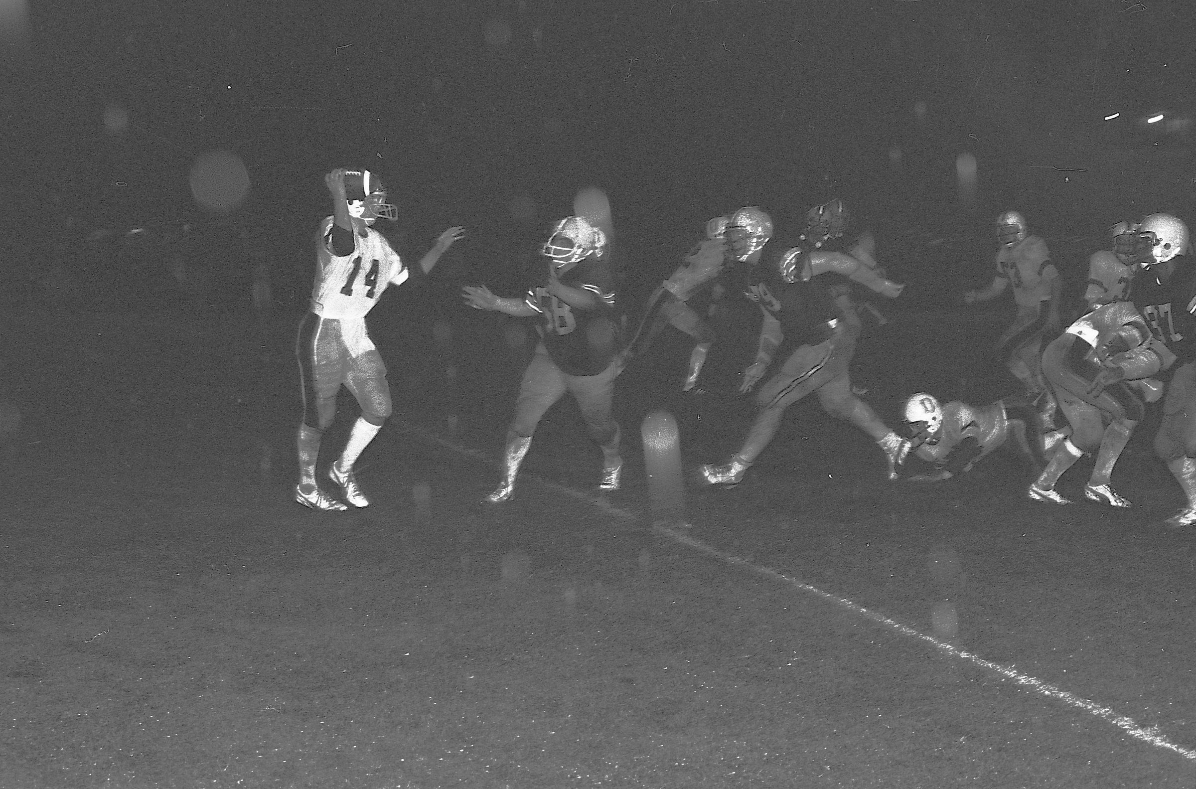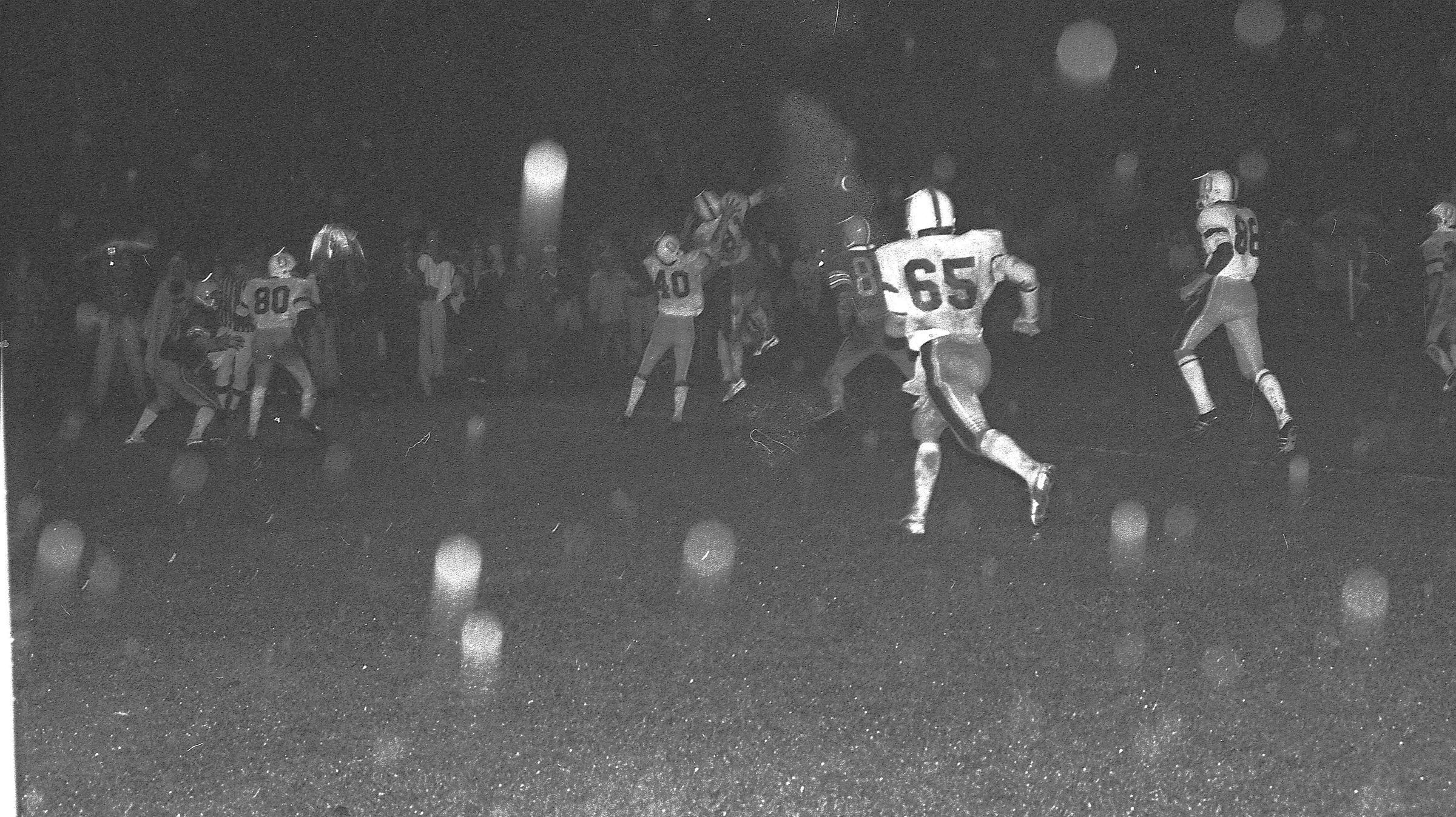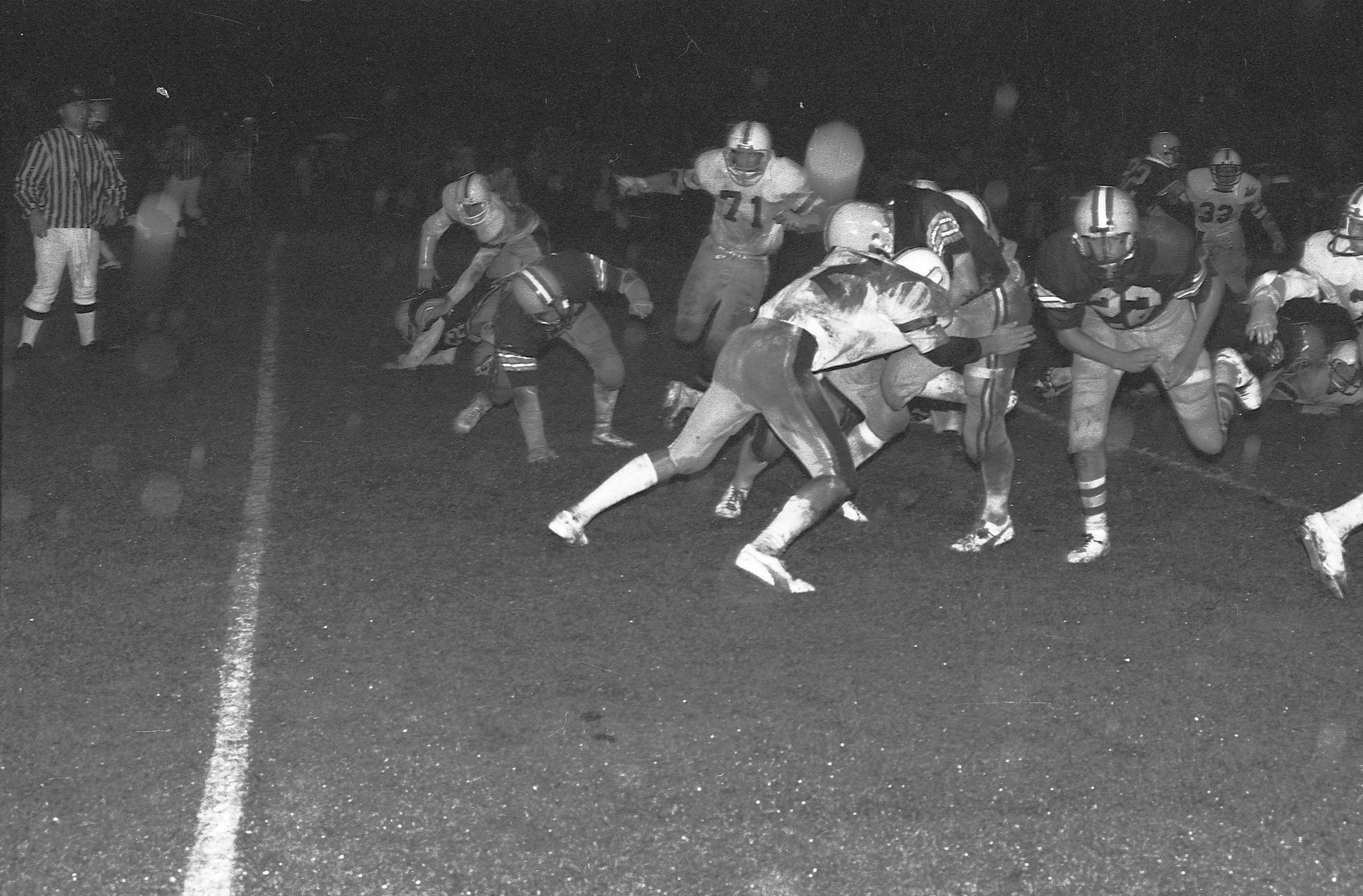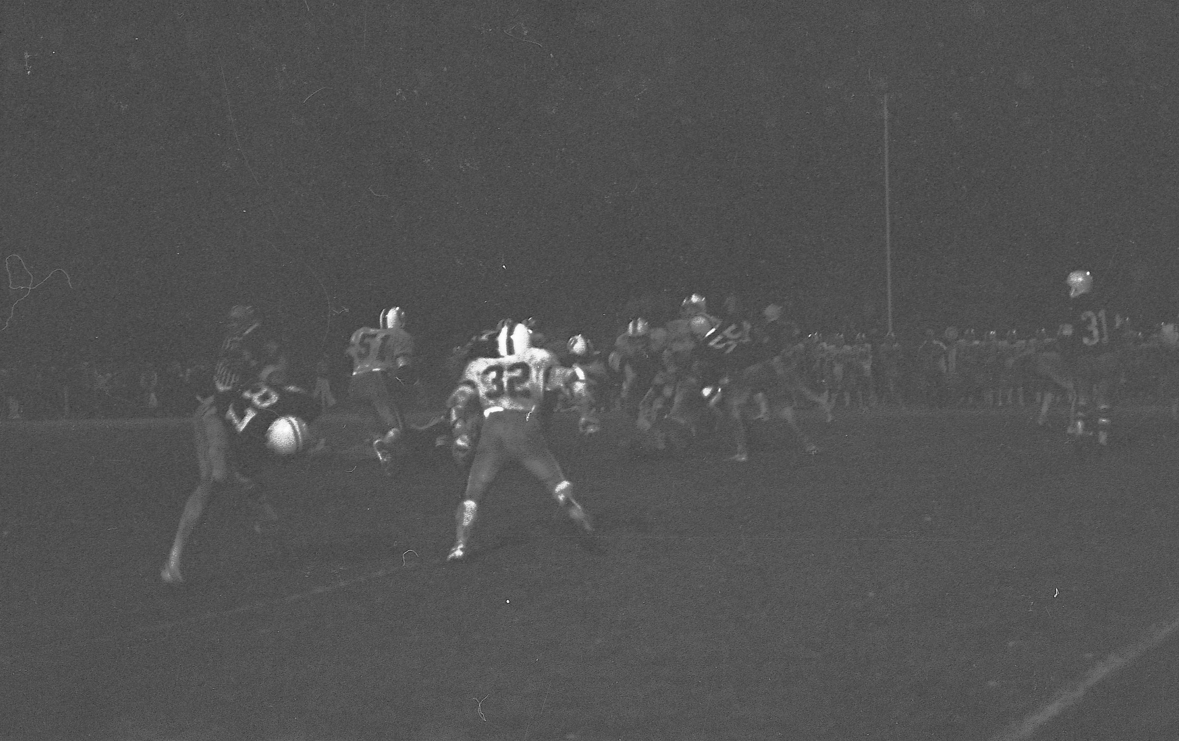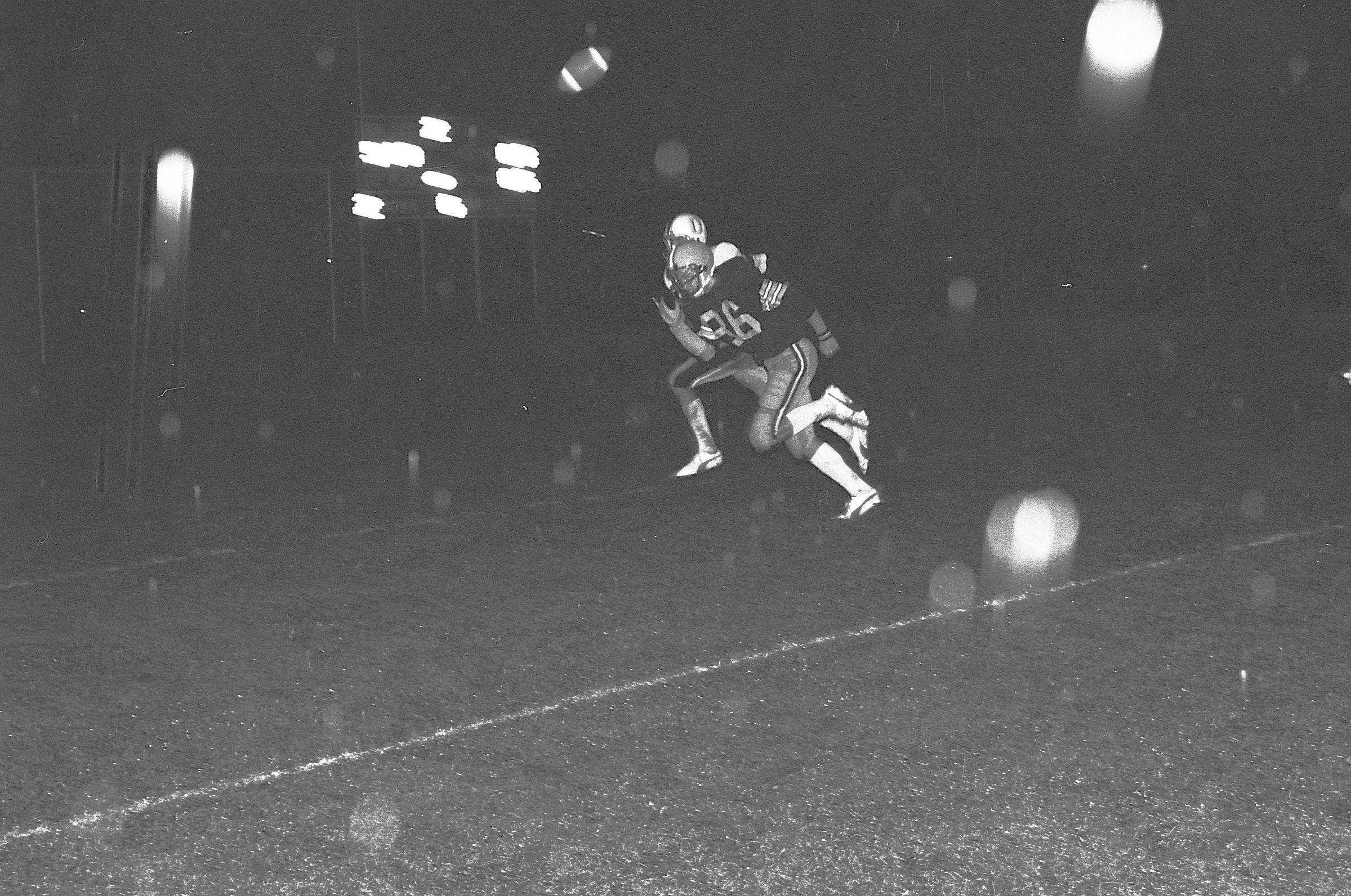 Football, 1979. These six black and white film negative strips were created for the Lacey Leader newspaper. These images show a (likely high school) football game being played.Made/Created